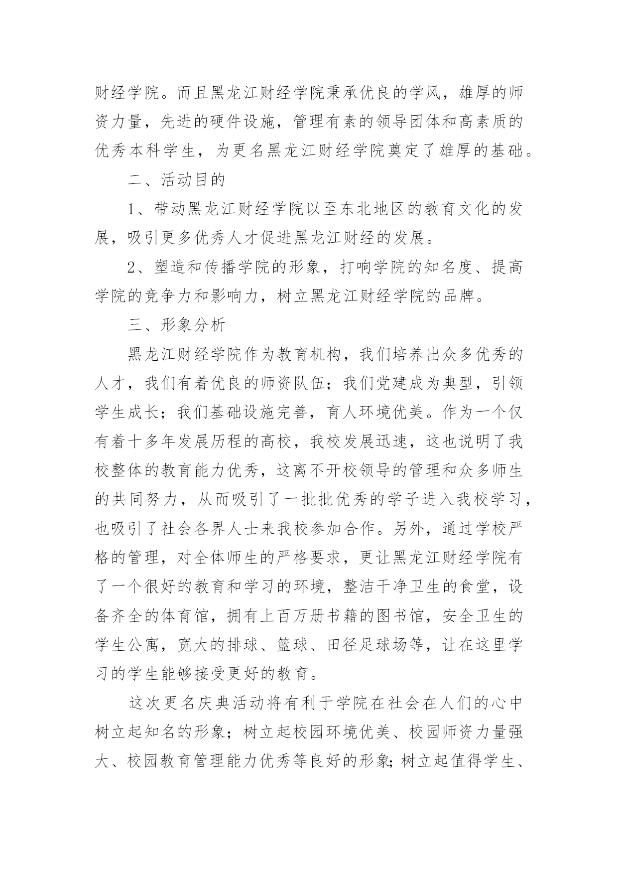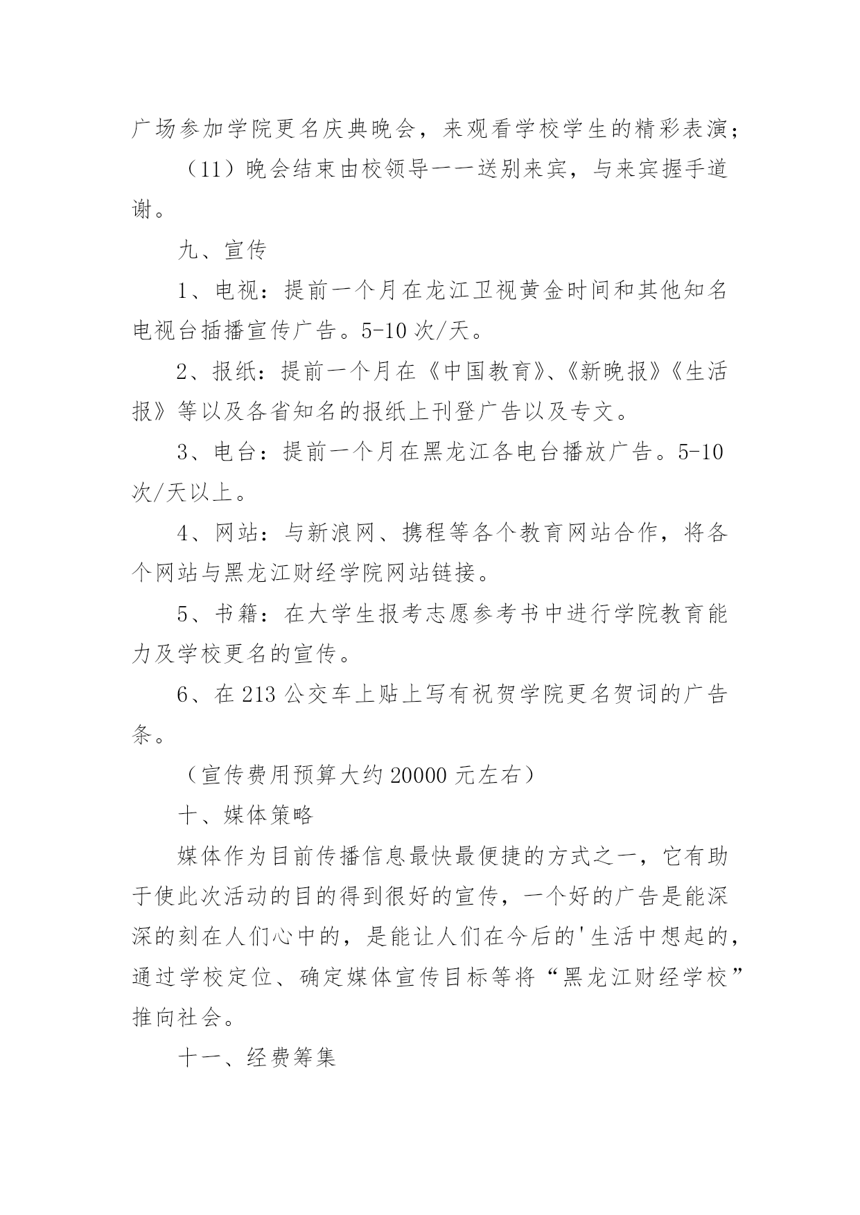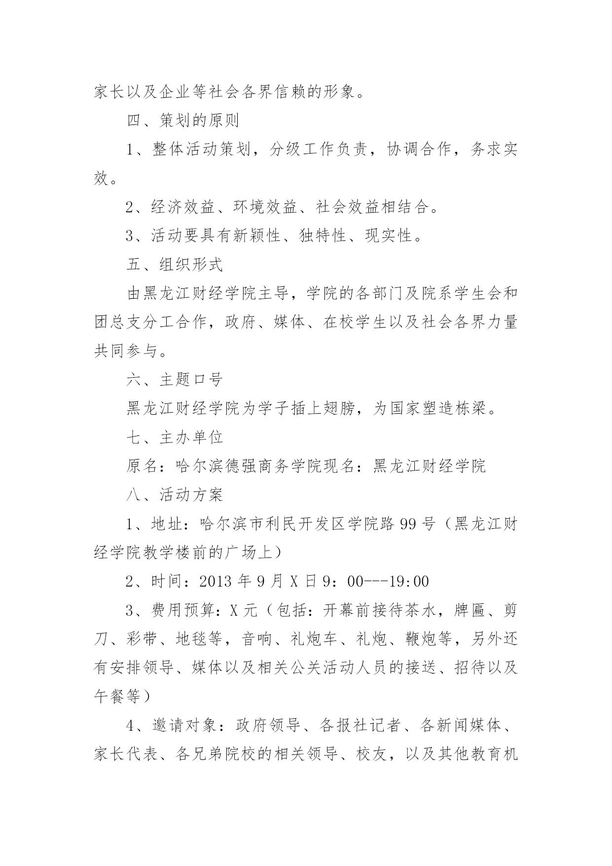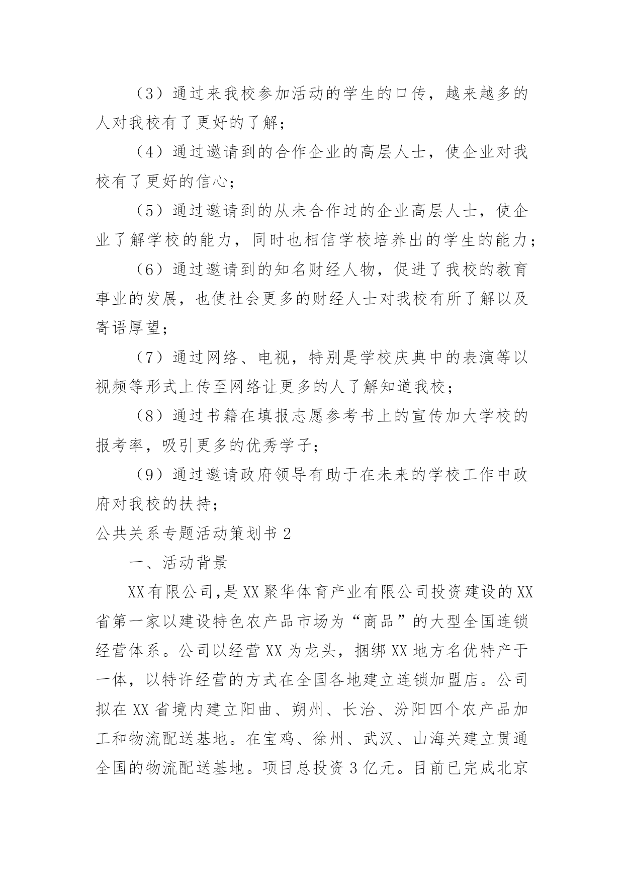 公共关系专题活动策划书公共关系专题活动策划书充实的工作生活一不留神就过去了,面对新的工作,制定好新的目标,是时候静下心来好好写写策划书了。你所见过的策划书应该是什么样的?以下是小编为大家收集的公共关系专题活动策划书,欢迎阅读与收藏。公共关系专题活动策划书1一、活动背景哈尔滨德强商务学院自1999年3月建校以来,经过学院的全体师生齐心协力,在其工作中取得优秀的成绩,2000年2月,与黑龙江商学院(现哈尔滨商业大学)合作成立黑龙江省第一所公有民办试点高校--黑龙江商学院哈尔滨商务学院,是黑龙江商学院的二级学院。2001年5月,原黑龙江商学院与黑龙江财政高等专科学校合并,成立了哈尔滨商业大学,经黑教发〔2001〕289号文件批准,黑龙江商学院哈尔滨商务学院更名为哈尔滨商业大学商务学院。2004年2月16日,经教育部教发函〔2004〕17号文批准确认哈尔滨商业大学德强商学务院为普通高等学校举办的独立学院。2008年9月27日,经教育部教发函〔2008〕285号文件批准哈尔滨商业大学德强商务学院由独立学院转设为普通民办的本科高校哈尔滨德强商务学院。在国家教育厅及省教育厅领导评估工作中得到认可,本校被许可正式更名为黑龙江财经学院。而且黑龙江财经学院秉承优良的学风,雄厚的师资力量,先进的硬件设施,管理有素的领导团体和高素质的优秀本科学生,为更名黑龙江财经学院奠定了雄厚的基础。二、活动目的1、带动黑龙江财经学院以至东北地区的教育文化的发展,吸引更多优秀人才促进黑龙江财经的发展。2、塑造和传播学院的形象,打响学院的知名度、提高学院的竞争力和影响力,树立黑龙江财经学院的品牌。三、形象分析黑龙江财经学院作为教育机构,我们培养出众多优秀的人才,我们有着优良的师资队伍;我们党建成为典型,引领学生成长;我们基础设施完善,育人环境优美。作为一个仅有着十多年发展历程的高校,我校发展迅速,这也说明了我校整体的教育能力优秀,这离不开校领导的管理和众多师生的共同努力,从而吸引了一批批优秀的学子进入我校学习,也吸引了社会各界人士来我校参加合作。另外,通过学校严格的管理,对全体师生的严格要求,更让黑龙江财经学院有了一个很好的教育和学习的环境,整洁干净卫生的食堂,设备齐全的体育馆,拥有上百万册书籍的图书馆,安全卫生的学生公寓,宽大的排球、篮球、田径足球场等,让在这里学习的学生能够接受更好的教育。这次更名庆典活动将有利于学院在社会在人们的心中树立起知名的形象;树立起校园环境优美、校园师资力量强大、校园教育管理能力优秀等良好的形象;树立起值得学生、家长以及企业等社会各界信赖的形象。四、策划的原则1、整体活动策划,分级工作负责,协调合作,务求实效。2、经济效益、环境效益、社会效益相结合。3、活动要具有新颖性、独特性、现实性。五、组织形式由黑龙江财经学院主导,学院的各部门及院系学生会和团总支分工合作,政府、媒体、在校学生以及社会各界力量共同参与。六、主题口号黑龙江财经学院为学子插上翅膀,为国家塑造栋梁。七、主办单位原名:哈尔滨德强商务学院现名:黑龙江财经学院八、活动方案1、地址:哈尔滨市利民开发区学院路99号(黑龙江财经学院教学楼前的广场上)2、时间:2013年9月X日9:00---19:003、费用预算:X元(包括:开幕前接待茶水,牌匾、剪刀、彩带、地毯等,音响、礼炮车、礼炮、鞭炮等,另外还有安排领导、媒体以及相关公关活动人员的接送、招待以及午餐等)4、邀请对象:政府领导、各报社记者、各新闻媒体、家长代表、各兄弟院校的相关领导、校友,以及其他教育机构人员,另外还可在哈尔滨各中学选出一些在校的高三学生邀请他们参加我们的活动。特别邀请对象:如合作或未合作的企业高管、商界知名人士或知名财经人物等。(特别嘉宾希望由校领导亲自出面利用一切可利用资源邀请)5、活动流程:(1)由工作人员布置好活动场所;(2)安排礼仪小姐接待各位来宾,带领到临时休息场所稍作休息;(3)活动开始前5分钟内带领各位来宾出席开幕式现场;(4)由校领导宣布开幕式开始,放鞭炮,校领导及来宾代表讲话;(5)讲话完毕后进行剪彩仪式,在剪裁的那一瞬间揭下盖住黑龙江学院的红布,以及揭开校门口墙上几石柱上的红布;(6)安排一场5-10分钟左右的精彩表演(例如民族舞蹈等),放礼花;(7)上午开幕式结束;(8)安排校领导陪同与会人员共进午餐。(9)午餐完毕安排工作人员带领来宾参观学校,了解学校文化、环境及学院教育管理情况等;(10)下午时间16:00时,再次带领来宾来到学院前的广场参加学院更名庆典晚会,来观看学校学生的精彩表演;(11)晚会结束由校领导一一送别来宾,与来宾握手道谢。九、宣传1、电视:提前一个月在龙江卫视黄金时间和其他知名电视台插播宣传广告。5-10次/天。2、报纸:提前一个月在《中国教育》、《新晚报》《生活报》