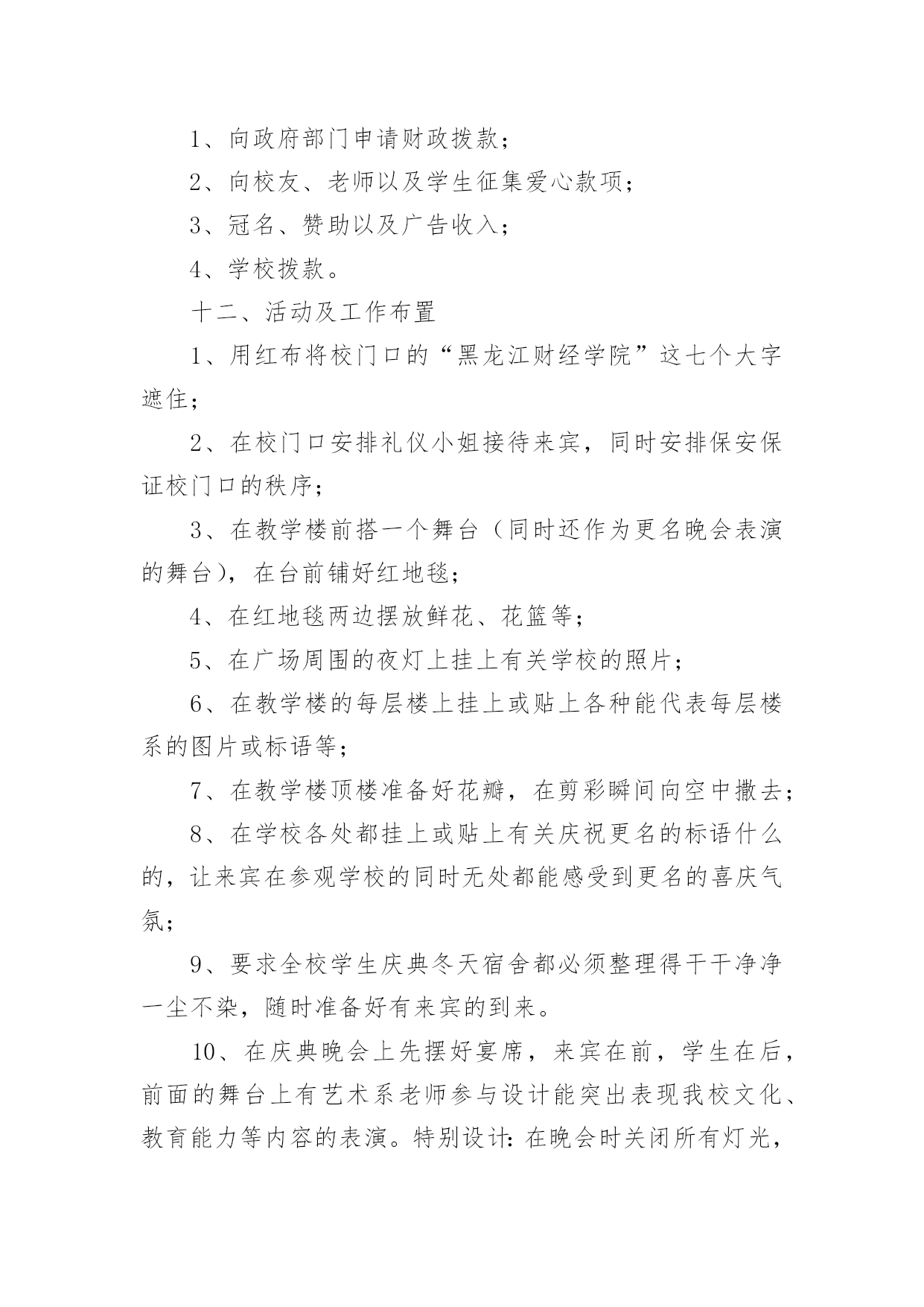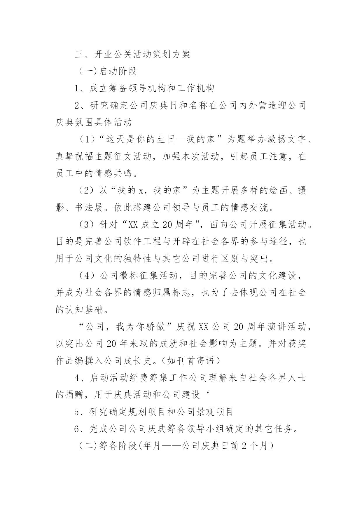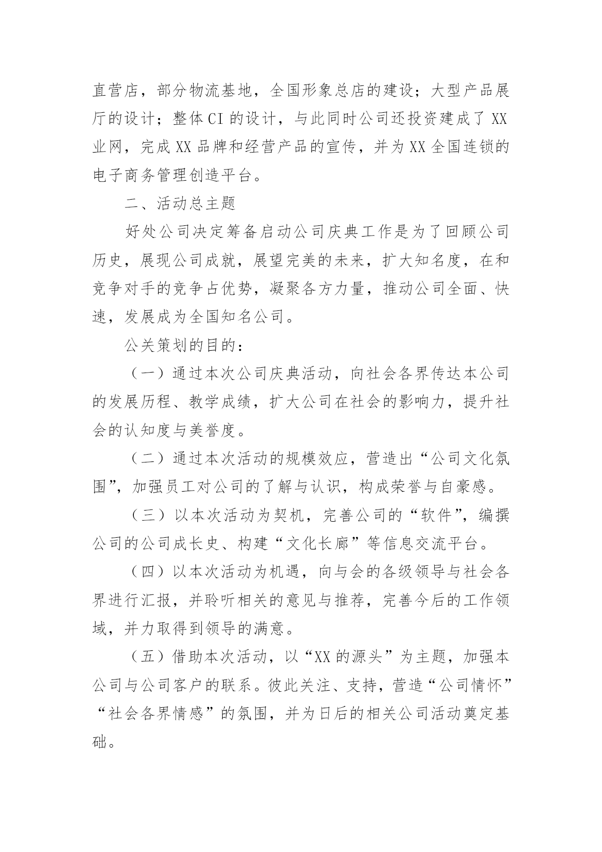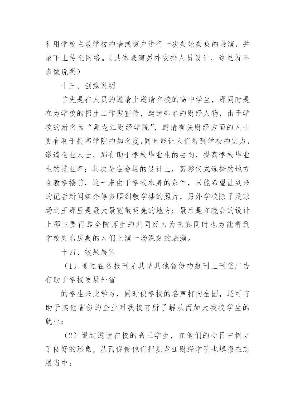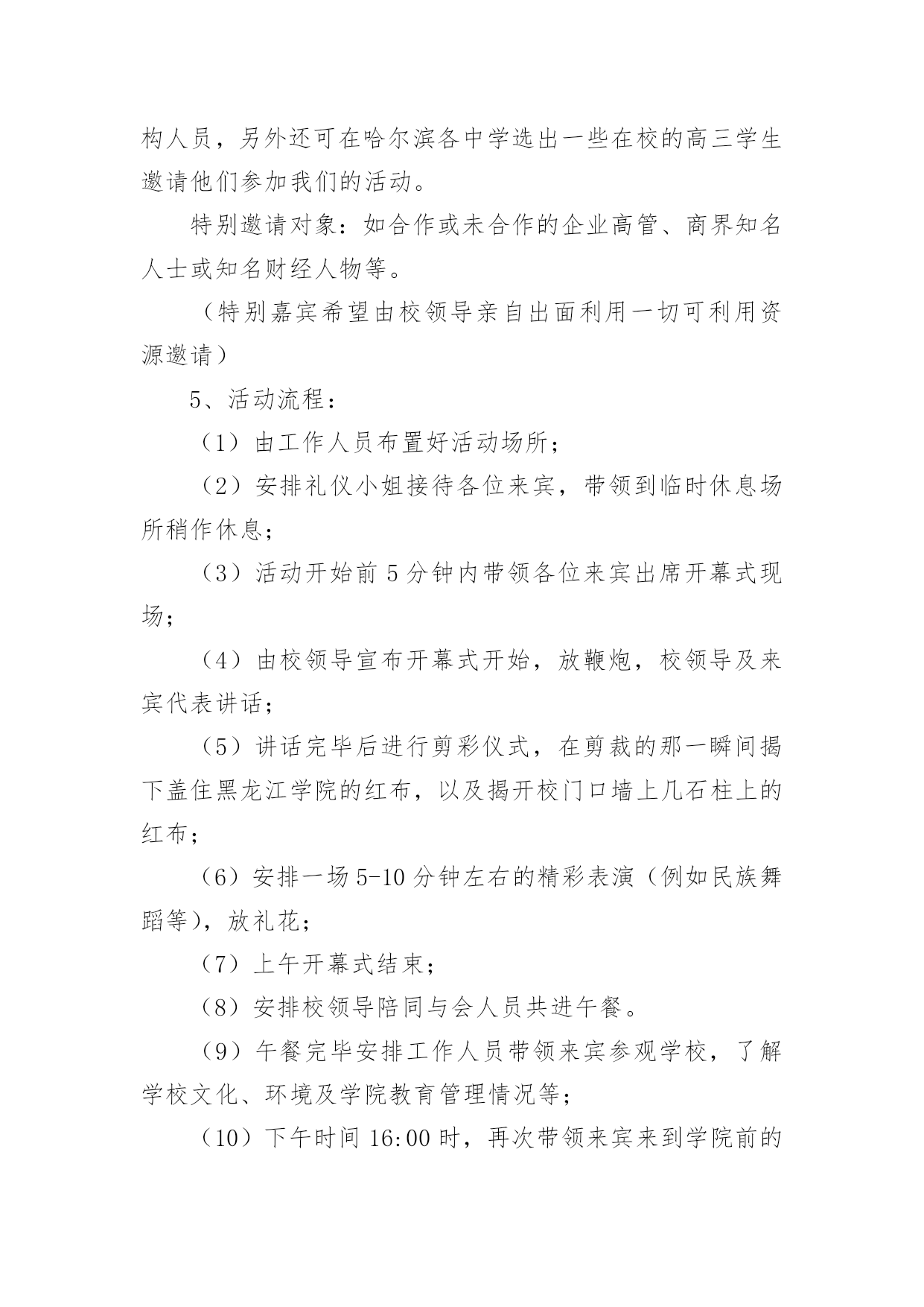 公共关系专题活动策划书公共关系专题活动策划书充实的工作生活一不留神就过去了,面对新的工作,制定好新的目标,是时候静下心来好好写写策划书了。你所见过的策划书应该是什么样的?以下是小编为大家收集的公共关系专题活动策划书,欢迎阅读与收藏。公共关系专题活动策划书1一、活动背景哈尔滨德强商务学院自1999年3月建校以来,经过学院的全体师生齐心协力,在其工作中取得优秀的成绩,2000年2月,与黑龙江商学院(现哈尔滨商业大学)合作成立黑龙江省第一所公有民办试点高校--黑龙江商学院哈尔滨商务学院,是黑龙江商学院的二级学院。2001年5月,原黑龙江商学院与黑龙江财政高等专科学校合并,成立了哈尔滨商业大学,经黑教发〔2001〕289号文件批准,黑龙江商学院哈尔滨商务学院更名为哈尔滨商业大学商务学院。2004年2月16日,经教育部教发函〔2004〕17号文批准确认哈尔滨商业大学德强商学务院为普通高等学校举办的独立学院。2008年9月27日,经教育部教发函〔2008〕285号文件批准哈尔滨商业大学德强商务学院由独立学院转设为普通民办的本科高校哈尔滨德强商务学院。在国家教育厅及省教育厅领导评估工作中得到认可,本校被许可正式更名为黑龙江财经学院。而且黑龙江财经学院秉承优良的学风,雄厚的师资力量,先进的硬件设施,管理有素的领导团体和高素质的优秀本科学生,为更名黑龙江财经学院奠定了雄厚的基础。二、活动目的1、带动黑龙江财经学院以至东北地区的教育文化的发展,吸引更多优秀人才促进黑龙江财经的发展。2、塑造和传播学院的形象,打响学院的知名度、提高学院的竞争力和影响力,树立黑龙江财经学院的品牌。三、形象分析黑龙江财经学院作为教育机构,我们培养出众多优秀的人才,我们有着优良的师资队伍;我们党建成为典型,引领学生成长;我们基础设施完善,育人环境优美。作为一个仅有着十多年发展历程的高校,我校发展迅速,这也说明了我校整体的教育能力优秀,这离不开校领导的管理和众多师生的共同努力,从而吸引了一批批优秀的学子进入我校学习,也吸引了社会各界人士来我校参加合作。另外,通过学校严格的管理,对全体师生的严格要求,更让黑龙江财经学院有了一个很好的教育和学习的环境,整洁干净卫生的食堂,设备齐全的体育馆,拥有上百万册书籍的图书馆,安全卫生的学生公寓,宽大的排球、篮球、田径足球场等,让在这里学习的学生能够接受更好的教育。这次更名庆典活动将有利于学院在社会在人们的心中树立起知名的形象;树立起校园环境优美、校园师资力量强大、校园教育管理能力优秀等良好的形象;树立起值得学生、家长以及企业等社会各界信赖的形象。四、策划的原则1、整体活动策划,分级工作负责,协调合作,务求实效。2、经济效益、环境效益、社会效益相结合。3、活动要具有新颖性、独特性、现实性。五、组织形式由黑龙江财经学院主导,学院的各部门及院系学生会和团总支分工合作,政府、媒体、在校学生以及社会各界力量共同参与。六、主题口号黑龙江财经学院为学子插上翅膀,为国家塑造栋梁。七、主办单位原名:哈尔滨德强商务学院现名:黑龙江财经学院八、活动方案1、地址:哈尔滨市利民开发区学院路99号(黑龙江财经学院教学楼前的广场上)2、时间:2013年9月X日9:00---19:003、费用预算:X元(包括:开幕前接待茶水,牌匾、剪刀、彩带、地毯等,音响、礼炮车、礼炮、鞭炮等,另外还有安排领导、媒体以及相关公关活动人员的接送、招待以及午餐等)4、邀请对象:政府领导、各报社记者、各新闻媒体、家长代表、各兄弟院校的相关领导、校友,以及其他教育机构人员,另外还可在哈尔滨各中学选出一些在校的高三学生邀请他们参加我们的活动。特别邀请对象:如合作或未合作的企业高管、商界知名人士或知名财经人物等。(特别嘉宾希望由校领导亲自出面利用一切可利用资源邀请)5、活动流程:(1)由工作人员布置好活动场所;(2)安排礼仪小姐接待各位来宾,带领到临时休息场所稍作休息;(3)活动开始前5分钟内带领各位来宾出席开幕式现场;(4)由校领导宣布开幕式开始,放鞭炮,校领导及来宾代表讲话;(5)讲话完毕后进行剪彩仪式,在剪裁的那一瞬间揭下盖住黑龙江学院的红布,以及揭开校门口墙上几石柱上的红布;(6)安排一场5-10分钟左右的精彩表演(例如民族舞蹈等),放礼花;(7)上午开幕式结束;(8)安排校领导陪同与会人员共进午餐。(9)午餐完毕安排工作人员带领来宾参观学校,了解学校文化、环境及学院教育管理情况等;(10)下午时间16:00时,再次带领来宾来到学院前的广场参加学院更名庆典晚会,来观看学校学生的精彩表演;(11)晚会结束由校领导一一送别来宾,与来宾握手道谢。九、宣传1、电视:提前一个月在龙江卫视黄金时间和其他知名电视台插播宣传广告。5-10次/天。2、报纸:提前一个月在《中国教育》、《新晚报》《生活报》