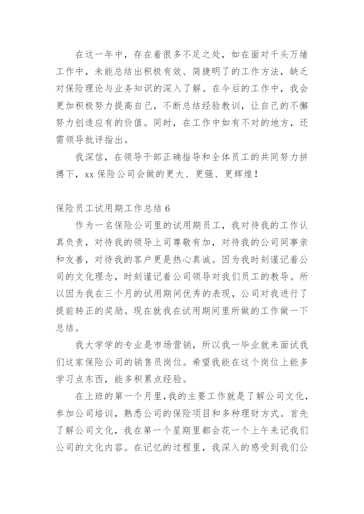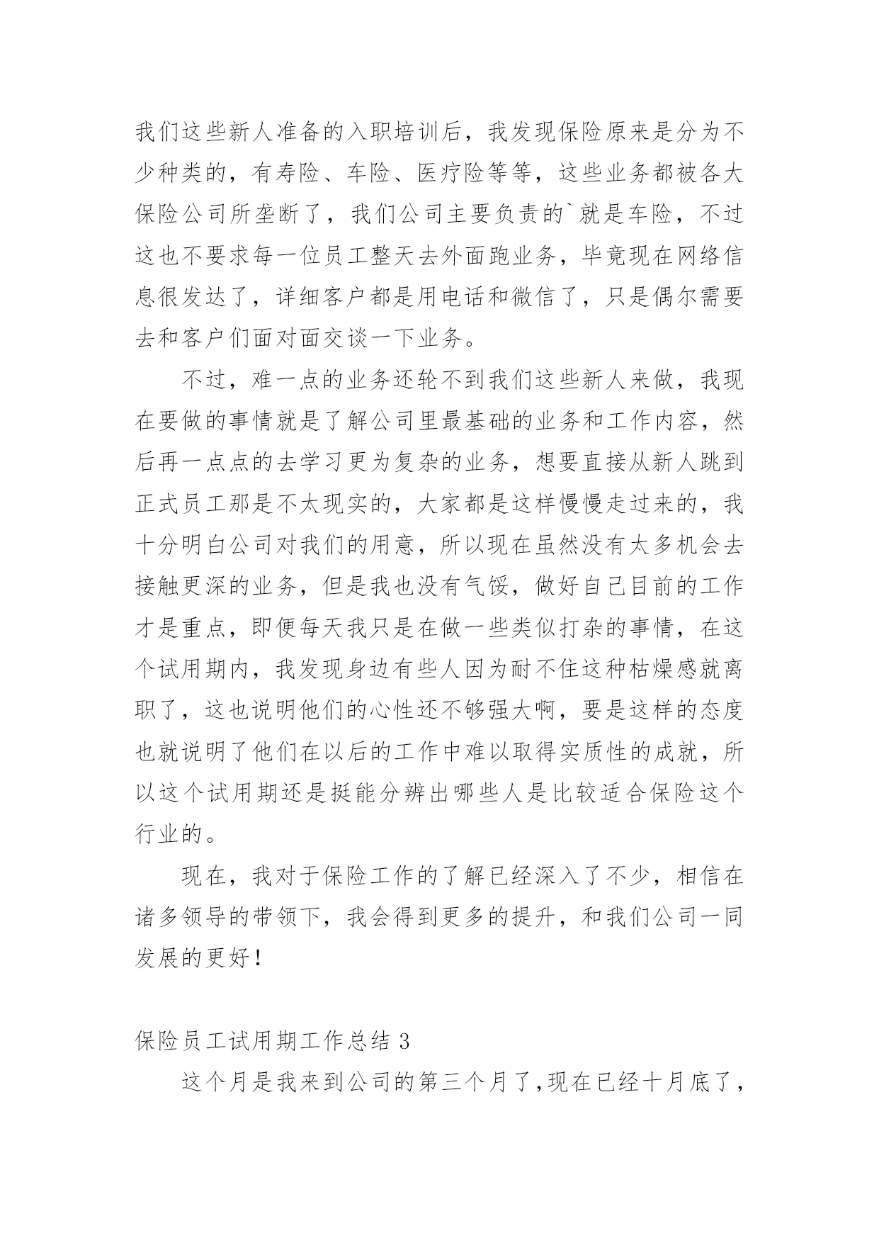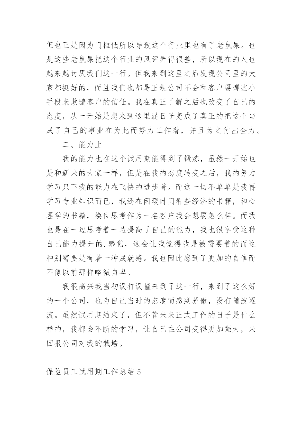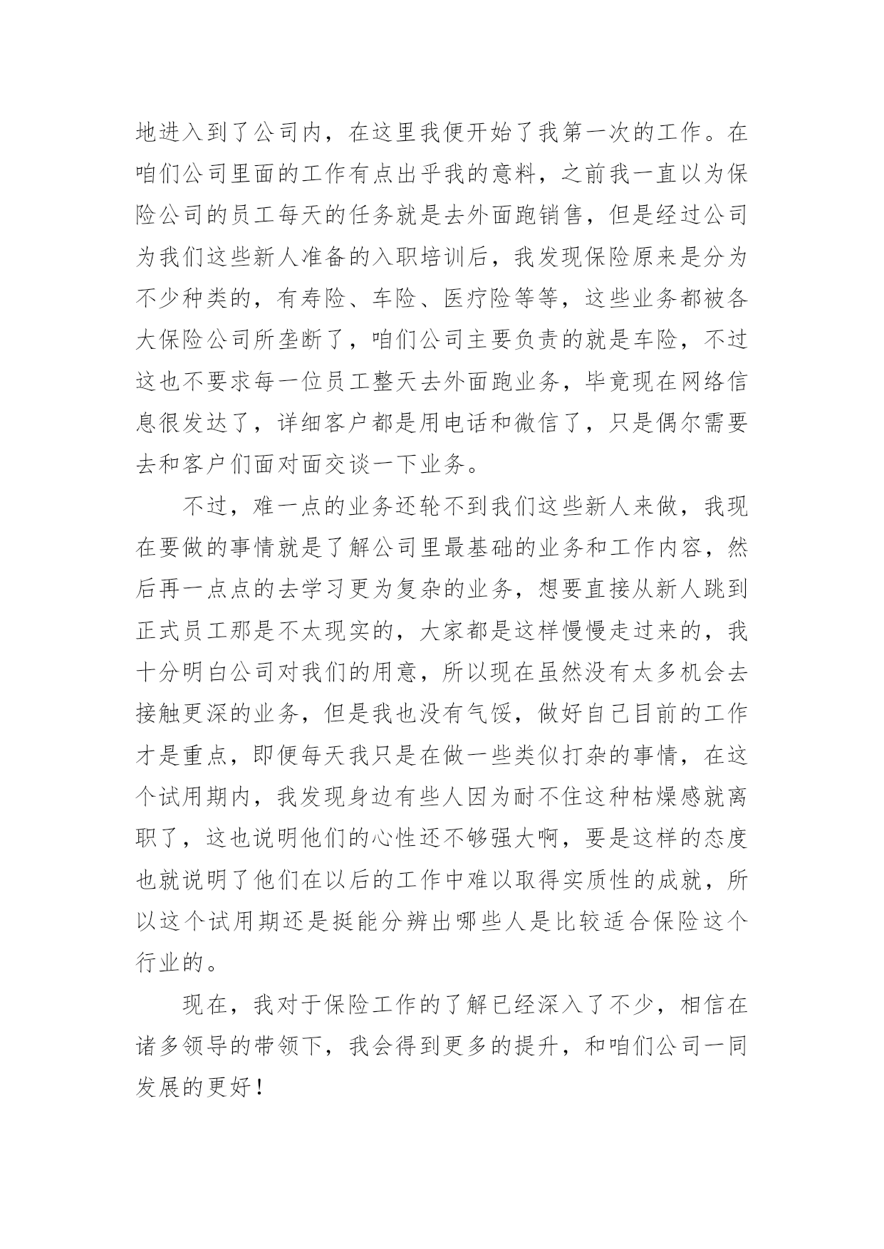 保险员工试用期工作总结保险员工试用期工作总结12篇总结是事后对某一时期、某一项目或某些工作进行回顾和分析,从而做出带有规律性的结论,它可使零星的、肤浅的、表面的感性认知上升到全面的、系统的、本质的理性认识上来,让我们好好写一份总结吧。总结一般是怎么写的呢?下面是小编为大家整理的保险员工试用期工作总结,欢迎大家借鉴与参考,希望对大家有所帮助。保险员工试用期工作总结1在咱们xx公司已经工作了有几个月的时间了,按照公司的规定,我的试用期即将结束,这也意味着我马上就能成为咱们公司的一名正式员工了,但是我也不能高兴的太早了,毕竟从我目前的表现来看只能说是中规中矩,应该还没有达到领导们的要求,但是我会继续努力下去的,争取早日成为一名合格的保险工作者,现在就让我来总结一下自己在试用期内的工作情况。我能来到咱们公司是我的幸运,咱们公司是国企之一,所以有不少的人都想挤入公司里,那时候我来面试的时候是见到了不少的人,其中有看上去已经工作了不少年的人,也有和我一样是还没有毕业或者毕业不久的大学生,这也让我感觉到了十分大的`压力哈,好在经过面试之后我还是成功地进入到了公司内,在这里我便开始了我第一次的工作。在咱们公司里面的工作有点出乎我的意料,之前我一直以为保险公司的员工每天的任务就是去外面跑销售,但是经过公司为我们这些新人准备的入职培训后,我发现保险原来是分为不少种类的,有寿险、车险、医疗险等等,这些业务都被各大保险公司所垄断了,咱们公司主要负责的就是车险,不过这也不要求每一位员工整天去外面跑业务,毕竟现在网络信息很发达了,详细客户都是用电话和微信了,只是偶尔需要去和客户们面对面交谈一下业务。不过,难一点的业务还轮不到我们这些新人来做,我现在要做的事情就是了解公司里最基础的业务和工作内容,然后再一点点的去学习更为复杂的业务,想要直接从新人跳到正式员工那是不太现实的,大家都是这样慢慢走过来的,我十分明白公司对我们的用意,所以现在虽然没有太多机会去接触更深的业务,但是我也没有气馁,做好自己目前的工作才是重点,即便每天我只是在做一些类似打杂的事情,在这个试用期内,我发现身边有些人因为耐不住这种枯燥感就离职了,这也说明他们的心性还不够强大啊,要是这样的态度也就说明了他们在以后的工作中难以取得实质性的成就,所以这个试用期还是挺能分辨出哪些人是比较适合保险这个行业的。现在,我对于保险工作的了解已经深入了不少,相信在诸多领导的带领下,我会得到更多的提升,和咱们公司一同发展的更好!保险员工试用期工作总结2总结就是对一个时期的学习、工作或其完成情况进行一次全面系统的回顾和分析的书面材料,它可使零星的、肤浅的、表面的感性认知上升到全面的、系统的、本质的理性认识上来,不如我们来制定一份总结吧。但是总结有什么要求呢?下面是小编为大家收集的保险员工试用期工作总结,仅供参考,希望能够帮助到大家。保险员工试用期工作总结1在我们xx公司已经工作了有几个月的时间了,按照公司的规定,我的试用期即将结束,这也意味着我马上就能成为我们公司的一名正式员工了,但是我也不能高兴的太早了,毕竟从我目前的表现来看只能说是中规中矩,应该还没有达到领导们的要求,但是我会继续努力下去的,争取早日成为一名合格的保险工作者,现在就让我来总结一下自己在试用期内的工作情况。我能来到我们公司是我的幸运,我们公司是国企之一,所以有不少的人都想挤入公司里,那时候我来面试的时候是见到了不少的人,其中有看上去已经工作了不少年的人,也有和我一样是还没有毕业或者毕业不久的大学生,这也让我感觉到了十分大的压力哈,好在经过面试之后我还是成功地进入到了公司内,在这里我便开始了我第一次的工作。在我们公司里面的工作有点出乎我的意料,之前我一直以为保险公司的员工每天的任务就是去外面跑销售,但是经过公司为我们这些新人准备的入职培训后,我发现保险原来是分为不少种类的,有寿险、车险、医疗险等等,这些业务都被各大保险公司所垄断了,我们公司主要负责的`就是车险,不过这也不要求每一位员工整天去外面跑业务,毕竟现在网络信息很发达了,详细客户都是用电话和微信了,只是偶尔需要去和客户们面对面交谈一下业务。不过,难一点的业务还轮不到我们这些新人来做,我现在要做的事情就是了解公司里最基础的业务和工作内容,然后再一点点的去学习更为复杂的业务,想要直接从新人跳到正式员工那是不太现实的,大家都是这样慢慢走过来的,我十分明白公司对我们的用意,所以现在虽然没有太多机会去接触更深的业务,但是我也没有气馁,做好自己目前的工作才是重点,即便每天我只是在做一些类似打杂的事情,在这个试用期内,我发现身边有些人因为耐不住这种枯燥感就离职了,这也说明他们的心性还不够强大啊,要是这样的态度也就说明了他们在以后的工作中难以取得实质性的成就,所以这个试用期还是挺能分辨出哪些人是比较适