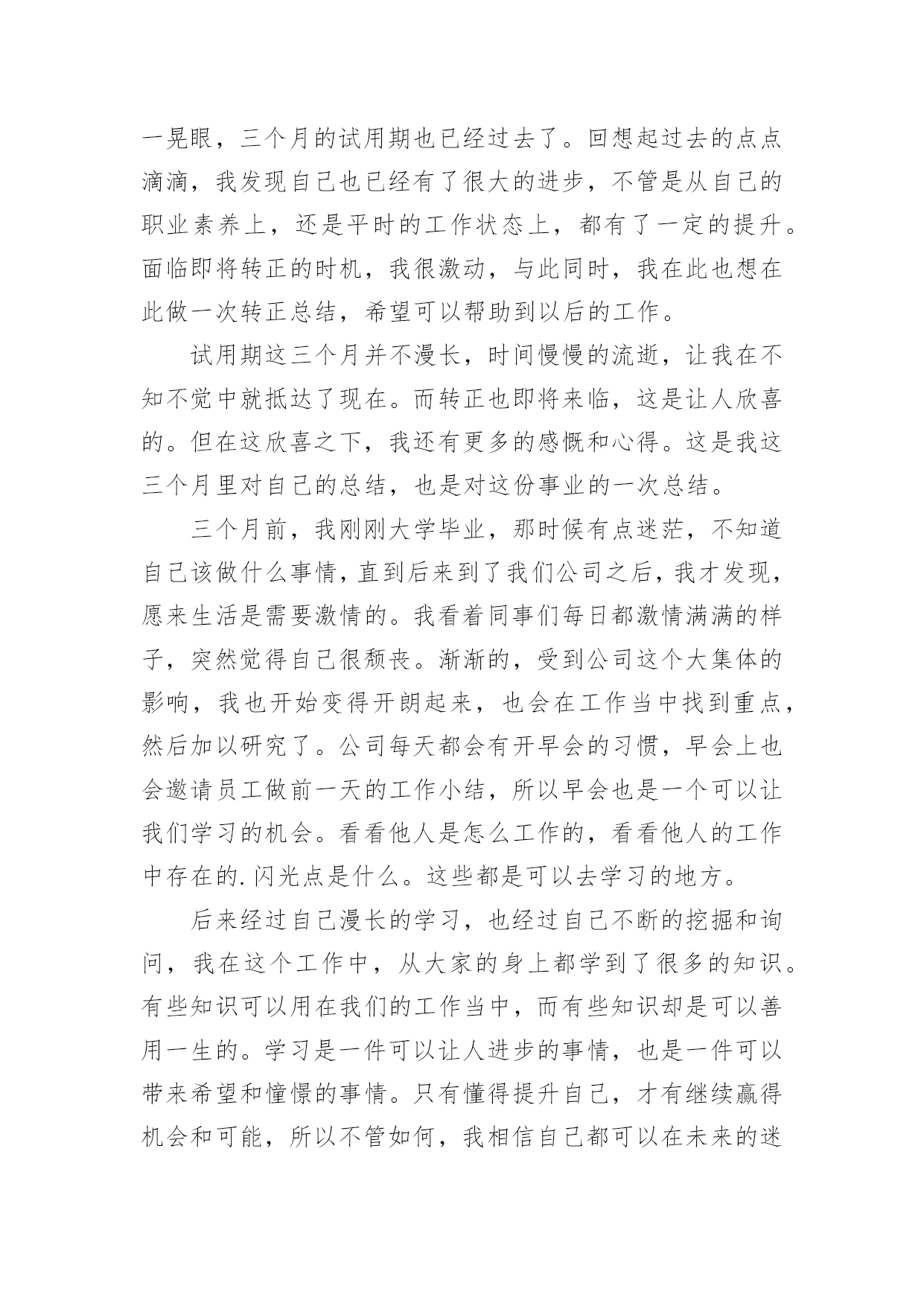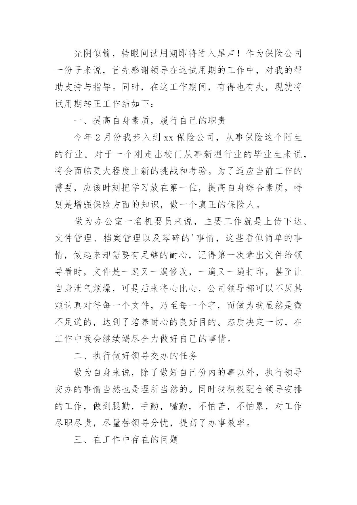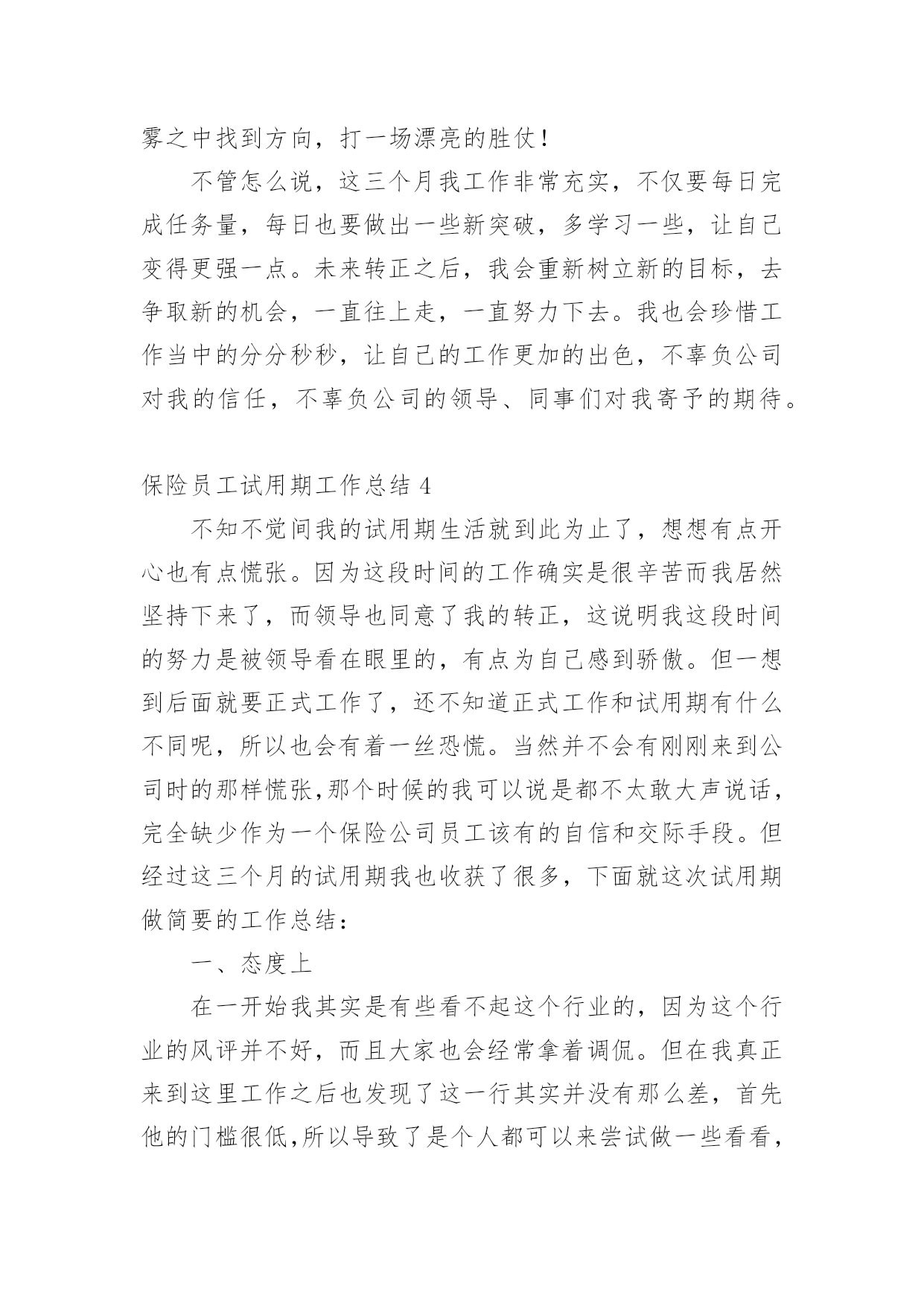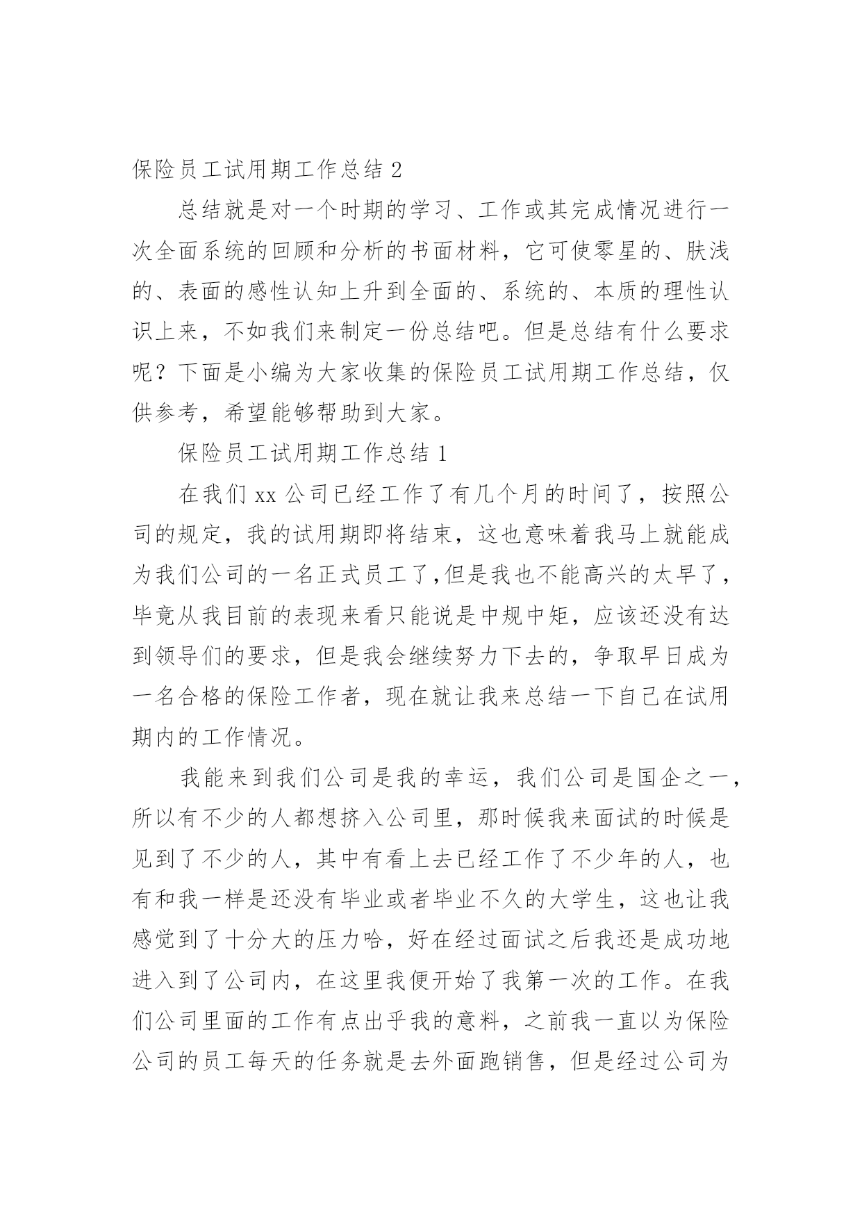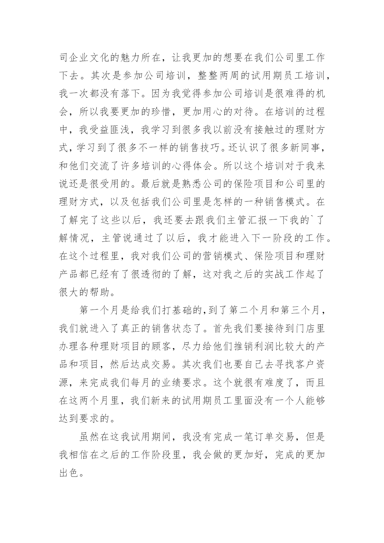 保险员工试用期工作总结保险员工试用期工作总结12篇总结是事后对某一时期、某一项目或某些工作进行回顾和分析,从而做出带有规律性的结论,它可使零星的、肤浅的、表面的感性认知上升到全面的、系统的、本质的理性认识上来,让我们好好写一份总结吧。总结一般是怎么写的呢?下面是小编为大家整理的保险员工试用期工作总结,欢迎大家借鉴与参考,希望对大家有所帮助。保险员工试用期工作总结1在咱们xx公司已经工作了有几个月的时间了,按照公司的规定,我的试用期即将结束,这也意味着我马上就能成为咱们公司的一名正式员工了,但是我也不能高兴的太早了,毕竟从我目前的表现来看只能说是中规中矩,应该还没有达到领导们的要求,但是我会继续努力下去的,争取早日成为一名合格的保险工作者,现在就让我来总结一下自己在试用期内的工作情况。我能来到咱们公司是我的幸运,咱们公司是国企之一,所以有不少的人都想挤入公司里,那时候我来面试的时候是见到了不少的人,其中有看上去已经工作了不少年的人,也有和我一样是还没有毕业或者毕业不久的大学生,这也让我感觉到了十分大的`压力哈,好在经过面试之后我还是成功地进入到了公司内,在这里我便开始了我第一次的工作。在咱们公司里面的工作有点出乎我的意料,之前我一直以为保险公司的员工每天的任务就是去外面跑销售,但是经过公司为我们这些新人准备的入职培训后,我发现保险原来是分为不少种类的,有寿险、车险、医疗险等等,这些业务都被各大保险公司所垄断了,咱们公司主要负责的就是车险,不过这也不要求每一位员工整天去外面跑业务,毕竟现在网络信息很发达了,详细客户都是用电话和微信了,只是偶尔需要去和客户们面对面交谈一下业务。不过,难一点的业务还轮不到我们这些新人来做,我现在要做的事情就是了解公司里最基础的业务和工作内容,然后再一点点的去学习更为复杂的业务,想要直接从新人跳到正式员工那是不太现实的,大家都是这样慢慢走过来的,我十分明白公司对我们的用意,所以现在虽然没有太多机会去接触更深的业务,但是我也没有气馁,做好自己目前的工作才是重点,即便每天我只是在做一些类似打杂的事情,在这个试用期内,我发现身边有些人因为耐不住这种枯燥感就离职了,这也说明他们的心性还不够强大啊,要是这样的态度也就说明了他们在以后的工作中难以取得实质性的成就,所以这个试用期还是挺能分辨出哪些人是比较适合保险这个行业的。现在,我对于保险工作的了解已经深入了不少,相信在诸多领导的带领下,我会得到更多的提升,和咱们公司一同发展的更好!保险员工试用期工作总结2总结就是对一个时期的学习、工作或其完成情况进行一次全面系统的回顾和分析的书面材料,它可使零星的、肤浅的、表面的感性认知上升到全面的、系统的、本质的理性认识上来,不如我们来制定一份总结吧。但是总结有什么要求呢?下面是小编为大家收集的保险员工试用期工作总结,仅供参考,希望能够帮助到大家。保险员工试用期工作总结1在我们xx公司已经工作了有几个月的时间了,按照公司的规定,我的试用期即将结束,这也意味着我马上就能成为我们公司的一名正式员工了,但是我也不能高兴的太早了,毕竟从我目前的表现来看只能说是中规中矩,应该还没有达到领导们的要求,但是我会继续努力下去的,争取早日成为一名合格的保险工作者,现在就让我来总结一下自己在试用期内的工作情况。我能来到我们公司是我的幸运,我们公司是国企之一,所以有不少的人都想挤入公司里,那时候我来面试的时候是见到了不少的人,其中有看上去已经工作了不少年的人,也有和我一样是还没有毕业或者毕业不久的大学生,这也让我感觉到了十分大的压力哈,好在经过面试之后我还是成功地进入到了公司内,在这里我便开始了我第一次的工作。在我们公司里面的工作有点出乎我的意料,之前我一直以为保险公司的员工每天的任务就是去外面跑销售,但是经过公司为我们这些新人准备的入职培训后,我发现保险原来是分为不少种类的,有寿险、车险、医疗险等等,这些业务都被各大保险公司所垄断了,我们公司主要负责的`就是车险,不过这也不要求每一位员工整天去外面跑业务,毕竟现在网络信息很发达了,详细客户都是用电话和微信了,只是偶尔需要去和客户们面对面交谈一下业务。不过,难一点的业务还轮不到我们这些新人来做,我现在要做的事情就是了解公司里最基础的业务和工作内容,然后再一点点的去学习更为复杂的业务,想要直接从新人跳到正式员工那是不太现实的,大家都是这样慢慢走过来的,我十分明白公司对我们的用意,所以现在虽然没有太多机会去接触更深的业务,但是我也没有气馁,做好自己目前的工作才是重点,即便每天我只是在做一些类似打杂的事情,在这个试用期内,我发现身边有些人因为耐不住这种枯燥感就离职了,这也说明他们的心性还不够强大啊,要是这样的态度也就说明了他们在以后的工作中难以取得实质性的成就,所以这个试用期还是挺能分辨出哪些人是比较适