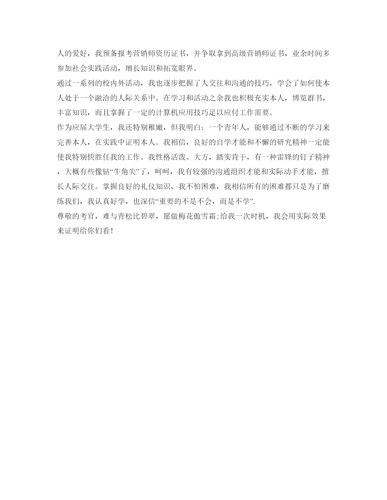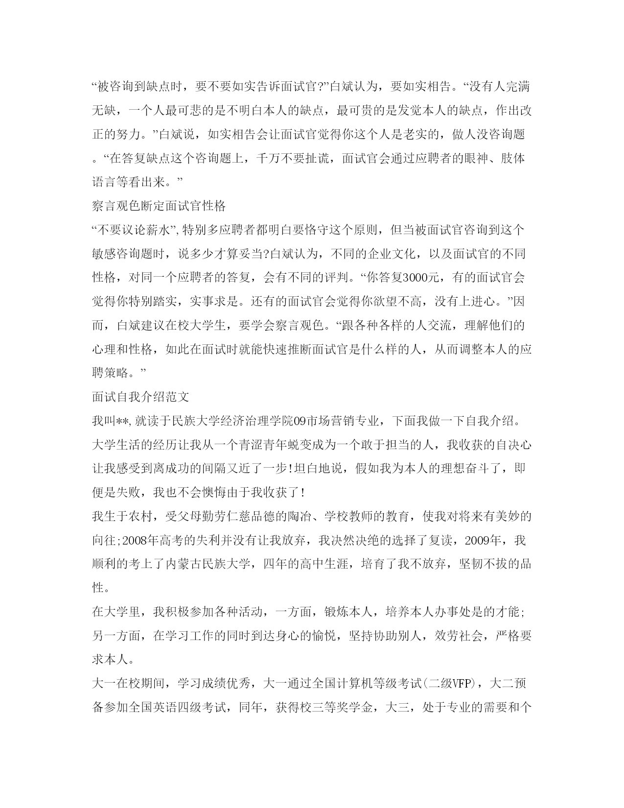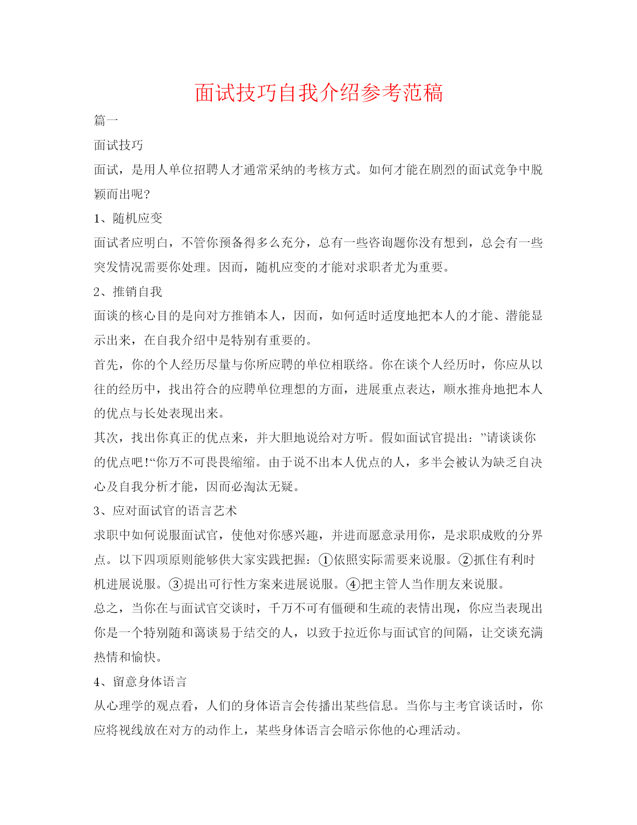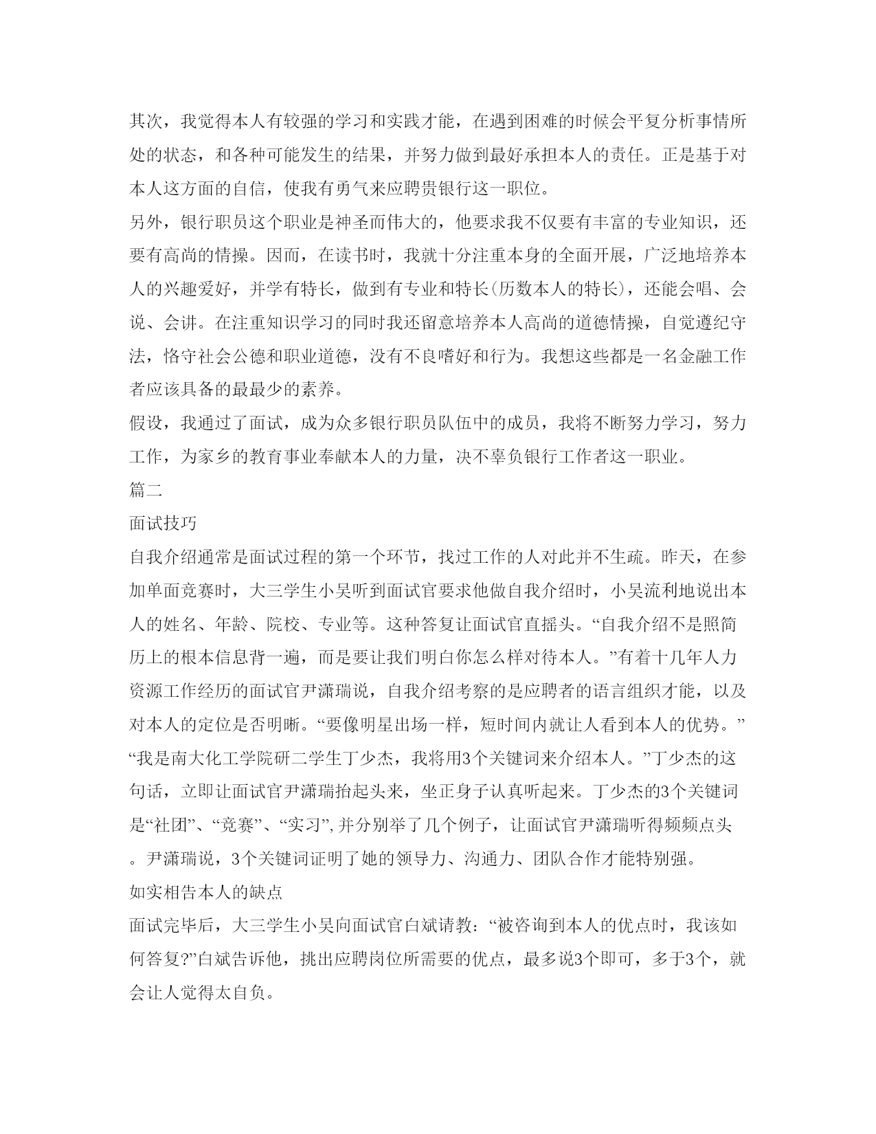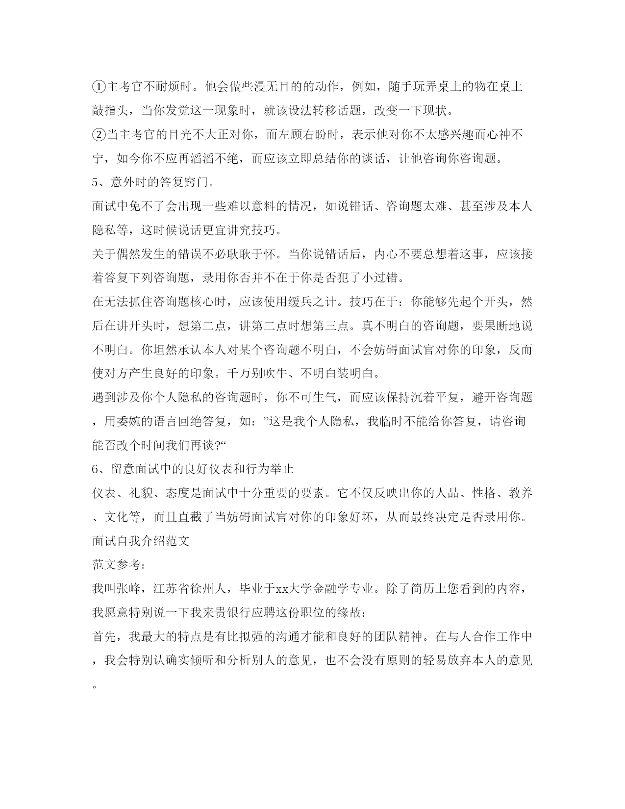 面试技巧自我介绍参考范稿篇一面试技巧面试,是用人单位招聘人才通常采纳的考核方式。如何才能在剧烈的面试竞争中脱颖而出呢?1、随机应变面试者应明白,不管你预备得多么充分,总有一些咨询题你没有想到,总会有一些突发情况需要你处理。因而,随机应变的才能对求职者尤为重要。2、推销自我面谈的核心目的是向对方推销本人,因而,如何适时适度地把本人的才能、潜能显示出来,在自我介绍中是特别有重要的。首先,你的个人经历尽量与你所应聘的单位相联络。你在谈个人经历时,你应从以往的经历中,找出符合的应聘单位理想的方面,进展重点表达,顺水推舟地把本人的优点与长处表现出来。其次,找出你真正的优点来,并大胆地说给对方听。假如面试官提出:”请谈谈你的优点吧!“你万不可畏畏缩缩。由于说不出本人优点的人,多半会被认为缺乏自决心及自我分析才能,因而必淘汰无疑。3、应对面试官的语言艺术求职中如何说服面试官,使他对你感兴趣,并进而愿意录用你,是求职成败的分界点。以下四项原则能够供大家实践把握:①依照实际需要来说服。②抓住有利时机进展说服。③提出可行性方案来进展说服。④把主管人当作朋友来说服。总之,当你在与面试官交谈时,千万不可有僵硬和生疏的表情出现,你应当表现出你是一个特别随和蔼谈易于结交的人,以致于拉近你与面试官的间隔,让交谈充满热情和愉快。4、留意身体语言从心理学的观点看,人们的身体语言会传播出某些信息。当你与主考官谈话时,你应将视线放在对方的动作上,某些身体语言会暗示你他的心理活动。①主考官不耐烦时。他会做些漫无目的的动作,例如,随手玩弄桌上的物在桌上敲指头,当你发觉这一现象时,就该设法转移话题,改变一下现状。②当主考官的目光不大正对你,而左顾右盼时,表示他对你不太感兴趣而心神不宁,如今你不应再滔滔不绝,而应该立即总结你的谈话,让他咨询你咨询题。5、意外时的答复窍门。面试中免不了会出现一些难以意料的情况,如说错话、咨询题太难、甚至涉及本人隐私等,这时候说话更宜讲究技巧。关于偶然发生的错误不必耿耿于怀。当你说错话后,内心不要总想着这事,应该接着答复下列咨询题,录用你否并不在于你是否犯了小过错。在无法抓住咨询题核心时,应该使用缓兵之计。技巧在于:你能够先起个开头,然后在讲开头时,想第二点,讲第二点时想第三点。真不明白的咨询题,要果断地说不明白。你坦然承认本人对某个咨询题不明白,不会妨碍面试官对你的印象,反而使对方产生良好的印象。千万别吹牛、不明白装明白。遇到涉及你个人隐私的咨询题时,你不可生气,而应该保持沉着平复,避开咨询题,用委婉的语言回绝答复,如:”这是我个人隐私,我临时不能给你答复,请咨询能否改个时间我们再谈?“6、留意面试中的良好仪表和行为举止仪表、礼貌、态度是面试中十分重要的要素。它不仅反映出你的人品、性格、教养、文化等,而且直截了当妨碍面试官对你的印象好坏,从而最终决定是否录用你。面试自我介绍范文范文参考:我叫张峰,江苏省徐州人,毕业于xx大学金融学专业。除了简历上您看到的内容,我愿意特别说一下我来贵银行应聘这份职位的缘故:首先,我最大的特点是有比拟强的沟通才能和良好的团队精神。在与人合作工作中,我会特别认确实倾听和分析别人的意见,也不会没有原则的轻易放弃本人的意见。其次,我觉得本人有较强的学习和实践才能,在遇到困难的时候会平复分析事情所处的状态,和各种可能发生的结果,并努力做到最好承担本人的责任。正是基于对本人这方面的自信,使我有勇气来应聘贵银行这一职位。另外,银行职员这个职业是神圣而伟大的,他要求我不仅要有丰富的专业知识,还要有高尚的情操。因而,在读书时,我就十分注重本身的全面开展,广泛地培养本人的兴趣爱好,并学有特长,做到有专业和特长(历数本人的特长),还能会唱、会说、会讲。在注重知识学习的同时我还留意培养本人高尚的道德情操,自觉遵纪守法,恪守社会公德和职业道德,没有不良嗜好和行为。我想这些都是一名金融工作者应该具备的最最少的素养。假设,我通过了面试,成为众多银行职员队伍中的成员,我将不断努力学习,努力工作,为家乡的教育事业奉献本人的力量,决不辜负银行工作者这一职业。篇二面试技巧自我介绍通常是面试过程的第一个环节,找过工作的人对此并不生疏。昨天,在参加单面竞赛时,大三学生小吴听到面试官要求他做自我介绍时,小吴流利地说出本人的姓名、年龄、院校、专业等。这种答复让面试官直摇头。“自我介绍不是照简历上的根本信息背一遍,而是要让我们明白你怎么样对待本人。”有着十几年人力资源工作经历的面试官尹潇瑞说,自我介绍考察的是应聘者的语言组织才能,以及对本人的定位是否明晰。“要像明星出场一样,短时间内就让人看到本人的优势。”“我是南大化工学院研二学生丁少杰,我将用3个关键词来介绍本人。”丁少杰的这句话,立即