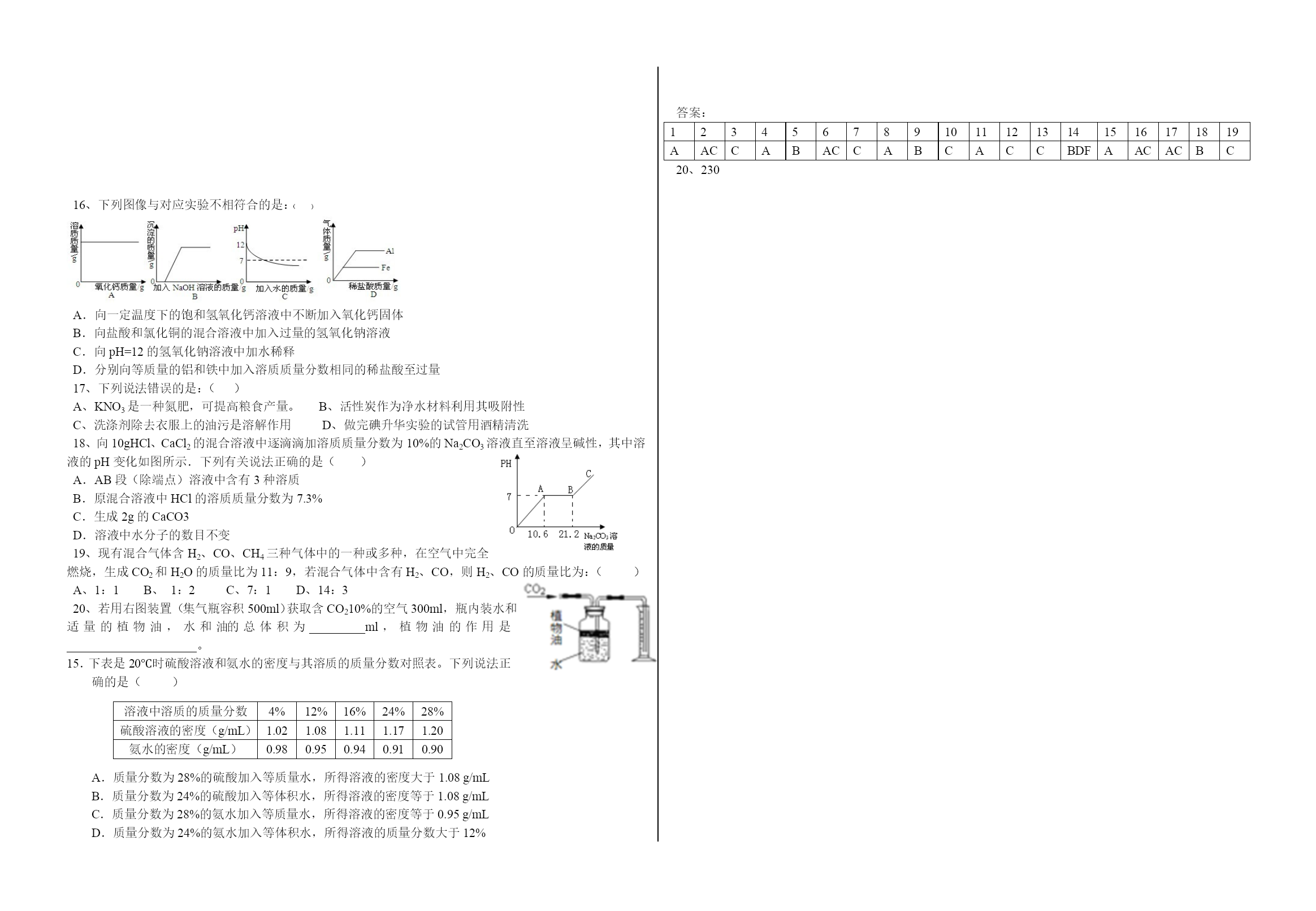 2012赢在中考错题集1、铝跟盐酸或氢氧化钠溶液都能反应,且都有氢气产生.反应的化学方程式分别可表示如下:2Al+6HCl=2AlCl3+3H2↑;2Al+2NaOH+2H2O=2NaAlO2+3H2↑。甲、乙两烧杯中各盛有109.5克10%的盐酸和120克10%的氢氧化钠溶液,向两烧杯中分别加入等质量的铝粉,反应结束后测得生成气体质量比为甲:乙=1:2,则加入铝粉的质量为()A、5.4克B、3.6克C、2.7克D、1.8克2、下列实验操作能达到目的的是:物质ACO2(H2O)干燥将气体通过有碱石灰干燥管BMnO2(KCl)分离溶解、过滤、蒸发C盐酸(硫酸)除去硫酸加适量的氯化钡溶液后过滤DCaCl2(HCl)溶液除去HCl加入过量氢氧化钙,过滤3、对于某些离子的检验及结论一定正确的是:()A.加入稀盐酸产生无色气体,将气体通入澄清石灰水中,溶液变浑浊,原溶液一定有CO32-B.加入氯化钡溶液有白色沉淀产生,再加盐酸,沉淀不消失,原溶液一定有SO42-C.加入氢氧化钠溶液并加热,产生的气体能使湿润红色石蕊试纸变蓝,原溶液一定有NH4+D.加入碳酸钠溶液产生白色沉淀,再加盐酸沉淀消失,原溶液一定有Ca2+4、在等质量、等质量分数的三份稀盐酸中,分别加入①MgO\②Mg(OH)2、③MgCO3三种物质,均能恰好完全反应,分别得到三份无色澄清溶液.则所得溶液中MgCl2的质量分数大小关系的比较,下列正确的是()A.①=③>②B.①>②>③C.③>②>①D.①=②=③5、将10克质量分数为20%的苛性钠溶液与20克质量分数为10%的硫酸溶液混合后,下列物质中不能与该混合后的溶液发生反应的是:()A.CuCl2B.Na2CO3C.CO2D.Ba(NO3)26、向含有AgNO3、Cu(NO3)2的混合溶液中加入一定质量的锌粉,充分反应后过滤。向滤出的固体中滴加稀盐酸,没有气体生成,向滤液中滴加盐酸没有白色沉淀。下列结论正确的是:()A.滤出的固体中一定含有AgB.滤出的固体一定是Ag和Cu的混合物C.滤液中一定有Zn(NO3)2可能有Cu(NO3)2,一定没有AgNO3D.滤液中一定没有AgNO3和Cu(NO3)27、下列说法不正确的是:()A、水银不是银而是汞B、有机玻璃不是玻璃而是塑料C、玻璃钢不是玻璃而是钢D、纯碱不是碱而是盐8、如图是M、N两种固体物质(不含结晶水)的溶解度曲线,下列说法错误的是()A.图中A点表示在t1℃时M、N溶液的溶质质量分数相等B.t2℃时,分别将M、N饱和溶液冷却到t1℃,所得溶液的溶质质量分数都为20%C.M中含有少量N,通常采用冷却结晶的方法提纯MD.t1℃时,M溶液恒温蒸发10g水析出1g晶体,再恒温蒸发20g水将析出2g晶体9、下列各组物质能按照关系图(→表示反应一步完成)相互转化的是()物质ABCDXNaOHCa(OH)2Fe2O3CuYNaNO3CaCl2FeCuOZNa2SO4CaCO3FeCl2Cu(OH)210、下列各组物质,不能按照关系图(“→”表示反应一步完成)相互转化的是()物质ABCDxCaOBaCl2Cu(NO3)2COyCaCl2Ba(NO3)2CuSO4CO2zCaCO3BaCO3Cu(OH)2O211、在由CH4和H2组成的混合气体中,测知碳元素的质量分数为60%,则混合气体充分燃烧生成二氧化碳和水的质量比为()A.11:18B.22:9C.1:1D.11:27点燃12、物质R在9.6克氧气中恰好完全燃烧,化学方程式为:R+3O2====CO2+2XO2,测得CO2和XO2的质量分别为4.4g和12.8g.下列判断正确的是()A.参加反应的R的质量为8.6gB.XO2的相对分子质量为128C.X的相对原子质量为32D.R中含有X元素、C元素和O元素13、某实验小组的同学取大理石和稀盐酸反应后的废液50g,逐滴加入质量分数为26.5%的碳酸钠溶液.他们根据实验测得的数据绘出右图,其中纵坐标m是实验得到的沉淀或气体的质量,横坐标表示的是碳酸钠溶液质量。下列说法正确的是()A.图中oa段表示生成的沉淀量B.c点表示碳酸钠合好完全反应C.与50g废液恰好完全反应时消耗碳酸钠溶液的质量为30gD.最终产生气体的质量为5g14、下列各组括号内除杂质的方法或试剂错误的是:A.CuCl2溶液中混有CuSO4(BaCl2溶液)B.H2中混有CO(灼热的CuO)C.NaCl溶液中混有泥沙(过滤)D.CaO中混有CaCO3(稀盐酸)E.CO2中混有CO(点燃)F.CO中混有CO2(氢氧化钠溶液)G.碳粉中混有CuO(稀硫酸)H.Ca(OH)2中混有CaO(水)15、下列图像与对应实验相符合的是:()A.图①表