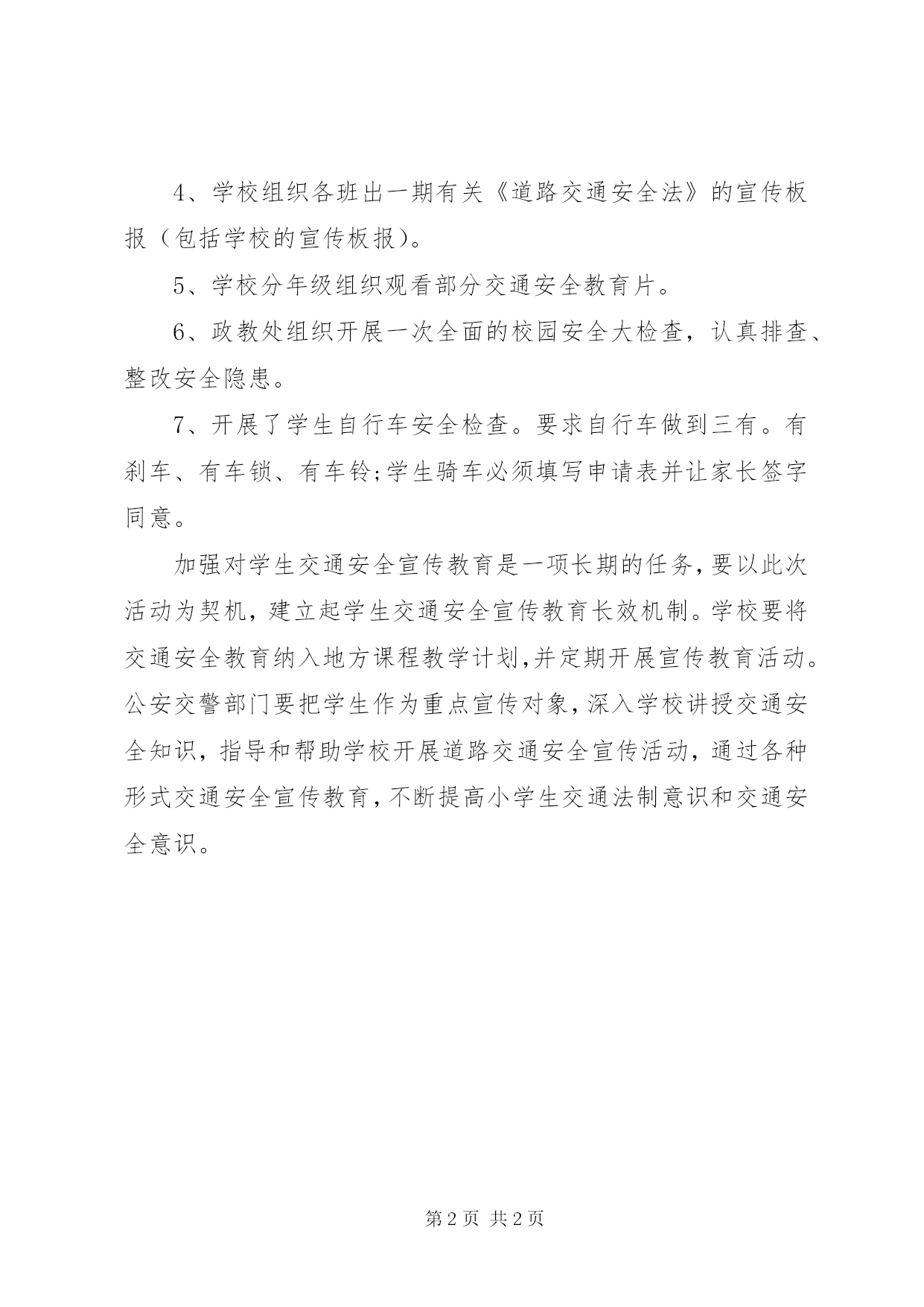 第PAGE\*Arabic\*MERGEFORMAT2页共NUMPAGES\*MERGEFORMAT2页小学交通安全日活动总结为开展全国中小学生安全教育日的宣传教育活动,加强我校的安全教育,大力学习宣传《道路交通安全法》等,增强我校学生的交通安全意识和交通安全自我防护能力,我校从实际出发,于xx年11月29曰12月3日实施了学校交通安全教育宣传周活动方案,取得了良好成效。一、成立了领导小组。学校成立了交通安全宣传活动领导小组,由朱汉明校长任组长,朱德亮书记任副组长的领导小组,下设宣传活动办公室,由王明亮主任任办公室主任,负责组织实施全校宣传月活动工作。二、开展了一系列富有成效的活动。1、召开一次交通安全教育宣传教育动员会。利用早晨升国旗的机会,刘力平校长作了题为《珍爱生命,安全第一》的重要讲话,对全校师生进行交通安全教育宣传动员,要求全体教师和学生必须高度重视交通安全,认真学爿有关交通安全知识与法规,严格遵守交通法规,努力避免交通安全事故的发生。2、学校印发《大纵湖小学交通安全安全告家长书》给各年段、各班级,要求班主任利用班会课组织学生进行学习。3、各班组织召开了lsquo;lsquo;珍爱生命安全第一的主题班会。4、学校组织各班出一期有关《道路交通安全法》的宣传板报(包括学校的宣传板报)。5、学校分年级组织观看部分交通安全教育片。6、政教处组织开展一次全面的校园安全大检查,认真排查、整改安全隐患。7、开展了学生自行车安全检查。要求自行车做到三有。有刹车、有车锁、有车铃;学生骑车必须填写申请表并让家长签字同意。加强对学生交通安全宣传教育是一项长期的任务,要以此次活动为契机,建立起学生交通安全宣传教育长效机制。学校要将交通安全教育纳入地方课程教学计划,并定期开展宣传教育活动。公安交警部门要把学生作为重点宣传对象,深入学校讲授交通安全知识,指导和帮助学校开展道路交通安全宣传活动,通过各种形式交通安全宣传教育,不断提高小学生交通法制意识和交通安全意识。