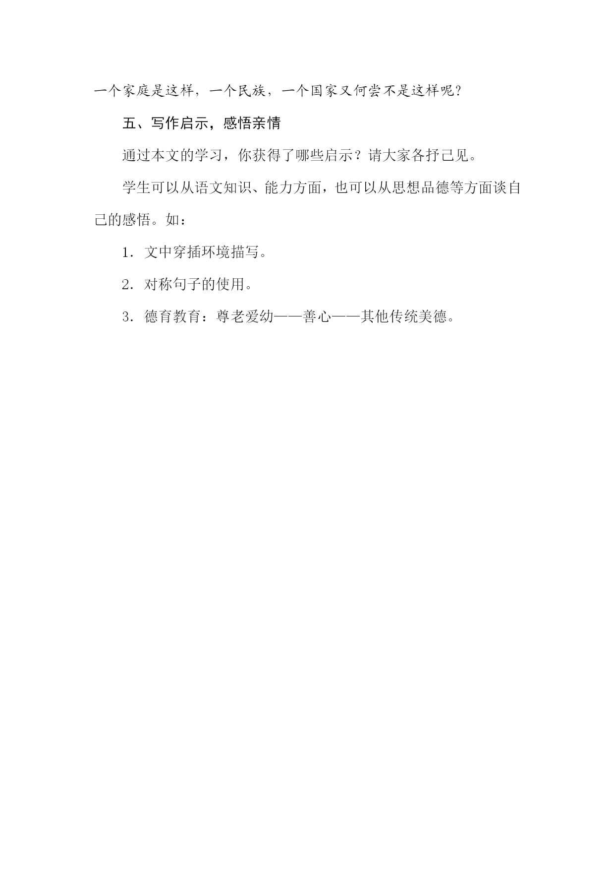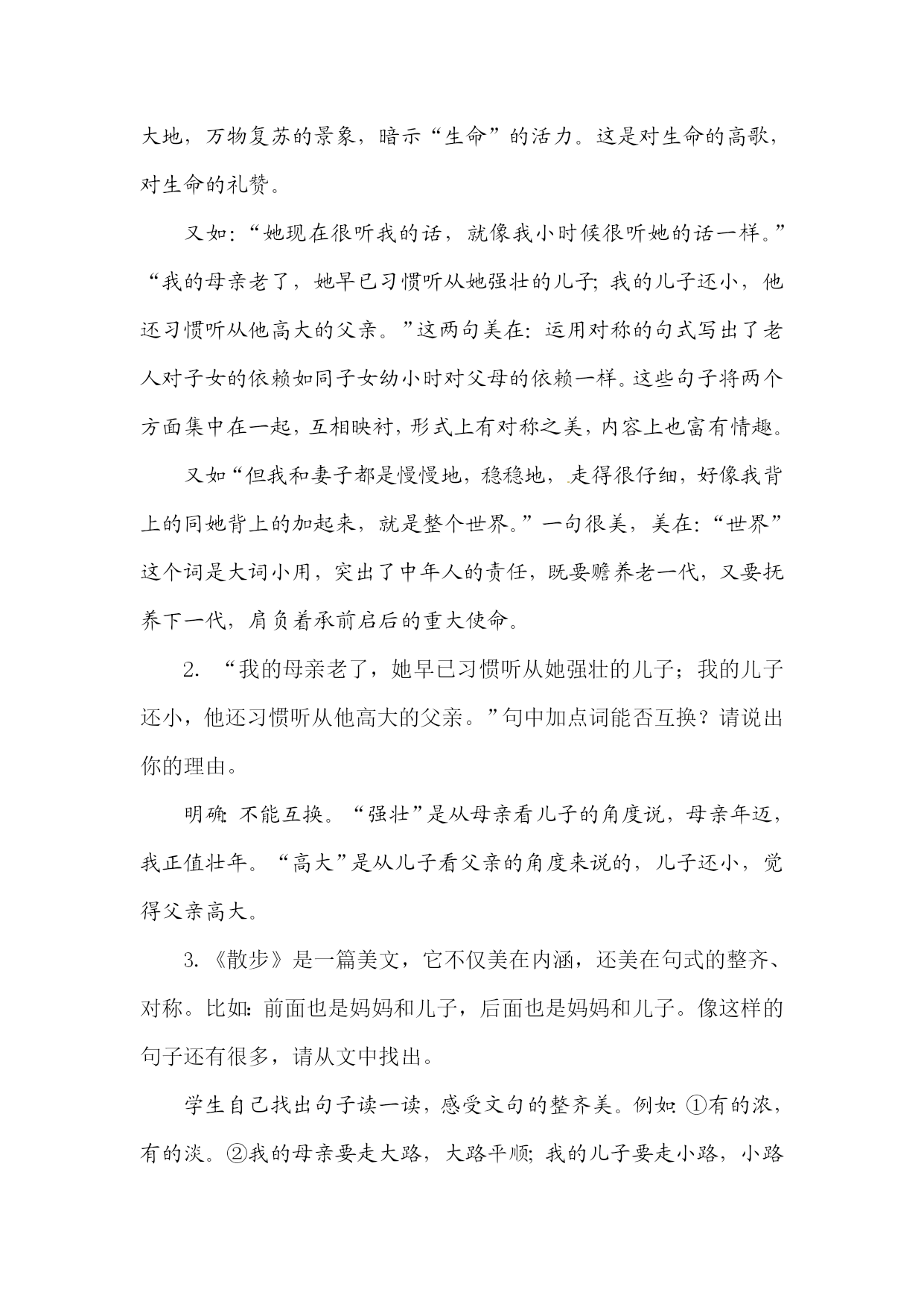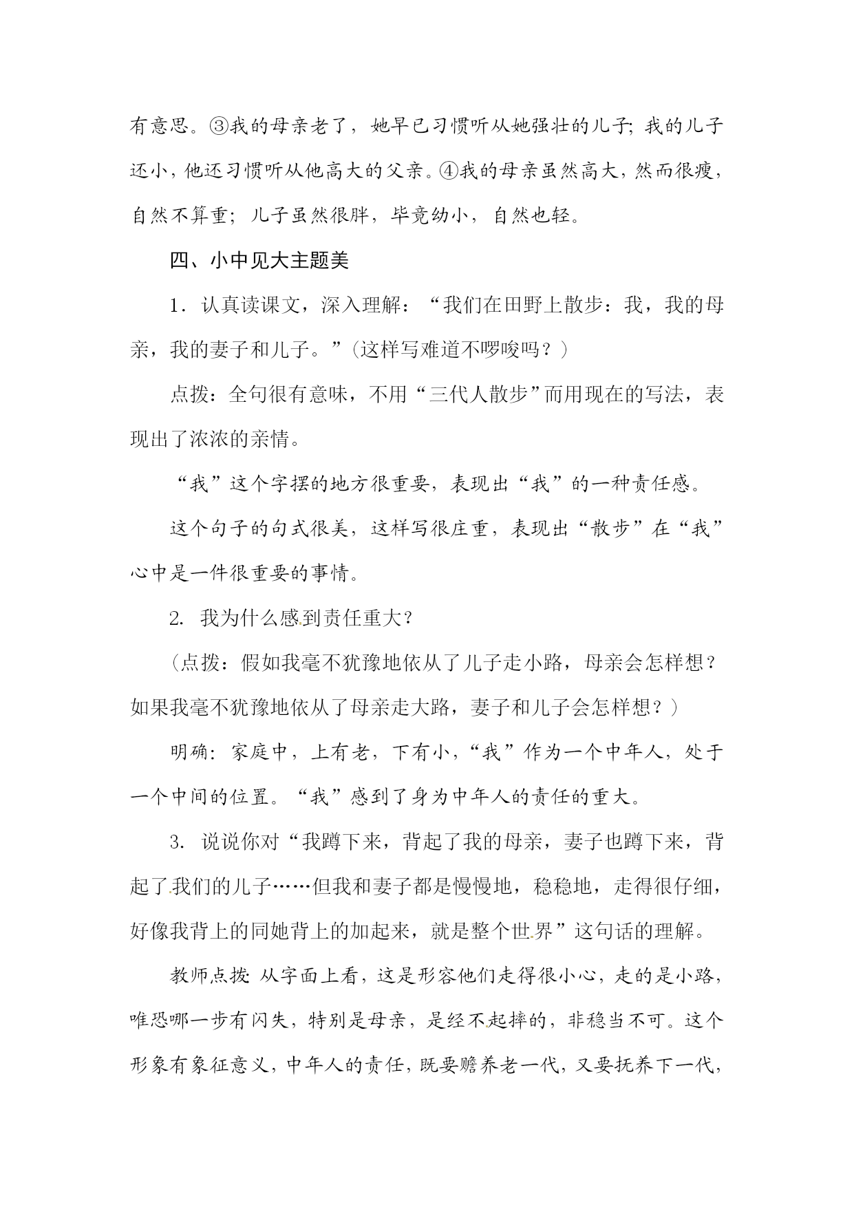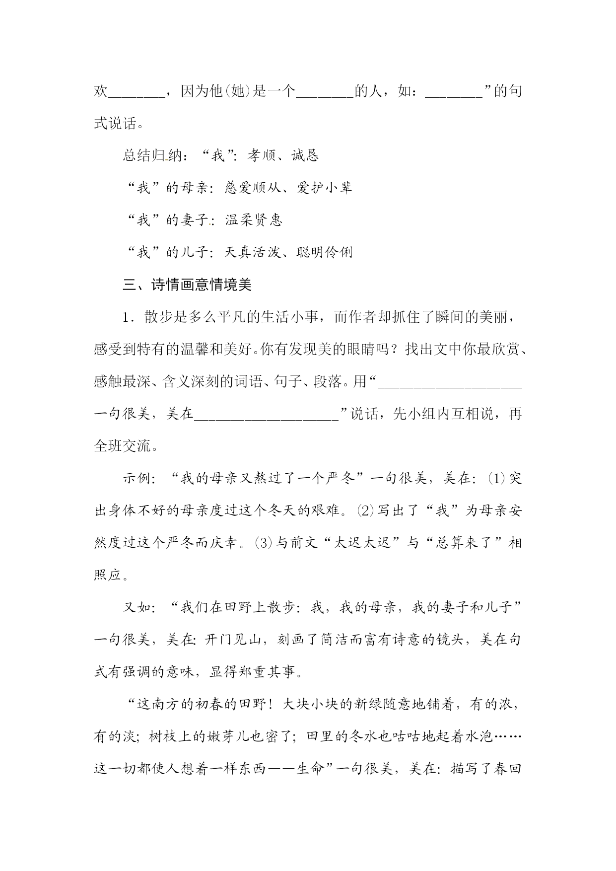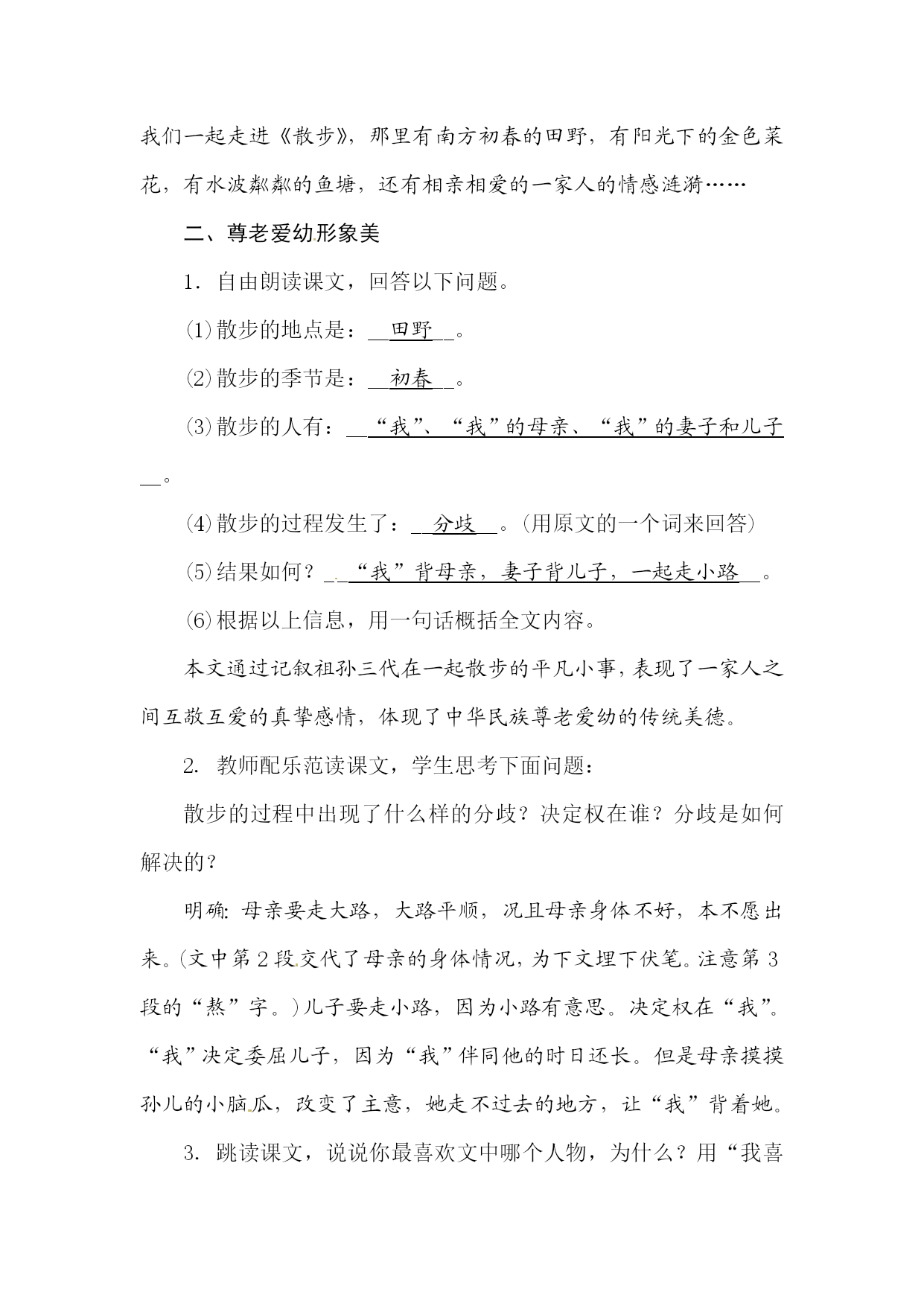《散步》教学设计eq\a\vs4\al(教学目标)1.学习运用精巧的细节描写表现主题的方法,体会人物形象美。2.品味揣摩语句,感悟语言对称之美。3.把握文章主旨,体会尊老爱幼的传统美德及对生活的高度使命感。eq\a\vs4\al(教学重难点)[来源:学,科,网]1.品味揣摩语句,把握文章主旨。2.理解“我”对生活的使命感。xkb1.comeq\a\vs4\al(学情分析)七年级学生,这个年龄段的学生有强烈的好奇心和旺盛的求知欲。但对生活的观察不够细致,缺乏生活体验,又由于社会上一些不良因素的误导,许多学生尊老爱幼的观念比较淡薄,没有形成正确的家庭伦理观,因此需要教师进一步加强教育。eq\a\vs4\al(课时分配)1课时教学过程一、新课导入孝敬父母、尊老爱幼是我们中华民族的传统美德,也体现着人世间美好的情感——亲情。其实,在我们的成长过程中一直都沐浴着亲情。哪位同学能联系生活实际,说说你都感受到了哪些亲情?(学生举例回答,教师予以肯定)像在日常生活中全家人一起吃饭、看电视、聊天等等,哪怕是一家人一起散步这样平常的小事,也能体现出浓浓的亲情。《散步》这篇课文就为我们讲述了这样一个感人的故事。让我们一起走进《散步》,那里有南方初春的田野,有阳光下的金色菜花,有水波粼粼的鱼塘,还有相亲相爱的一家人的情感涟漪……二、尊老爱幼形象美1.自由朗读课文,回答以下问题。(1)散步的地点是:__田野__。(2)散步的季节是:__初春__。[来源:Z#xx#k.Com](3)散步的人有:__“我”、“我”的母亲、“我”的妻子和儿子__。(4)散步的过程发生了:__分歧__。(用原文的一个词来回答)(5)结果如何?__“我”背母亲,妻子背儿子,一起走小路__。(6)根据以上信息,用一句话概括全文内容。本文通过记叙祖孙三代在一起散步的平凡小事,表现了一家人之间互敬互爱的真挚感情,体现了中华民族尊老爱幼的传统美德。2.教师配乐范读课文,学生思考下面问题:散步的过程中出现了什么样的分歧?决定权在谁?分歧是如何解决的?明确:母亲要走大路,大路平顺,况且母亲身体不好,本不愿出来。(文中第2段交代了母亲的身体情况,为下文埋下伏笔。注意第3段的“熬”字。)儿子要走小路,因为小路有意思。决定权在“我”。“我”决定委屈儿子,因为“我”伴同他的时日还长。但是母亲摸摸孙儿的小脑瓜,改变了主意,她走不过去的地方,让“我”背着她。3.跳读课文,说说你最喜欢文中哪个人物,为什么?用“我喜欢________,因为他(她)是一个________的人,如:________”的句式说话。总结归纳:“我”:孝顺、诚恳“我”的母亲:慈爱顺从、爱护小辈“我”的妻子:温柔贤惠“我”的儿子:天真活泼、聪明伶俐三、诗情画意情境美1.散步是多么平凡的生活小事,而作者却抓住了瞬间的美丽,感受到特有的温馨和美好。你有发现美的眼睛吗?找出文中你最欣赏、感触最深、含义深刻的词语、句子、段落。用“____________________一句很美,美在____________________”说话,先小组内互相说,再全班交流。示例:“我的母亲又熬过了一个严冬”一句很美,美在:(1)突出身体不好的母亲度过这个冬天的艰难。(2)写出了“我”为母亲安然度过这个严冬而庆幸。(3)与前文“太迟太迟”与“总算来了”相照应。www.xkb1.com又如:“我们在田野上散步:我,我的母亲,我的妻子和儿子”一句很美,美在:开门见山,刻画了简洁而富有诗意的镜头,美在句式有强调的意味,显得郑重其事。“这南方的初春的田野!大块小块的新绿随意地铺着,有的浓,有的淡;树枝上的嫩芽儿也密了;田里的冬水也咕咕地起着水泡……这一切都使人想着一样东西——生命”一句很美,美在:描写了春回大地,万物复苏的景象,暗示“生命”的活力。这是对生命的高歌,对生命的礼赞。又如:“她现在很听我的话,就像我小时候很听她的话一样。”“我的母亲老了,她早已习惯听从她强壮的儿子;我的儿子还小,他还习惯听从他高大的父亲。”这两句美在:运用对称的句式写出了老人对子女的依赖如同子女幼小时对父母的依赖一样。这些句子将两个方面集中在一起,互相映衬,形式上有对称之美,内容上也富有情趣。又如“但我和妻子都是慢慢地,稳稳地,走得很仔细,好像我背上的同她背上的加起来,就是整个世界。”一句很美,美在:“世界”这个词是大词小用,突出了中年人的责任,既要赡养老一代,又要抚养下一代,肩负着承前启后的重大使命。2.“我的母亲老了,她早已习惯听从她强壮的儿子;我的儿子还小,他还习惯听从他高大的父亲。”句中加点词能否互换?请说出你的理由。明确:不能互换。“强壮”是从母亲看儿子的角度说,母亲年迈,我