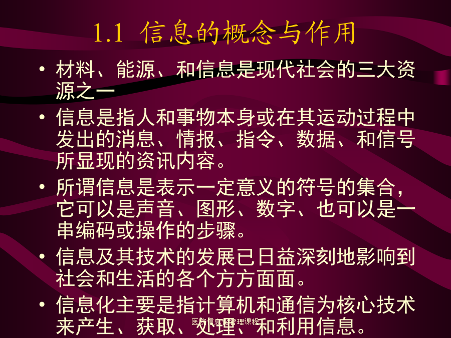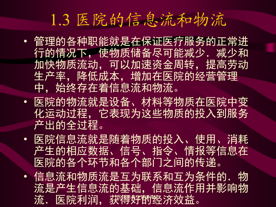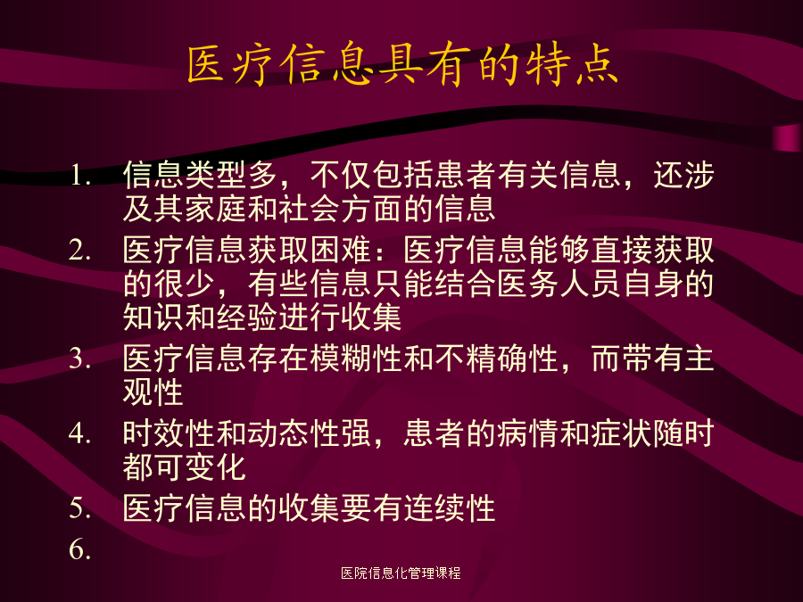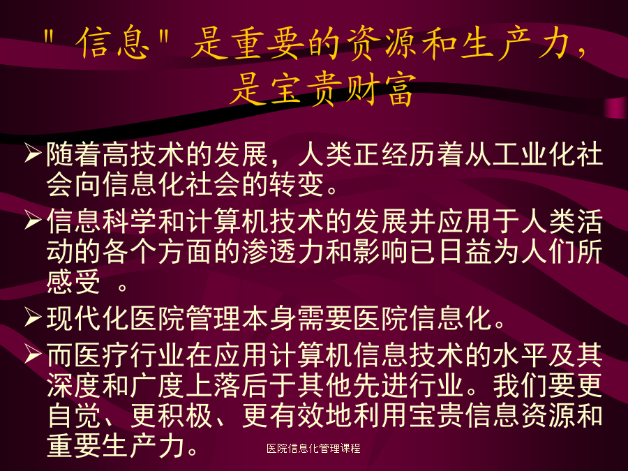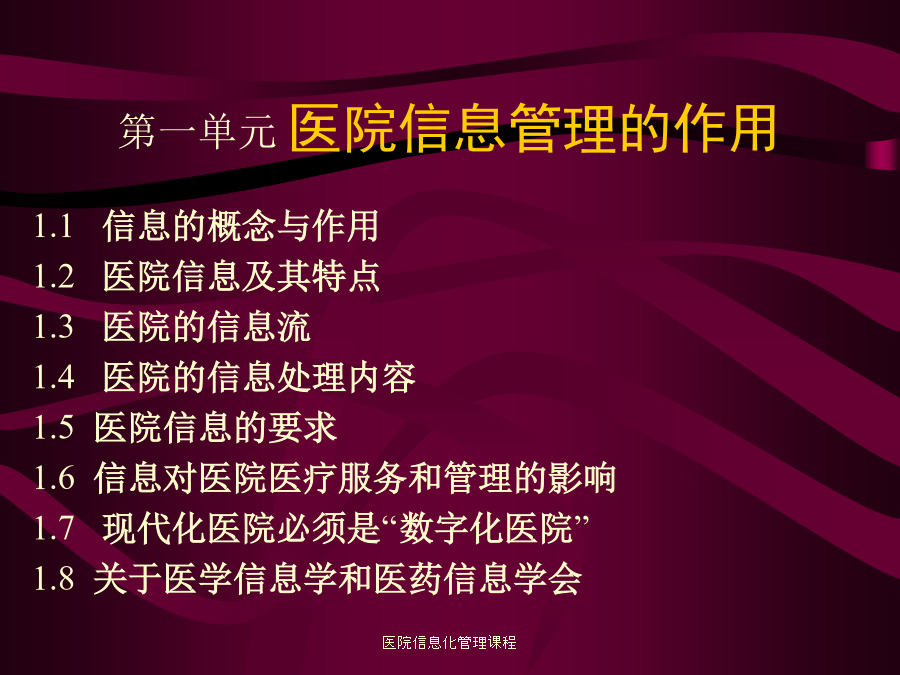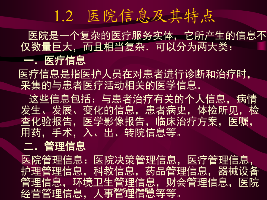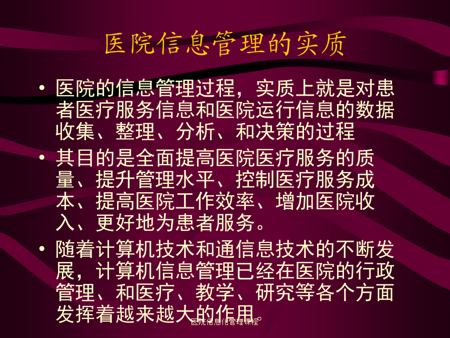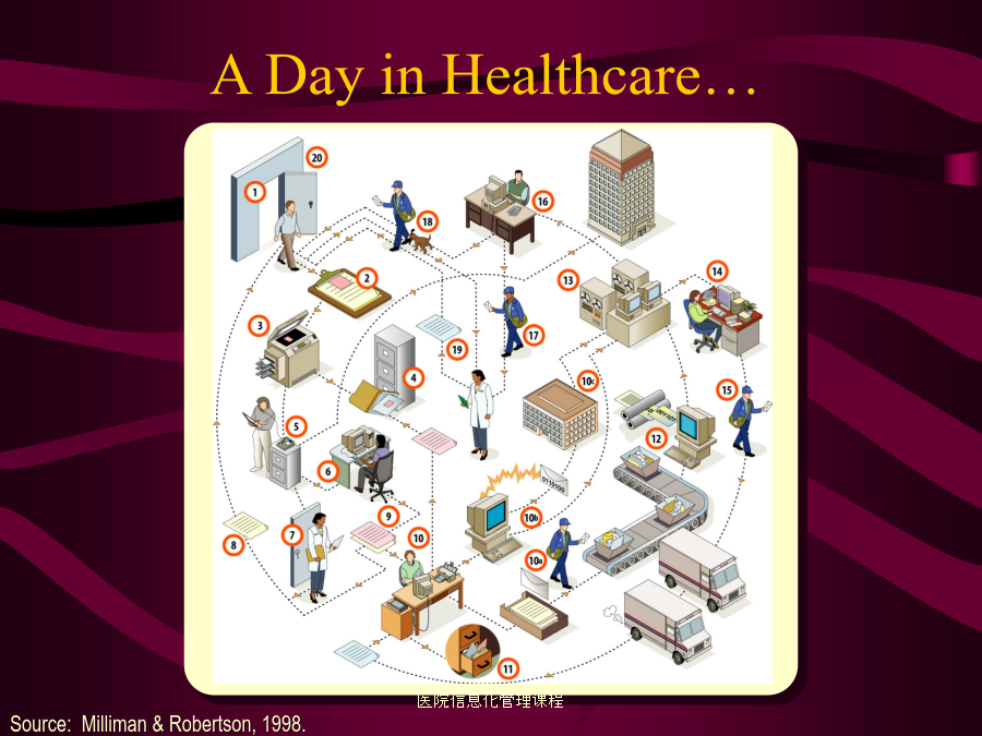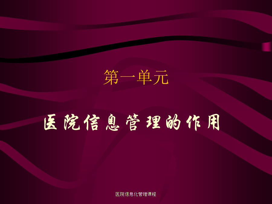 医院信息化管理课程第一单元第一单元医院信息管理的作用1.1信息的概念与作用医院信息管理的实质"信息"是重要的资源和生产力,是宝贵财富1.2医院信息及其特点医疗信息具有的特点1.3医院的信息流和物流信息流的反馈循环和滞后性1.4医院的信息处理内容1.41原始数据的收集1.42信息的加工整理1.43信息的存储与更新1.44信息传输1.45信息的检索和输出1.5医院信息的要求1.6信息对医院医疗服务和管理的影响1.7现代化医院必须是“数字化医院”1.71数字化医院的特征1.72计算机的本质计算机的基本概念计算机系统组成计算机的发展信息系统的体系结构应用软件系统的多层结构Source:Siemens1.8关于医学信息学和医药信息学会1.81医学信息学简介MedicalInformatics医学信息学MedicalInformatics医学信息学MedicalInformatics医学信息学医学信息学的工具示例医学信息学应用示例安全性有效性医疗质量医疗费用结果与过程衡量医学计算机应用的系统观医学信息学的应用系统观点作这样的系统观的意义利用六层次模型使医学计算机的应用结构化模型以病人为中心的医疗系统的焦点医学信息化应用的其他技术医学信息化应用的障碍医学信息学主要参考文献:医学信息学为医学的现代化注入了新动力1.82关于国际药信息学会(IMIA)附:IMIA召开的MEDINFO历次大会1.83中国医药信息学会(CMIA)简介推动和关注医疗信息学的发展第二单元第二单元医院信息系统及其发展2.1医院信息系统概念“ThegoalofaHISistousecomputersandcommunicationequipmenttocollect,store,process,retrieveandcommunicatepatientcareandadministrativeinformationforallhospital-affiliatedactivitiesrequirementsofallauthorizedusers.”---Prof.MorriesF.Collen2.2医院信息系统是现代化医院必不可少的基础FinancialSystem2.3医院信息系统的组成与要求2.32与医疗相关的子系统:临床信息系统医院信息系统(HIS)示意图面向病人的临床信息系统一览临床信息系统的核心是数据库临床信息系统互联网络示例-心脏科室2.33其他相关的子系统2.34临床信息系统将是发展方向和重点2.35医院信息系统的复杂性2.36一个好的医院信息系统要满足需求2.4美国医疗行业应用计算机的演变2.4美国医疗行业应用计算机的演变(续)2.5国外发展医院信息系统历程国外发展医院信息系统历程(续)2.6我国医院信息系统发展初期概况2.7十年来我国医院信息系统的进步我国医院信息化建设的经验与教训过去十年HIS发展回顾十年来前进了一大步医院信息系统目前的发展模式当前存在的主要问题带普遍性的问题带普遍性的问题(续)几点建议几点启示2.8对我国医院信息系统进展状况的评价对我国医院信息系统进展状况的评价(续)医疗行业信息化状况调研结论第三单元第三单元我国医院信息系统的问题与对策3.1我国医院信息系统建设的不成功案例分析3.2目前我国医院信息系统的共性问题3.3HIS瓶颈问题的分析和对策3.31数据库平台的选择欠妥3.32系统总体规划和基础架构考虑不周3.33应用软件的设计方法和工具需要更新3.34对国外已有经验分析吸收不够OctoBarnett在总结医院建设经验教训时就指出过:OctoBarnett在总结医院建设经验教训时就指出过:MorrisCollen教授也曾归纳出早期医院信息系统五点失败的原因:国际医药信息学会专家们对HIS的成败讨论总结出的结论性意见3.4加强医院信息系统工程建设和应用管理实施HIS应强调的一些问题3.42实施策略一个好的医院信息系统要满足需求使医院信息系统发挥作用,至少要达到的水平关键是提高认识、明确要求对HIS的几个基本认识HIS的功能要求和复杂性小结:医院信息系统的基本点第四单元第四单元后关系型数据库及其重要性4.1M技术及其演变4.2医疗领域的主流数据库-Caché后关系型数据库4.3多维数据结构和高速缓冲技术4.31多维数据结构4.32独特的分布式高速缓冲存储技术4.4对象和SQL两大技术的融合4.5面向对象开发应用的好处4.6Caché数据库在医疗领域的应用4.6Caché数据库在医疗领域的应用(续)4.7Caché数据库应用软件的开发步骤1.需求分析与定义2.设计和实现应用3.建立客户端用户界面4.测试应用5.部署应用第五单元第五单元医院信息系统涉及的规范、标准和安全性5.1标准化的重要性5.2HIS涉及的常用国际标准5.2HIS涉及的