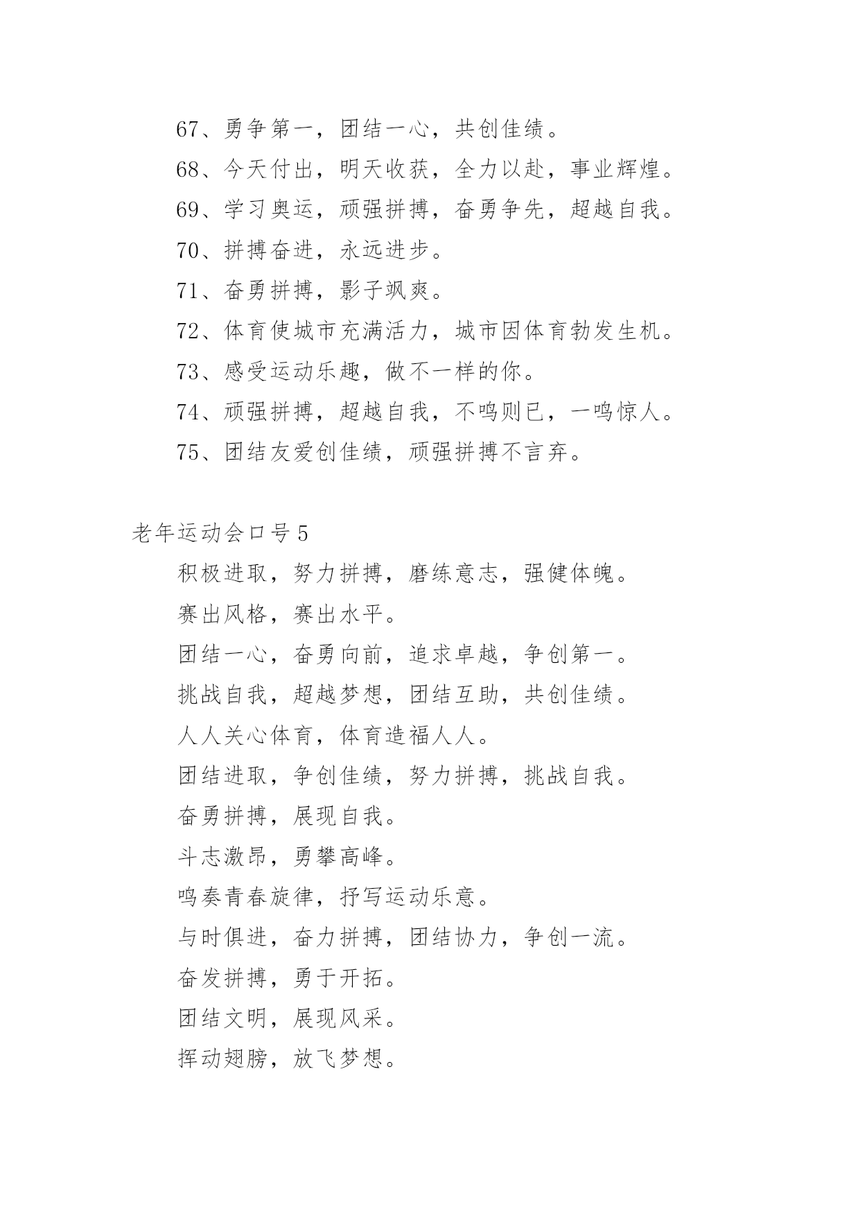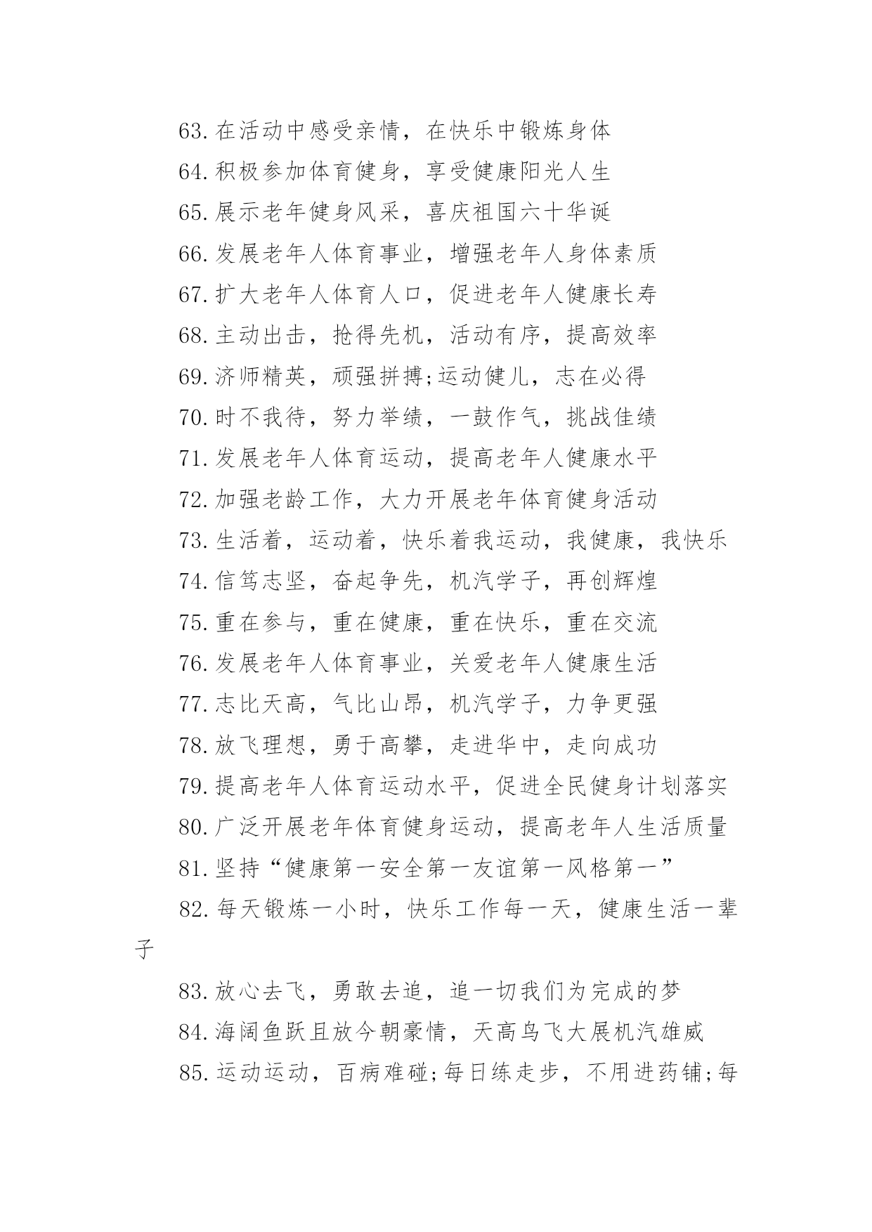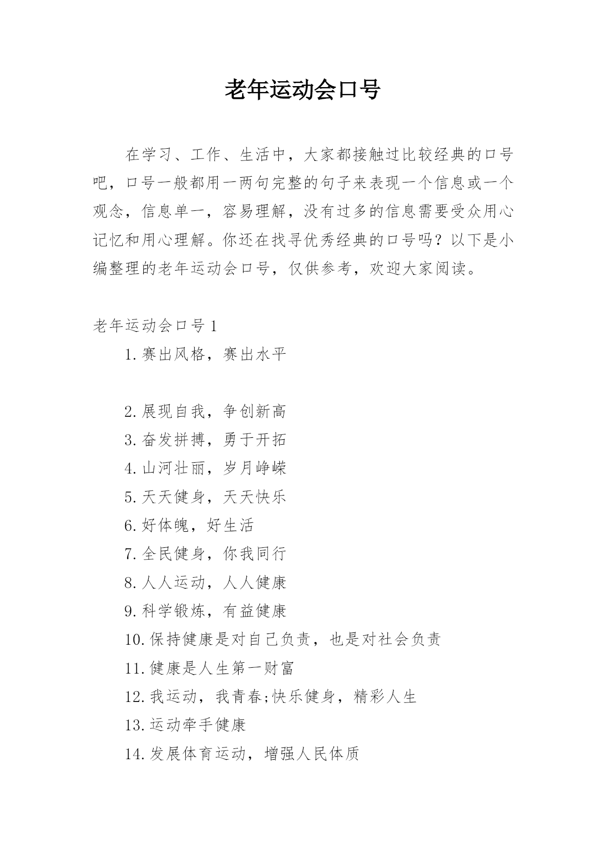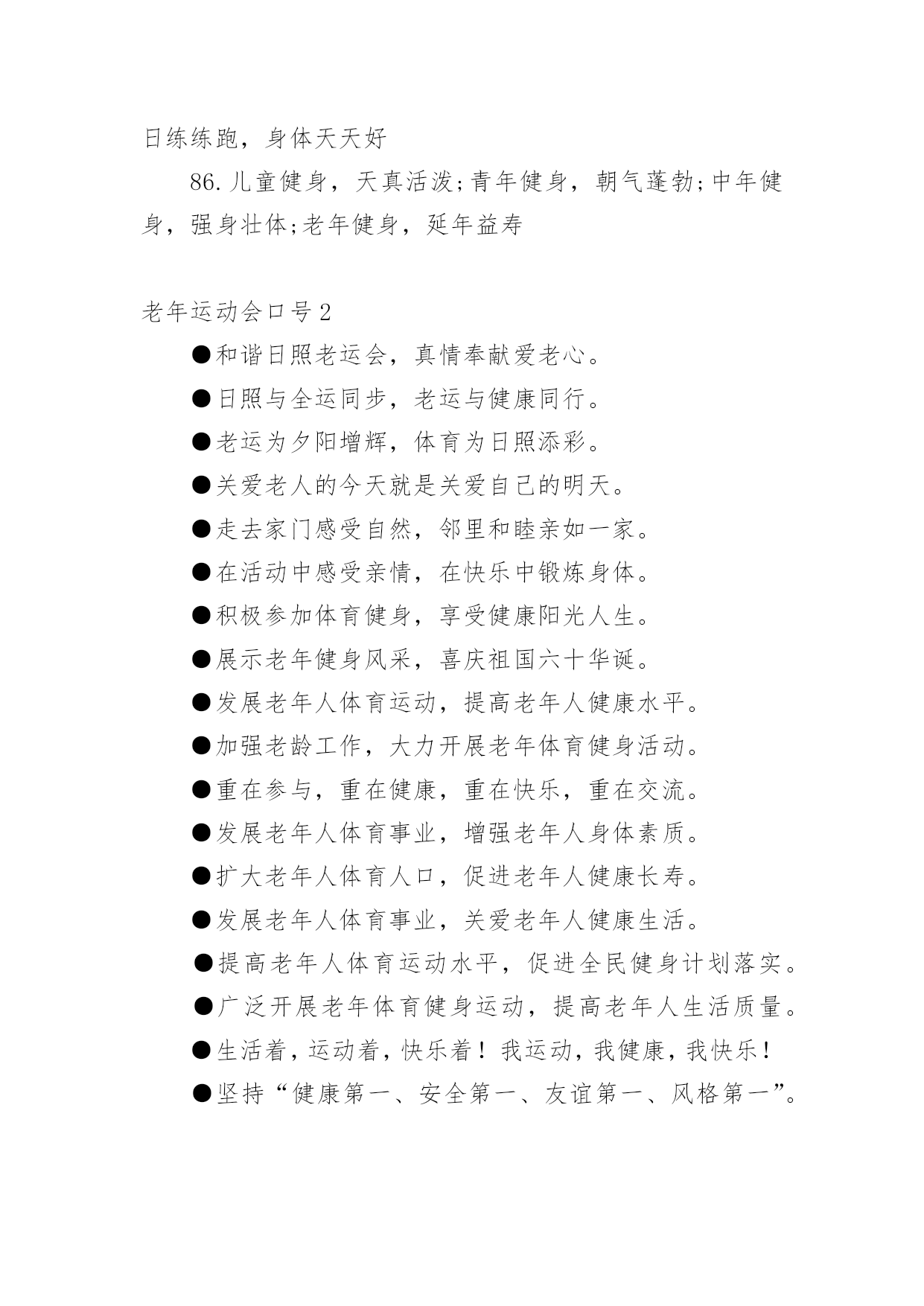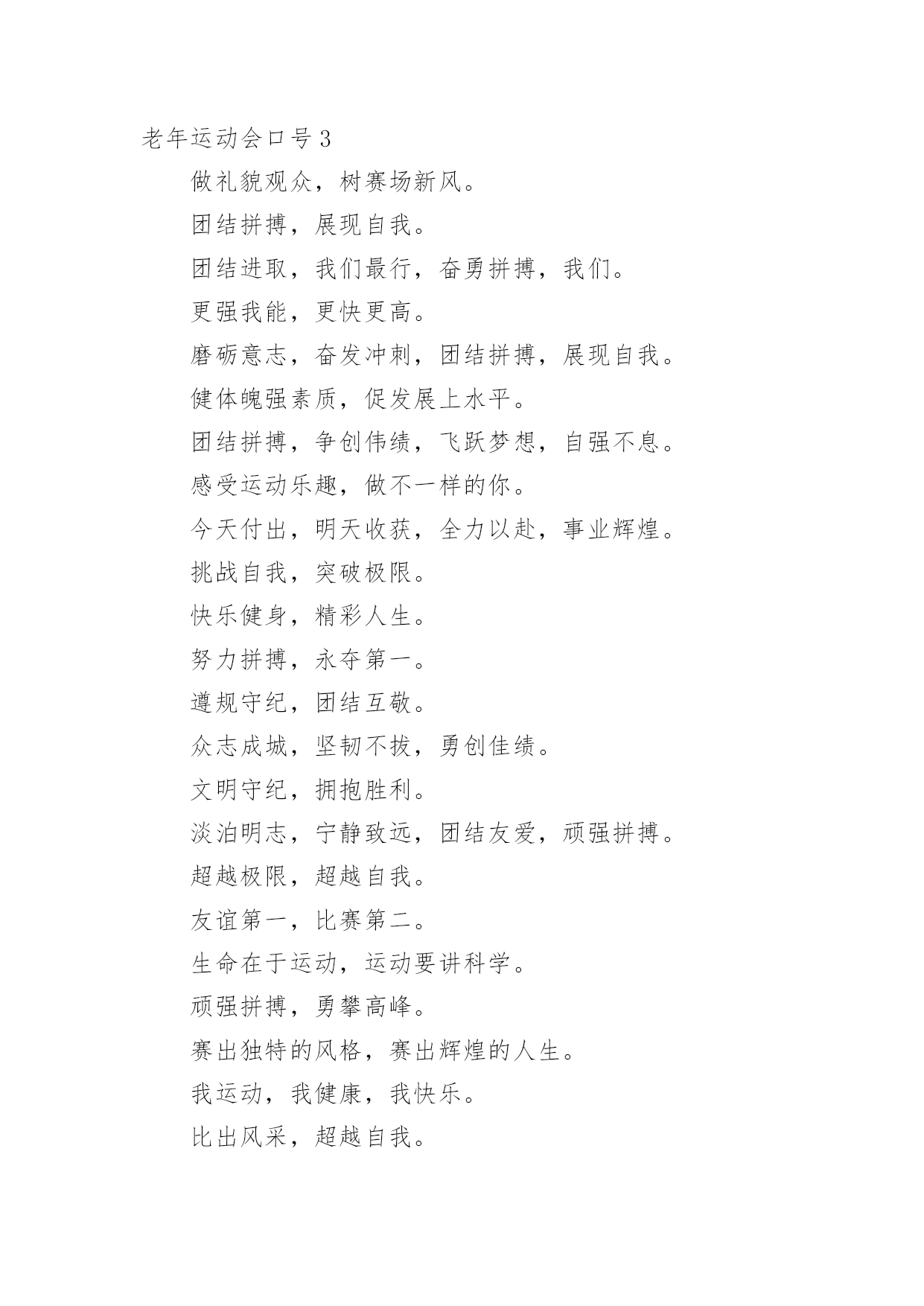 老年运动会口号在学习、工作、生活中,大家都接触过比较经典的口号吧,口号一般都用一两句完整的句子来表现一个信息或一个观念,信息单一,容易理解,没有过多的信息需要受众用心记忆和用心理解。你还在找寻优秀经典的口号吗?以下是小编整理的老年运动会口号,仅供参考,欢迎大家阅读。老年运动会口号11.赛出风格,赛出水平2.展现自我,争创新高3.奋发拼搏,勇于开拓4.山河壮丽,岁月峥嵘5.天天健身,天天快乐6.好体魄,好生活7.全民健身,你我同行8.人人运动,人人健康9.科学锻炼,有益健康10.保持健康是对自己负责,也是对社会负责11.健康是人生第一财富12.我运动,我青春;快乐健身,精彩人生13.运动牵手健康14.发展体育运动,增强人民体质15.开展全民健身运动,促进两个文明建设16.运动休闲,健康生活;开心运动,健康人生17.崇尚健康运动,珍爱宝贵生命18.弘扬奥运精神,展现人生风采19.健身健心强素质,文明诚信奔小康20.开展体育健身运动,营建健康快乐人生21.快乐健身,想动就动22.健康生活,快乐运动23.传播体育文化,建设精神文明24.体育的盛会,我们的节日25.竞赛勇夺金牌,文明展示风采26.生命在于运动,拼搏在于行动27.活力健康和谐;健身健康健美28.运动是健康之源29.我参与我运动我快乐30.拥抱健康超越自我体验快乐31.我运动我健康我快乐32.体育促进和谐,运动改变生活33.健康第一友谊第一比赛第二34.安全欢乐友谊俭朴35.扬我奥运精神展我老年风采36.遵规守纪,团结互敬37.赛出成绩,安全第一38.天道酬勤,健康起来39.努力奋斗,勇敢争先,40.斗志激昂,勇攀高峰41.全民健身,利国利民42.奋发拼搏,勇于开拓43.魅力永久,充满自信,赢得胜利44.比拼激扬梦想,搏击磨砺锋芒45.运动健儿志高扬,巾帼岂将须眉让46.文明守纪,拥抱胜利47.借城运强劲东风,促陕西经济发展48.青春无畏,逐梦扬威49.建我体魄,规我人生,建规建规,众望所归50.不言失败,赛出风采51.我运动,我健康,我快乐52.全民健身,利国利民,功在当代,利在千秋53.举省一致办城运,人人当好东道主54.大踏步向前,让生命实现我们的光彩()55.齐心协力,力争上游,永不言弃56.励精图治绘蓝图,凝神聚力谱新篇57.运动赛场展雄姿,老运健儿竞风流58.和谐日照老运会,真情奉献爱老心59.日照与全运同步,老运与健康同行60.老运为夕阳增辉,体育为日照添彩61.关爱老人的今天就是关爱自己的明天62.走去家门感受自然,邻里和睦亲如一家63.在活动中感受亲情,在快乐中锻炼身体64.积极参加体育健身,享受健康阳光人生65.展示老年健身风采,喜庆祖国六十华诞66.发展老年人体育事业,增强老年人身体素质67.扩大老年人体育人口,促进老年人健康长寿68.主动出击,抢得先机,活动有序,提高效率69.济师精英,顽强拼搏;运动健儿,志在必得70.时不我待,努力举绩,一鼓作气,挑战佳绩71.发展老年人体育运动,提高老年人健康水平72.加强老龄工作,大力开展老年体育健身活动73.生活着,运动着,快乐着我运动,我健康,我快乐74.信笃志坚,奋起争先,机汽学子,再创辉煌75.重在参与,重在健康,重在快乐,重在交流76.发展老年人体育事业,关爱老年人健康生活77.志比天高,气比山昂,机汽学子,力争更强78.放飞理想,勇于高攀,走进华中,走向成功79.提高老年人体育运动水平,促进全民健身计划落实80.广泛开展老年体育健身运动,提高老年人生活质量81.坚持“健康第一安全第一友谊第一风格第一”82.每天锻炼一小时,快乐工作每一天,健康生活一辈子83.放心去飞,勇敢去追,追一切我们为完成的梦84.海阔鱼跃且放今朝豪情,天高鸟飞大展机汽雄威85.运动运动,百病难碰;每日练走步,不用进药铺;每日练练跑,身体天天好86.儿童健身,天真活泼;青年健身,朝气蓬勃;中年健身,强身壮体;老年健身,延年益寿老年运动会口号2●和谐日照老运会,真情奉献爱老心。●日照与全运同步,老运与健康同行。●老运为夕阳增辉,体育为日照添彩。●关爱老人的今天就是关爱自己的明天。●走去家门感受自然,邻里和睦亲如一家。●在活动中感受亲情,在快乐中锻炼身体。●积极参加体育健身,享受健康阳光人生。●展示老年健身风采,喜庆祖国六十华诞。●发展老年人体育运动,提高老年人健康水平。●加强老龄工作,大力开展老年体育健身活动。●重在参与,重在健康,重在快乐,重在交流。●发展老年人体育事业,增强老年人身体素质。●扩大老年人体育人口,促进老年人健康长寿。●发展老年人体育事业,关爱老年人健康生活。●提高老年人体育运动水平,促进全民健身计划落实。●广泛开展老年体育健身运动,提高老年人生活质量。●生活着,运动着,快乐着!我运动,我健康,我快乐!●坚持“