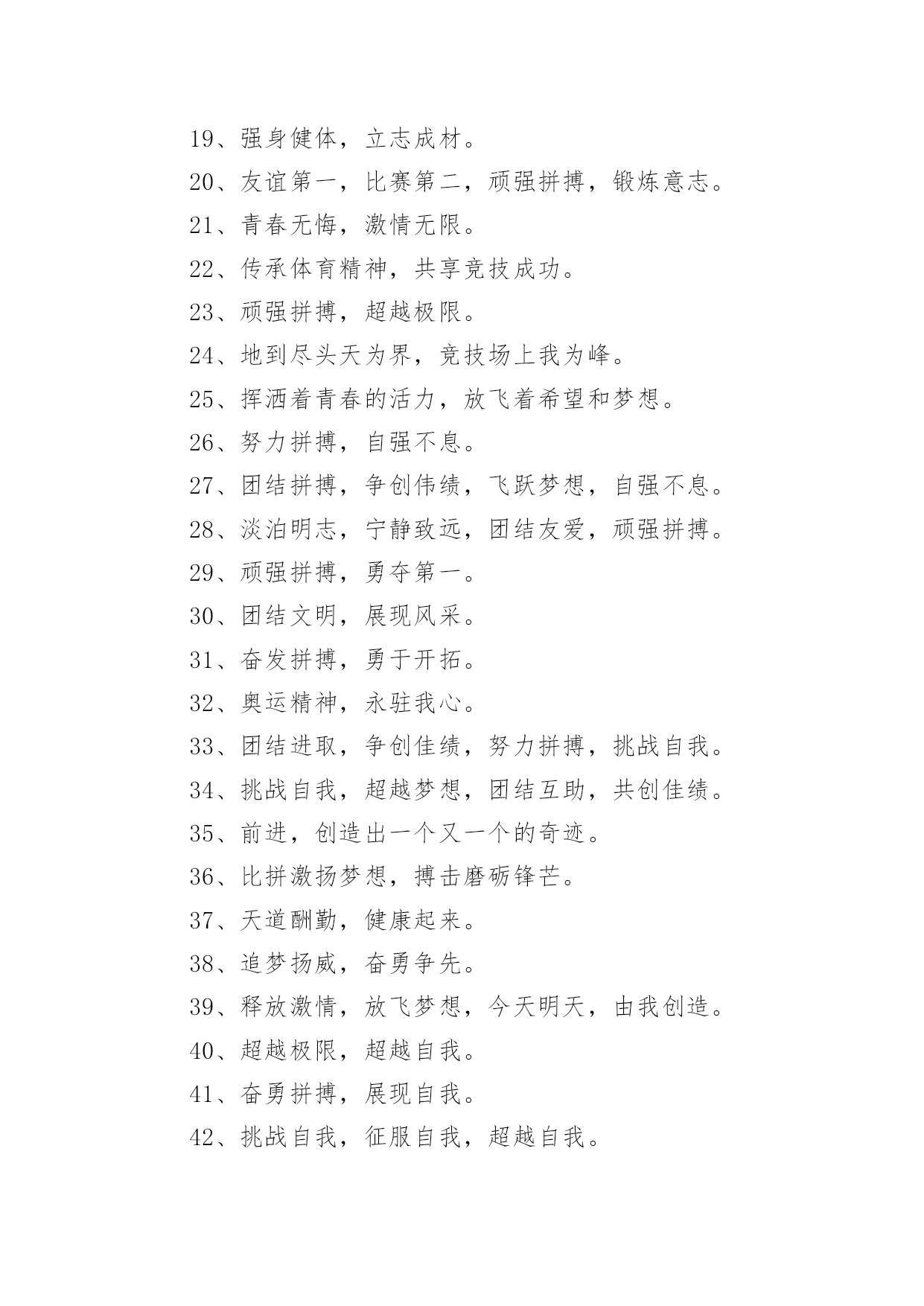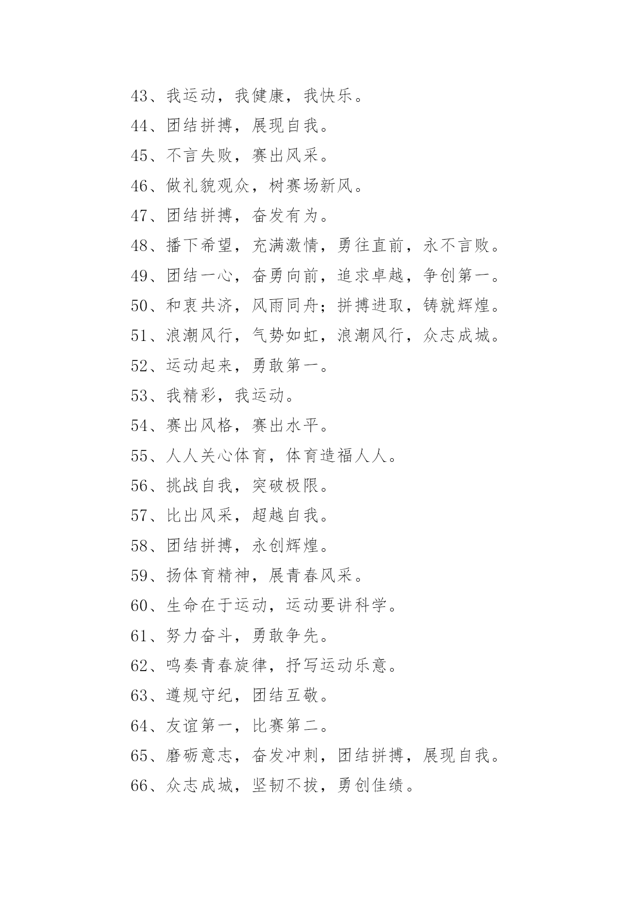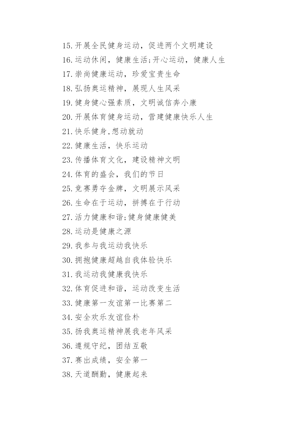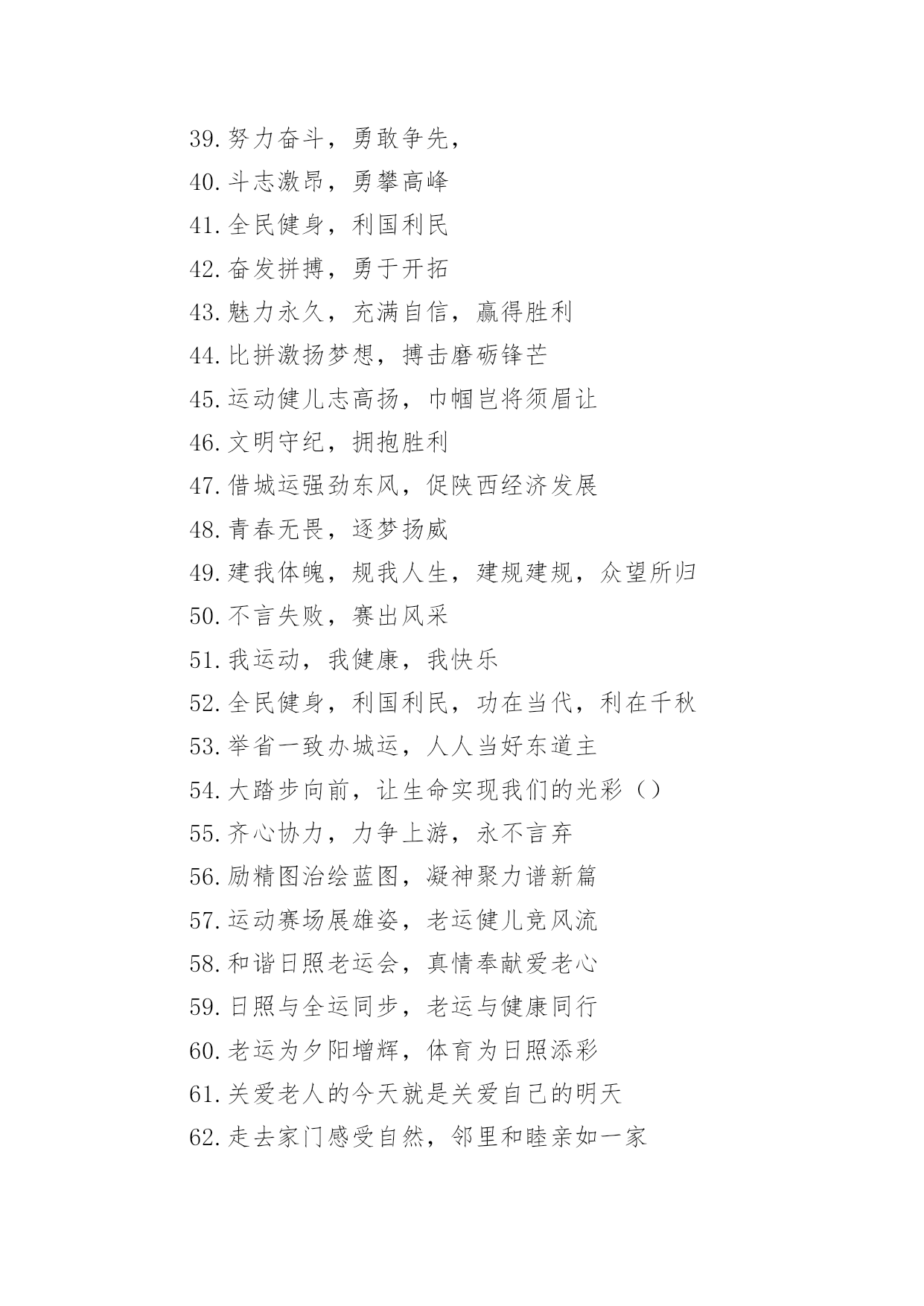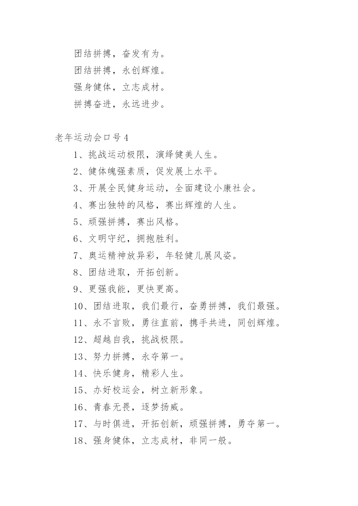 老年运动会口号在学习、工作、生活中,大家都接触过比较经典的口号吧,口号一般都用一两句完整的句子来表现一个信息或一个观念,信息单一,容易理解,没有过多的信息需要受众用心记忆和用心理解。你还在找寻优秀经典的口号吗?以下是小编整理的老年运动会口号,仅供参考,欢迎大家阅读。老年运动会口号11.赛出风格,赛出水平2.展现自我,争创新高3.奋发拼搏,勇于开拓4.山河壮丽,岁月峥嵘5.天天健身,天天快乐6.好体魄,好生活7.全民健身,你我同行8.人人运动,人人健康9.科学锻炼,有益健康10.保持健康是对自己负责,也是对社会负责11.健康是人生第一财富12.我运动,我青春;快乐健身,精彩人生13.运动牵手健康14.发展体育运动,增强人民体质15.开展全民健身运动,促进两个文明建设16.运动休闲,健康生活;开心运动,健康人生17.崇尚健康运动,珍爱宝贵生命18.弘扬奥运精神,展现人生风采19.健身健心强素质,文明诚信奔小康20.开展体育健身运动,营建健康快乐人生21.快乐健身,想动就动22.健康生活,快乐运动23.传播体育文化,建设精神文明24.体育的盛会,我们的节日25.竞赛勇夺金牌,文明展示风采26.生命在于运动,拼搏在于行动27.活力健康和谐;健身健康健美28.运动是健康之源29.我参与我运动我快乐30.拥抱健康超越自我体验快乐31.我运动我健康我快乐32.体育促进和谐,运动改变生活33.健康第一友谊第一比赛第二34.安全欢乐友谊俭朴35.扬我奥运精神展我老年风采36.遵规守纪,团结互敬37.赛出成绩,安全第一38.天道酬勤,健康起来39.努力奋斗,勇敢争先,40.斗志激昂,勇攀高峰41.全民健身,利国利民42.奋发拼搏,勇于开拓43.魅力永久,充满自信,赢得胜利44.比拼激扬梦想,搏击磨砺锋芒45.运动健儿志高扬,巾帼岂将须眉让46.文明守纪,拥抱胜利47.借城运强劲东风,促陕西经济发展48.青春无畏,逐梦扬威49.建我体魄,规我人生,建规建规,众望所归50.不言失败,赛出风采51.我运动,我健康,我快乐52.全民健身,利国利民,功在当代,利在千秋53.举省一致办城运,人人当好东道主54.大踏步向前,让生命实现我们的光彩()55.齐心协力,力争上游,永不言弃56.励精图治绘蓝图,凝神聚力谱新篇57.运动赛场展雄姿,老运健儿竞风流58.和谐日照老运会,真情奉献爱老心59.日照与全运同步,老运与健康同行60.老运为夕阳增辉,体育为日照添彩61.关爱老人的今天就是关爱自己的明天62.走去家门感受自然,邻里和睦亲如一家63.在活动中感受亲情,在快乐中锻炼身体64.积极参加体育健身,享受健康阳光人生65.展示老年健身风采,喜庆祖国六十华诞66.发展老年人体育事业,增强老年人身体素质67.扩大老年人体育人口,促进老年人健康长寿68.主动出击,抢得先机,活动有序,提高效率69.济师精英,顽强拼搏;运动健儿,志在必得70.时不我待,努力举绩,一鼓作气,挑战佳绩71.发展老年人体育运动,提高老年人健康水平72.加强老龄工作,大力开展老年体育健身活动73.生活着,运动着,快乐着我运动,我健康,我快乐74.信笃志坚,奋起争先,机汽学子,再创辉煌75.重在参与,重在健康,重在快乐,重在交流76.发展老年人体育事业,关爱老年人健康生活77.志比天高,气比山昂,机汽学子,力争更强78.放飞理想,勇于高攀,走进华中,走向成功79.提高老年人体育运动水平,促进全民健身计划落实80.广泛开展老年体育健身运动,提高老年人生活质量81.坚持“健康第一安全第一友谊第一风格第一”82.每天锻炼一小时,快乐工作每一天,健康生活一辈子83.放心去飞,勇敢去追,追一切我们为完成的梦84.海阔鱼跃且放今朝豪情,天高鸟飞大展机汽雄威85.运动运动,百病难碰;每日练走步,不用进药铺;每日练练跑,身体天天好86.儿童健身,天真活泼;青年健身,朝气蓬勃;中年健身,强身壮体;老年健身,延年益寿老年运动会口号2●和谐日照老运会,真情奉献爱老心。●日照与全运同步,老运与健康同行。●老运为夕阳增辉,体育为日照添彩。●关爱老人的今天就是关爱自己的明天。●走去家门感受自然,邻里和睦亲如一家。●在活动中感受亲情,在快乐中锻炼身体。●积极参加体育健身,享受健康阳光人生。●展示老年健身风采,喜庆祖国六十华诞。●发展老年人体育运动,提高老年人健康水平。●加强老龄工作,大力开展老年体育健身活动。●重在参与,重在健康,重在快乐,重在交流。●发展老年人体育事业,增强老年人身体素质。●扩大老年人体育人口,促进老年人健康长寿。●发展老年人体育事业,关爱老年人健康生活。●提高老年人体育运动水平,促进全民健身计划落实。●广泛开展老年体育健身运动,提高老年人生活质量。●生活着,运动着,快乐着!我运动,我健康,我快乐!●坚持“