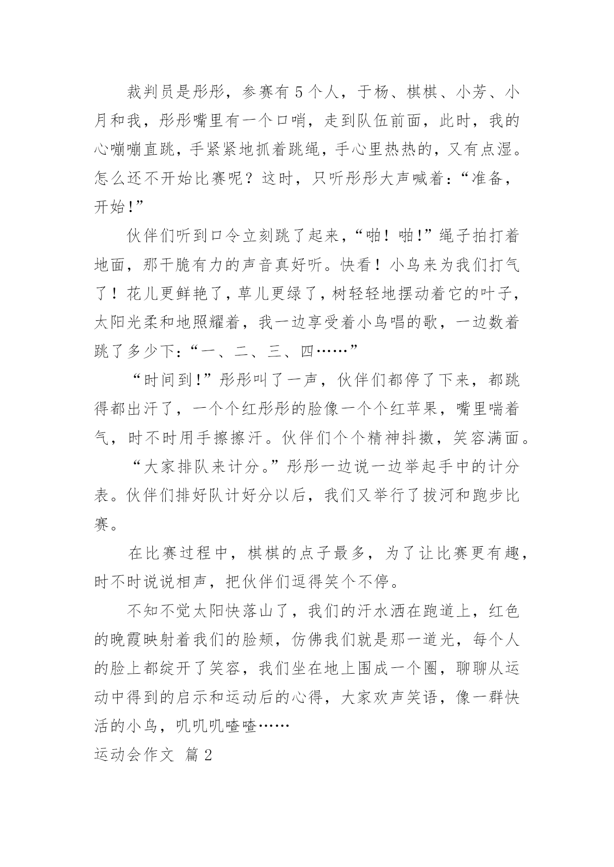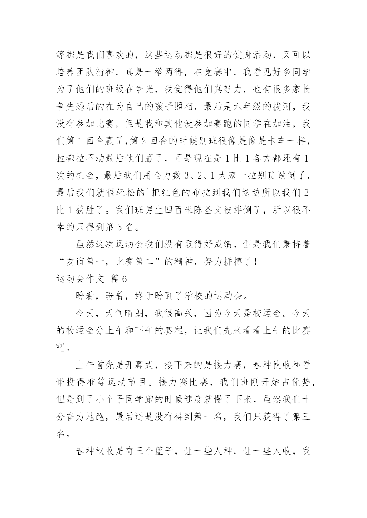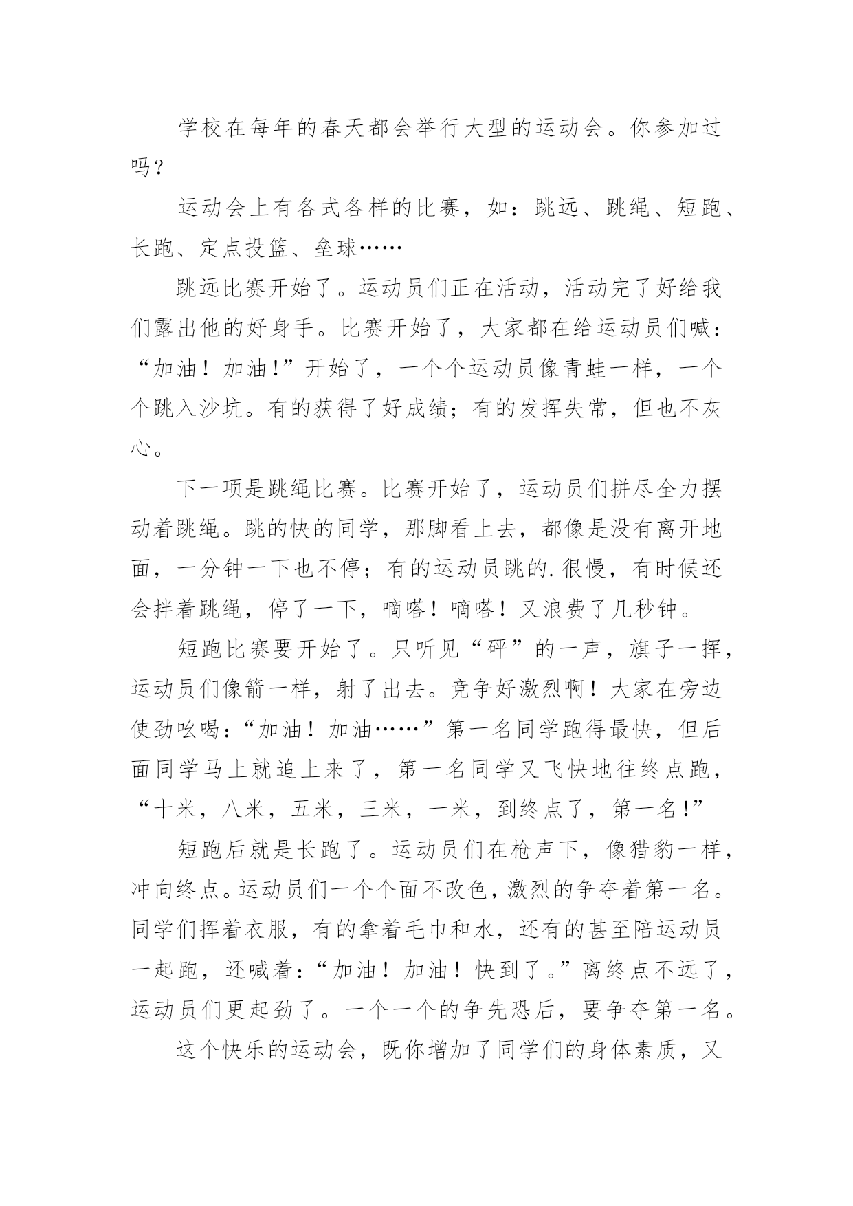 运动会作文运动会作文6篇(经典)无论在学习、工作或是生活中,许多人都有过写作文的经历,对作文都不陌生吧,作文是通过文字来表达一个主题意义的记叙方法。你知道作文怎样才能写的好吗?以下是小编帮大家整理的运动会作文6篇,欢迎大家分享。运动会作文篇1我运动、我健康、我快乐!——题记元旦的早晨,小鸟在枝头唱着欢快的歌;蝴蝶在花丛中飞舞着;鲜花绽开了美丽的笑容;蔚蓝的天空中飘着白云,晴空万里。阳光照耀着大地,带来光明和温暖,多么美好的一天啊!我今天很兴奋,因为伙伴们要举办一个“运动会”,就在我们小区的草地上举行,活动的项目有三项:跳绳、拔河、跑步。我按约定的时间还提前10分钟到达草地哟!伙伴们比我还早,都在为比赛作准备,我更是跃跃欲试,迫不及待。第一项是跳绳比赛,规则是每人跳10分钟,看谁跳得多。每个项目都可以加分,分数多的人就取胜。加分情况:如果是钟内跳100-200下的加5分;如果是钟内跳200-400下的加10分;如果是钟内跳400-500下的`加15分。如果是钟内跳500下以上的加20分。裁判员是彤彤,参赛有5个人,于杨、棋棋、小芳、小月和我,彤彤嘴里有一个口哨,走到队伍前面,此时,我的心嘣嘣直跳,手紧紧地抓着跳绳,手心里热热的,又有点湿。怎么还不开始比赛呢?这时,只听彤彤大声喊着:“准备,开始!”伙伴们听到口令立刻跳了起来,“啪!啪!”绳子拍打着地面,那干脆有力的声音真好听。快看!小鸟来为我们打气了!花儿更鲜艳了,草儿更绿了,树轻轻地摆动着它的叶子,太阳光柔和地照耀着,我一边享受着小鸟唱的歌,一边数着跳了多少下:“一、二、三、四……”“时间到!”彤彤叫了一声,伙伴们都停了下来,都跳得都出汗了,一个个红彤彤的脸像一个个红苹果,嘴里喘着气,时不时用手擦擦汗。伙伴们个个精神抖擞,笑容满面。“大家排队来计分。”彤彤一边说一边举起手中的计分表。伙伴们排好队计好分以后,我们又举行了拔河和跑步比赛。在比赛过程中,棋棋的点子最多,为了让比赛更有趣,时不时说说相声,把伙伴们逗得笑个不停。不知不觉太阳快落山了,我们的汗水洒在跑道上,红色的晚霞映射着我们的脸颊,仿佛我们就是那一道光,每个人的脸上都绽开了笑容,我们坐在地上围成一个圈,聊聊从运动中得到的启示和运动后的心得,大家欢声笑语,像一群快活的小鸟,叽叽叽喳喳……运动会作文篇2学校在每年的春天都会举行大型的运动会。你参加过吗?运动会上有各式各样的比赛,如:跳远、跳绳、短跑、长跑、定点投篮、垒球……跳远比赛开始了。运动员们正在活动,活动完了好给我们露出他的好身手。比赛开始了,大家都在给运动员们喊:“加油!加油!”开始了,一个个运动员像青蛙一样,一个个跳入沙坑。有的获得了好成绩;有的发挥失常,但也不灰心。下一项是跳绳比赛。比赛开始了,运动员们拼尽全力摆动着跳绳。跳的快的同学,那脚看上去,都像是没有离开地面,一分钟一下也不停;有的运动员跳的.很慢,有时候还会拌着跳绳,停了一下,嘀嗒!嘀嗒!又浪费了几秒钟。短跑比赛要开始了。只听见“砰”的一声,旗子一挥,运动员们像箭一样,射了出去。竞争好激烈啊!大家在旁边使劲吆喝:“加油!加油……”第一名同学跑得最快,但后面同学马上就追上来了,第一名同学又飞快地往终点跑,“十米,八米,五米,三米,一米,到终点了,第一名!”短跑后就是长跑了。运动员们在枪声下,像猎豹一样,冲向终点。运动员们一个个面不改色,激烈的争夺着第一名。同学们挥着衣服,有的拿着毛巾和水,还有的甚至陪运动员一起跑,还喊着:“加油!加油!快到了。”离终点不远了,运动员们更起劲了。一个一个的争先恐后,要争夺第一名。这个快乐的运动会,既你增加了同学们的身体素质,又让同学们更加团结互助了。运动会作文篇3秋天来了,四处瓜果飘香,落叶悠悠扬扬地从高大魁伟的大树上飘下来,落到地面上。在阳光的照耀下,树影婆娑,为人们撑开了遮阳伞。阵阵微风拂面,让人感觉格外舒服。就在这秋高气爽的时节,我们迎来了一年一度的秋季田径运动会。“我宣布,潘南小学20xx秋季田径运动会,现在开幕!”领导的讲话,好像一声命令,穿戴整齐的鼓号队立刻“咚咚咚”地敲起鼓来,那声音,好像是峡谷里的悠长的回声;那声音,好像是瀑布飞泻而下的声音;那声音,飞机放引擎的.声音;那声音,好像是阵阵雷声,格外刺耳。还有吹圆号的同学,圆号优美的韵律在我们耳边回响。彩旗队举着五彩缤纷的旗帜,好像七色彩虹。花束队穿着统一队服,在班级前举着鲜艳的花束,更是绚丽多彩。“大会进行第一项,出旗!”升旗手们接着把国旗送到升旗台面前,端正站好,等待下一步命令。“大会进行第二项,升国旗,唱国歌,少先队员敬礼!”鲜艳的五星红旗接着迎风飘扬,渐渐顺着旗杆飘到了最顶端,国歌在每个人的耳边想起,每个人都注视着五星红旗高高飘起。“大会进行第四项,请翟校长致开幕词!”校长怀着激动的心情讲完了振奋人心