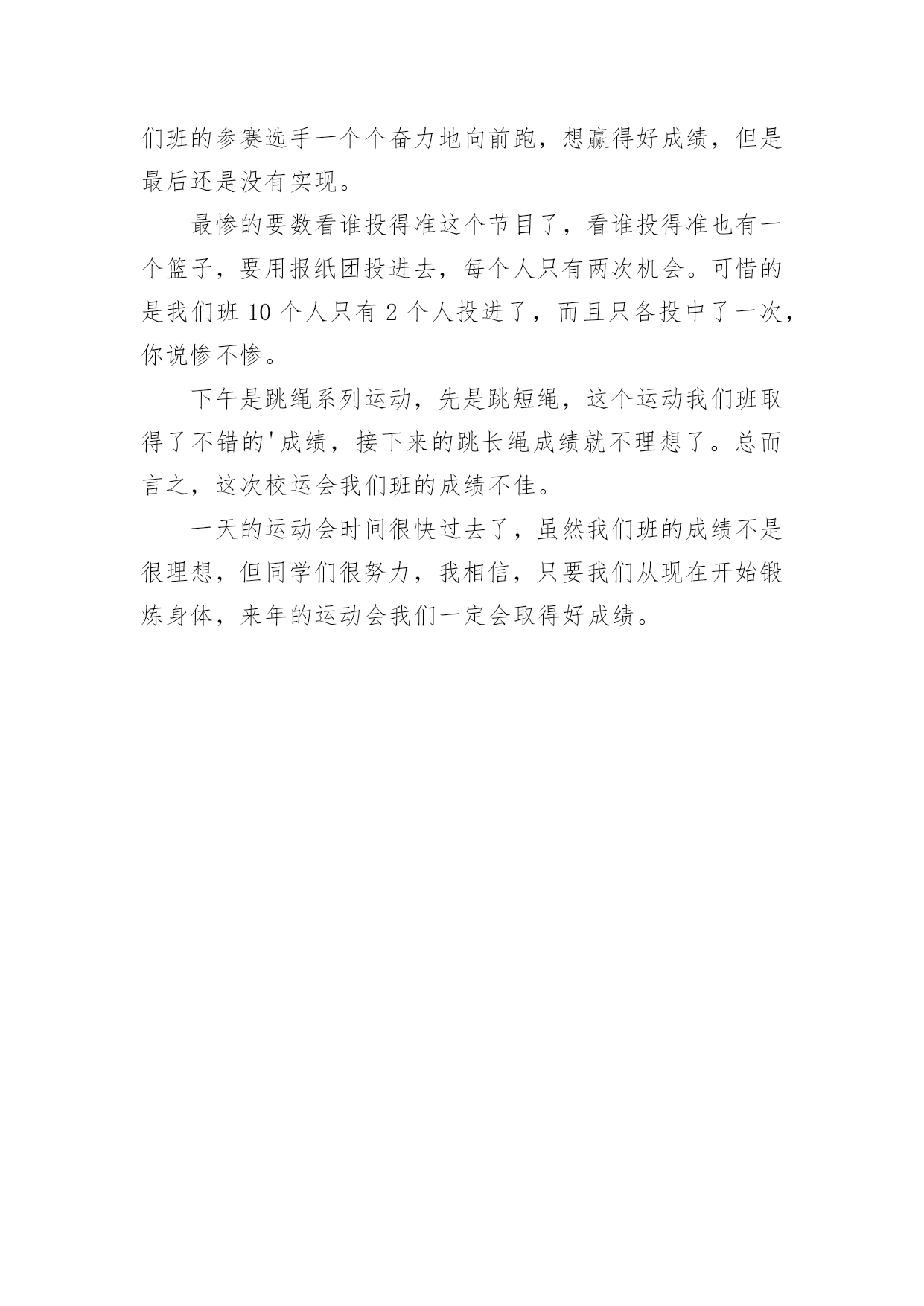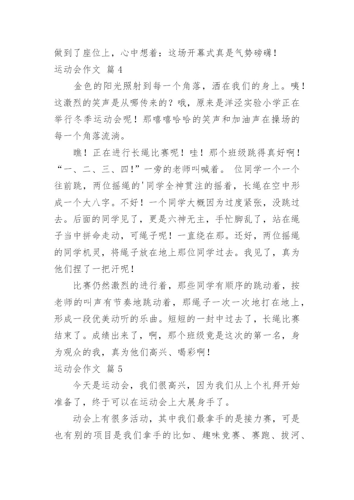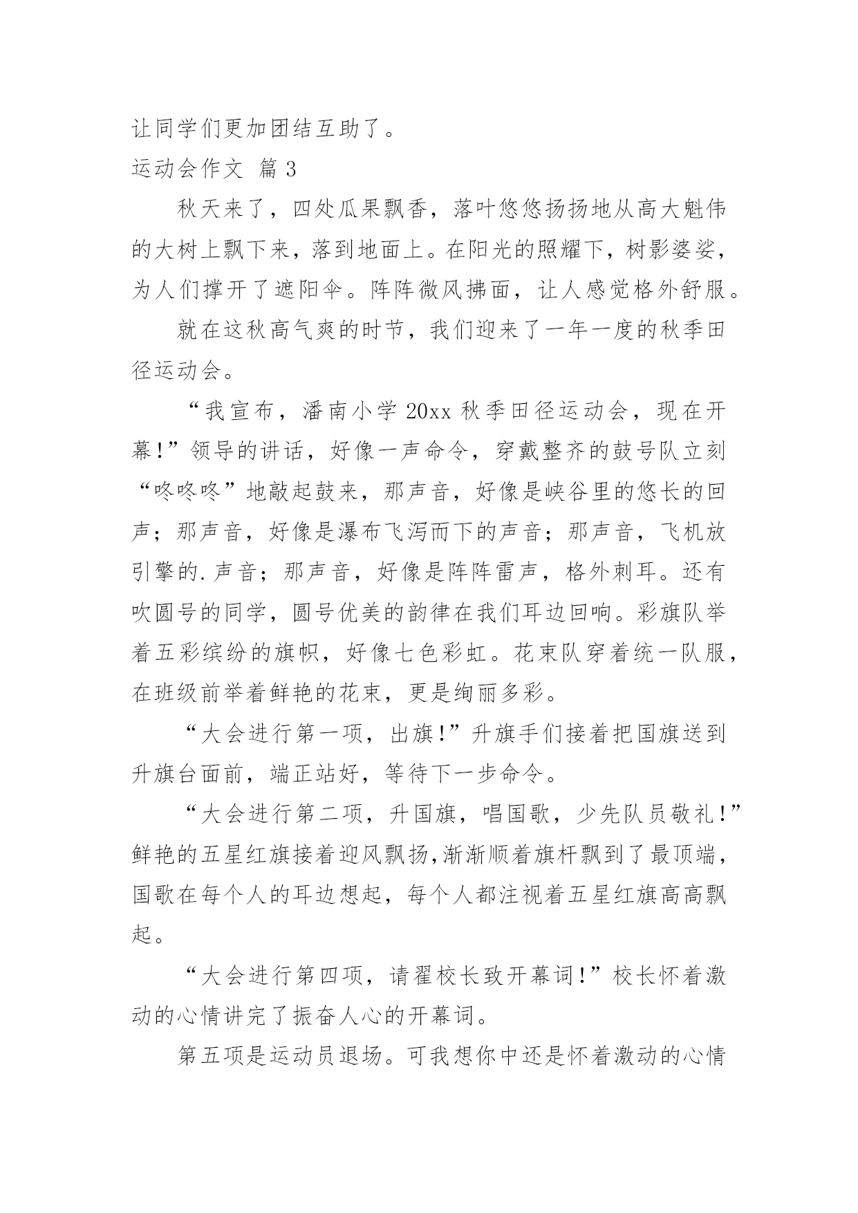 运动会作文运动会作文6篇(经典)无论在学习、工作或是生活中,许多人都有过写作文的经历,对作文都不陌生吧,作文是通过文字来表达一个主题意义的记叙方法。你知道作文怎样才能写的好吗?以下是小编帮大家整理的运动会作文6篇,欢迎大家分享。运动会作文篇1我运动、我健康、我快乐!——题记元旦的早晨,小鸟在枝头唱着欢快的歌;蝴蝶在花丛中飞舞着;鲜花绽开了美丽的笑容;蔚蓝的天空中飘着白云,晴空万里。阳光照耀着大地,带来光明和温暖,多么美好的一天啊!我今天很兴奋,因为伙伴们要举办一个“运动会”,就在我们小区的草地上举行,活动的项目有三项:跳绳、拔河、跑步。我按约定的时间还提前10分钟到达草地哟!伙伴们比我还早,都在为比赛作准备,我更是跃跃欲试,迫不及待。第一项是跳绳比赛,规则是每人跳10分钟,看谁跳得多。每个项目都可以加分,分数多的人就取胜。加分情况:如果是钟内跳100-200下的加5分;如果是钟内跳200-400下的加10分;如果是钟内跳400-500下的`加15分。如果是钟内跳500下以上的加20分。裁判员是彤彤,参赛有5个人,于杨、棋棋、小芳、小月和我,彤彤嘴里有一个口哨,走到队伍前面,此时,我的心嘣嘣直跳,手紧紧地抓着跳绳,手心里热热的,又有点湿。怎么还不开始比赛呢?这时,只听彤彤大声喊着:“准备,开始!”伙伴们听到口令立刻跳了起来,“啪!啪!”绳子拍打着地面,那干脆有力的声音真好听。快看!小鸟来为我们打气了!花儿更鲜艳了,草儿更绿了,树轻轻地摆动着它的叶子,太阳光柔和地照耀着,我一边享受着小鸟唱的歌,一边数着跳了多少下:“一、二、三、四……”“时间到!”彤彤叫了一声,伙伴们都停了下来,都跳得都出汗了,一个个红彤彤的脸像一个个红苹果,嘴里喘着气,时不时用手擦擦汗。伙伴们个个精神抖擞,笑容满面。“大家排队来计分。”彤彤一边说一边举起手中的计分表。伙伴们排好队计好分以后,我们又举行了拔河和跑步比赛。在比赛过程中,棋棋的点子最多,为了让比赛更有趣,时不时说说相声,把伙伴们逗得笑个不停。不知不觉太阳快落山了,我们的汗水洒在跑道上,红色的晚霞映射着我们的脸颊,仿佛我们就是那一道光,每个人的脸上都绽开了笑容,我们坐在地上围成一个圈,聊聊从运动中得到的启示和运动后的心得,大家欢声笑语,像一群快活的小鸟,叽叽叽喳喳……运动会作文篇2学校在每年的春天都会举行大型的运动会。你参加过吗?运动会上有各式各样的比赛,如:跳远、跳绳、短跑、长跑、定点投篮、垒球……跳远比赛开始了。运动员们正在活动,活动完了好给我们露出他的好身手。比赛开始了,大家都在给运动员们喊:“加油!加油!”开始了,一个个运动员像青蛙一样,一个个跳入沙坑。有的获得了好成绩;有的发挥失常,但也不灰心。下一项是跳绳比赛。比赛开始了,运动员们拼尽全力摆动着跳绳。跳的快的同学,那脚看上去,都像是没有离开地面,一分钟一下也不停;有的运动员跳的.很慢,有时候还会拌着跳绳,停了一下,嘀嗒!嘀嗒!又浪费了几秒钟。短跑比赛要开始了。只听见“砰”的一声,旗子一挥,运动员们像箭一样,射了出去。竞争好激烈啊!大家在旁边使劲吆喝:“加油!加油……”第一名同学跑得最快,但后面同学马上就追上来了,第一名同学又飞快地往终点跑,“十米,八米,五米,三米,一米,到终点了,第一名!”短跑后就是长跑了。运动员们在枪声下,像猎豹一样,冲向终点。运动员们一个个面不改色,激烈的争夺着第一名。同学们挥着衣服,有的拿着毛巾和水,还有的甚至陪运动员一起跑,还喊着:“加油!加油!快到了。”离终点不远了,运动员们更起劲了。一个一个的争先恐后,要争夺第一名。这个快乐的运动会,既你增加了同学们的身体素质,又让同学们更加团结互助了。运动会作文篇3秋天来了,四处瓜果飘香,落叶悠悠扬扬地从高大魁伟的大树上飘下来,落到地面上。在阳光的照耀下,树影婆娑,为人们撑开了遮阳伞。阵阵微风拂面,让人感觉格外舒服。就在这秋高气爽的时节,我们迎来了一年一度的秋季田径运动会。“我宣布,潘南小学20xx秋季田径运动会,现在开幕!”领导的讲话,好像一声命令,穿戴整齐的鼓号队立刻“咚咚咚”地敲起鼓来,那声音,好像是峡谷里的悠长的回声;那声音,好像是瀑布飞泻而下的声音;那声音,飞机放引擎的.声音;那声音,好像是阵阵雷声,格外刺耳。还有吹圆号的同学,圆号优美的韵律在我们耳边回响。彩旗队举着五彩缤纷的旗帜,好像七色彩虹。花束队穿着统一队服,在班级前举着鲜艳的花束,更是绚丽多彩。“大会进行第一项,出旗!”升旗手们接着把国旗送到升旗台面前,端正站好,等待下一步命令。“大会进行第二项,升国旗,唱国歌,少先队员敬礼!”鲜艳的五星红旗接着迎风飘扬,渐渐顺着旗杆飘到了最顶端,国歌在每个人的耳边想起,每个人都注视着五星红旗高高飘起。“大会进行第四项,请翟校长致开幕词!”校长怀着激动的心情讲完了振奋人心
