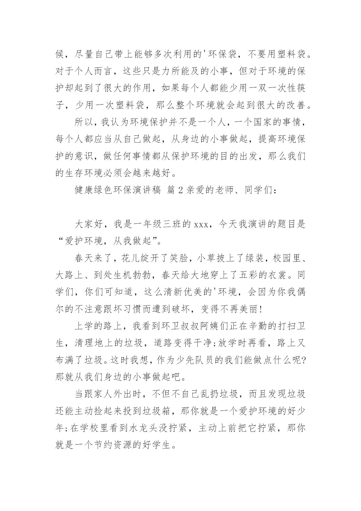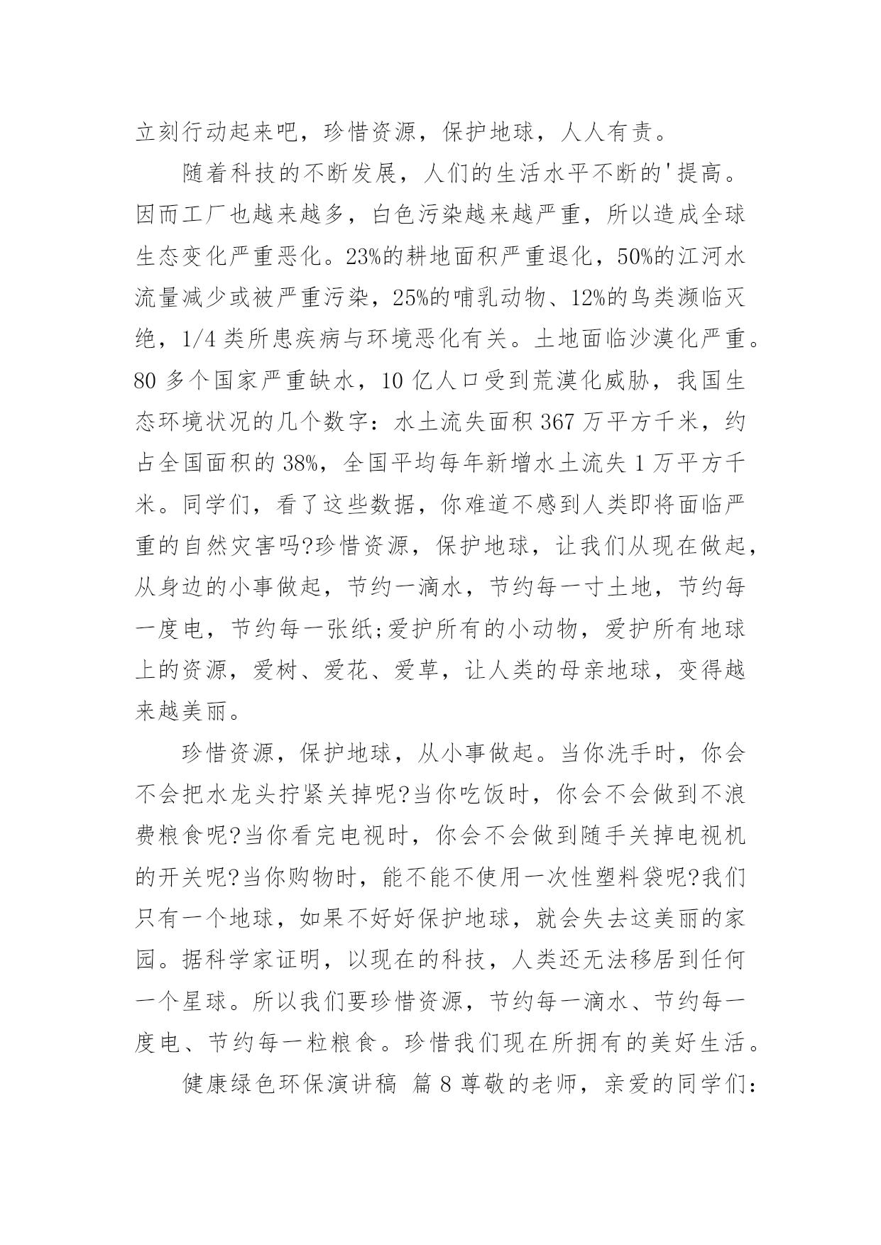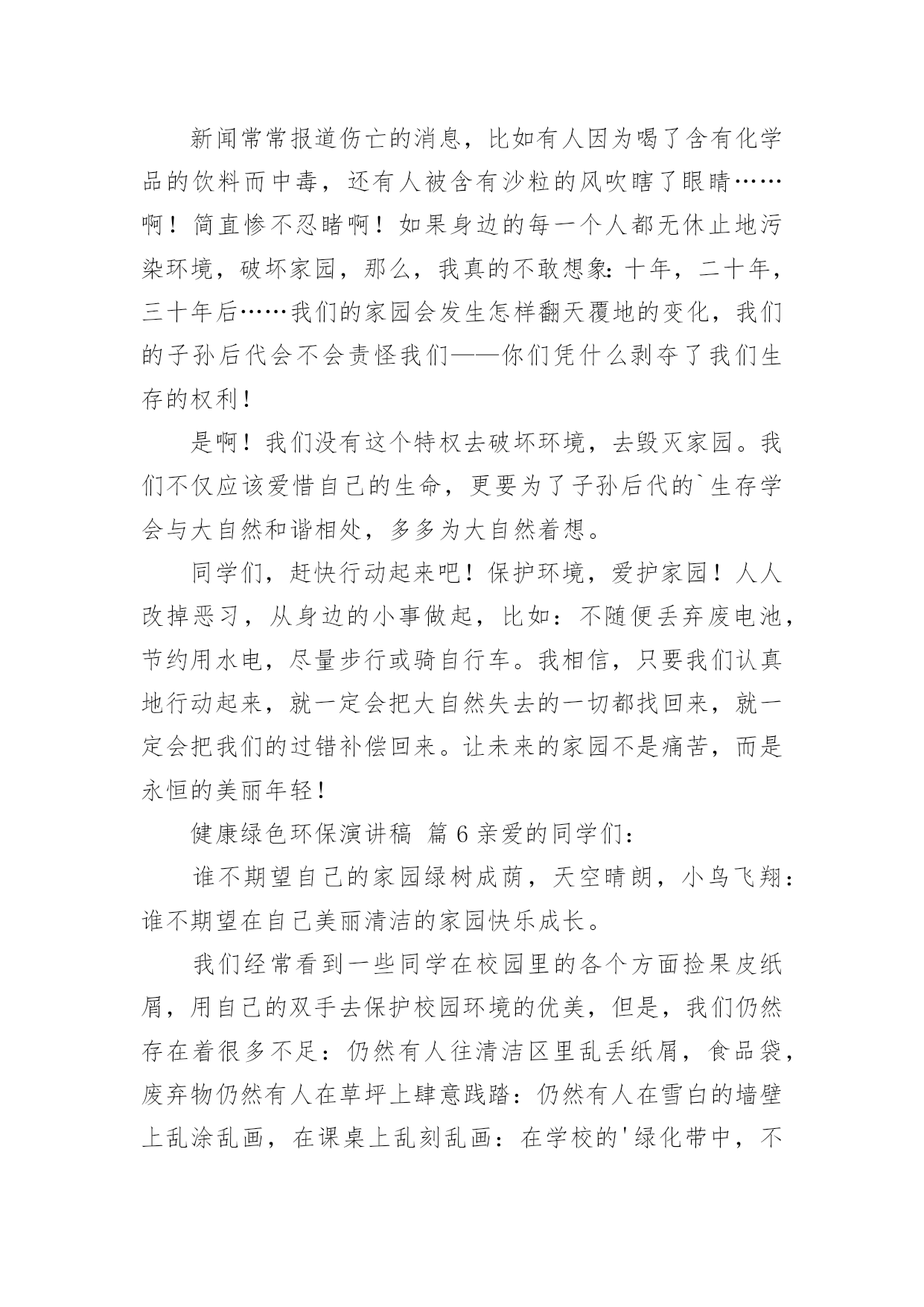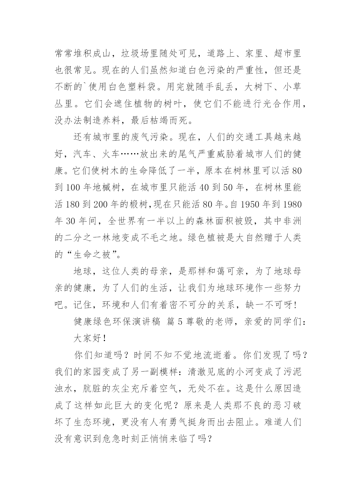 健康绿色环保演讲稿健康绿色环保演讲稿(精选25篇)演讲稿可以起到整理演讲者的思路、提示演讲的内容、限定演讲的速度的作用。在日新月异的现代社会中,演讲稿使用的情况越来越多,那么,怎么去写演讲稿呢?下面是小编帮大家整理的健康绿色环保演讲稿,希望对大家有所帮助。健康绿色环保演讲稿篇1敬爱的老师,亲爱的同学:谈到环境保护,我觉得就不可避免的想到眼下人类赖以生存的环境变得越来越差的问题。人类想要健康的生活下去,就必须关注环境,保护环境,等到环境恶劣到影响我们生存的时候就后悔莫及了。环境保护是个很艰巨而又长远的任务,这不是一个人的事情,而是每个人,每个国家,甚至是全球需要关注的,因为我们共同生活在这个地球上。但环境保护又的确是每一个人的事情,仅有从自己做起,从小事做起,做到时刻关注环境保护,才能真正的保护环境。其实,在日常生活中,保护环境的事情有很多,比如说:对于有私家车的人来说,每一天早上去上班的时候,尽量不要开车上班,坐公交车,甚至能够骑自行车,步行去上班,这样既能够保护环境,又能够锻炼身体,一举两得,又何乐而不为呢。外出吃饭,尽量不要用一次性餐具,其实这种餐具并不卫生,既浪费资源,又会对环境造成污染;去超市购物的时候,尽量自己带上能够多次利用的'环保袋,不要用塑料袋。对于个人而言,这些只是力所能及的小事,但对于环境的保护却起到了很大的作用,如果每个人都能少用一双一次性筷子,少用一次塑料袋,那么整个环境就会起到很大的改善。所以,我认为环境保护并不是一个人,一个国家的事情,每个人都应当从自己做起,从身边的小事做起,提高环境保护的意识,做任何事情都从保护环境的目的出发,那么我们的生存环境必须会越来越好。健康绿色环保演讲稿篇2亲爱的老师、同学们:大家好,我是一年级三班的xxx,今天我演讲的题目是“爱护环境,从我做起”。春天来了,花儿绽开了笑脸,小草披上了绿装,校园里、大路上、到处生机勃勃,春天给大地穿上了五彩的衣裳。同学们,你们可知道,这么清新优美的'环境,会因为你我偶尔的不注意跟坏习惯而遭到破坏,变得不再美丽!上学的路上,我看到环卫叔叔阿姨们正在辛勤的打扫卫生,清理地上的垃圾,道路变得干净;放学时再看,路上又布满了垃圾。这时我想,作为少先队员的我们能做点什么呢?那就从我们身边的小事做起吧。当跟家人外出时,不但不自己乱扔垃圾,而且发现垃圾还能主动捡起来投到垃圾箱,那你就是一个爱护环境的好少年;在学校里看到水龙头没拧紧,主动上前把它拧紧,那你就是一个节约资源的好学生。亲爱的同学们,养成爱护环境,不乱丢乱扔的好习惯,不给别人添麻烦。从我做起,从点滴做起,从现在做起。做个优秀的少先队员!健康绿色环保演讲稿篇3领导、老师、学生:大家好!我是07的曹静,今天演讲的题目是《还我们绿色空间》。我们知道,几千年前,人类征服了自然,利用自然界的一切事物作为人类文明的象征。几千年后的今天,人类是否通过尊重自然、释放自然、与自然和谐相处,将继续存在视为现代意识的象征记得有句话:‘两个黄鹂鸣翠柳,一行白鹭升天。’有人开玩笑说这样的意境只存在于都市人的梦里。环顾四周,摩天大楼高耸入云,覆盖了广阔的天空。在股票大厅里,在纵横交织的.屏幕上,新鲜的身影在工厂繁忙的机械声和路人急促的脚步声中跳跃。这就是所谓的‘都市节奏’吗?在这个盛世,很多人为了眼前的利益而忙碌,甚至不惜牺牲后代。健康绿色环保演讲稿篇4亲爱的老师、同学们:大家好!环境与人们的生活息息相关,只有环境好,人们的健康才得到了保障。虽然,现在人们在努力保护环境,但是地球上的污染还是一天比一天严重。就拿现在社会上污染最严重的白色污染来说吧。白色污染指的就是一只只白色塑料袋,它们在泥土中不容易被分解,常常堆积成山,垃圾场里随处可见,道路上、家里、超市里也很常见。现在的人们虽然知道白色污染的严重性,但还是不断的`使用白色塑料袋。用完就随手乱丢,大树下、小草丛里。它们会遮住植物的树叶,使它们不能进行光合作用,没办法制造养料,最后枯竭而死。还有城市里的废气污染。现在,人们的交通工具越来越好,汽车、火车……放出来的尾气严重威胁着城市人们的健康。它们使树木的生命降低了一半,原本在树林里可以活80到100年地槭树,在城市里只能活40到50年,在树林里能活180到200年的椴树,现在只能活80年。自1950年到1980年30年间,全世界有一半以上的森林面积被毁,其中非洲的二分之一林地变成不毛之地。绿色植被是大自然赠于人类的“生命之被”。地球,这位人类的母亲,是那样和蔼可亲,为了地球母亲的健康,为了人们的生活,让我们为地球环境作一些努力吧。记住,环境和人们有着密不可分的关系,缺一不可呀!健康绿色环保演讲稿篇5尊敬的老师,亲爱的同学们:大家好!你们知道吗?时间不知不觉地流逝着。你们发现了吗?我们的家园变成了另一副模样:清澈见底的小