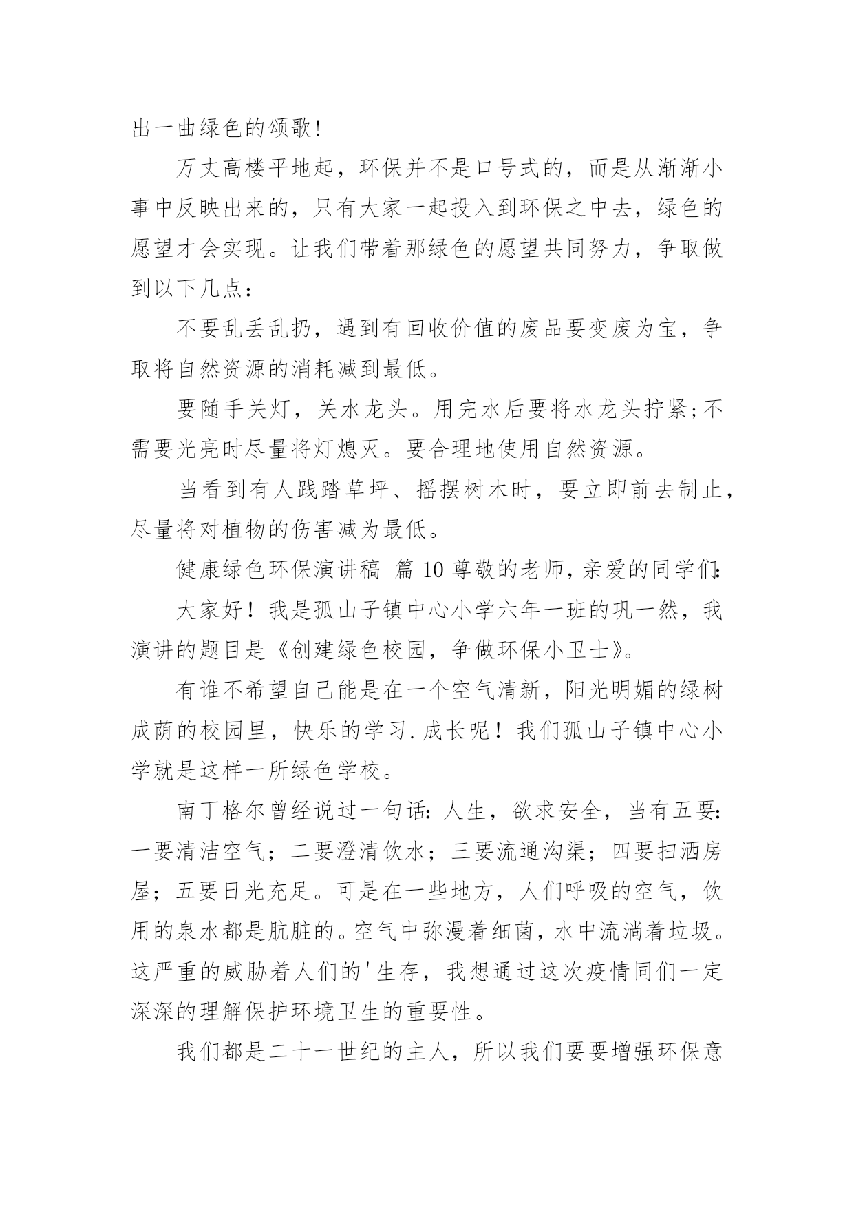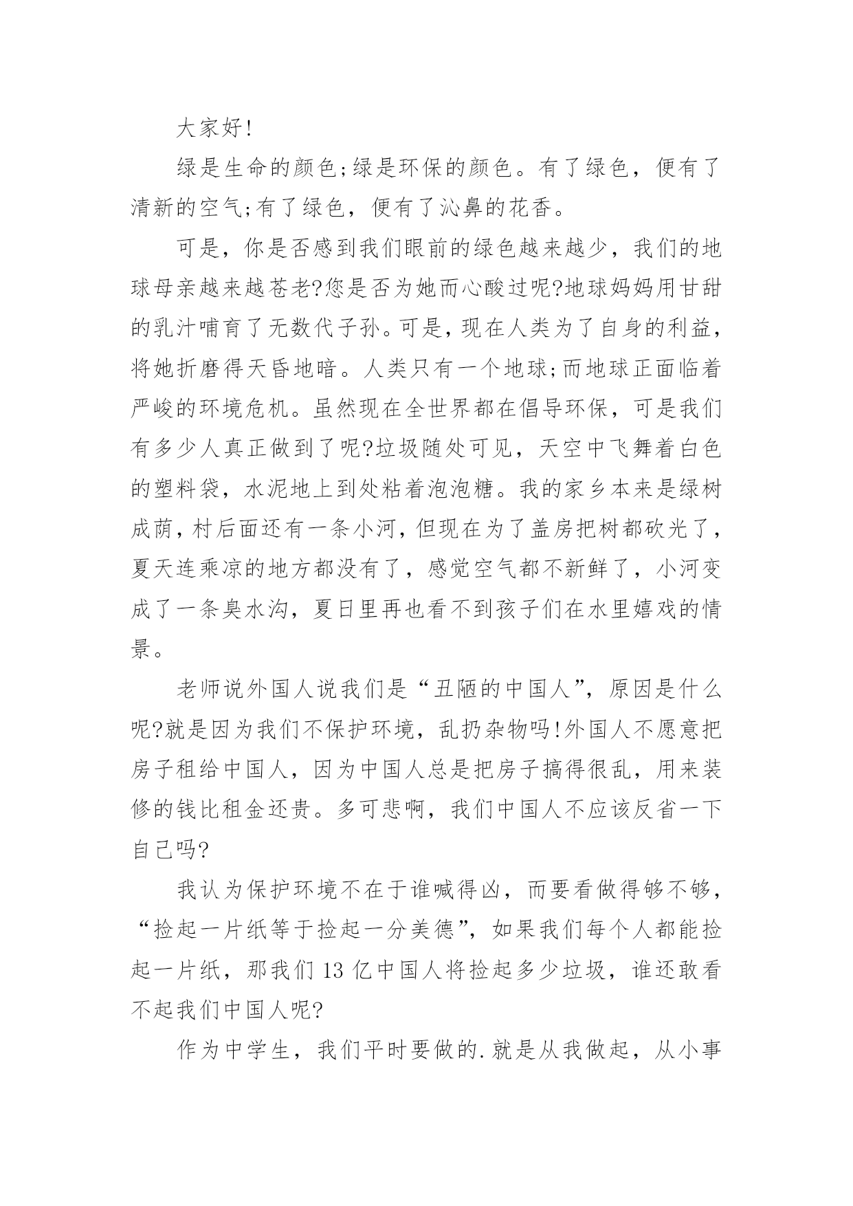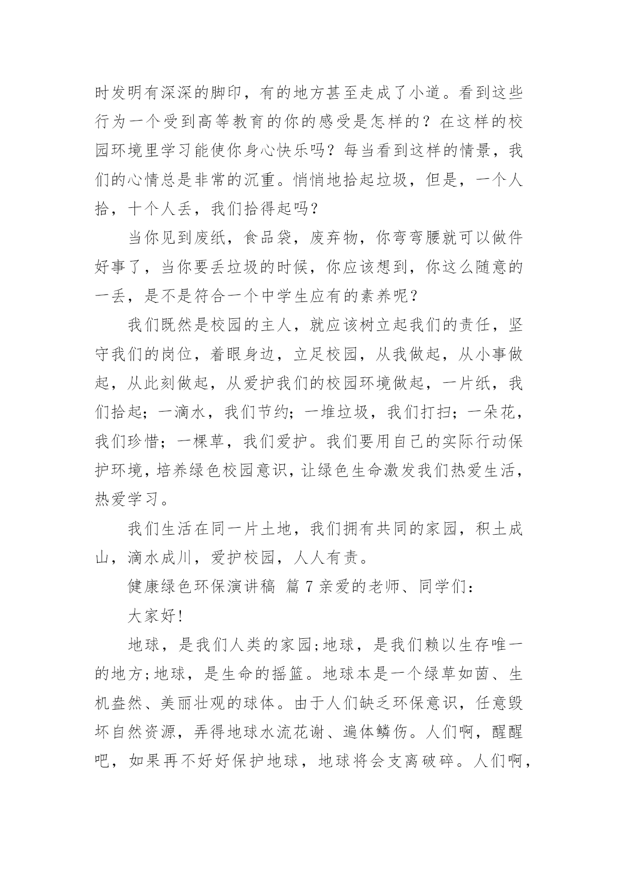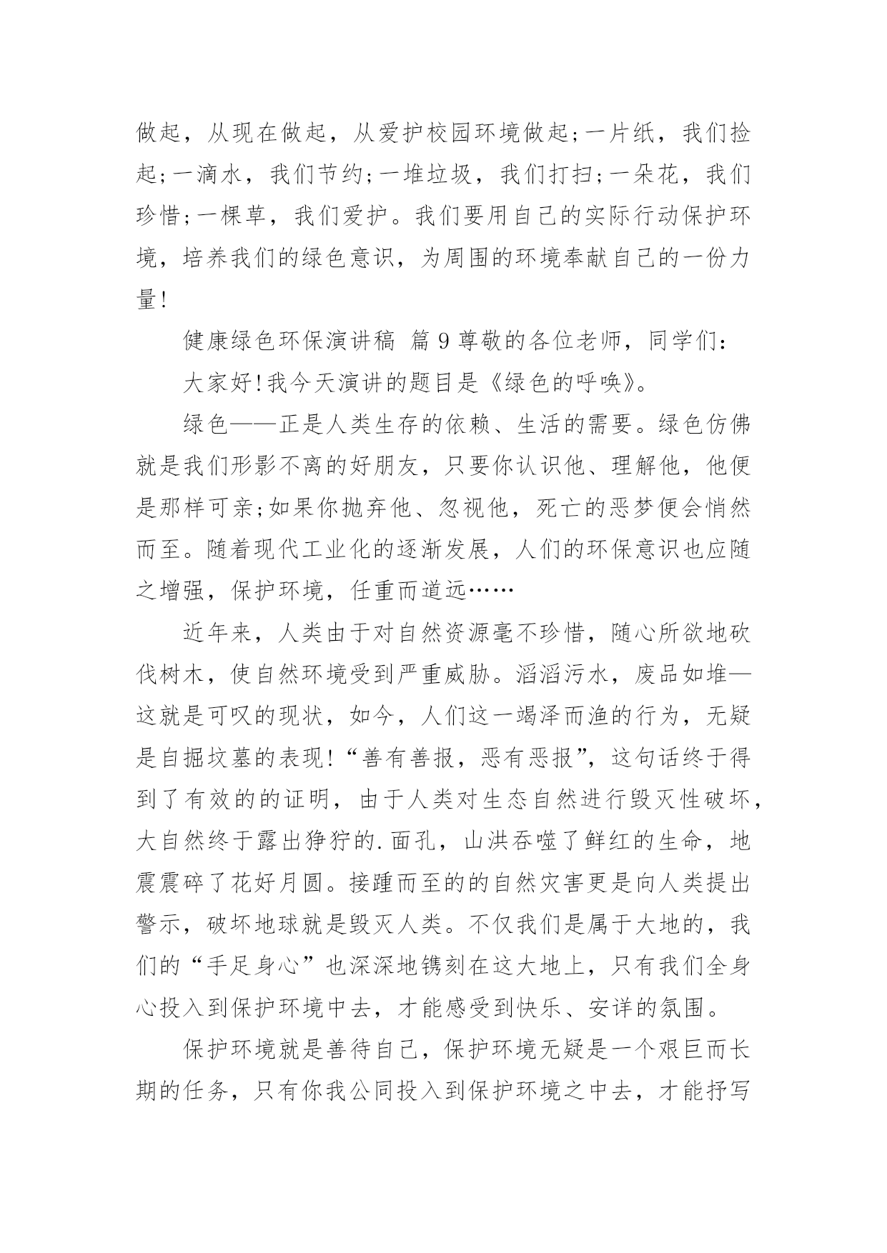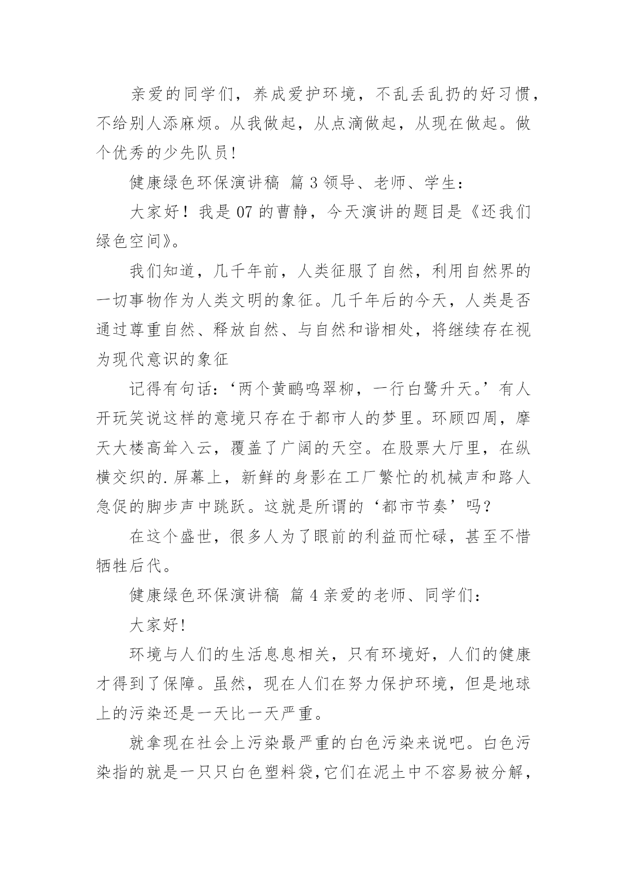 健康绿色环保演讲稿健康绿色环保演讲稿(精选25篇)演讲稿可以起到整理演讲者的思路、提示演讲的内容、限定演讲的速度的作用。在日新月异的现代社会中,演讲稿使用的情况越来越多,那么,怎么去写演讲稿呢?下面是小编帮大家整理的健康绿色环保演讲稿,希望对大家有所帮助。健康绿色环保演讲稿篇1敬爱的老师,亲爱的同学:谈到环境保护,我觉得就不可避免的想到眼下人类赖以生存的环境变得越来越差的问题。人类想要健康的生活下去,就必须关注环境,保护环境,等到环境恶劣到影响我们生存的时候就后悔莫及了。环境保护是个很艰巨而又长远的任务,这不是一个人的事情,而是每个人,每个国家,甚至是全球需要关注的,因为我们共同生活在这个地球上。但环境保护又的确是每一个人的事情,仅有从自己做起,从小事做起,做到时刻关注环境保护,才能真正的保护环境。其实,在日常生活中,保护环境的事情有很多,比如说:对于有私家车的人来说,每一天早上去上班的时候,尽量不要开车上班,坐公交车,甚至能够骑自行车,步行去上班,这样既能够保护环境,又能够锻炼身体,一举两得,又何乐而不为呢。外出吃饭,尽量不要用一次性餐具,其实这种餐具并不卫生,既浪费资源,又会对环境造成污染;去超市购物的时候,尽量自己带上能够多次利用的'环保袋,不要用塑料袋。对于个人而言,这些只是力所能及的小事,但对于环境的保护却起到了很大的作用,如果每个人都能少用一双一次性筷子,少用一次塑料袋,那么整个环境就会起到很大的改善。所以,我认为环境保护并不是一个人,一个国家的事情,每个人都应当从自己做起,从身边的小事做起,提高环境保护的意识,做任何事情都从保护环境的目的出发,那么我们的生存环境必须会越来越好。健康绿色环保演讲稿篇2亲爱的老师、同学们:大家好,我是一年级三班的xxx,今天我演讲的题目是“爱护环境,从我做起”。春天来了,花儿绽开了笑脸,小草披上了绿装,校园里、大路上、到处生机勃勃,春天给大地穿上了五彩的衣裳。同学们,你们可知道,这么清新优美的'环境,会因为你我偶尔的不注意跟坏习惯而遭到破坏,变得不再美丽!上学的路上,我看到环卫叔叔阿姨们正在辛勤的打扫卫生,清理地上的垃圾,道路变得干净;放学时再看,路上又布满了垃圾。这时我想,作为少先队员的我们能做点什么呢?那就从我们身边的小事做起吧。当跟家人外出时,不但不自己乱扔垃圾,而且发现垃圾还能主动捡起来投到垃圾箱,那你就是一个爱护环境的好少年;在学校里看到水龙头没拧紧,主动上前把它拧紧,那你就是一个节约资源的好学生。亲爱的同学们,养成爱护环境,不乱丢乱扔的好习惯,不给别人添麻烦。从我做起,从点滴做起,从现在做起。做个优秀的少先队员!健康绿色环保演讲稿篇3领导、老师、学生:大家好!我是07的曹静,今天演讲的题目是《还我们绿色空间》。我们知道,几千年前,人类征服了自然,利用自然界的一切事物作为人类文明的象征。几千年后的今天,人类是否通过尊重自然、释放自然、与自然和谐相处,将继续存在视为现代意识的象征记得有句话:‘两个黄鹂鸣翠柳,一行白鹭升天。’有人开玩笑说这样的意境只存在于都市人的梦里。环顾四周,摩天大楼高耸入云,覆盖了广阔的天空。在股票大厅里,在纵横交织的.屏幕上,新鲜的身影在工厂繁忙的机械声和路人急促的脚步声中跳跃。这就是所谓的‘都市节奏’吗?在这个盛世,很多人为了眼前的利益而忙碌,甚至不惜牺牲后代。健康绿色环保演讲稿篇4亲爱的老师、同学们:大家好!环境与人们的生活息息相关,只有环境好,人们的健康才得到了保障。虽然,现在人们在努力保护环境,但是地球上的污染还是一天比一天严重。就拿现在社会上污染最严重的白色污染来说吧。白色污染指的就是一只只白色塑料袋,它们在泥土中不容易被分解,常常堆积成山,垃圾场里随处可见,道路上、家里、超市里也很常见。现在的人们虽然知道白色污染的严重性,但还是不断的`使用白色塑料袋。用完就随手乱丢,大树下、小草丛里。它们会遮住植物的树叶,使它们不能进行光合作用,没办法制造养料,最后枯竭而死。还有城市里的废气污染。现在,人们的交通工具越来越好,汽车、火车……放出来的尾气严重威胁着城市人们的健康。它们使树木的生命降低了一半,原本在树林里可以活80到100年地槭树,在城市里只能活40到50年,在树林里能活180到200年的椴树,现在只能活80年。自1950年到1980年30年间,全世界有一半以上的森林面积被毁,其中非洲的二分之一林地变成不毛之地。绿色植被是大自然赠于人类的“生命之被”。地球,这位人类的母亲,是那样和蔼可亲,为了地球母亲的健康,为了人们的生活,让我们为地球环境作一些努力吧。记住,环境和人们有着密不可分的关系,缺一不可呀!健康绿色环保演讲稿篇5尊敬的老师,亲爱的同学们:大家好!你们知道吗?时间不知不觉地流逝着。你们发现了吗?我们的家园变成了另一副模样:清澈见底的小