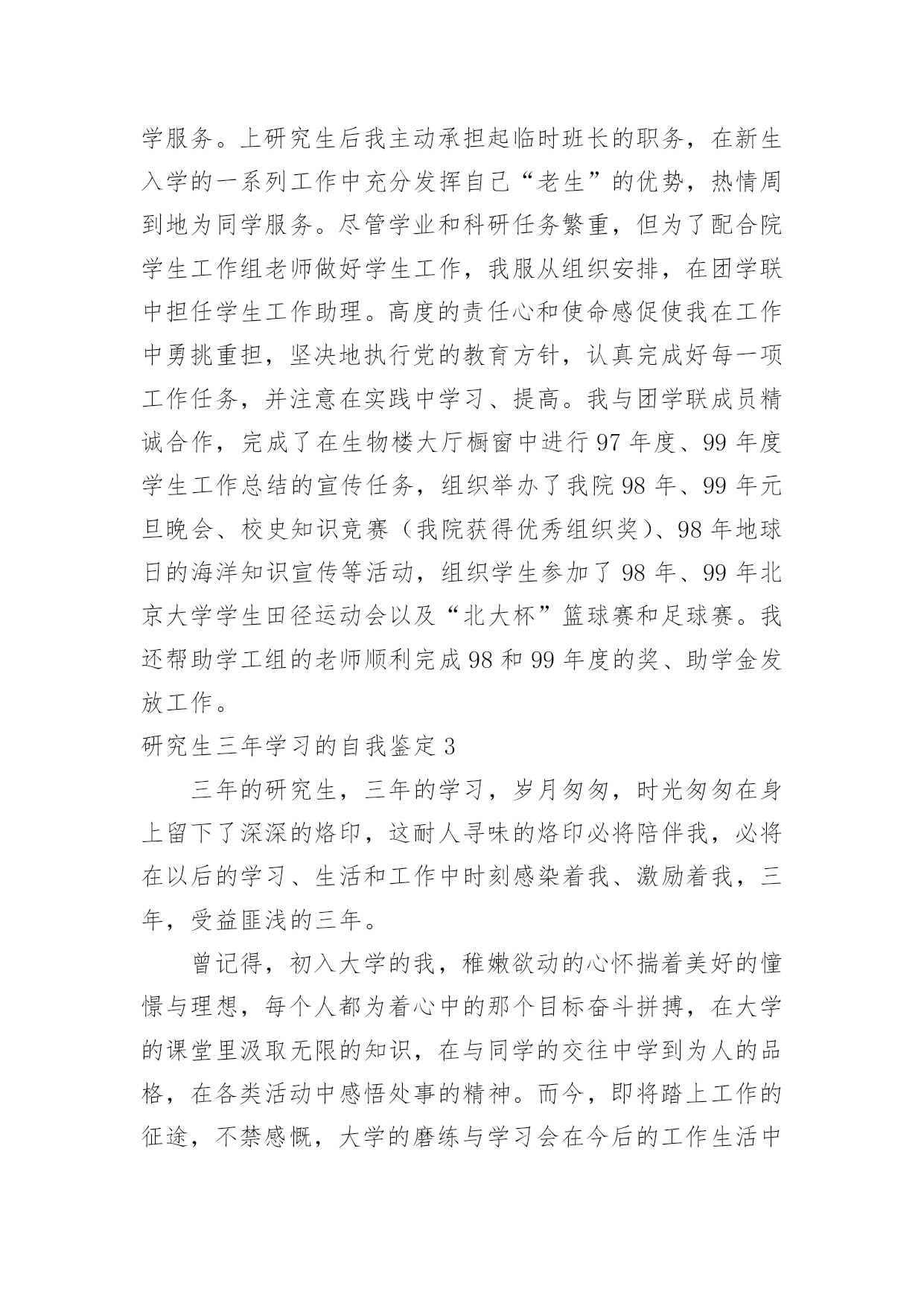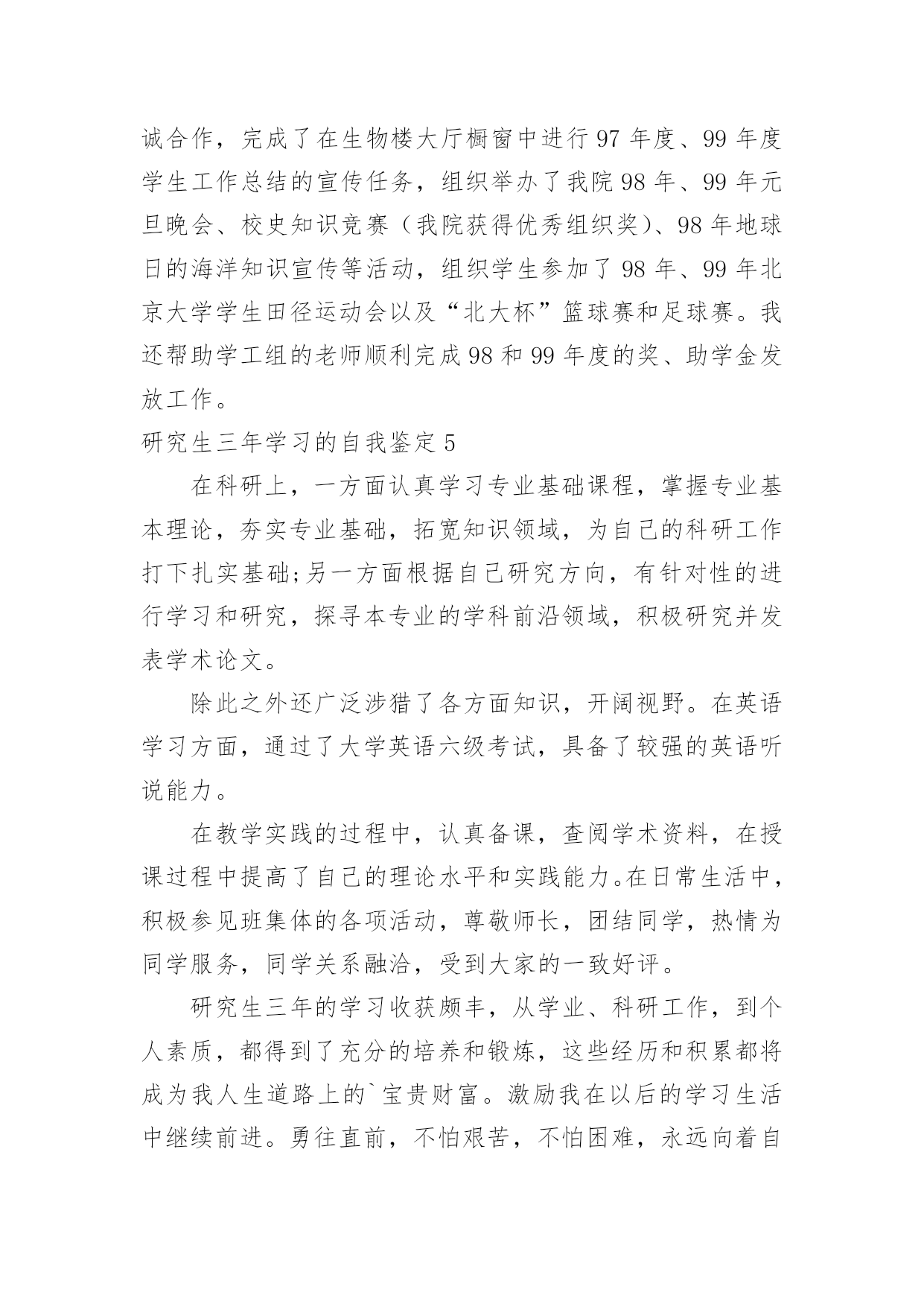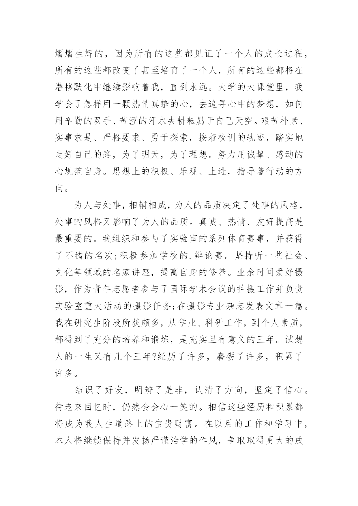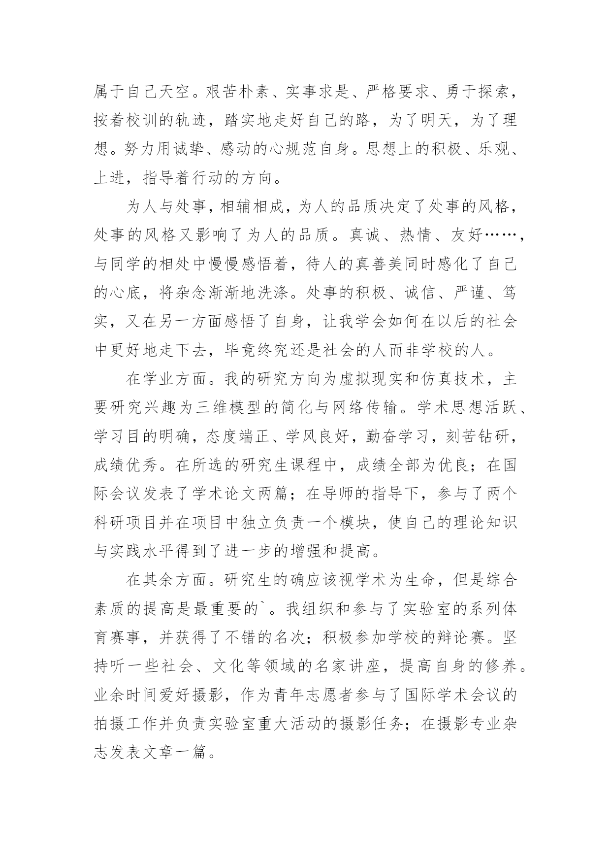 研究生三年学习的自我鉴定研究生三年学习的自我鉴定一般来说,自我鉴定即是自我总结,自我鉴定使我们及时找出错误并改正,不如我们来制定一份自我鉴定吧。你所见过的自我鉴定应该是什么样的?以下是小编帮大家整理的研究生三年学习的自我鉴定,欢迎大家分享。研究生三年学习的自我鉴定1三年的研究生,三年的学习,岁月匆匆,时光匆匆在身上留下了深深的烙印,这耐人寻味的烙印必将陪伴我,必将在以后的学习、生活和工作中时刻感染着我、激励着我,三年,受益匪浅的三年。曾记得,初入大学的我,稚嫩欲动的心怀揣着美好的憧憬与理想,每个人都为着心中的那个目标奋斗拼搏,在大学的课堂里汲取无限的知识,在与同学的交往中学到为人的品格,在各类活动中感悟处事的精神。而今,即将踏上工作的征途,不禁感慨,大学的磨练与学习会在今后的工作生活中熠熠生辉的,因为所有的这些都见证了一个人的成长过程,所有的这些都改变了甚至培育了一个人,所有的这些都将在潜移默化中继续影响着我,直到永远。大学的大课堂里,我学会了怎样用一颗热情真挚的心,去追寻心中的梦想,如何用辛勤的双手、苦涩的汗水去耕耘属于自己天空。艰苦朴素、实事求是、严格要求、勇于探索,按着校训的轨迹,踏实地走好自己的路,为了明天,为了理想。努力用诚挚、感动的心规范自身。思想上的积极、乐观、上进,指导着行动的方向。为人与处事,相辅相成,为人的品质决定了处事的风格,处事的风格又影响了为人的品质。真诚、热情、友好……,与同学的相处中慢慢感悟着,待人的真善美同时感化了自己的心底,将杂念渐渐地洗涤。处事的积极、诚信、严谨、笃实,又在另一方面感悟了自身,让我学会如何在以后的社会中更好地走下去,毕竟终究还是社会的人而非学校的人。在学业方面。我的研究方向为虚拟现实和仿真技术,主要研究兴趣为三维模型的简化与网络传输。学术思想活跃、学习目的明确,态度端正、学风良好,勤奋学习,刻苦钻研,成绩优秀。在所选的研究生课程中,成绩全部为优良;在国际会议发表了学术论文两篇;在导师的指导下,参与了两个科研项目并在项目中独立负责一个模块,使自己的理论知识与实践水平得到了进一步的增强和提高。在其余方面。研究生的确应该视学术为生命,但是综合素质的提高是最重要的`。我组织和参与了实验室的系列体育赛事,并获得了不错的名次;积极参加学校的辩论赛。坚持听一些社会、文化等领域的名家讲座,提高自身的修养。业余时间爱好摄影,作为青年志愿者参与了国际学术会议的拍摄工作并负责实验室重大活动的摄影任务;在摄影专业杂志发表文章一篇。我在研究生阶段所获颇多,从学业、科研工作,到个人素质,都得到了充分的培养和锻炼,是充实且有意义的三年。试想人的一生又有几个三年?经历了许多,磨砺了许多,积累了许多。结识了好友,明辨了是非,认清了方向,坚定了信心。待老来回忆时,仍然会会心一笑的。相信这些经历和积累都将成为我人生道路上的宝贵财富。在以后的工作和学习中,本人将继续保持并发扬严谨治学的作风,争取取得更大的成绩。研究生三年学习的自我鉴定2我在政治上、思想上一直积极要求进步。进入北大后,通过参加业余党校和入党积极分子培训班的学习,我对建设有中国特色的社会主义理论和党的基本路线有了较深刻的认识,树立了坚定的共产主义信念,并于1996年1月光荣加入了中国共产党。经过党组织1年预备期的考察,于1997年1月如期转为正式党员。我决心要做一名合格的、模范的共产党员,在学习、工作、思想上起带头作用,特别是在政治上起先锋模范作用。自入党以来,我时刻以共产党员的标准严格要求自己,拥护党的纲领,执行党的决议,履行党员的义务,遵守党的纪律,在群众中树立了一个共产党员的良好形象。我被评为北京大学1998年度优秀共产党员,我觉得这是党组织对我工作的承认,同时也是对我的鞭策,促使我不断完善自己,更加努力地工作,能为祖国和人民做出更大的贡献。我参加了北京大学第二期研究生干部学校的'培训,通过学习和讨论《邓小平文选》、听取各种讲座以及其它丰富多彩的活动,我不但提高了理论水平,而且锻炼了各方面的能力,并应用所学到的知识,积极配合学校开展研究生工作,为学校的建设做出自己应有的贡献。在1998年迎接和庆祝北京大学一百周年校庆的过程中,我积极参加庆祝活动,对北大传统和北大精神有了较深刻的认识。1999年是很有纪念意义的一年,好几件大事都在这一年发生:五四运动80周年,建国50周年,澳门回归祖国。我积极参加了有关的纪念活动,并从中受到了爱国主义教育。99年5月8日,以美国为首的北约悍然轰炸了我国驻南斯拉夫大使馆,激起了我国人民的强烈愤慨,同时也激发了全国人民的爱国热情。我和北大的其他同学一道,通过游行、贴海报等各种合法形式表达了我们青年学生对北约野蛮暴行的强烈愤慨,以及对牺牲烈士的悼念和崇敬之情。作为学生我从不放松学习,在上研第一年,我修完了导师指定的各