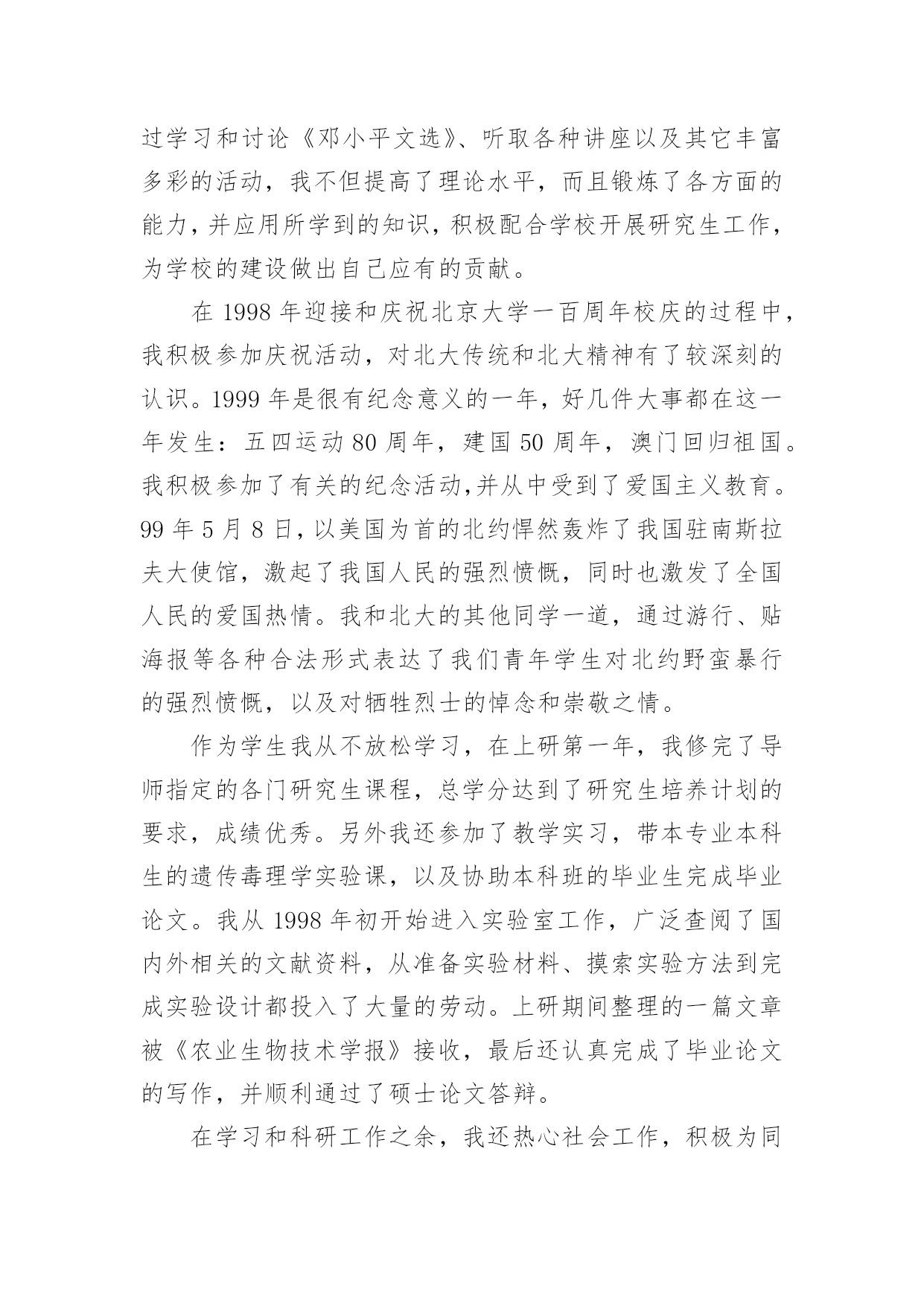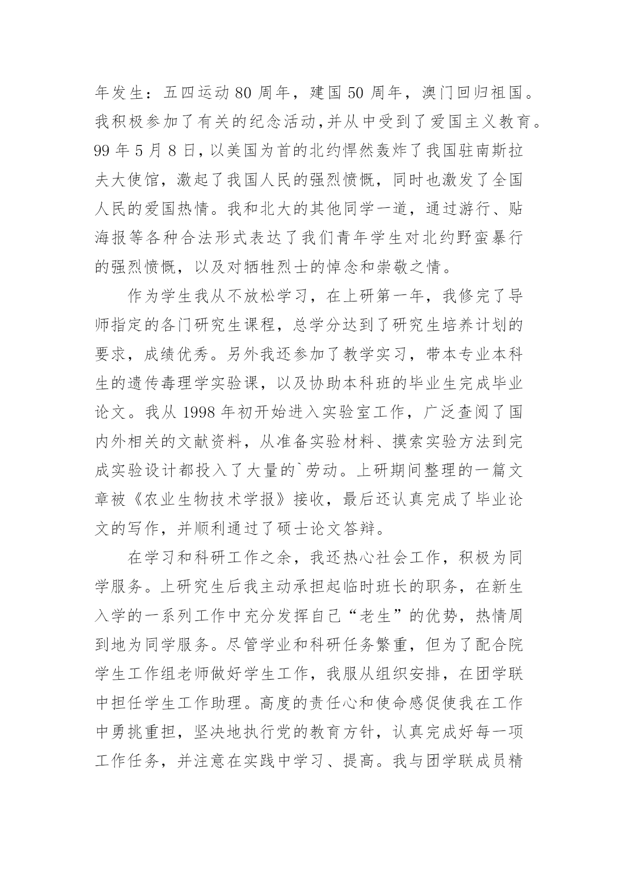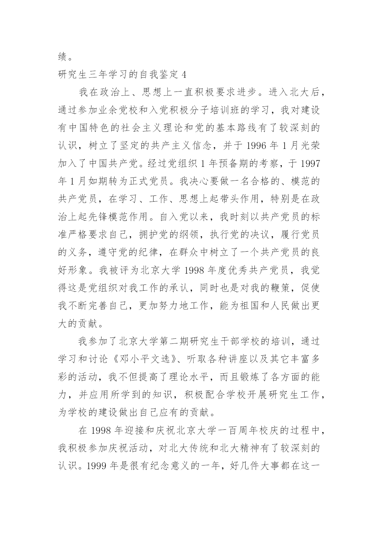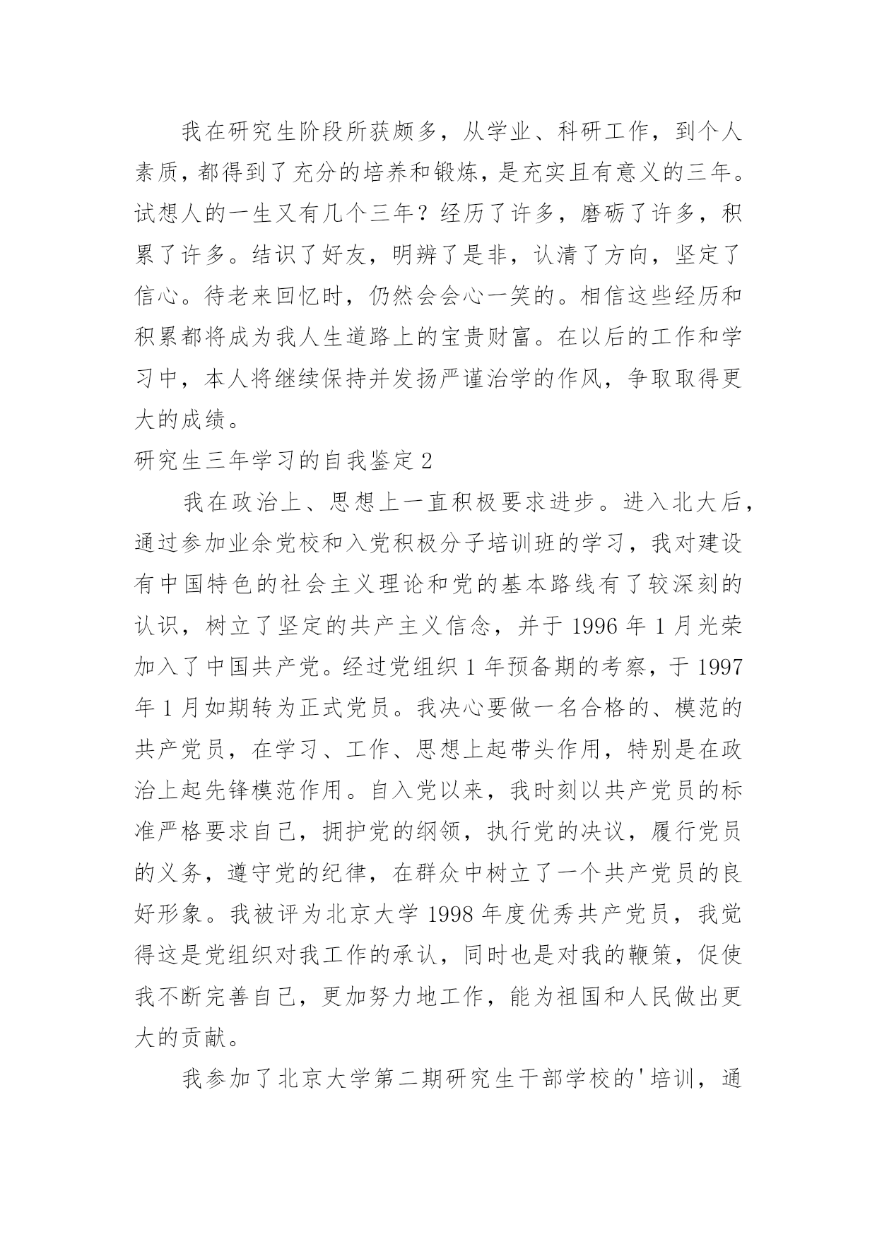 研究生三年学习的自我鉴定研究生三年学习的自我鉴定一般来说,自我鉴定即是自我总结,自我鉴定使我们及时找出错误并改正,不如我们来制定一份自我鉴定吧。你所见过的自我鉴定应该是什么样的?以下是小编帮大家整理的研究生三年学习的自我鉴定,欢迎大家分享。研究生三年学习的自我鉴定1三年的研究生,三年的学习,岁月匆匆,时光匆匆在身上留下了深深的烙印,这耐人寻味的烙印必将陪伴我,必将在以后的学习、生活和工作中时刻感染着我、激励着我,三年,受益匪浅的三年。曾记得,初入大学的我,稚嫩欲动的心怀揣着美好的憧憬与理想,每个人都为着心中的那个目标奋斗拼搏,在大学的课堂里汲取无限的知识,在与同学的交往中学到为人的品格,在各类活动中感悟处事的精神。而今,即将踏上工作的征途,不禁感慨,大学的磨练与学习会在今后的工作生活中熠熠生辉的,因为所有的这些都见证了一个人的成长过程,所有的这些都改变了甚至培育了一个人,所有的这些都将在潜移默化中继续影响着我,直到永远。大学的大课堂里,我学会了怎样用一颗热情真挚的心,去追寻心中的梦想,如何用辛勤的双手、苦涩的汗水去耕耘属于自己天空。艰苦朴素、实事求是、严格要求、勇于探索,按着校训的轨迹,踏实地走好自己的路,为了明天,为了理想。努力用诚挚、感动的心规范自身。思想上的积极、乐观、上进,指导着行动的方向。为人与处事,相辅相成,为人的品质决定了处事的风格,处事的风格又影响了为人的品质。真诚、热情、友好……,与同学的相处中慢慢感悟着,待人的真善美同时感化了自己的心底,将杂念渐渐地洗涤。处事的积极、诚信、严谨、笃实,又在另一方面感悟了自身,让我学会如何在以后的社会中更好地走下去,毕竟终究还是社会的人而非学校的人。在学业方面。我的研究方向为虚拟现实和仿真技术,主要研究兴趣为三维模型的简化与网络传输。学术思想活跃、学习目的明确,态度端正、学风良好,勤奋学习,刻苦钻研,成绩优秀。在所选的研究生课程中,成绩全部为优良;在国际会议发表了学术论文两篇;在导师的指导下,参与了两个科研项目并在项目中独立负责一个模块,使自己的理论知识与实践水平得到了进一步的增强和提高。在其余方面。研究生的确应该视学术为生命,但是综合素质的提高是最重要的`。我组织和参与了实验室的系列体育赛事,并获得了不错的名次;积极参加学校的辩论赛。坚持听一些社会、文化等领域的名家讲座,提高自身的修养。业余时间爱好摄影,作为青年志愿者参与了国际学术会议的拍摄工作并负责实验室重大活动的摄影任务;在摄影专业杂志发表文章一篇。我在研究生阶段所获颇多,从学业、科研工作,到个人素质,都得到了充分的培养和锻炼,是充实且有意义的三年。试想人的一生又有几个三年?经历了许多,磨砺了许多,积累了许多。结识了好友,明辨了是非,认清了方向,坚定了信心。待老来回忆时,仍然会会心一笑的。相信这些经历和积累都将成为我人生道路上的宝贵财富。在以后的工作和学习中,本人将继续保持并发扬严谨治学的作风,争取取得更大的成绩。研究生三年学习的自我鉴定2我在政治上、思想上一直积极要求进步。进入北大后,通过参加业余党校和入党积极分子培训班的学习,我对建设有中国特色的社会主义理论和党的基本路线有了较深刻的认识,树立了坚定的共产主义信念,并于1996年1月光荣加入了中国共产党。经过党组织1年预备期的考察,于1997年1月如期转为正式党员。我决心要做一名合格的、模范的共产党员,在学习、工作、思想上起带头作用,特别是在政治上起先锋模范作用。自入党以来,我时刻以共产党员的标准严格要求自己,拥护党的纲领,执行党的决议,履行党员的义务,遵守党的纪律,在群众中树立了一个共产党员的良好形象。我被评为北京大学1998年度优秀共产党员,我觉得这是党组织对我工作的承认,同时也是对我的鞭策,促使我不断完善自己,更加努力地工作,能为祖国和人民做出更大的贡献。我参加了北京大学第二期研究生干部学校的'培训,通过学习和讨论《邓小平文选》、听取各种讲座以及其它丰富多彩的活动,我不但提高了理论水平,而且锻炼了各方面的能力,并应用所学到的知识,积极配合学校开展研究生工作,为学校的建设做出自己应有的贡献。在1998年迎接和庆祝北京大学一百周年校庆的过程中,我积极参加庆祝活动,对北大传统和北大精神有了较深刻的认识。1999年是很有纪念意义的一年,好几件大事都在这一年发生:五四运动80周年,建国50周年,澳门回归祖国。我积极参加了有关的纪念活动,并从中受到了爱国主义教育。99年5月8日,以美国为首的北约悍然轰炸了我国驻南斯拉夫大使馆,激起了我国人民的强烈愤慨,同时也激发了全国人民的爱国热情。我和北大的其他同学一道,通过游行、贴海报等各种合法形式表达了我们青年学生对北约野蛮暴行的强烈愤慨,以及对牺牲烈士的悼念和崇敬之情。作为学生我从不放松学习,在上研第一年,我修完了导师指定的各