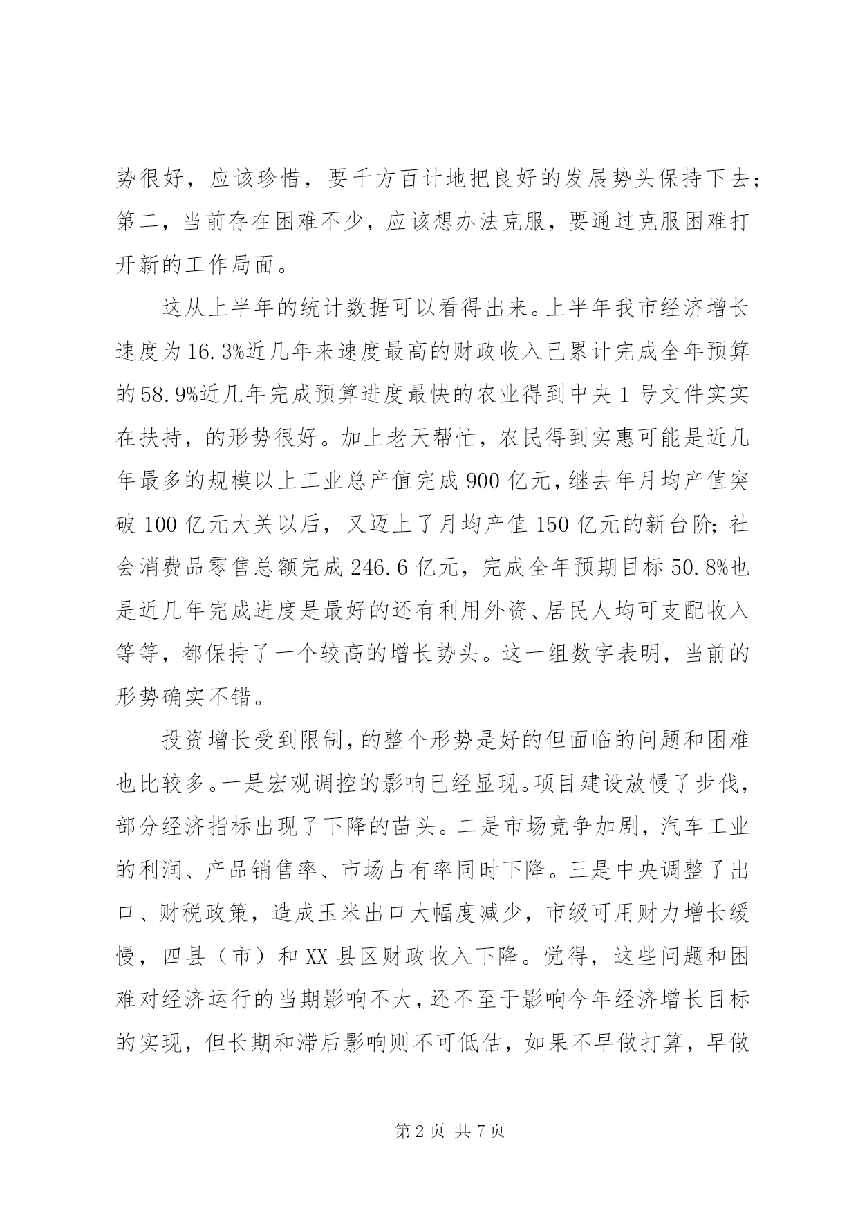 第PAGE\*Arabic\*MERGEFORMAT7页共NUMPAGES\*MERGEFORMAT7页市长在咨询委经济形势座谈会的讲话经济运行中出现了很多新问题、新情况。对当前的形势怎么看。下步的工作应该怎么干。对于这两个问题,当前的宏观经济环境发生了许多重大变化。市政府高度重视。专门召开了全市经济运行分析会进行了认真研究,但总感觉影响当前经济运行的变数比较多,对有些问题看的还不是很清楚,不能轻易地下定论。所以我提议召开今天这次会议,请各位咨询委员帮助市政府研究,给我出出主意。感到很受启发,听了刚才大家的发言。很受教育,很受鼓舞。说很受启发,主要是听了大家的发言,使我对形势的认识更全面了对下步工作的想法更清晰了脑子里许许多多的问题都理出了头绪。说很受教育,主要是说各位咨询委员尽职尽责做好决策咨询工作,为政府分忧、为出力,这种认真负责的精神是非常可贵的说很受鼓舞,就是说,如果我把工作中遇到一些拿不准、犹豫不定的问题都拿出来,请各位咨询委员帮助我研究,并且大家都能像今天这样献计出力,相信政府决策一定能够提高到一个新的水平,的局面一定能发生很大的变化。所以,这里,要对各位咨询委员表示诚挚的感谢。下面,结合各位咨询委员的发言,讲两个问题,与大家互相交流,一起探讨。一、关于形势和任务觉得可以用两句话。第一,概括当前的形势和我任务。的形势很好,应该珍惜,要千方百计地把良好的发展势头保持下去;第二,当前存在困难不少,应该想办法克服,要通过克服困难打开新的工作局面。这从上半年的统计数据可以看得出来。上半年我市经济增长速度为16.3%近几年来速度最高的财政收入已累计完成全年预算的58.9%近几年完成预算进度最快的农业得到中央1号文件实实在扶持,的形势很好。加上老天帮忙,农民得到实惠可能是近几年最多的规模以上工业总产值完成900亿元,继去年月均产值突破100亿元大关以后,又迈上了月均产值150亿元的新台阶;社会消费品零售总额完成246.6亿元,完成全年预期目标50.8%也是近几年完成进度是最好的还有利用外资、居民人均可支配收入等等,都保持了一个较高的增长势头。这一组数字表明,当前的形势确实不错。投资增长受到限制,的整个形势是好的但面临的问题和困难也比较多。一是宏观调控的影响已经显现。项目建设放慢了步伐,部分经济指标出现了下降的苗头。二是市场竞争加剧,汽车工业的利润、产品销售率、市场占有率同时下降。三是中央调整了出口、财税政策,造成玉米出口大幅度减少,市级可用财力增长缓慢,四县(市)和XX县区财政收入下降。觉得,这些问题和困难对经济运行的当期影响不大,还不至于影响今年经济增长目标的实现,但长期和滞后影响则不可低估,如果不早做打算,早做安排,就要削弱经济的发展后劲,影响经济运行的长期趋势。应该振奋,面对好的形势。倍加珍惜,把工作干的更好。面对困难,应该振作精神,迎难而上,表现出人不认输的劲头,表现出力量和觉悟。但我知道,光有加快发展的愿望还不行,还要有加快发展的办法。底应该从那些角度去寻求突破。底应该采取什么样的工作策略。觉得大家已经给出了很好的答案。归纳起来,认为大概有这么几条,第一,要辨证地看待当前的困难和问题,善于从宏观调控中寻找适合自身发展的有利因素,变压力为动力,变挑战为机遇。第二,要解放思想、创新思路,千方百计破解土地紧张、信贷紧缩、投资乏力、项目短缺等发展难题。第三,要积极争取中央支持,尽快出台振兴老工业基地各项政策或对东北地区实行宏观调控的差别政策,使我从“未过热、先降温”窘境中解脱出来。第四,要积极主动地应对宏观调控,既不擅闯红灯,更不自设红灯,还要及时认清绿灯、善于快抢绿灯,积极做好现有条件下能够做的事,创造条件做好应该做的事。大家提出的这些思路,觉得非常有道理。下一步我要做的就是把这些思路具体化、化,然后狠抓落实。有句经常说的话,日子难过年年过,年年过的都不错”这么些年来,市就是克服困难和挑战中前进的困难和压力并不可怕。相信,有大家的聪明才智作坚强后盾,加上我自己的努力,今年还会是一个丰收年,还会为长远发展打下坚实基础。二、关于咨询委的工作已组织各类咨询论证会20余次,咨询委成立以来。先后对“”规划编制方案等课题进行了咨询论证。特别是对伊通河排水管道治理方案的论证取得了很好的效果,更改了原有的设计方案,新方案节省投资1.2亿元。近一段时间,部分咨询委员还就国家宏观调控对我市经济运行的影响、落实中央1号文件对农民增收的影响、土地政策调整后的对策等课题进行了调研,王君实同志还代表课题组在全市经济运行分析会上做了发言。咨询委作为政府的思想库、参谋部和智囊团,很好地发挥了自己的作用,市政府对咨询委的工作是满意的正在实践中逐步加以解决。但为了使咨询委的工作更快地上轨道,咨询委应该干什么、怎么干的问题。使政府决策