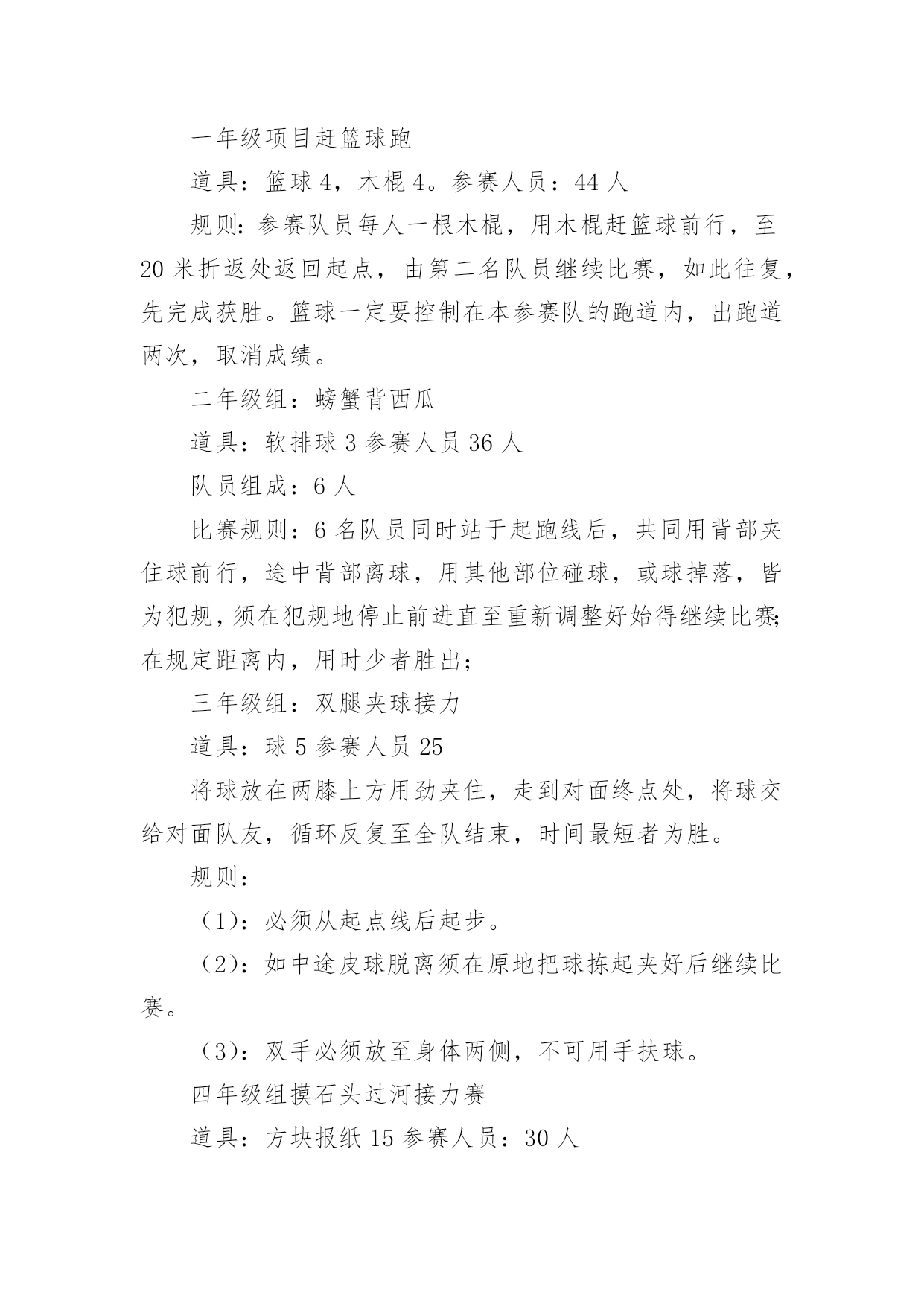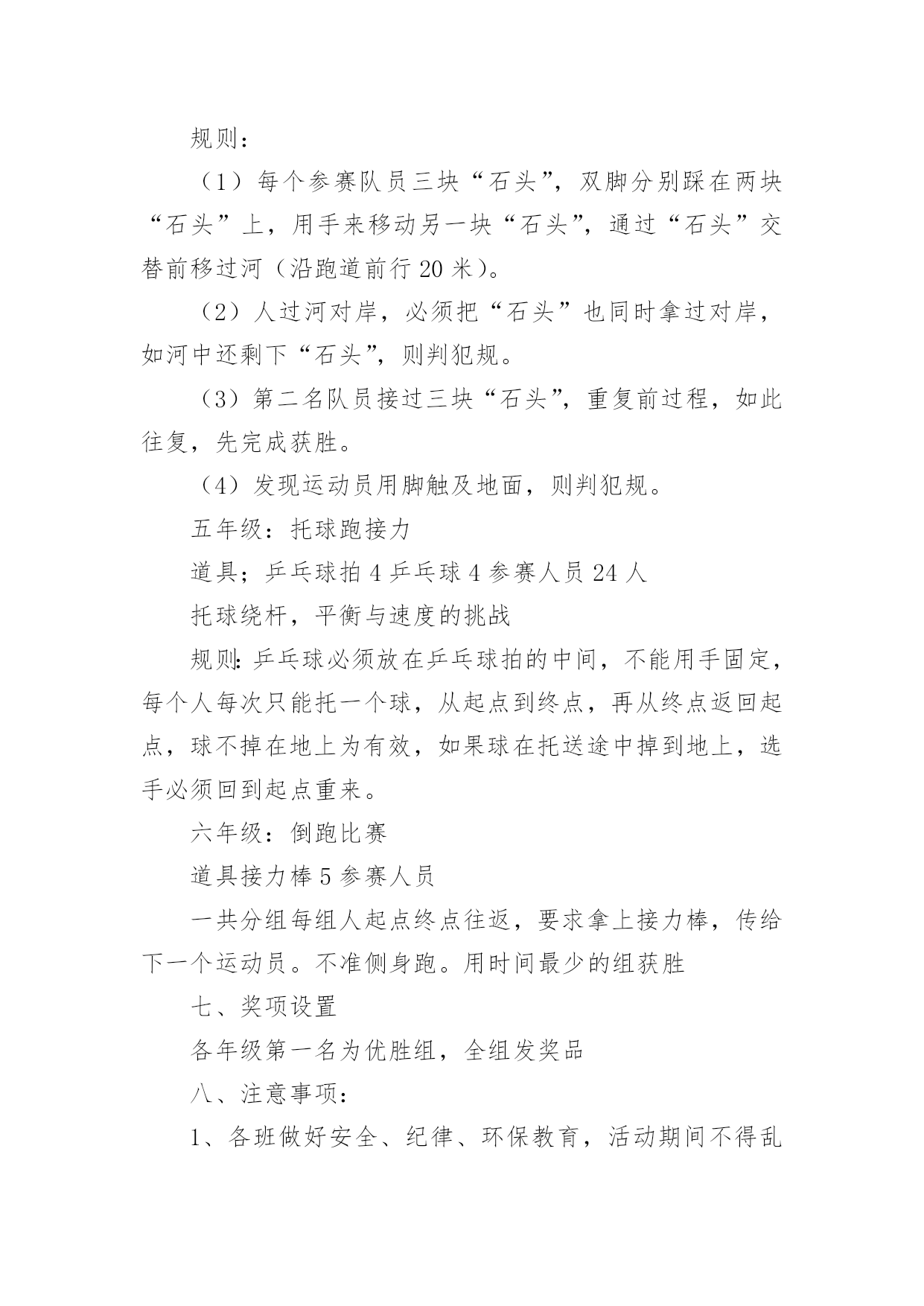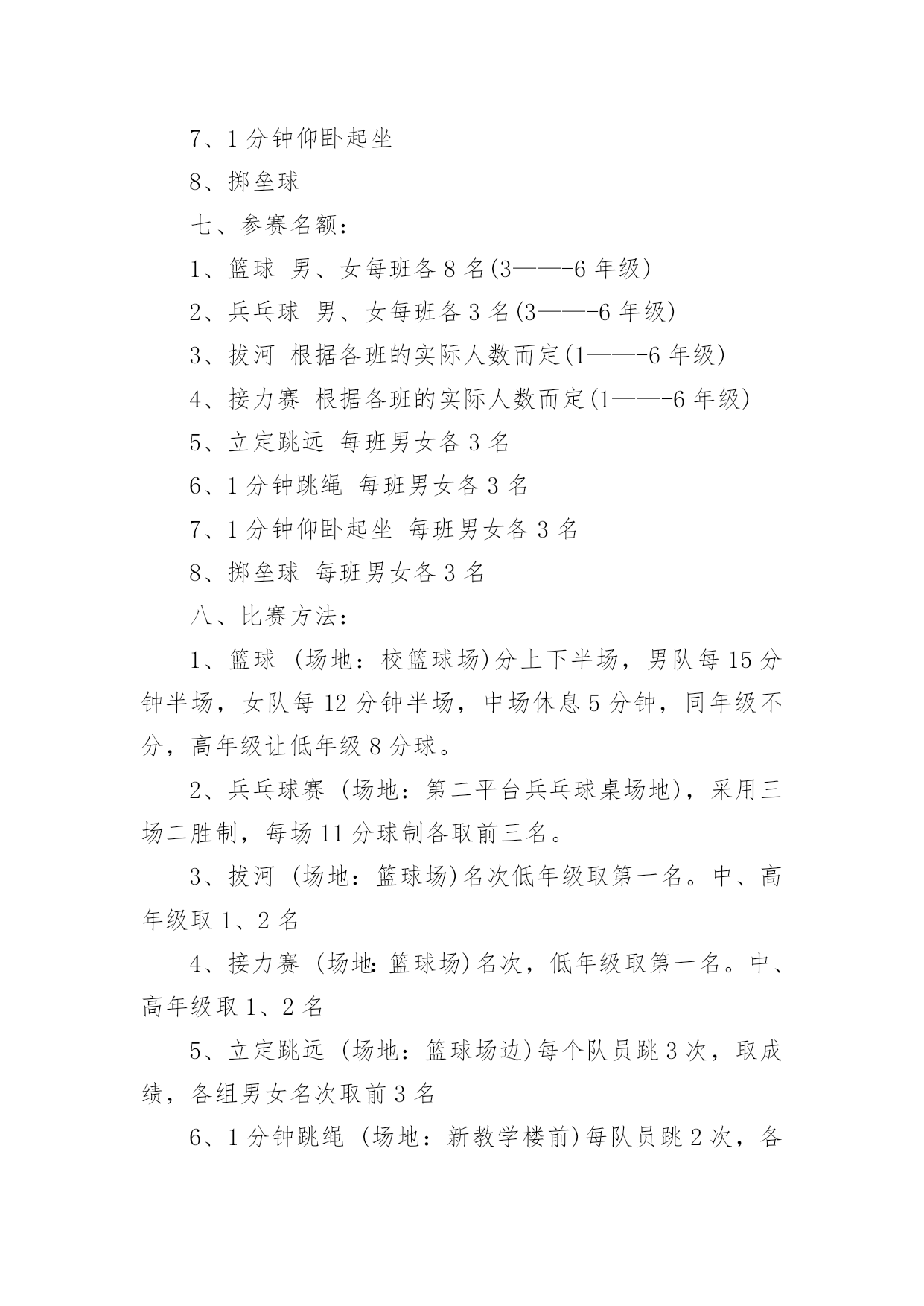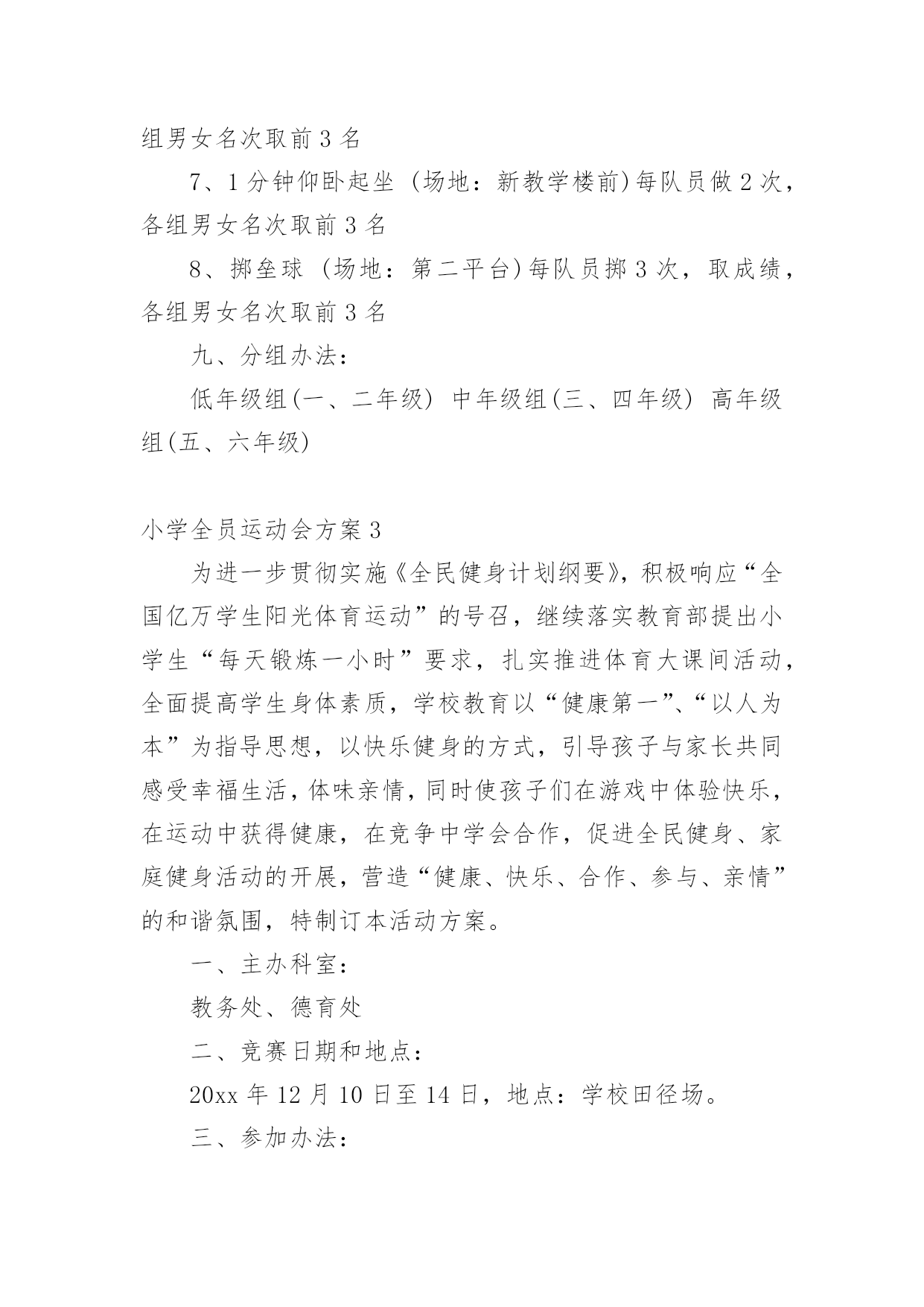 小学全员运动会方案为了确保工作或事情能高效地开展,就常常需要事先准备方案,方案指的是为某一次行动所制定的计划类文书。那么优秀的方案是什么样的呢?以下是小编为大家整理的小学全员运动会方案(通用5篇),欢迎大家借鉴与参考,希望对大家有所帮助。小学全员运动会方案1一、运动会的主题:我运动,我参与,我快乐二、活动目的:在宽基教育理念的引领下,为进一步推进素质教育的实施,提高广大学生体质,真正落实每天锻炼一小时,健康工作五十年,幸福生活一辈子的指导思想。让学生在情趣盎然中锻炼身体,陶冶情操,开发智力、展示个性特点,创设文明、健康、活泼、和谐的校园文化生活。展现新时代小学生形象,并培养团队合作精神,用健康的身体投身于学习之中,特举办此次趣味运动会。三、活动时间:4月29日上午四、活动地点:胜利大街小学领秀城校区操场五、活动内容:队列评比1、比赛要求:(1)以级部为单位,分组进行比赛(2)要求各班全员参加。(3)带队入场、退场都计入队列评分。(4)二、三年级由体育委员带队入场;一年级由班主任带队入场。2、评比办法:按照精神饱满;步伐整齐,动作迅速等进行评分。大课间操比赛1、比赛要求:(1)比赛级部为二、三年级,要求各班全员参加(2)比赛内容为七彩阳光和健美操。(3)队形为四路纵队、服装统一。2、评分办法:按照做操动作准确、统一到位,方向正确;服装统一,精神饱满;动作迅速,节奏准确等进行评分。趣味运动会本次运动会以级部为单位,分时段分别组织参赛,设定项目为:一年级:障碍接力亲子接力赛二、三年级:齐心协力亲子运水接力六、参赛人数:障碍接力:每班为男、女各15人(一年级男女不限);亲子接力:每班家长男、女各4人,学生16人;齐心协力:每班男女各20人:亲子运水接力:每班家长8人、学生16人(男女不限)。为达到全员参与的目标,要求两个项目参赛选手不重复。七、名次判定:根据成绩一年级取前四名、二年级取前三名,三年级取前两名八、比赛方法:障碍接力:采取往返接力的形式,绕过一定数量的障碍。亲子接力赛:两位家长(男女各一人)双手交叉抬一位学生到指定位置(每位家长往返两次),学生跑到终点,将接力棒交给对面一位同学,对面的同学以同样的方式跳到家长所在位置,家长再把学生抬回到起点位置,然后下一组家长再开始,依此类推,直到参赛家长和学生都完成,用时短者名次列前。齐心协力:两人双手共持一根接力棒,比赛开始后,两人向前跑出,并同时从左侧绕过障碍物,然后返回,跑动过程中不允许双手松开或者跨过障碍,否则罚时间。采取接力的形式。亲子运水接力:采取接力的形式,一位家长与一名学生手牵手,并且每人手持一容器,依次将队伍前水桶内的水盛至对面水桶,用时短且盛水量大的小组成绩列前。小学全员运动会方案2一、指导思想:为了进一步丰富我校学生的课余生活,推动学生更加广泛地参加体育活动,增加学生体质,活跃身心,以充沛的精力投入学习。通过活动,培养学生的团队意识,竞争意识,合作交流能力,又能激发学生的学习热情,弘扬个性特长,促进学生全面健康地发展,真正做到全面实施素质教育。我校决定20xx年4月21日——4月29日举行第七届小学生校园运动会。二、活动主题:张扬个性、全面发展、文明健美、活泼向上三、活动时间:4月21日——4月29日四、活动地点:学校操场第二平台五、活动人员:全体教师、1-6年级学生六、比赛项目:1、篮球2、兵乓球3、拔河4、接力赛5、立定跳远6、1分钟跳绳7、1分钟仰卧起坐8、掷垒球七、参赛名额:1、篮球男、女每班各8名(3——-6年级)2、兵乓球男、女每班各3名(3——-6年级)3、拔河根据各班的实际人数而定(1——-6年级)4、接力赛根据各班的实际人数而定(1——-6年级)5、立定跳远每班男女各3名6、1分钟跳绳每班男女各3名7、1分钟仰卧起坐每班男女各3名8、掷垒球每班男女各3名八、比赛方法:1、篮球(场地:校篮球场)分上下半场,男队每15分钟半场,女队每12分钟半场,中场休息5分钟,同年级不分,高年级让低年级8分球。2、兵乓球赛(场地:第二平台兵乓球桌场地),采用三场二胜制,每场11分球制各取前三名。3、拔河(场地:篮球场)名次低年级取第一名。中、高年级取1、2名4、接力赛(场地:篮球场)名次,低年级取第一名。中、高年级取1、2名5、立定跳远(场地:篮球场边)每个队员跳3次,取成绩,各组男女名次取前3名6、1分钟跳绳(场地:新教学楼前)每队员跳2次,各组男女名次取前3名7、1分钟仰卧起坐(场地:新教学楼前)每队员做2次,各组男女名次取前3名8、掷垒球(场地:第二平台)每队员掷3次,取成绩,各组男女名次取前3名九、分组办法:低年级组(一、二年级)中年级组(三、四年级)高年级组(五、六年级)小学全员运动会方案3为进一步贯彻实施《全民健身计划纲要》,积极响应“全国亿万学生阳