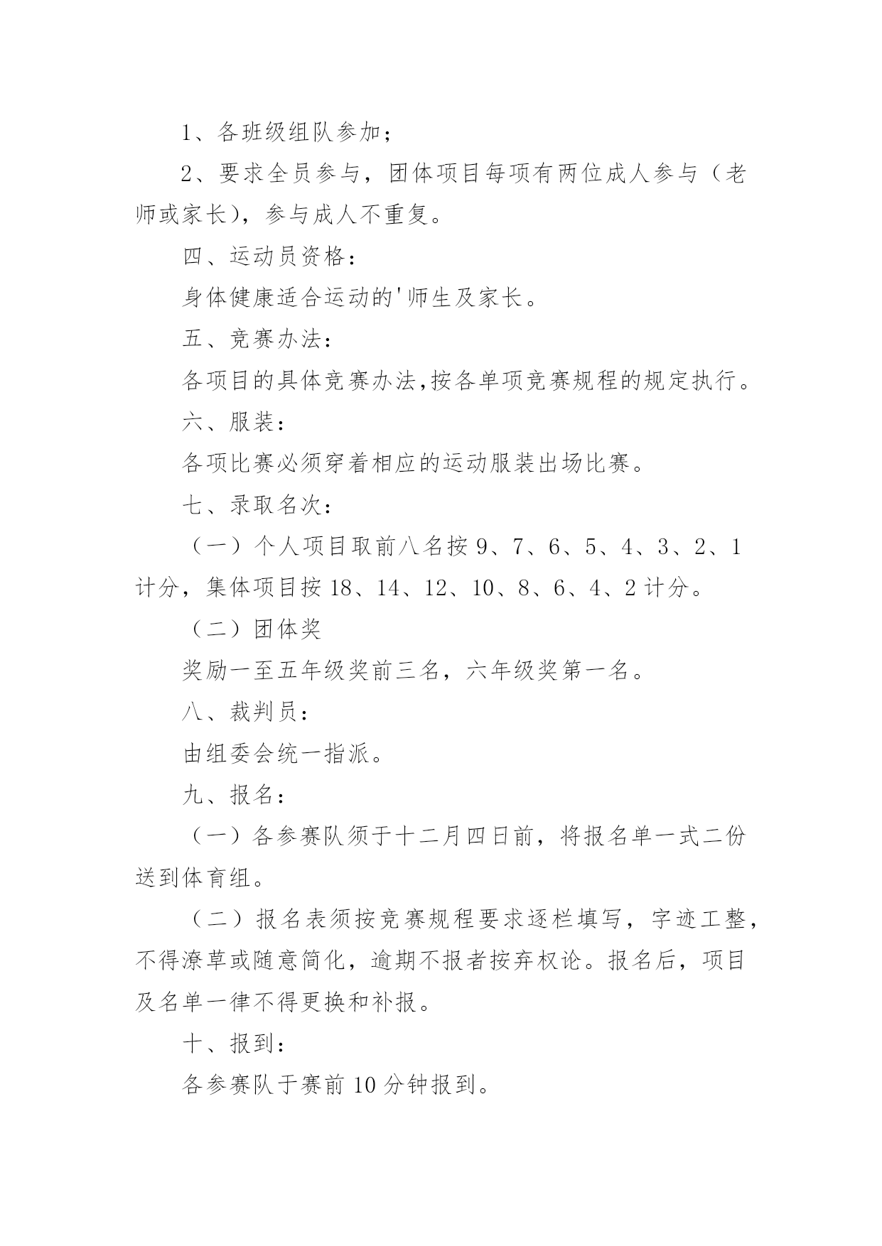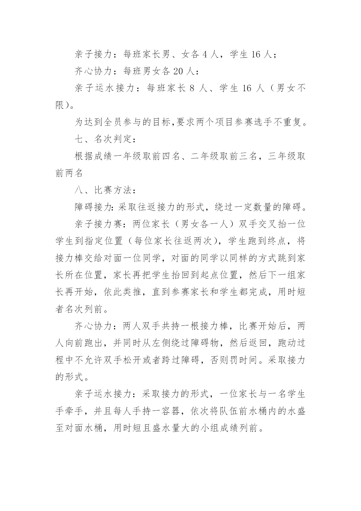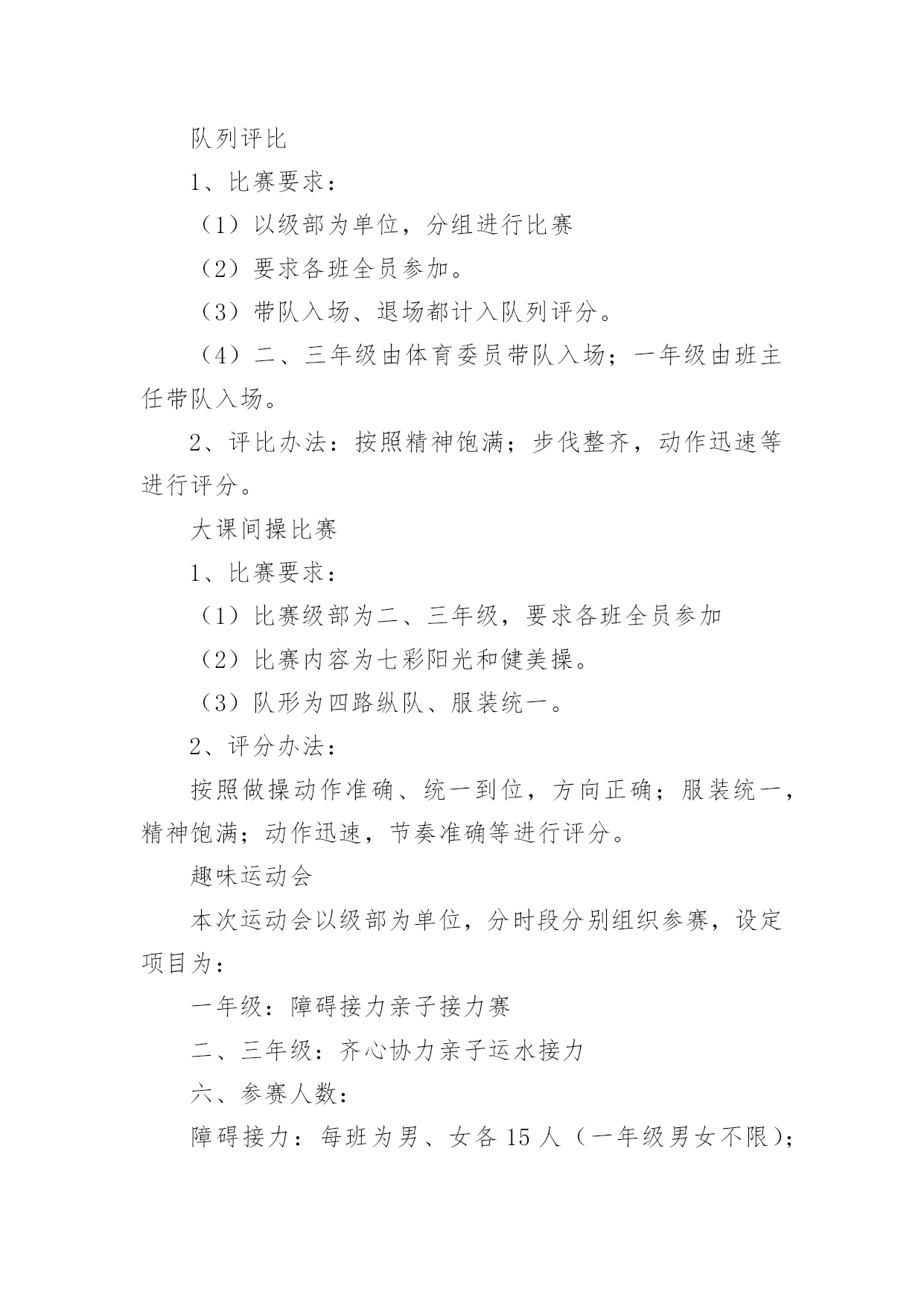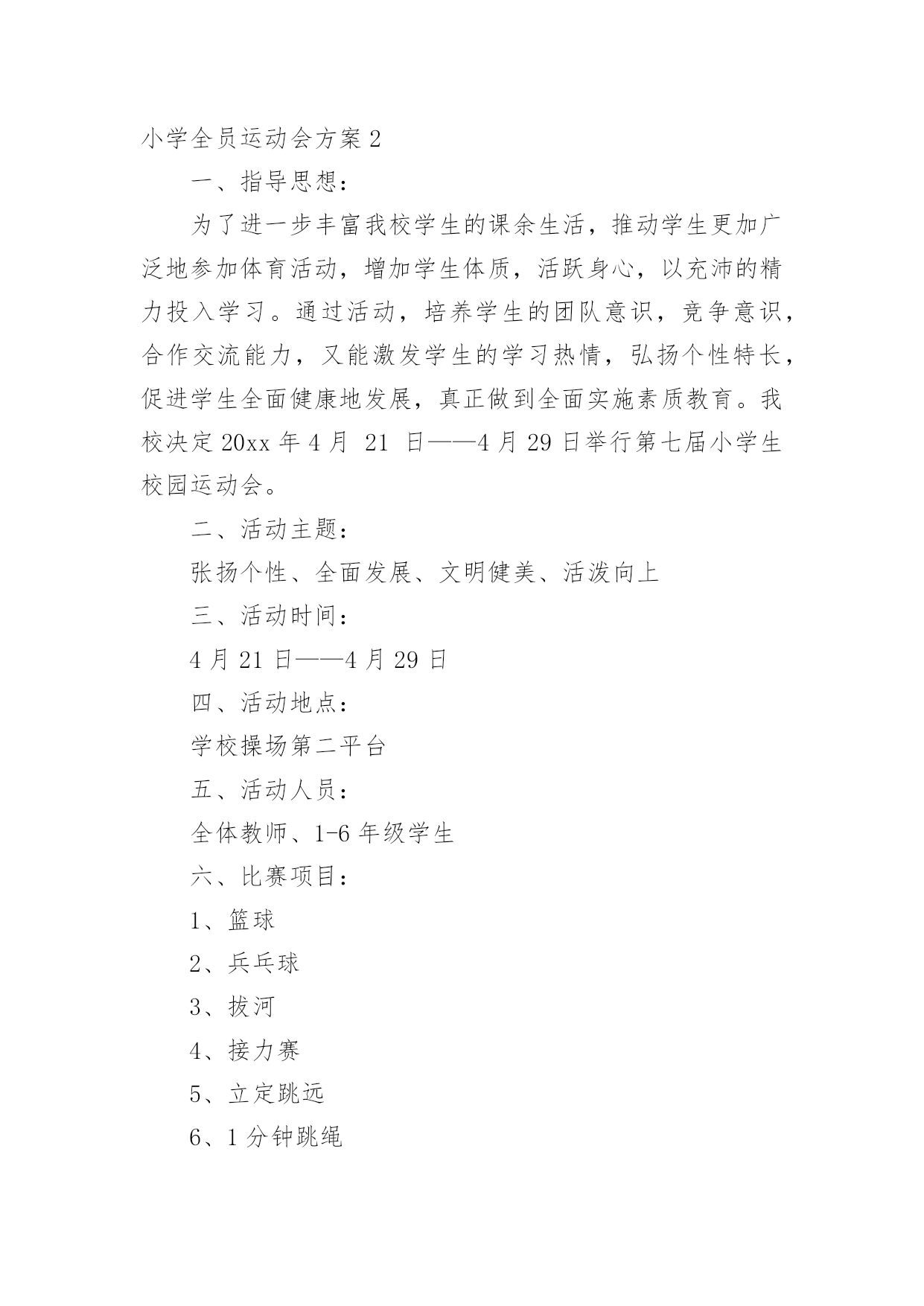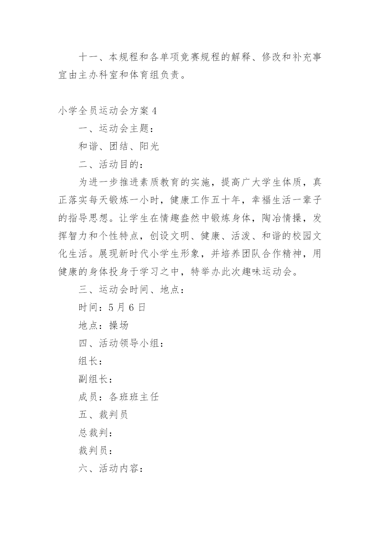 小学全员运动会方案为了确保工作或事情能高效地开展,就常常需要事先准备方案,方案指的是为某一次行动所制定的计划类文书。那么优秀的方案是什么样的呢?以下是小编为大家整理的小学全员运动会方案(通用5篇),欢迎大家借鉴与参考,希望对大家有所帮助。小学全员运动会方案1一、运动会的主题:我运动,我参与,我快乐二、活动目的:在宽基教育理念的引领下,为进一步推进素质教育的实施,提高广大学生体质,真正落实每天锻炼一小时,健康工作五十年,幸福生活一辈子的指导思想。让学生在情趣盎然中锻炼身体,陶冶情操,开发智力、展示个性特点,创设文明、健康、活泼、和谐的校园文化生活。展现新时代小学生形象,并培养团队合作精神,用健康的身体投身于学习之中,特举办此次趣味运动会。三、活动时间:4月29日上午四、活动地点:胜利大街小学领秀城校区操场五、活动内容:队列评比1、比赛要求:(1)以级部为单位,分组进行比赛(2)要求各班全员参加。(3)带队入场、退场都计入队列评分。(4)二、三年级由体育委员带队入场;一年级由班主任带队入场。2、评比办法:按照精神饱满;步伐整齐,动作迅速等进行评分。大课间操比赛1、比赛要求:(1)比赛级部为二、三年级,要求各班全员参加(2)比赛内容为七彩阳光和健美操。(3)队形为四路纵队、服装统一。2、评分办法:按照做操动作准确、统一到位,方向正确;服装统一,精神饱满;动作迅速,节奏准确等进行评分。趣味运动会本次运动会以级部为单位,分时段分别组织参赛,设定项目为:一年级:障碍接力亲子接力赛二、三年级:齐心协力亲子运水接力六、参赛人数:障碍接力:每班为男、女各15人(一年级男女不限);亲子接力:每班家长男、女各4人,学生16人;齐心协力:每班男女各20人:亲子运水接力:每班家长8人、学生16人(男女不限)。为达到全员参与的目标,要求两个项目参赛选手不重复。七、名次判定:根据成绩一年级取前四名、二年级取前三名,三年级取前两名八、比赛方法:障碍接力:采取往返接力的形式,绕过一定数量的障碍。亲子接力赛:两位家长(男女各一人)双手交叉抬一位学生到指定位置(每位家长往返两次),学生跑到终点,将接力棒交给对面一位同学,对面的同学以同样的方式跳到家长所在位置,家长再把学生抬回到起点位置,然后下一组家长再开始,依此类推,直到参赛家长和学生都完成,用时短者名次列前。齐心协力:两人双手共持一根接力棒,比赛开始后,两人向前跑出,并同时从左侧绕过障碍物,然后返回,跑动过程中不允许双手松开或者跨过障碍,否则罚时间。采取接力的形式。亲子运水接力:采取接力的形式,一位家长与一名学生手牵手,并且每人手持一容器,依次将队伍前水桶内的水盛至对面水桶,用时短且盛水量大的小组成绩列前。小学全员运动会方案2一、指导思想:为了进一步丰富我校学生的课余生活,推动学生更加广泛地参加体育活动,增加学生体质,活跃身心,以充沛的精力投入学习。通过活动,培养学生的团队意识,竞争意识,合作交流能力,又能激发学生的学习热情,弘扬个性特长,促进学生全面健康地发展,真正做到全面实施素质教育。我校决定20xx年4月21日——4月29日举行第七届小学生校园运动会。二、活动主题:张扬个性、全面发展、文明健美、活泼向上三、活动时间:4月21日——4月29日四、活动地点:学校操场第二平台五、活动人员:全体教师、1-6年级学生六、比赛项目:1、篮球2、兵乓球3、拔河4、接力赛5、立定跳远6、1分钟跳绳7、1分钟仰卧起坐8、掷垒球七、参赛名额:1、篮球男、女每班各8名(3——-6年级)2、兵乓球男、女每班各3名(3——-6年级)3、拔河根据各班的实际人数而定(1——-6年级)4、接力赛根据各班的实际人数而定(1——-6年级)5、立定跳远每班男女各3名6、1分钟跳绳每班男女各3名7、1分钟仰卧起坐每班男女各3名8、掷垒球每班男女各3名八、比赛方法:1、篮球(场地:校篮球场)分上下半场,男队每15分钟半场,女队每12分钟半场,中场休息5分钟,同年级不分,高年级让低年级8分球。2、兵乓球赛(场地:第二平台兵乓球桌场地),采用三场二胜制,每场11分球制各取前三名。3、拔河(场地:篮球场)名次低年级取第一名。中、高年级取1、2名4、接力赛(场地:篮球场)名次,低年级取第一名。中、高年级取1、2名5、立定跳远(场地:篮球场边)每个队员跳3次,取成绩,各组男女名次取前3名6、1分钟跳绳(场地:新教学楼前)每队员跳2次,各组男女名次取前3名7、1分钟仰卧起坐(场地:新教学楼前)每队员做2次,各组男女名次取前3名8、掷垒球(场地:第二平台)每队员掷3次,取成绩,各组男女名次取前3名九、分组办法:低年级组(一、二年级)中年级组(三、四年级)高年级组(五、六年级)小学全员运动会方案3为进一步贯彻实施《全民健身计划纲要》,积极响应“全国亿万学生阳
