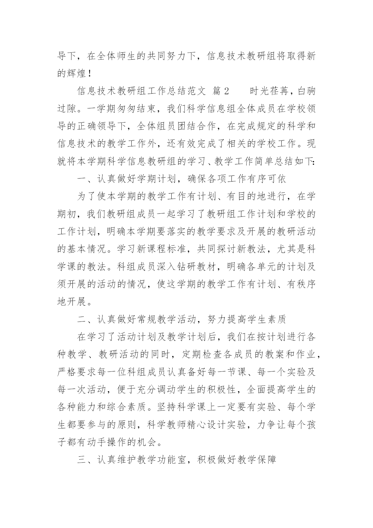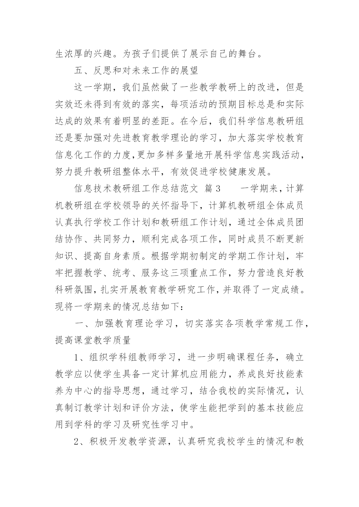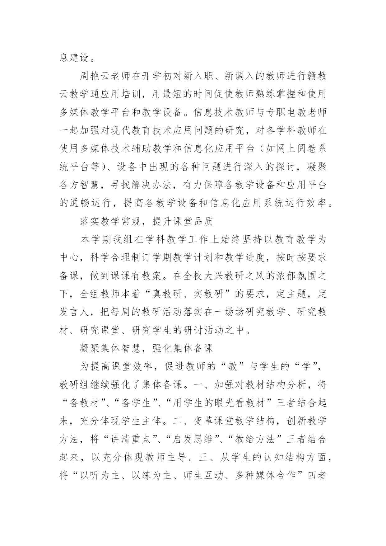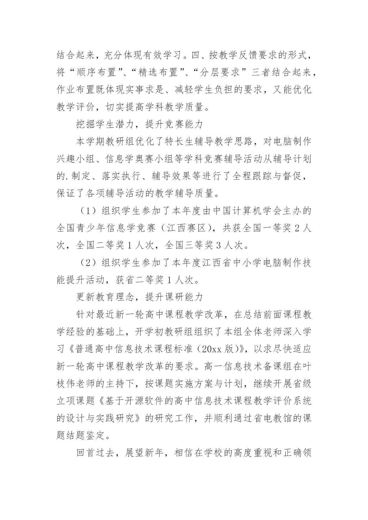信息技术教研组工作总结信息技术教研组工作总结范文总结就是对一个时期的学习、工作或其完成情况进行一次全面系统的回顾和分析的书面材料,它是增长才干的一种好办法,因此我们要做好归纳,写好总结。总结怎么写才不会流于形式呢?以下是小编为大家收集的信息技术教研组工作总结范文,欢迎阅读与收藏。信息技术教研组工作总结范文篇1本学期南康中学信息技术教研组紧紧围绕学校新一学年工作目标与要求,在学科教学工作上始终坚持以教育教学为中心,主抓了教学常规的落实与课堂教学质量的提升,更新教育理念,创设特色校本课程,培养特色人才。在学校新领导班子的正确领导和关心支持下,经过全组教师的共同努力,各方面都取得了较好的成绩和良好的反响,现将本学期的工作总结如下:助力信息化建设,强化师资队伍南康中学党委书记、副校长黄巾多次讲到要大力提高学校的教育信息化水平,推动信息技术与教育教学的深度融合,切实加快教育信息化进程,以教育信息化支撑和引领教育现代化,全面提升教师的信息化教学能力。全面提高教师的教学水平,提升学校教学质量,使教学模式多元化发展,为学校的高质量发展提供强有力保障。为响应黄校长的号召,全组教师在各自承担的岗位工作上认真钻研,助力学校教育信息建设。周艳云老师在开学初对新入职、新调入的教师进行赣教云教学通应用培训,用最短的时间促使教师熟练掌握和使用多媒体教学平台和教学设备。信息技术教师与专职电教老师一起加强对现代教育技术应用问题的研究,对各学科教师在使用多媒体技术辅助教学和信息化应用平台(如网上阅卷系统平台等)、设备中出现的各种问题进行深入的探讨,凝聚各方智慧,寻找解决办法,有力保障各教学设备和应用平台的通畅运行,提高各教学设备和信息化应用系统运行效率。落实教学常规,提升课堂品质本学期我组在学科教学工作上始终坚持以教育教学为中心,科学合理制订学期教学计划和教学进度,按时按要求备课,做到课课有教案。在全校大兴教研之风的浓郁氛围之下,全组教师本着“真教研、实教研”的要求,定主题,定发言人,把每周的教研活动落实在一场场研究教学、研究教材、研究课堂、研究学生的研讨活动之中。凝聚集体智慧,强化集体备课为提高课堂效率,促进教师的“教”与学生的“学”,教研组继续强化了集体备课。一、加强对教材结构分析,将“备教材”、“备学生”、“用学生的眼光看教材”三者结合起来,充分体现学生主体。二、变革课堂教学结构,创新教学方法,将“讲清重点”、“启发思维”、“教给方法”三者结合起来,以充分体现教师主导。三、从学生的认知结构方面,将“以听为主、以练为主、师生互动、多种媒体合作”四者结合起来,充分体现有效学习。四、按教学反馈要求的形式,将“顺序布置”、“精选布置”、“分层要求”三者结合起来,作业布置既体现实事求是、减轻学生负担的要求,又能优化教学评价,切实提高学科教学质量。挖掘学生潜力,提升竞赛能力本学期教研组优化了特长生辅导教学思路,对电脑制作兴趣小组、信息学奥赛小组等学科竞赛辅导活动从辅导计划的.制定、落实执行、辅导效果等进行了全程跟踪与督促,保证了各项辅导活动的教学辅导质量。(1)组织学生参加了本年度由中国计算机学会主办的全国青少年信息学竞赛(江西赛区),共获全国一等奖2人次,全国二等奖1人次,全国三等奖3人次。(2)组织学生参加了本年度江西省中小学电脑制作技能提升活动,获省二等奖1人次。更新教育理念,提升课研能力针对最近新一轮高中课程教学改革,在总结前面课程教学经验的基础上,开学初教研组组织了本组全体老师深入学习《普通高中信息技术课程标准(20xx版)》,以求尽快适应新一轮高中课程教学改革的要求。高一信息技术备课组在叶枝伟老师的主持下,按课题实施方案与计划,继续开展省级立项课题《基于开源软件的高中信息技术课程教学评价系统的设计与实践研究》的研究工作,并顺利通过省电教馆的课题结题鉴定。回首过去,展望新年,相信在学校的高度重视和正确领导下,在全体师生的共同努力下,信息技术教研组将取得新的辉煌!信息技术教研组工作总结范文篇2时光荏苒,白驹过隙。一学期匆匆结束,我们科学信息组全体成员在学校领导的正确领导下,全体组员团结合作,在完成规定的科学和信息技术的教学工作外,还有效完成了相关的学校工作。现就将本学期科学信息教研组的学习、教学工作简单总结如下:一、认真做好学期计划,确保各项工作有序可依为了使本学期的教学工作有计划、有目的地进行,在学期初,我们教研组成员一起学习了教研组工作计划和学校的工作计划,明确本学期要落实的教学要求及开展的教研活动的基本情况。学习新课程标准,共同探讨新教法,尤其是科学课的教法。科组成员深入钻研教材,明确各单元的计划及须开展的活动的情况,使这学期的教学工作有计划、有秩序地开展。二、认真做好常规教学活动,努力提高学生素质在学习了活动计划及教学计划后,我们在按计划进行各种教