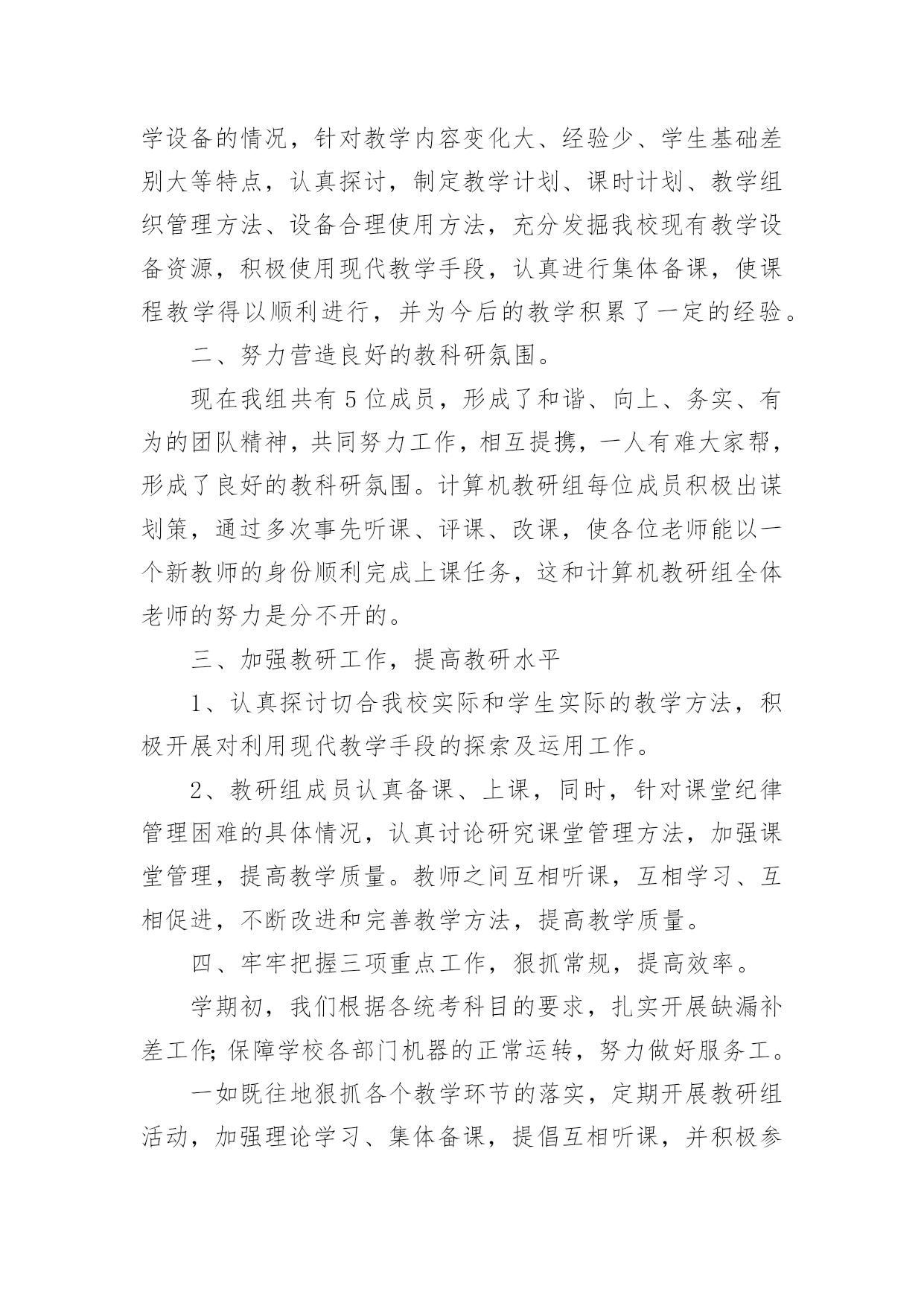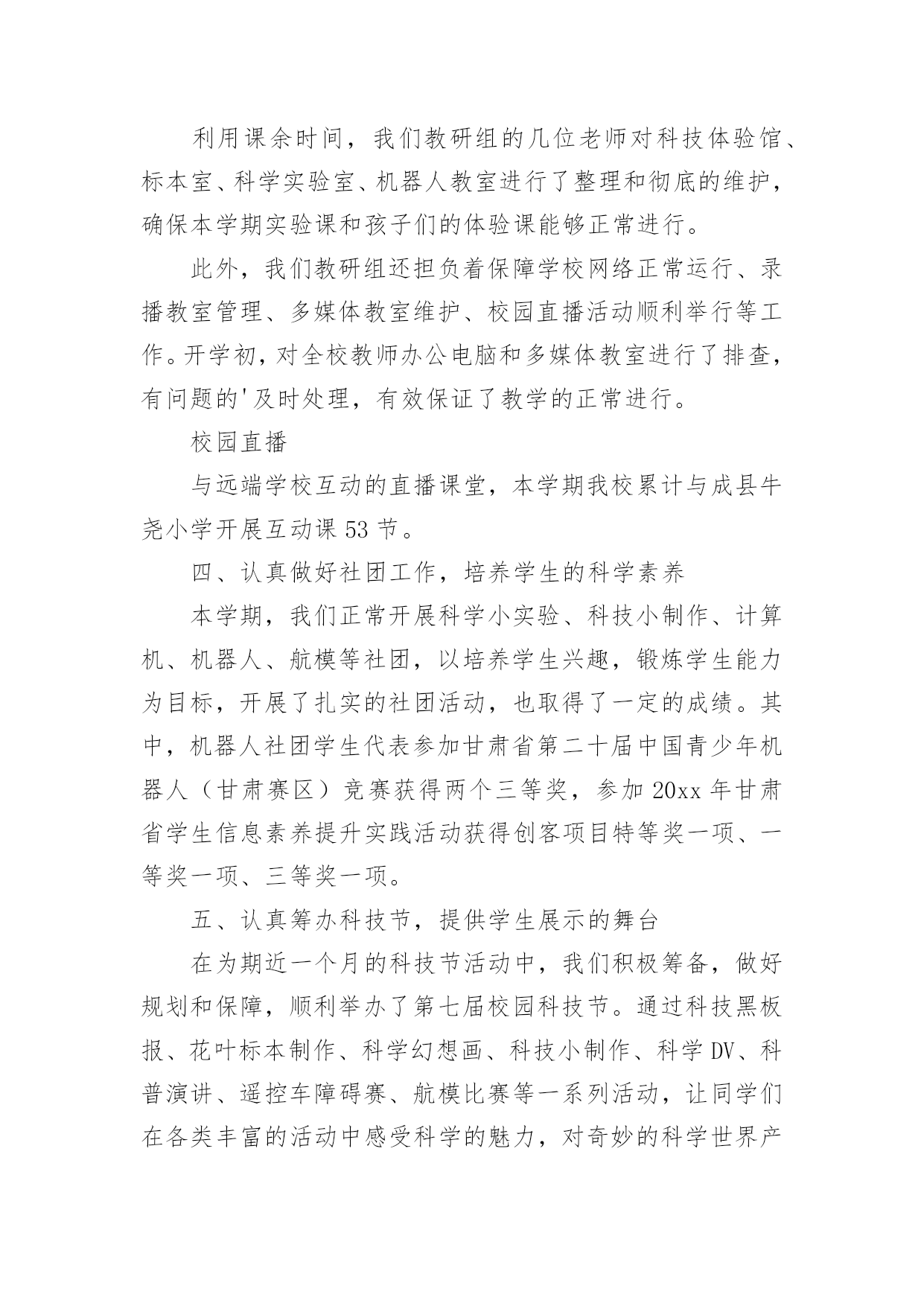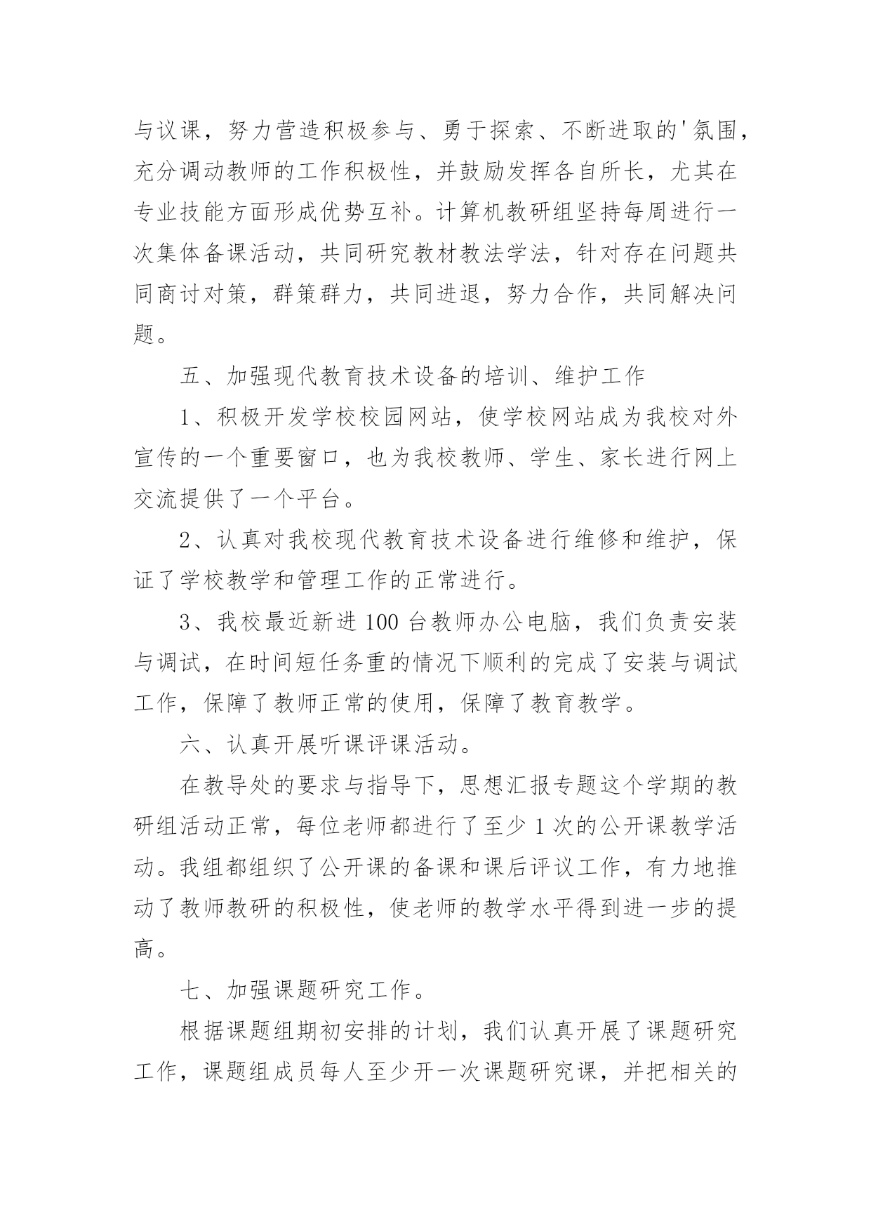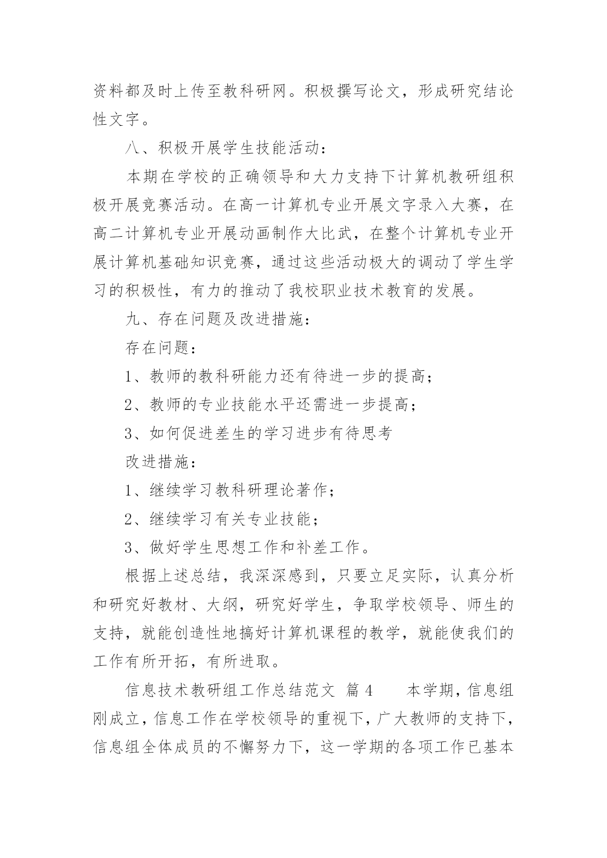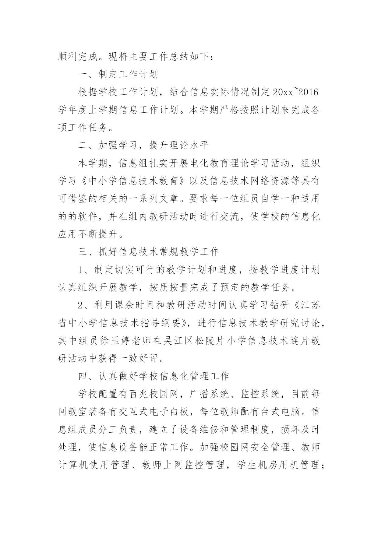 信息技术教研组工作总结信息技术教研组工作总结范文总结就是对一个时期的学习、工作或其完成情况进行一次全面系统的回顾和分析的书面材料,它是增长才干的一种好办法,因此我们要做好归纳,写好总结。总结怎么写才不会流于形式呢?以下是小编为大家收集的信息技术教研组工作总结范文,欢迎阅读与收藏。信息技术教研组工作总结范文篇1本学期南康中学信息技术教研组紧紧围绕学校新一学年工作目标与要求,在学科教学工作上始终坚持以教育教学为中心,主抓了教学常规的落实与课堂教学质量的提升,更新教育理念,创设特色校本课程,培养特色人才。在学校新领导班子的正确领导和关心支持下,经过全组教师的共同努力,各方面都取得了较好的成绩和良好的反响,现将本学期的工作总结如下:助力信息化建设,强化师资队伍南康中学党委书记、副校长黄巾多次讲到要大力提高学校的教育信息化水平,推动信息技术与教育教学的深度融合,切实加快教育信息化进程,以教育信息化支撑和引领教育现代化,全面提升教师的信息化教学能力。全面提高教师的教学水平,提升学校教学质量,使教学模式多元化发展,为学校的高质量发展提供强有力保障。为响应黄校长的号召,全组教师在各自承担的岗位工作上认真钻研,助力学校教育信息建设。周艳云老师在开学初对新入职、新调入的教师进行赣教云教学通应用培训,用最短的时间促使教师熟练掌握和使用多媒体教学平台和教学设备。信息技术教师与专职电教老师一起加强对现代教育技术应用问题的研究,对各学科教师在使用多媒体技术辅助教学和信息化应用平台(如网上阅卷系统平台等)、设备中出现的各种问题进行深入的探讨,凝聚各方智慧,寻找解决办法,有力保障各教学设备和应用平台的通畅运行,提高各教学设备和信息化应用系统运行效率。落实教学常规,提升课堂品质本学期我组在学科教学工作上始终坚持以教育教学为中心,科学合理制订学期教学计划和教学进度,按时按要求备课,做到课课有教案。在全校大兴教研之风的浓郁氛围之下,全组教师本着“真教研、实教研”的要求,定主题,定发言人,把每周的教研活动落实在一场场研究教学、研究教材、研究课堂、研究学生的研讨活动之中。凝聚集体智慧,强化集体备课为提高课堂效率,促进教师的“教”与学生的“学”,教研组继续强化了集体备课。一、加强对教材结构分析,将“备教材”、“备学生”、“用学生的眼光看教材”三者结合起来,充分体现学生主体。二、变革课堂教学结构,创新教学方法,将“讲清重点”、“启发思维”、“教给方法”三者结合起来,以充分体现教师主导。三、从学生的认知结构方面,将“以听为主、以练为主、师生互动、多种媒体合作”四者结合起来,充分体现有效学习。四、按教学反馈要求的形式,将“顺序布置”、“精选布置”、“分层要求”三者结合起来,作业布置既体现实事求是、减轻学生负担的要求,又能优化教学评价,切实提高学科教学质量。挖掘学生潜力,提升竞赛能力本学期教研组优化了特长生辅导教学思路,对电脑制作兴趣小组、信息学奥赛小组等学科竞赛辅导活动从辅导计划的.制定、落实执行、辅导效果等进行了全程跟踪与督促,保证了各项辅导活动的教学辅导质量。(1)组织学生参加了本年度由中国计算机学会主办的全国青少年信息学竞赛(江西赛区),共获全国一等奖2人次,全国二等奖1人次,全国三等奖3人次。(2)组织学生参加了本年度江西省中小学电脑制作技能提升活动,获省二等奖1人次。更新教育理念,提升课研能力针对最近新一轮高中课程教学改革,在总结前面课程教学经验的基础上,开学初教研组组织了本组全体老师深入学习《普通高中信息技术课程标准(20xx版)》,以求尽快适应新一轮高中课程教学改革的要求。高一信息技术备课组在叶枝伟老师的主持下,按课题实施方案与计划,继续开展省级立项课题《基于开源软件的高中信息技术课程教学评价系统的设计与实践研究》的研究工作,并顺利通过省电教馆的课题结题鉴定。回首过去,展望新年,相信在学校的高度重视和正确领导下,在全体师生的共同努力下,信息技术教研组将取得新的辉煌!信息技术教研组工作总结范文篇2时光荏苒,白驹过隙。一学期匆匆结束,我们科学信息组全体成员在学校领导的正确领导下,全体组员团结合作,在完成规定的科学和信息技术的教学工作外,还有效完成了相关的学校工作。现就将本学期科学信息教研组的学习、教学工作简单总结如下:一、认真做好学期计划,确保各项工作有序可依为了使本学期的教学工作有计划、有目的地进行,在学期初,我们教研组成员一起学习了教研组工作计划和学校的工作计划,明确本学期要落实的教学要求及开展的教研活动的基本情况。学习新课程标准,共同探讨新教法,尤其是科学课的教法。科组成员深入钻研教材,明确各单元的计划及须开展的活动的情况,使这学期的教学工作有计划、有秩序地开展。二、认真做好常规教学活动,努力提高学生素质在学习了活动计划及教学计划后,我们在按计划进行各种教