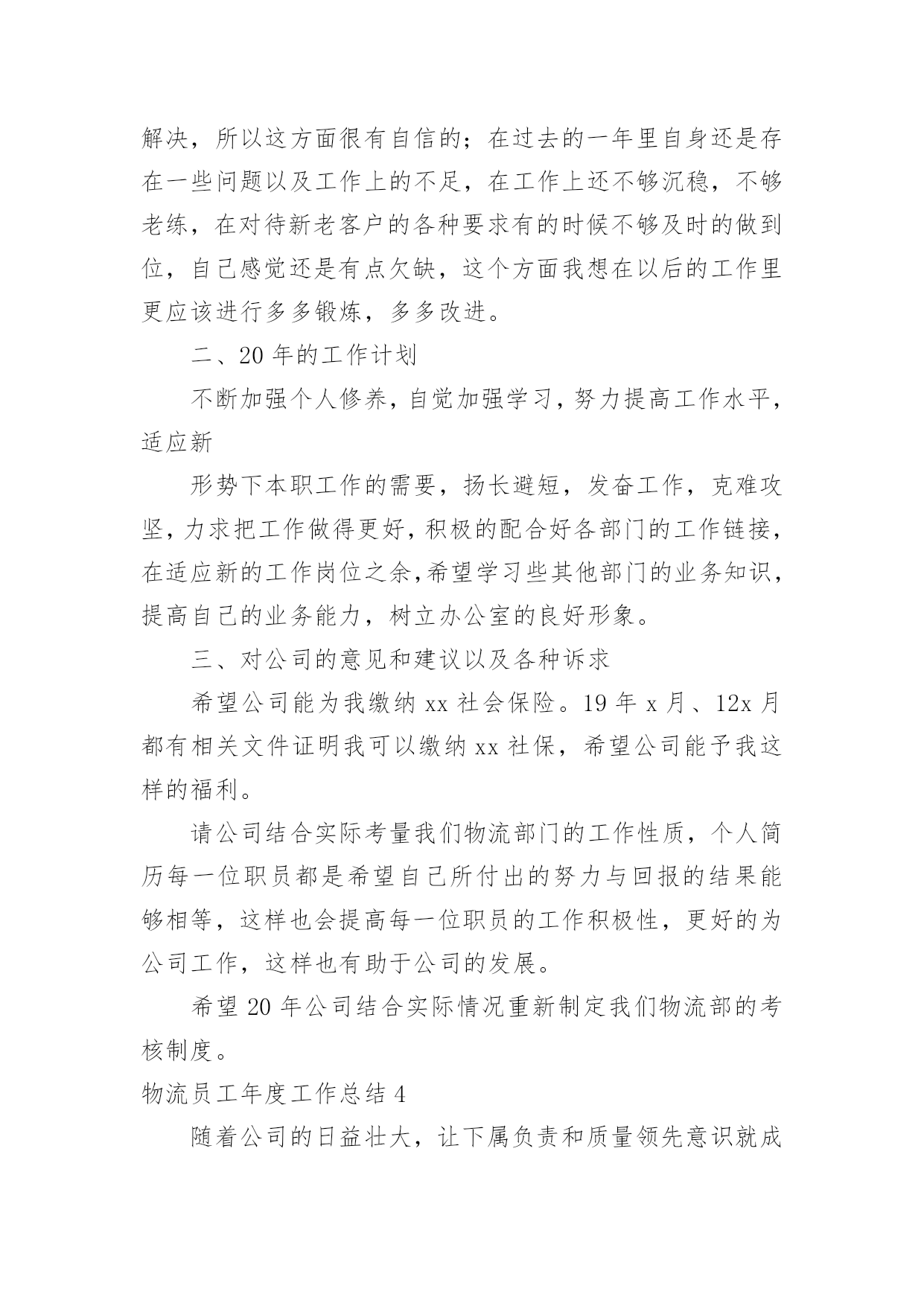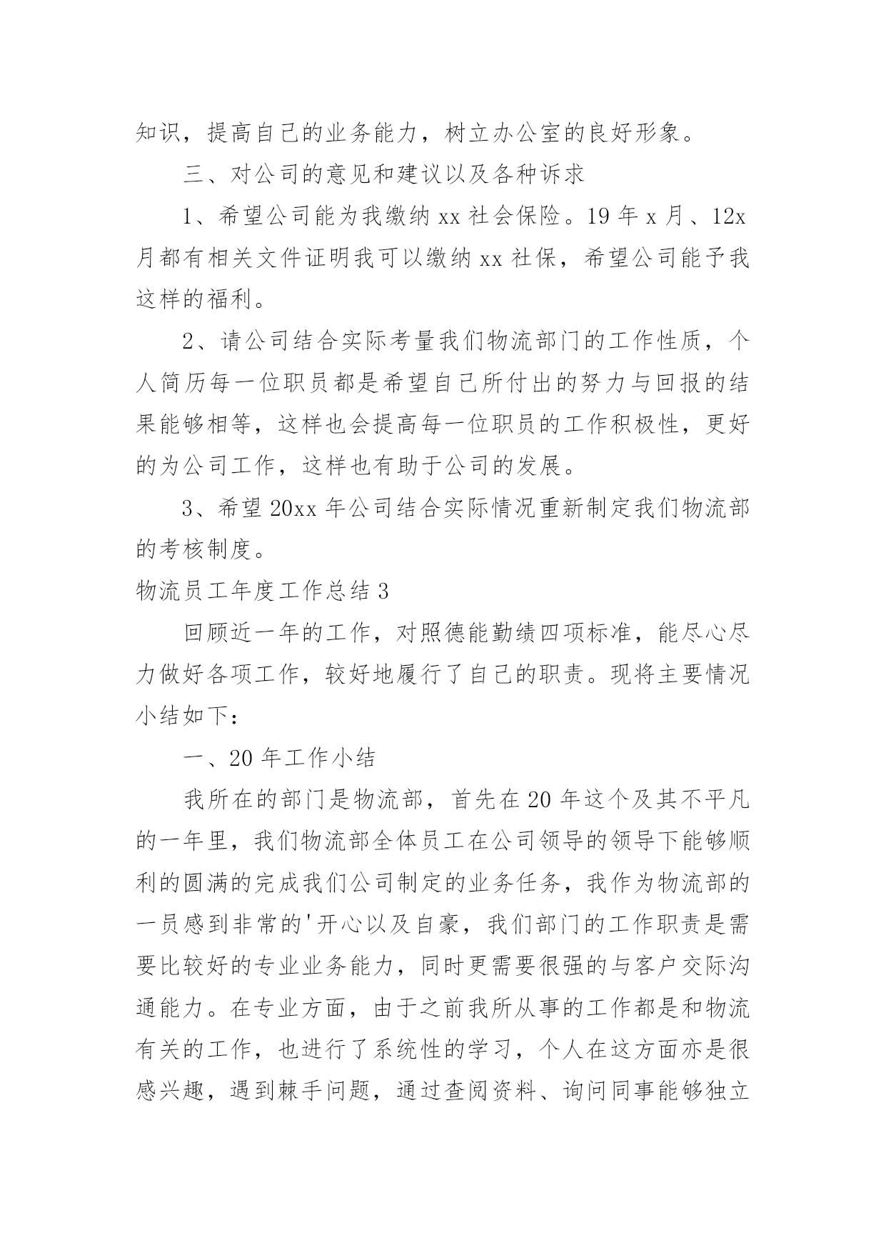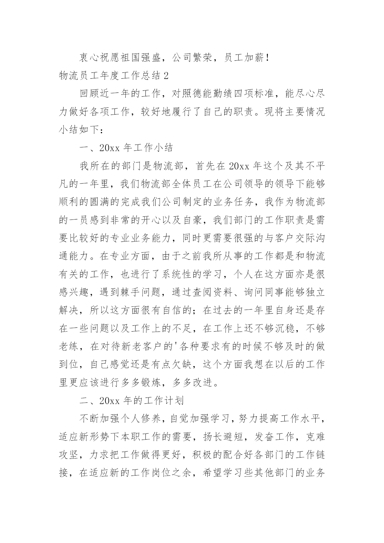 物流员工年度工作总结物流员工年度工作总结7篇总结就是把一个时间段取得的成绩、存在的问题及得到的经验和教训进行一次全面系统的总结的书面材料,它可以有效锻炼我们的语言组织能力,不如我们来制定一份总结吧。那么你真的懂得怎么写总结吗?下面是小编收集整理的物流员工年度工作总结,希望能够帮助到大家。物流员工年度工作总结1转眼间,踏上工作岗位已经年,而进入日陆这个大家庭也已是第七个年头,范文写作我从当年的毛头小伙,不谙世事到如今的成熟老练,工作驾轻就熟,都离不开社会这所最好的大学,以及职场这间最好的课堂。同时也有幸见证了日陆在中国国内的快速成长,从年前的仅有两个人的代表处,发展到现如今拥有两家合资公司,经营有自己的仓库和车队,员工人数几何级的增长,并且第三家独资公司又即将启动,这一切无不体现着中国这片沃土所带来的生机和活力,也验证了日陆在中国的远见卓识以及正确的发展战略。相信每个人都在过去的一年中都学到了,成长了,感悟了,当然其中也包括我。在20年的工作中,如同往年一样,我继续带领罐箱操作部门为国内外客户做好服务,以我们优质热诚的服务赢得了客户的赞誉,更是在经济危机如此困难的前提下圆满完成了部门指标,为公司创造了可观的效益。本部门的员工也飞速成长,经过进、出口的轮岗和悉心教导,都能够独挡一面,个人能力突飞猛进,能够很好的完成分配的任务。20年初开始,x总要求我不能仅仅满足于领导好罐箱部门的操作,TOP100范文排行同时要抽出身来做好罐箱的营业,积极开拓市场和客户,发展新的业务。于是,在平时纷繁复杂的日常操作管理中,我又分身出来开拓市场,虽然时间有限,但值得骄傲的是,为公司开拓来了如xx、xx、xx、xx、xx、xx物流等客户,还有如xx这样的极其优质的,能为公司带来可观收入的长期物流项目。与此同时,x总又委以重任,作为日陆北方和日陆外联发共同的营业企划部的负责人,将公司的仓储、运输、罐箱销售统一协调管理,以便为客户提供全方位的物流服务。此举收效也相当好,很快就有罐箱的客户也用到了我司的仓储,而仓库的客户也有罐箱的需求,真正的将公司的资源有效结合,一致对外了。随着元旦钟声的敲响,我们步入了崭新的一年,在新的一年里,我的个人职业规划是:继续总结前期的.销售工作,不懈跟紧潜在的大客户,争取到更多分量十足,如同xx一样的优质客户;尽早培养出新的罐箱部门的领导,对其高标准,严要求,使其能够顺利接替我的职位,继续领导该部门稳定成长;当然,我还是会继续帮助并做好监督支持工作,不可能彻底放手不管:抽出时间,多多结识拜访船公司和专业危险品运输公司,做好公关工作,争取主要航线的较好危险品海运运价和陆运运价,为将来更好的报价做准备;协助新任的综合营业部x部长,不仅将罐箱的营业做上去,也将其他的业务如运输、仓储、货代做上去,开拓一定的业务量;在20年将剩余的在职硕士研究生课程结束,并完成论文答辩,顺利拿到学位证。工资得到大幅提升:在新的一年中,希望公司能继续发扬自己好的传统,在原有的基础上更上一层楼,在此提出一些个人建议,有则改之,无则加勉:加强对公司员工的培训,无论是车队司机、调度、各部门的操作,还是营业部人员,可适当聘请外来专家进行培训,同时公司也可组织内部培训,这样可以提高全体员工的素质,等于是间接提升了公司的竞争力;梳理清晰公司的层级和架构,使各个职位的员工清楚知道各自的职责和权限,在这个前提下,可以鼓励员工多替公司分担一些份外的工作;多使用萝卜,而不是大棒,员工需要的是恰当的激励机制;适当拨给各部门一点公关基金,允许各个部门间互相联谊,增进部门及同事间的感情,融洽关系,方便日常工作和沟通。虽然在过去的20年,我们经历了无情的天灾和残酷的金融海啸,目睹了生离死别和倾家荡产,但我们又被灾难中亲情的崇高、子弟兵的伟大,全国人民的上下一心,以及十月气壮山河的国庆阅兵所感动。衷心祝愿祖国强盛,公司繁荣,员工加薪!物流员工年度工作总结2回顾近一年的工作,对照德能勤绩四项标准,能尽心尽力做好各项工作,较好地履行了自己的职责。现将主要情况小结如下:一、20xx年工作小结我所在的部门是物流部,首先在20xx年这个及其不平凡的一年里,我们物流部全体员工在公司领导的领导下能够顺利的圆满的完成我们公司制定的业务任务,我作为物流部的一员感到非常的开心以及自豪,我们部门的工作职责是需要比较好的专业业务能力,同时更需要很强的与客户交际沟通能力。在专业方面,由于之前我所从事的工作都是和物流有关的工作,也进行了系统性的学习,个人在这方面亦是很感兴趣,遇到棘手问题,通过查阅资料、询问同事能够独立解决,所以这方面很有自信的;在过去的一年里自身还是存在一些问题以及工作上的不足,在工作上还不够沉稳,不够老练,在对待新老客户的'各种要求有的时候不够及时的做到位,自己感觉还是有点欠缺,这个方面我