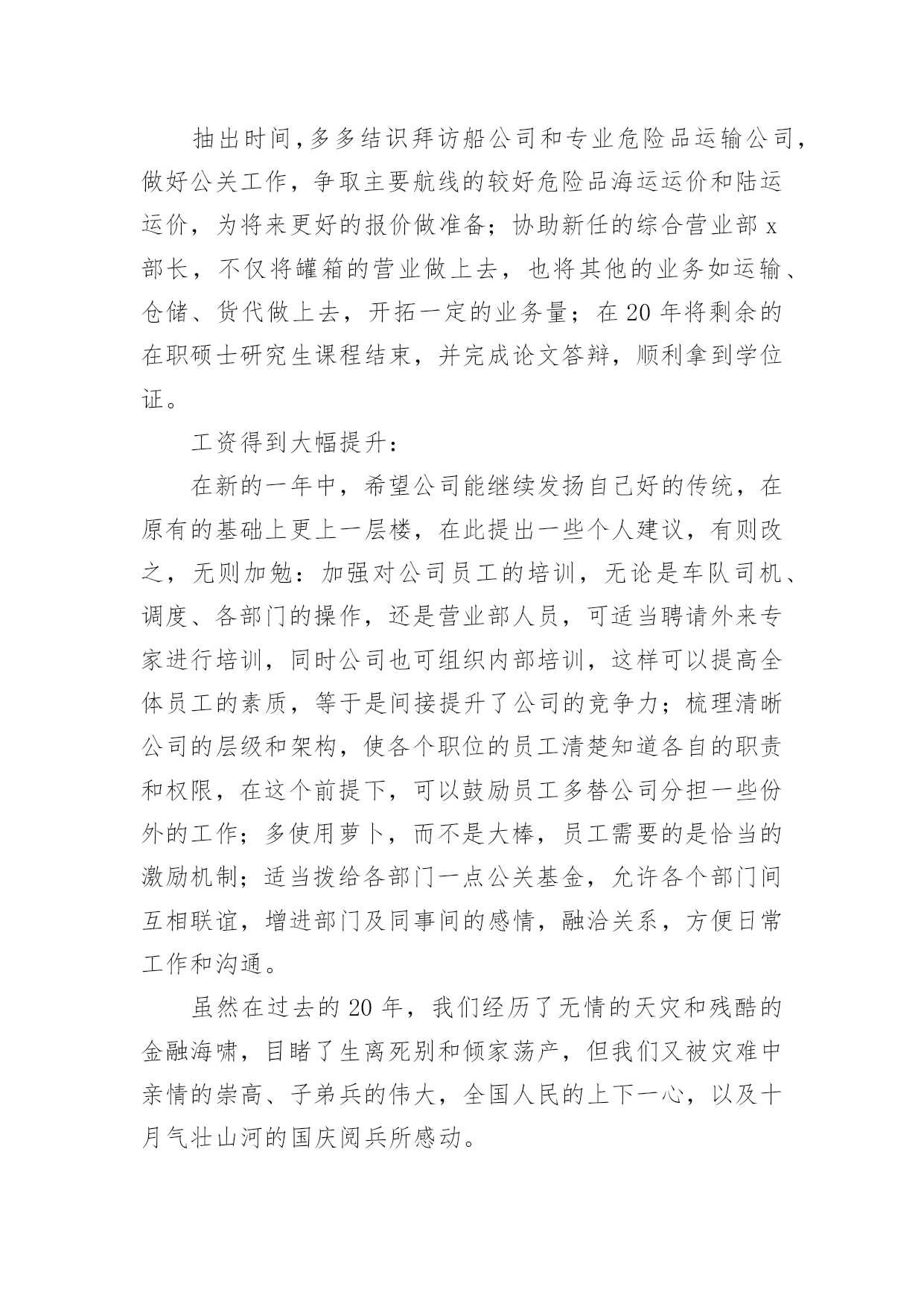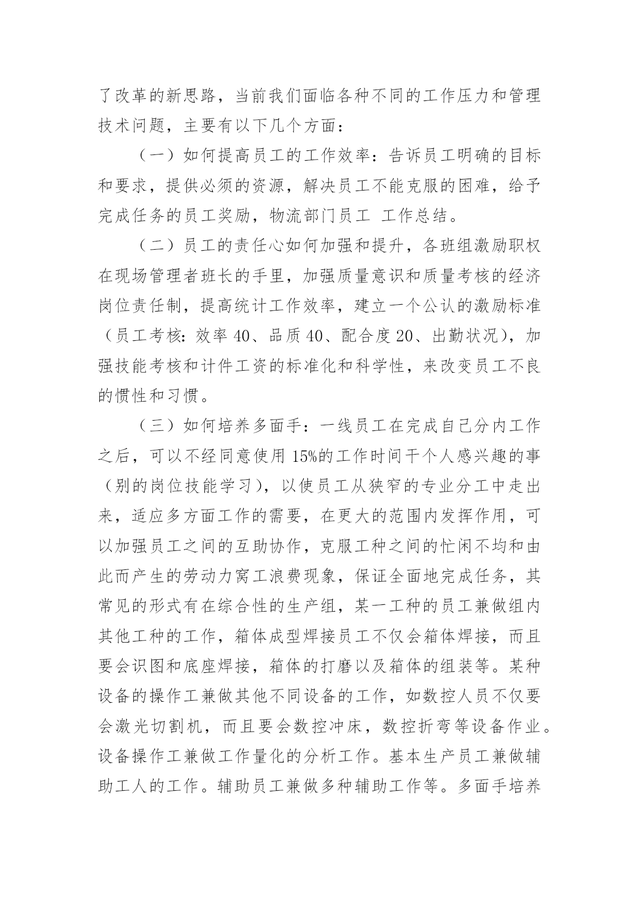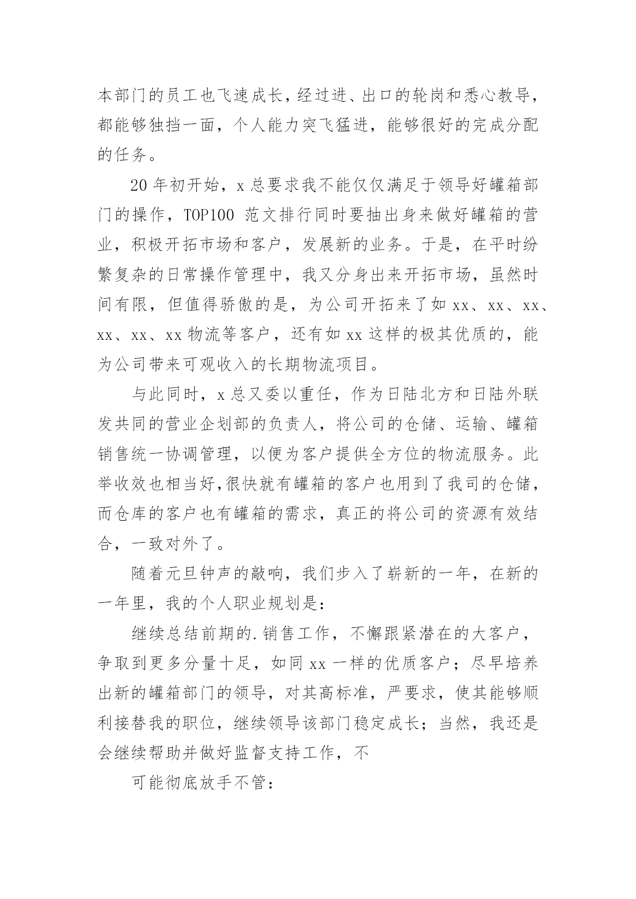 物流员工年度工作总结物流员工年度工作总结7篇总结就是把一个时间段取得的成绩、存在的问题及得到的经验和教训进行一次全面系统的总结的书面材料,它可以有效锻炼我们的语言组织能力,不如我们来制定一份总结吧。那么你真的懂得怎么写总结吗?下面是小编收集整理的物流员工年度工作总结,希望能够帮助到大家。物流员工年度工作总结1转眼间,踏上工作岗位已经年,而进入日陆这个大家庭也已是第七个年头,范文写作我从当年的毛头小伙,不谙世事到如今的成熟老练,工作驾轻就熟,都离不开社会这所最好的大学,以及职场这间最好的课堂。同时也有幸见证了日陆在中国国内的快速成长,从年前的仅有两个人的代表处,发展到现如今拥有两家合资公司,经营有自己的仓库和车队,员工人数几何级的增长,并且第三家独资公司又即将启动,这一切无不体现着中国这片沃土所带来的生机和活力,也验证了日陆在中国的远见卓识以及正确的发展战略。相信每个人都在过去的一年中都学到了,成长了,感悟了,当然其中也包括我。在20年的工作中,如同往年一样,我继续带领罐箱操作部门为国内外客户做好服务,以我们优质热诚的服务赢得了客户的赞誉,更是在经济危机如此困难的前提下圆满完成了部门指标,为公司创造了可观的效益。本部门的员工也飞速成长,经过进、出口的轮岗和悉心教导,都能够独挡一面,个人能力突飞猛进,能够很好的完成分配的任务。20年初开始,x总要求我不能仅仅满足于领导好罐箱部门的操作,TOP100范文排行同时要抽出身来做好罐箱的营业,积极开拓市场和客户,发展新的业务。于是,在平时纷繁复杂的日常操作管理中,我又分身出来开拓市场,虽然时间有限,但值得骄傲的是,为公司开拓来了如xx、xx、xx、xx、xx、xx物流等客户,还有如xx这样的极其优质的,能为公司带来可观收入的长期物流项目。与此同时,x总又委以重任,作为日陆北方和日陆外联发共同的营业企划部的负责人,将公司的仓储、运输、罐箱销售统一协调管理,以便为客户提供全方位的物流服务。此举收效也相当好,很快就有罐箱的客户也用到了我司的仓储,而仓库的客户也有罐箱的需求,真正的将公司的资源有效结合,一致对外了。随着元旦钟声的敲响,我们步入了崭新的一年,在新的一年里,我的个人职业规划是:继续总结前期的.销售工作,不懈跟紧潜在的大客户,争取到更多分量十足,如同xx一样的优质客户;尽早培养出新的罐箱部门的领导,对其高标准,严要求,使其能够顺利接替我的职位,继续领导该部门稳定成长;当然,我还是会继续帮助并做好监督支持工作,不可能彻底放手不管:抽出时间,多多结识拜访船公司和专业危险品运输公司,做好公关工作,争取主要航线的较好危险品海运运价和陆运运价,为将来更好的报价做准备;协助新任的综合营业部x部长,不仅将罐箱的营业做上去,也将其他的业务如运输、仓储、货代做上去,开拓一定的业务量;在20年将剩余的在职硕士研究生课程结束,并完成论文答辩,顺利拿到学位证。工资得到大幅提升:在新的一年中,希望公司能继续发扬自己好的传统,在原有的基础上更上一层楼,在此提出一些个人建议,有则改之,无则加勉:加强对公司员工的培训,无论是车队司机、调度、各部门的操作,还是营业部人员,可适当聘请外来专家进行培训,同时公司也可组织内部培训,这样可以提高全体员工的素质,等于是间接提升了公司的竞争力;梳理清晰公司的层级和架构,使各个职位的员工清楚知道各自的职责和权限,在这个前提下,可以鼓励员工多替公司分担一些份外的工作;多使用萝卜,而不是大棒,员工需要的是恰当的激励机制;适当拨给各部门一点公关基金,允许各个部门间互相联谊,增进部门及同事间的感情,融洽关系,方便日常工作和沟通。虽然在过去的20年,我们经历了无情的天灾和残酷的金融海啸,目睹了生离死别和倾家荡产,但我们又被灾难中亲情的崇高、子弟兵的伟大,全国人民的上下一心,以及十月气壮山河的国庆阅兵所感动。衷心祝愿祖国强盛,公司繁荣,员工加薪!物流员工年度工作总结2回顾近一年的工作,对照德能勤绩四项标准,能尽心尽力做好各项工作,较好地履行了自己的职责。现将主要情况小结如下:一、20xx年工作小结我所在的部门是物流部,首先在20xx年这个及其不平凡的一年里,我们物流部全体员工在公司领导的领导下能够顺利的圆满的完成我们公司制定的业务任务,我作为物流部的一员感到非常的开心以及自豪,我们部门的工作职责是需要比较好的专业业务能力,同时更需要很强的与客户交际沟通能力。在专业方面,由于之前我所从事的工作都是和物流有关的工作,也进行了系统性的学习,个人在这方面亦是很感兴趣,遇到棘手问题,通过查阅资料、询问同事能够独立解决,所以这方面很有自信的;在过去的一年里自身还是存在一些问题以及工作上的不足,在工作上还不够沉稳,不够老练,在对待新老客户的'各种要求有的时候不够及时的做到位,自己感觉还是有点欠缺,这个方面我