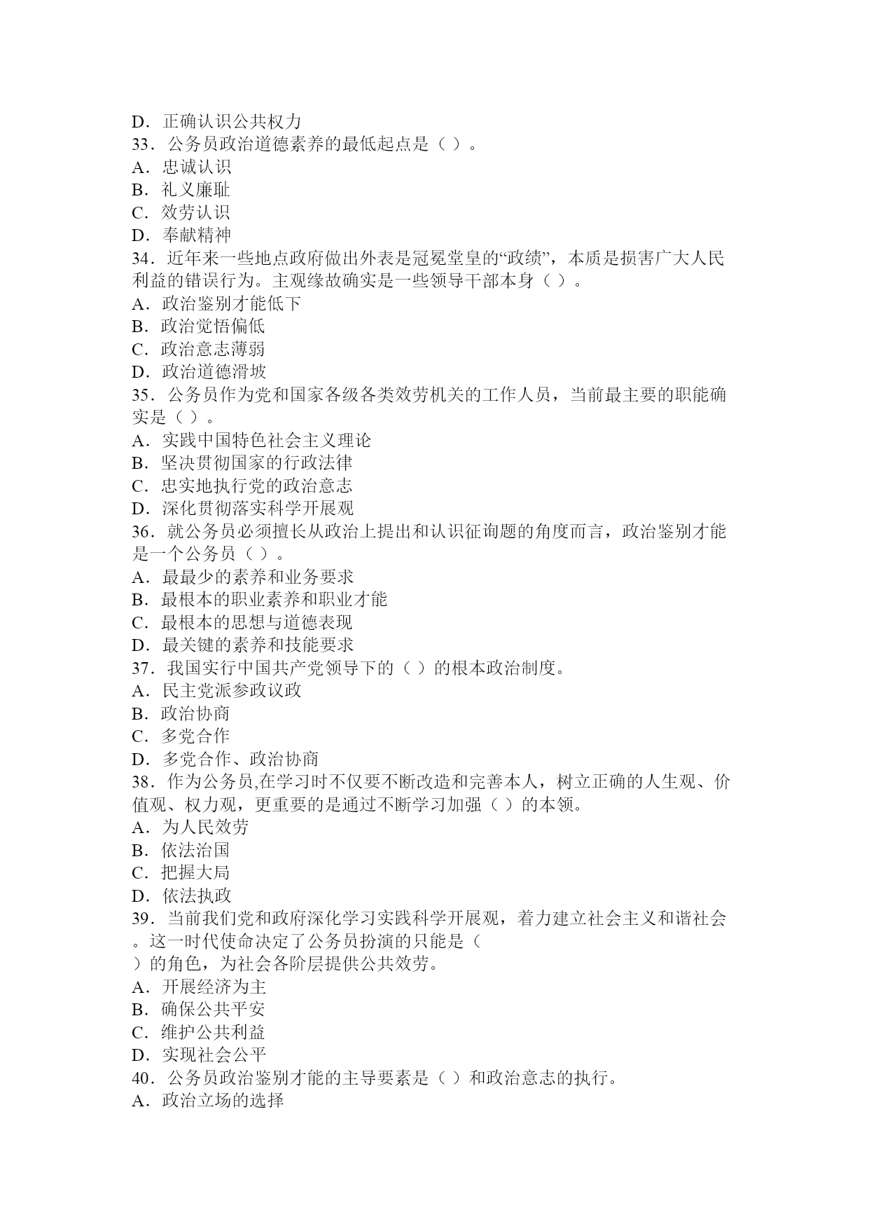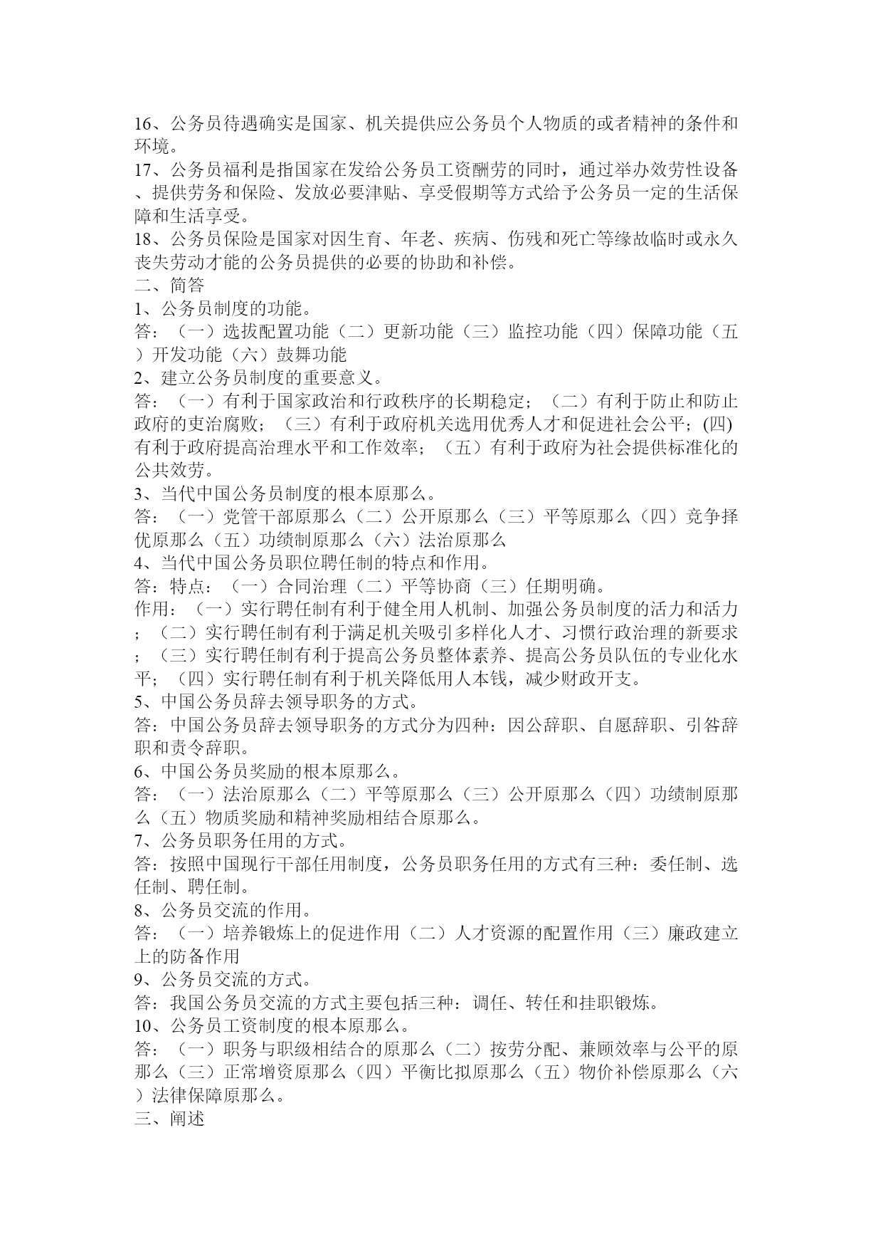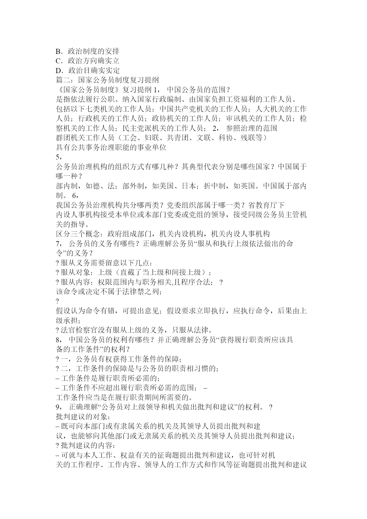 公务员制度复习提纲及答案篇一:公务员完好复习题答案通用才能试题(单项选择题)一、政治鉴别才能1.鉴别才能是一种具备()的观察力。A.高度觉悟B.敏锐特质C.专业知识D.方法技巧2.当前公务员提高本身政治认识水平的最根本途径是()。A.认真学习中国特色社会主义理论,做一个学习型公务员B.认真学习国外的公务员制度,做一个面向世界的公务员C.认真学习社会、历史知识,做一个博学广见的公务员D.认真学习马克思主义理论,做一个马克思主义者3.一些公务员之因此渎职、渎职、滥用职权、贪污腐败,其内在缘故确实是缺乏()A.较高文化水准B.应具业务才能C.公共道德素养D.政治鉴别才能4.我国政权组织方式是()。A.人民代表大会B.民主集中制C.政治协商制度D.人民代表大会制5.政治鉴别才能是确保公务员()的根本。A.质量上过硬B.业务上通晓C.政治上合格D.作风上优良6.公务员在工作中决策时擅长明辨是非、当机立断、及时合理地做出决定并坚决执行的意志质量是()A.坚韧性B.自觉性C.果断性D.自制力7.我们党在一些严峻的历史转机关头,总是十分注重加强干部学习,及时用()武装党员干部,统一全党的认识,才能获得革命和建立的一个又一个的成功。A.先进的理论B.革命的热情C.惨痛的教训D.丰富的经历8.目前衡量公务员政治意志执行才能的要素有()指标。A.7项B.5项C.6项D.4项9.公务员()是由政治道德天分、政治道德习惯和政治道德理性三个要素构成的。A.政治道德自觉B.政治道德理想C.政治道德人格D.政治道德信念10.一个公务员的政治道德天分,表达在其日常行为中坚守()的行为。A.有所不为B.为所欲为C.当为那么为D.有所作为11.政治鉴别才能在公务员通用才能体系中处于()地位。A.关键和支柱性B.核心和决定性C.根底和起点性D.支撑和保障性12.在我们国家,()是政治活动的主体。A.国际组织B.社会组织C.群众组织D.政治组织13.公务员政治道德的提升是促进公务员将政治鉴别才能()为自觉道德认识的主要途径。A.教育B.外部强迫C.内化D.实践锻炼14.公务员业务等其他素养好,但()差,仍然难当重担。A.政治鉴别才能B.组织纪律性C.奉献精神D.全局认识15.公务员在遭受挫折、打击和失意时,仍然“心有所恃,情有所依”,主要是()起了决定性作用。A.性格B.意志C.认知D.信念16.江泽民同志所要求的领导干部的“自警、自省、自励、自重”即是()的主要内容。A.自我认识B.人格特质C.价值观D.理性认识17.目前衡量公务员政治立场选择才能的要素有()指标。A.5项B.8项C.6项D.7项18.我国人民代表大会制度的核心内容和本质是()。A.少数服从多数B.集体行使职权C.国家的一切权力属于人民D.平等原那么19.公务员在大是大非征询题不糊涂、方向征询题不动摇、原那么征询题不模糊的表现,说明他(她)擅长()。A.以职业习惯调查征询题B.从全局角度考虑征询题C.从政治上观察、分析、处理征询题D.从人民根本利益对待征询题20.在中国特色社会主义现代化建立事业中,公务员必须明白经济、明白科技,但首先是要()。A.明白关系B.明白历史C.明白政治D.明白网络21.我国实行中国共产党领导下的()的根本政治制度。A.民主党派参政议政B.多党合作C.多党合作、政治协商D.政治协商22.目前衡量公务员理论理解才能的要素有()指标。A.5项B.7项C.4项D.6项23.政治手段的核心是()。A.公共权力B.公共政策C.战略战术D.认识形态24.我国政治活动的主要内容是对()的维护和开展。A.全体人民的整体、根本利益B.国家和人民的整体、全局利益C.中国共产党、国家的利益D.中国共产党、国家和人民的整体、全局和长远的根本利益25.公务员的鉴别才能首先是由公务员具有的()表现出来。A.对错误言论的抑制才能B.改正不良行为的意志力C.正确的选项非观念D.深沉的专业知识26.当前公务员坚决本人的理想信念,源于()。A.对历史开展规律的深化理解B.对社会开展规律的深化认识C.对政治科学的真理的执着追求D.对人类社会开展趋向的认真研究27.公务员政治鉴别才能构成和强化的标志,是()的提高,表现为能清醒地推断政治情势,不人云亦云、随波逐流。A.政治敏锐性B.政治认识力C.政治免疫力D.政治观察力28.正确执行政策的才能属于公务员政治鉴别才能系统中的()要素。A.长期性与一贯性B.实践性与关键性C.理论性与实