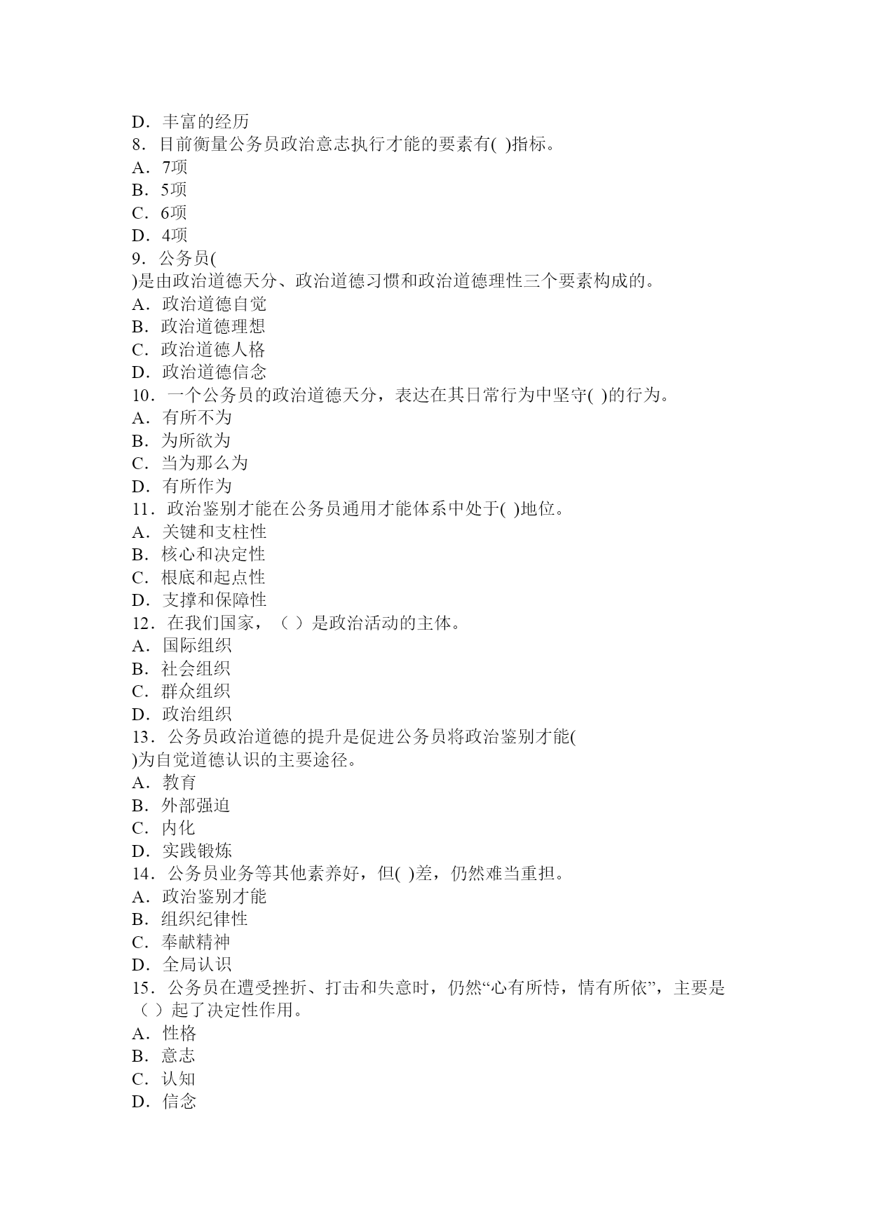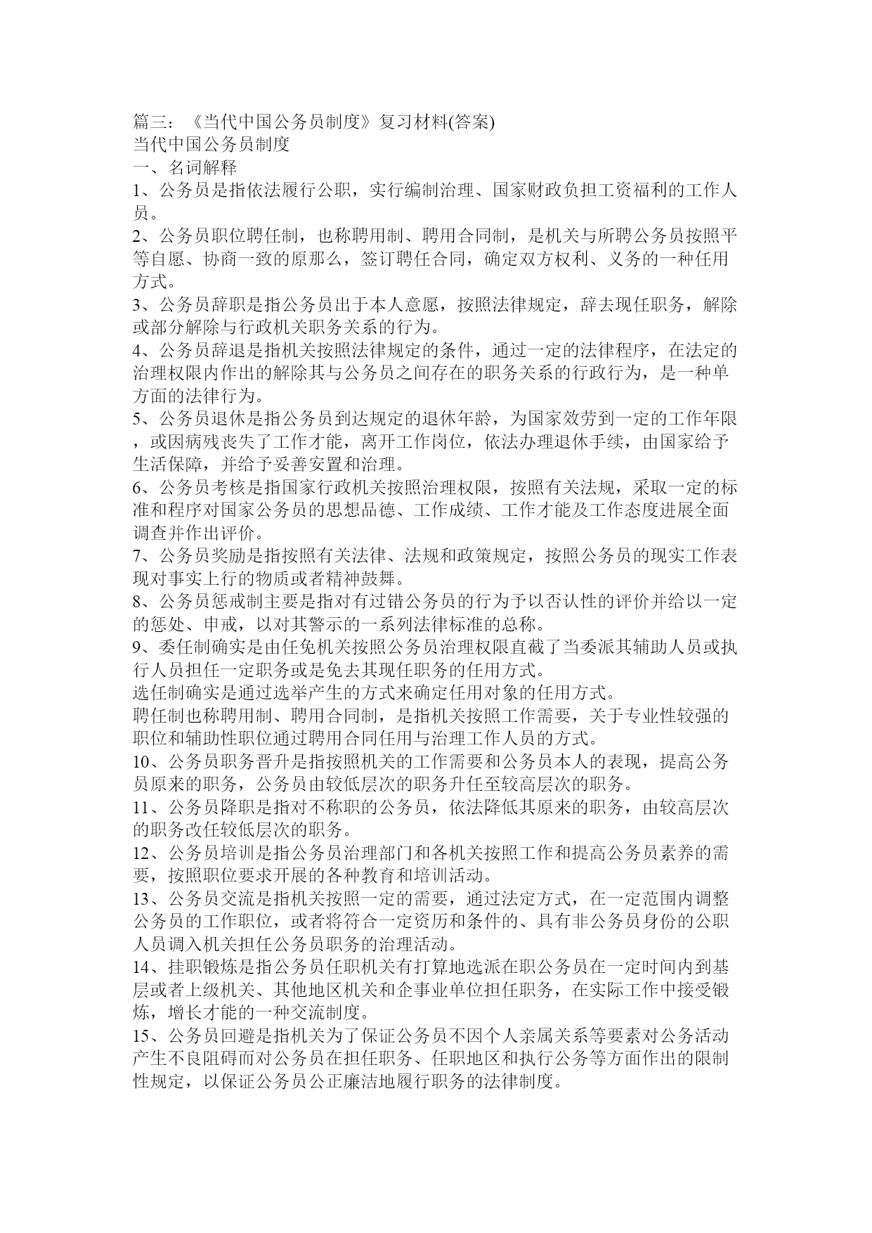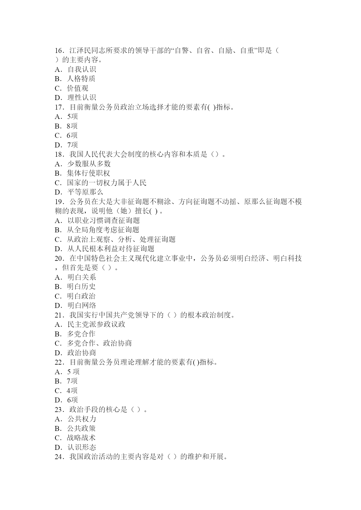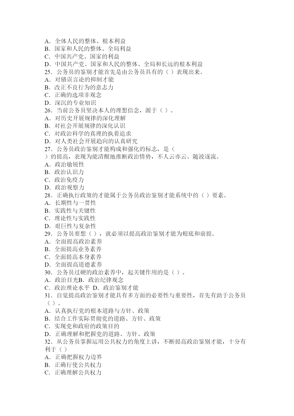 公务员制度复习提纲及答案篇一:公务员完好复习题答案通用才能试题(单项选择题)一、政治鉴别才能1.鉴别才能是一种具备()的观察力。A.高度觉悟B.敏锐特质C.专业知识D.方法技巧2.当前公务员提高本身政治认识水平的最根本途径是()。A.认真学习中国特色社会主义理论,做一个学习型公务员B.认真学习国外的公务员制度,做一个面向世界的公务员C.认真学习社会、历史知识,做一个博学广见的公务员D.认真学习马克思主义理论,做一个马克思主义者3.一些公务员之因此渎职、渎职、滥用职权、贪污腐败,其内在缘故确实是缺乏()A.较高文化水准B.应具业务才能C.公共道德素养D.政治鉴别才能4.我国政权组织方式是()。A.人民代表大会B.民主集中制C.政治协商制度D.人民代表大会制5.政治鉴别才能是确保公务员()的根本。A.质量上过硬B.业务上通晓C.政治上合格D.作风上优良6.公务员在工作中决策时擅长明辨是非、当机立断、及时合理地做出决定并坚决执行的意志质量是()A.坚韧性B.自觉性C.果断性D.自制力7.我们党在一些严峻的历史转机关头,总是十分注重加强干部学习,及时用()武装党员干部,统一全党的认识,才能获得革命和建立的一个又一个的成功。A.先进的理论B.革命的热情C.惨痛的教训D.丰富的经历8.目前衡量公务员政治意志执行才能的要素有()指标。A.7项B.5项C.6项D.4项9.公务员()是由政治道德天分、政治道德习惯和政治道德理性三个要素构成的。A.政治道德自觉B.政治道德理想C.政治道德人格D.政治道德信念10.一个公务员的政治道德天分,表达在其日常行为中坚守()的行为。A.有所不为B.为所欲为C.当为那么为D.有所作为11.政治鉴别才能在公务员通用才能体系中处于()地位。A.关键和支柱性B.核心和决定性C.根底和起点性D.支撑和保障性12.在我们国家,()是政治活动的主体。A.国际组织B.社会组织C.群众组织D.政治组织13.公务员政治道德的提升是促进公务员将政治鉴别才能()为自觉道德认识的主要途径。A.教育B.外部强迫C.内化D.实践锻炼14.公务员业务等其他素养好,但()差,仍然难当重担。A.政治鉴别才能B.组织纪律性C.奉献精神D.全局认识15.公务员在遭受挫折、打击和失意时,仍然“心有所恃,情有所依”,主要是()起了决定性作用。A.性格B.意志C.认知D.信念16.江泽民同志所要求的领导干部的“自警、自省、自励、自重”即是()的主要内容。A.自我认识B.人格特质C.价值观D.理性认识17.目前衡量公务员政治立场选择才能的要素有()指标。A.5项B.8项C.6项D.7项18.我国人民代表大会制度的核心内容和本质是()。A.少数服从多数B.集体行使职权C.国家的一切权力属于人民D.平等原那么19.公务员在大是大非征询题不糊涂、方向征询题不动摇、原那么征询题不模糊的表现,说明他(她)擅长()。A.以职业习惯调查征询题B.从全局角度考虑征询题C.从政治上观察、分析、处理征询题D.从人民根本利益对待征询题20.在中国特色社会主义现代化建立事业中,公务员必须明白经济、明白科技,但首先是要()。A.明白关系B.明白历史C.明白政治D.明白网络21.我国实行中国共产党领导下的()的根本政治制度。A.民主党派参政议政B.多党合作C.多党合作、政治协商D.政治协商22.目前衡量公务员理论理解才能的要素有()指标。A.5项B.7项C.4项D.6项23.政治手段的核心是()。A.公共权力B.公共政策C.战略战术D.认识形态24.我国政治活动的主要内容是对()的维护和开展。A.全体人民的整体、根本利益B.国家和人民的整体、全局利益C.中国共产党、国家的利益D.中国共产党、国家和人民的整体、全局和长远的根本利益25.公务员的鉴别才能首先是由公务员具有的()表现出来。A.对错误言论的抑制才能B.改正不良行为的意志力C.正确的选项非观念D.深沉的专业知识26.当前公务员坚决本人的理想信念,源于()。A.对历史开展规律的深化理解B.对社会开展规律的深化认识C.对政治科学的真理的执着追求D.对人类社会开展趋向的认真研究27.公务员政治鉴别才能构成和强化的标志,是()的提高,表现为能清醒地推断政治情势,不人云亦云、随波逐流。A.政治敏锐性B.政治认识力C.政治免疫力D.政治观察力28.正确执行政策的才能属于公务员政治鉴别才能系统中的()要素。A.长期性与一贯性B.实践性与关键性C.理论性与实