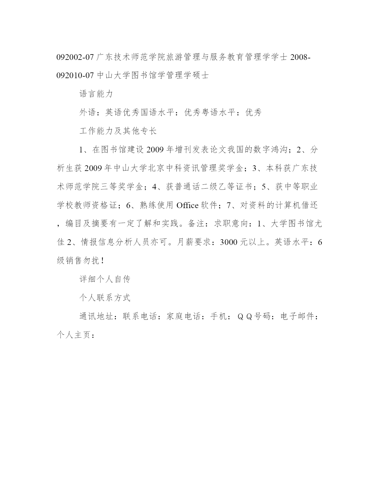 关于图书馆学简历范本图书馆学简历范文简历编号:更新日期:无照片姓名:国籍:中国目前所在地:越秀区民族:汉族户口所在地:广州身材:167cm70kg婚姻状况:未婚年龄:32培训认证:诚信徽章:求职意向及工作经历人才类型:应届毕业生应聘职位:行政/后勤:图书、档案、情报、信息、培训:职业技术教师、培训助理、工作年限:2职称:无职称求职类型:全职可到职日期:一个星期月薪要求:3500--5000希望工作地区:广州个人工作经历:公司名称:起止年月:2004-07~2005-07某知名大型保险公司公司性质:所属行业:担任职务:客户终端服务专员工作描述:离职原因:公司名称:起止年月:2001-10~2001-11广州旅游职业高级中学公司性质:所属行业:担任职务:英语教师兼班主任实习工作描述:离职原因:公司名称:起止年月:2001-07~2001-08广之旅国际旅行社公司性质:所属行业:担任职务:欧洲部、港澳部助理实习工作描述:离职原因:教育背景毕业院校:中山大学最高学历:硕士获得学位:管理学硕士毕业日期:2010-07-01所学专业一:图书馆学所学专业二:受教育培训经历:起始年月终止年月学校(机构)专业获得证书证书编号1998-092002-07广东技术师范学院旅游管理与服务教育管理学学士2008-092010-07中山大学图书馆学管理学硕士语言能力外语:英语优秀国语水平:优秀粤语水平:优秀工作能力及其他专长1、在图书馆建设2009年增刊发表论文我国的数字鸿沟;2、分析生获2009年中山大学北京中科资讯管理奖学金;3、本科获广东技术师范学院三等奖学金;4、获普通话二级乙等证书;5、获中等职业学校教师资格证;6、熟练使用Office软件;7、对资料的计算机借还,编目及摘要有一定了解和实践。备注:求职意向:1、大学图书馆尤佳2、情报信息分析人员亦可。月薪要求:3000元以上。英语水平:6级销售勿扰!详细个人自传个人联系方式通讯地址:联系电话:家庭电话:手机:QQ号码:电子邮件:个人主页: