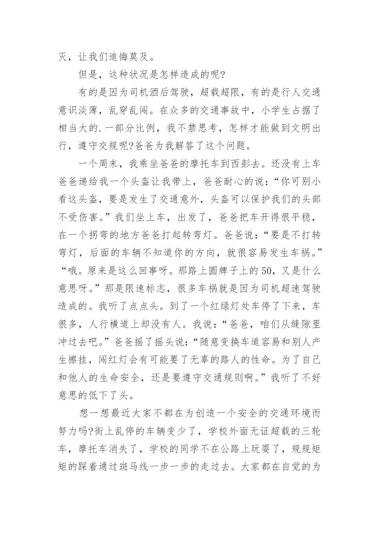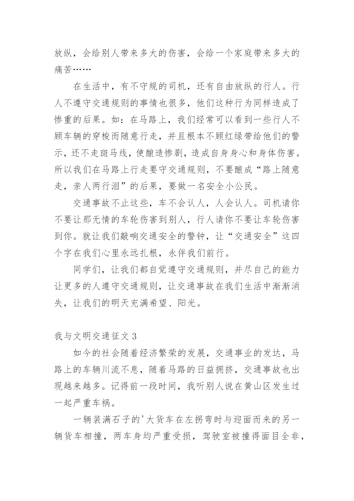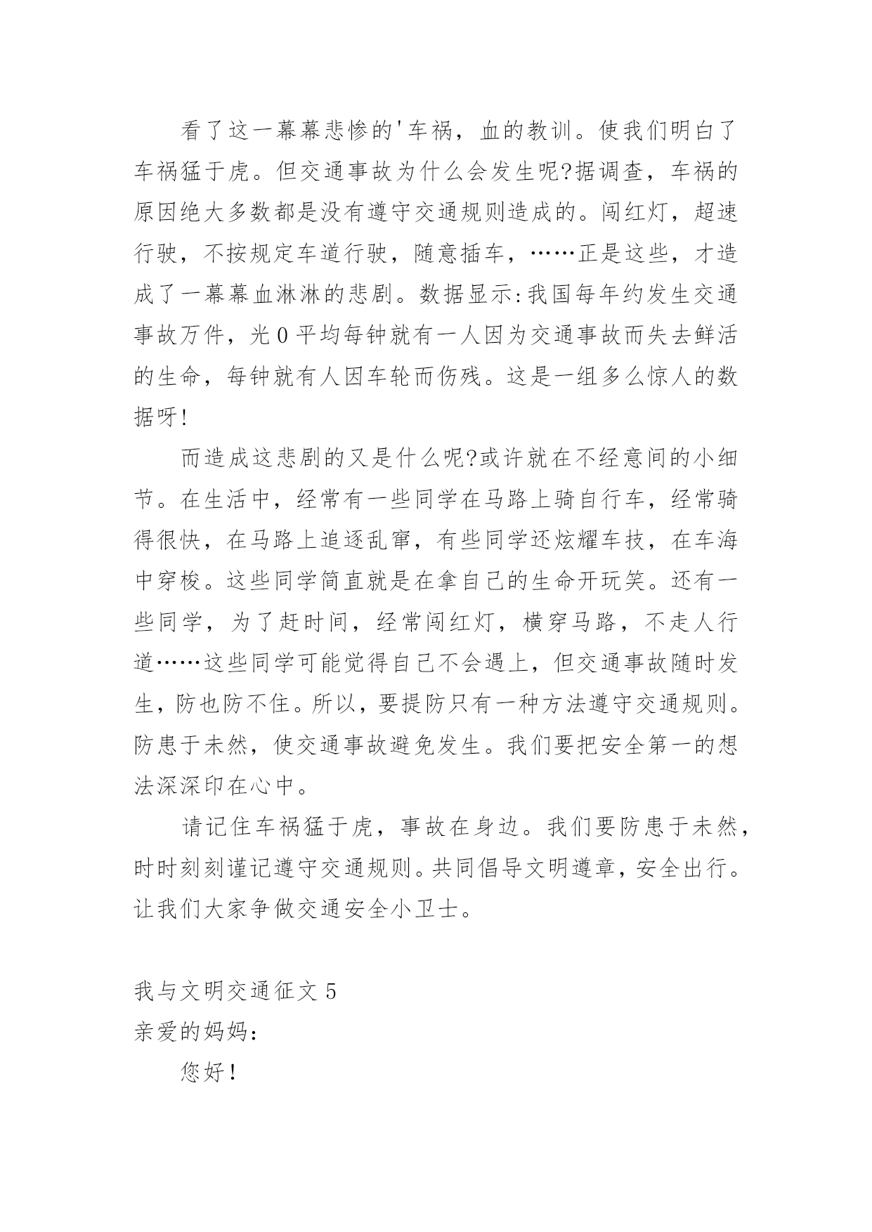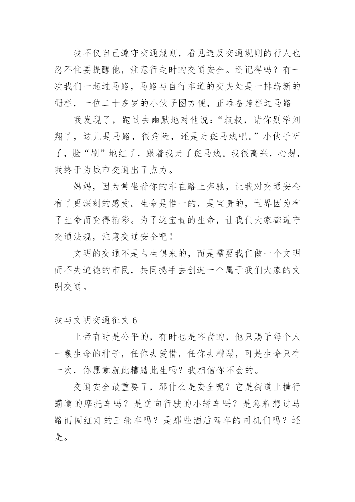 我与文明交通征文我与文明交通征文14篇在日常生活或是工作学习中,大家都跟征文打过交道吧,借助征文可以提高我们的语言组织能力。相信很多朋友都对写征文感到非常苦恼吧,以下是小编帮大家整理的我与文明交通征文,欢迎大家分享。我与文明交通征文1很小的时候我们就会唱:“红灯停,绿灯行,······”那时侯就懵懂的识得了“交通”2字。随着科技的进步,社会的发展,交通状况也出现了翻天覆地的变化。四通八达的马路纵横在神州大地,川流不息的车辆南来北往,交通工具也越来越多,越来越快:轻轨,地铁,飞机······,联系着想去的各个地方,人们出行越来越方便,快捷。渐渐的,人们的命运也与交通不自觉地联系在一起,当我们出门时,在马路上生命是多么的脆弱,只要你不遵守交通规则,就随时有可能会被“亲吻”。汽车是奔跑的“马路凶器”多少人死于这样的马路杀手中。看看吧:每天的新闻,网络,报纸里几乎都能寻觅到交通事故的案例。轻则住院,重则死亡,一个个鲜活的生命从此烟消云散,多少温馨的家庭从此被孤寂冷清的哭泣代替。一瞬间,幸福如肥皂泡般破灭,让我们追悔莫及。但是,这种状况是怎样造成的呢?有的是因为司机酒后驾驶,超载超限,有的是行人交通意识淡薄,乱穿乱闯。在众多的交通事故中,小学生占据了相当大的.一部分比例,我不禁思考,怎样才能做到文明出行,遵守交规呢?爸爸为我解答了这个问题。一个周末,我乘坐爸爸的摩托车到西彭去。还没有上车爸爸递给我一个头盔让我带上,爸爸耐心的说:“你可别小看这头盔,要是发生了交通意外,头盔可以保护我们的头部不受伤害。”我们坐上车,出发了,爸爸把车开得很平稳,在一个拐弯的地方爸爸打起转弯灯。爸爸说:“要是不打转弯灯,后面的车辆不知道你的方向,就很容易发生车祸。”“哦。原来是这么回事呀。那路上圆牌子上的50,又是什么意思呀。”那是限速标志,很多车祸就是因为司机超速驾驶造成的。我听了点点头。到了一个红绿灯处车停了下来,车很多,人行横道上却没有人。我说:“爸爸,咱们从缝隙里冲过去吧。”爸爸摇了摇头说:“随意变换车道容易和别人产生擦挂,闯红灯会有可能要了无辜的路人的性命。为了自己和他人的生命安全,还是要遵守交通规则啊。”我听了不好意思的低下了头。想一想最近大家不都在为创造一个安全的交通环境而努力吗?街上乱停的车辆变少了,学校外面无证超载的三轮车,摩托车消失了,学校的同学不在公路上玩耍了,规规矩矩的踩着通过斑马线一步一步的走过去。大家都在自觉的为维护交通规则而做出自己应该做的事情啊。为了他人的安全,也为了自己的生命,更为了家人的幸福,让我们自觉闻名的遵守交规吧。只有这样生活中才会少一份牵挂,多一分欢笑。愿平安伴随终身,珍爱生命,让你我共同行动起来,文明交通伴随你我!我与文明交通征文2“过马路要走斑马线,红灯停,绿灯行。”一句最起码的交通安全知识相信大家都不陌生,已倒背如流了吧!人的生活中,处处离不开交通,同时也离不开安全,所以我们处处都要做一名遵纪守法的安全公民。如果你不遵守规则的话,交通事故就犹如一颗定时隐患,随时准备爆炸,炸开的话,你不但不会轻易躲过去,还会失去宝贵的生命。在日常生活中,许多司机不注意交通安全,而鲁莽行事,造成他人身心和身体伤害。记得前几天《说天下》栏目里说过,几位富家“公子哥”开上高级跑车在夜晚不顾他人生命安全,竟开始了一场刺激的游戏——疯狂飙车。当开向斑马线时,一名行人正慢慢走过,此时“咚”地一声,行人向根护栏杆似的飞向两三层楼高,并且在二十米以外的距离摔下,地下一片鲜红……一名不知情、无辜的受害者就这样丧失了生的权利。那位“公子哥”却继续“游戏”,当警察抓住他后,他却满脸漠然,无动于衷。看到这个悲惨的`场面,我心里先是一阵悲哀,然后又想:“公子哥”难道你们心中的生命只是一张纸?一片羽毛?一块石子吗?你们不知道一时的放纵,会给别人带来多大的伤害,会给一个家庭带来多大的痛苦……在生活中,有不守规的司机,还有自由放纵的行人。行人不遵守交通规则的事情也很多,他们这种行为同样造成了惨重的后果。如:在马路上,我们经常可以看到一些行人不顾车辆的穿梭而随意行走,并且根本不顾红绿带给他们的警示,还不走斑马线,使酿造惨剧,造成自身身心和身体伤害。所以我们在马路上行走要守交通规则,不要酿成“路上随意走,亲人两行泪”的后果,要做一名安全小公民。交通事故不止这些,车不会认人,人会认人。司机请你不要让那无情的车轮伤害到别人,行人请你不要让车轮伤害到你。就让我们敲响交通安全的警钟,让“交通安全”这四个字在我们心里永远扎根,永伴我们前行。同学们,让我们都自觉遵守交通规则,并尽自己的能力让更多的人遵守交通规则,让交通事故在我们生活中渐渐消失,让我们的明天充满希望、阳光。我与文明交通征文3如今的社会随着经济繁荣的发展,交通事业的发达,马路上的车辆川流不息,随着马路的日益拥