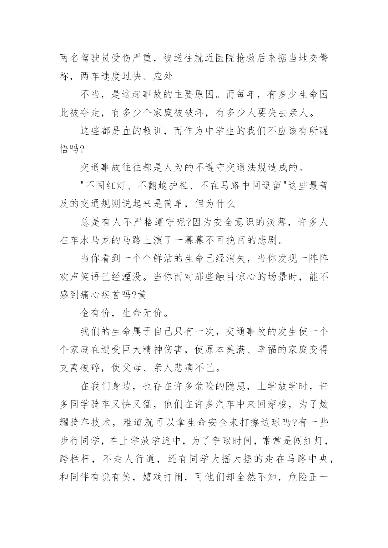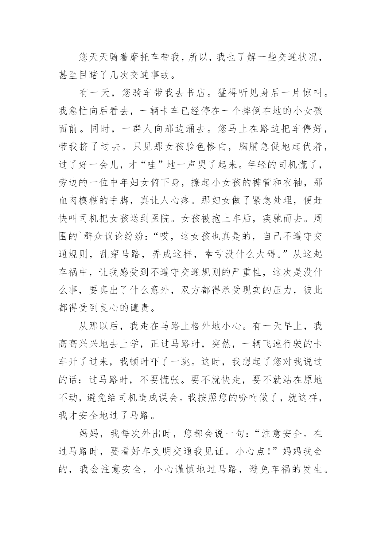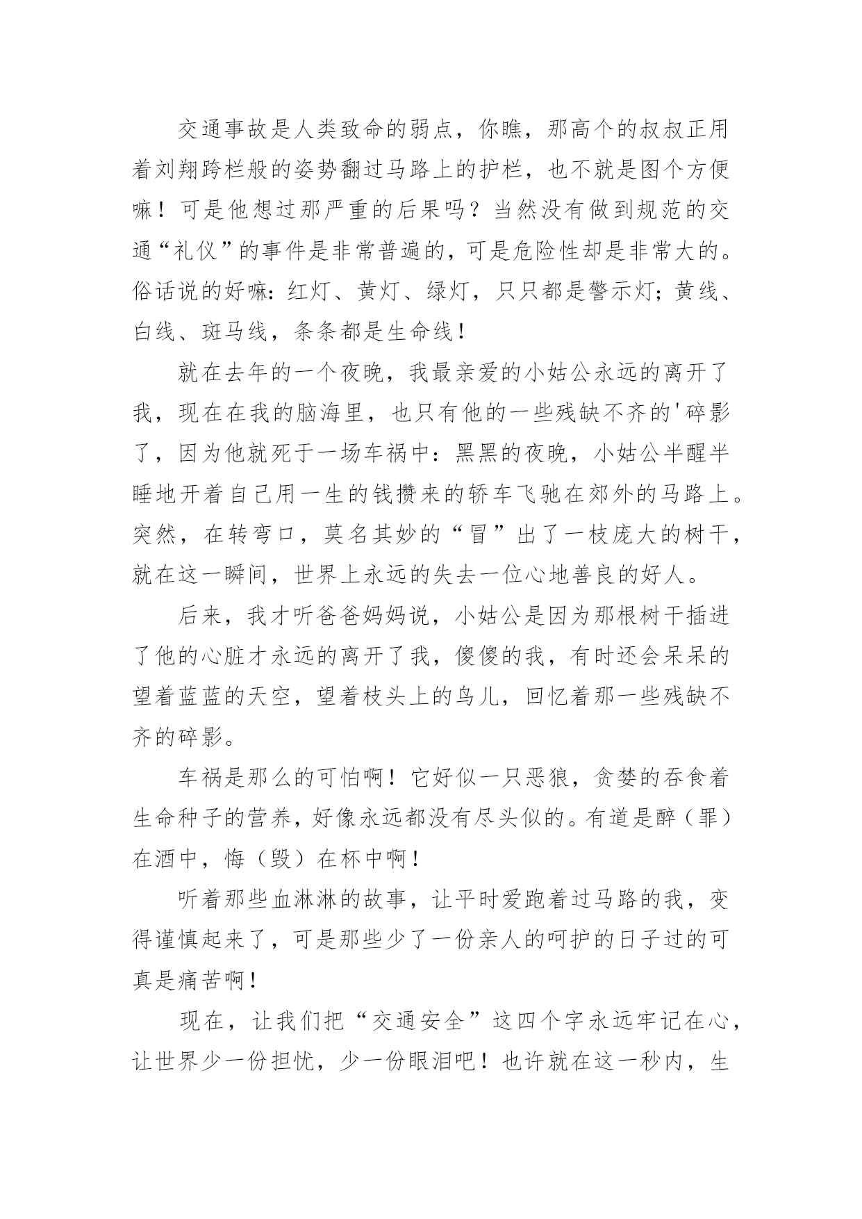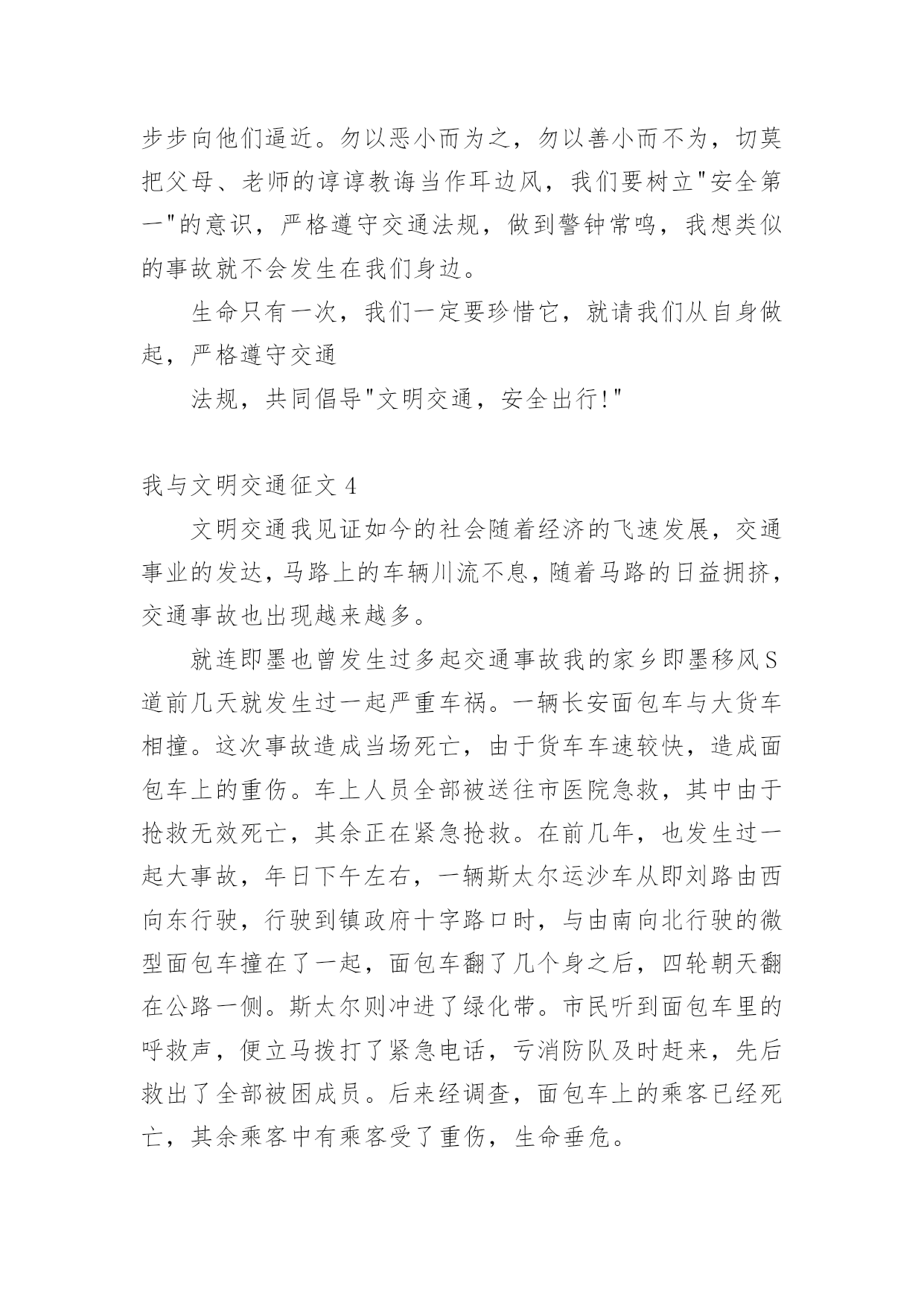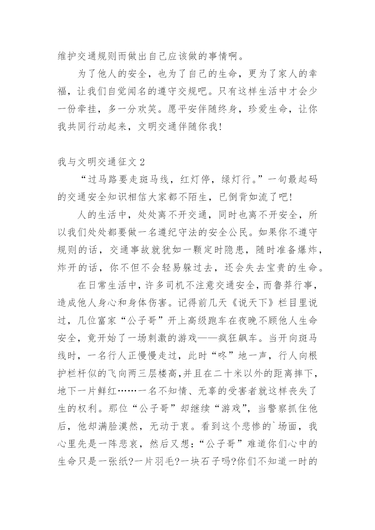 我与文明交通征文我与文明交通征文14篇在日常生活或是工作学习中,大家都跟征文打过交道吧,借助征文可以提高我们的语言组织能力。相信很多朋友都对写征文感到非常苦恼吧,以下是小编帮大家整理的我与文明交通征文,欢迎大家分享。我与文明交通征文1很小的时候我们就会唱:“红灯停,绿灯行,······”那时侯就懵懂的识得了“交通”2字。随着科技的进步,社会的发展,交通状况也出现了翻天覆地的变化。四通八达的马路纵横在神州大地,川流不息的车辆南来北往,交通工具也越来越多,越来越快:轻轨,地铁,飞机······,联系着想去的各个地方,人们出行越来越方便,快捷。渐渐的,人们的命运也与交通不自觉地联系在一起,当我们出门时,在马路上生命是多么的脆弱,只要你不遵守交通规则,就随时有可能会被“亲吻”。汽车是奔跑的“马路凶器”多少人死于这样的马路杀手中。看看吧:每天的新闻,网络,报纸里几乎都能寻觅到交通事故的案例。轻则住院,重则死亡,一个个鲜活的生命从此烟消云散,多少温馨的家庭从此被孤寂冷清的哭泣代替。一瞬间,幸福如肥皂泡般破灭,让我们追悔莫及。但是,这种状况是怎样造成的呢?有的是因为司机酒后驾驶,超载超限,有的是行人交通意识淡薄,乱穿乱闯。在众多的交通事故中,小学生占据了相当大的.一部分比例,我不禁思考,怎样才能做到文明出行,遵守交规呢?爸爸为我解答了这个问题。一个周末,我乘坐爸爸的摩托车到西彭去。还没有上车爸爸递给我一个头盔让我带上,爸爸耐心的说:“你可别小看这头盔,要是发生了交通意外,头盔可以保护我们的头部不受伤害。”我们坐上车,出发了,爸爸把车开得很平稳,在一个拐弯的地方爸爸打起转弯灯。爸爸说:“要是不打转弯灯,后面的车辆不知道你的方向,就很容易发生车祸。”“哦。原来是这么回事呀。那路上圆牌子上的50,又是什么意思呀。”那是限速标志,很多车祸就是因为司机超速驾驶造成的。我听了点点头。到了一个红绿灯处车停了下来,车很多,人行横道上却没有人。我说:“爸爸,咱们从缝隙里冲过去吧。”爸爸摇了摇头说:“随意变换车道容易和别人产生擦挂,闯红灯会有可能要了无辜的路人的性命。为了自己和他人的生命安全,还是要遵守交通规则啊。”我听了不好意思的低下了头。想一想最近大家不都在为创造一个安全的交通环境而努力吗?街上乱停的车辆变少了,学校外面无证超载的三轮车,摩托车消失了,学校的同学不在公路上玩耍了,规规矩矩的踩着通过斑马线一步一步的走过去。大家都在自觉的为维护交通规则而做出自己应该做的事情啊。为了他人的安全,也为了自己的生命,更为了家人的幸福,让我们自觉闻名的遵守交规吧。只有这样生活中才会少一份牵挂,多一分欢笑。愿平安伴随终身,珍爱生命,让你我共同行动起来,文明交通伴随你我!我与文明交通征文2“过马路要走斑马线,红灯停,绿灯行。”一句最起码的交通安全知识相信大家都不陌生,已倒背如流了吧!人的生活中,处处离不开交通,同时也离不开安全,所以我们处处都要做一名遵纪守法的安全公民。如果你不遵守规则的话,交通事故就犹如一颗定时隐患,随时准备爆炸,炸开的话,你不但不会轻易躲过去,还会失去宝贵的生命。在日常生活中,许多司机不注意交通安全,而鲁莽行事,造成他人身心和身体伤害。记得前几天《说天下》栏目里说过,几位富家“公子哥”开上高级跑车在夜晚不顾他人生命安全,竟开始了一场刺激的游戏——疯狂飙车。当开向斑马线时,一名行人正慢慢走过,此时“咚”地一声,行人向根护栏杆似的飞向两三层楼高,并且在二十米以外的距离摔下,地下一片鲜红……一名不知情、无辜的受害者就这样丧失了生的权利。那位“公子哥”却继续“游戏”,当警察抓住他后,他却满脸漠然,无动于衷。看到这个悲惨的`场面,我心里先是一阵悲哀,然后又想:“公子哥”难道你们心中的生命只是一张纸?一片羽毛?一块石子吗?你们不知道一时的放纵,会给别人带来多大的伤害,会给一个家庭带来多大的痛苦……在生活中,有不守规的司机,还有自由放纵的行人。行人不遵守交通规则的事情也很多,他们这种行为同样造成了惨重的后果。如:在马路上,我们经常可以看到一些行人不顾车辆的穿梭而随意行走,并且根本不顾红绿带给他们的警示,还不走斑马线,使酿造惨剧,造成自身身心和身体伤害。所以我们在马路上行走要守交通规则,不要酿成“路上随意走,亲人两行泪”的后果,要做一名安全小公民。交通事故不止这些,车不会认人,人会认人。司机请你不要让那无情的车轮伤害到别人,行人请你不要让车轮伤害到你。就让我们敲响交通安全的警钟,让“交通安全”这四个字在我们心里永远扎根,永伴我们前行。同学们,让我们都自觉遵守交通规则,并尽自己的能力让更多的人遵守交通规则,让交通事故在我们生活中渐渐消失,让我们的明天充满希望、阳光。我与文明交通征文3如今的社会随着经济繁荣的发展,交通事业的发达,马路上的车辆川流不息,随着马路的日益拥