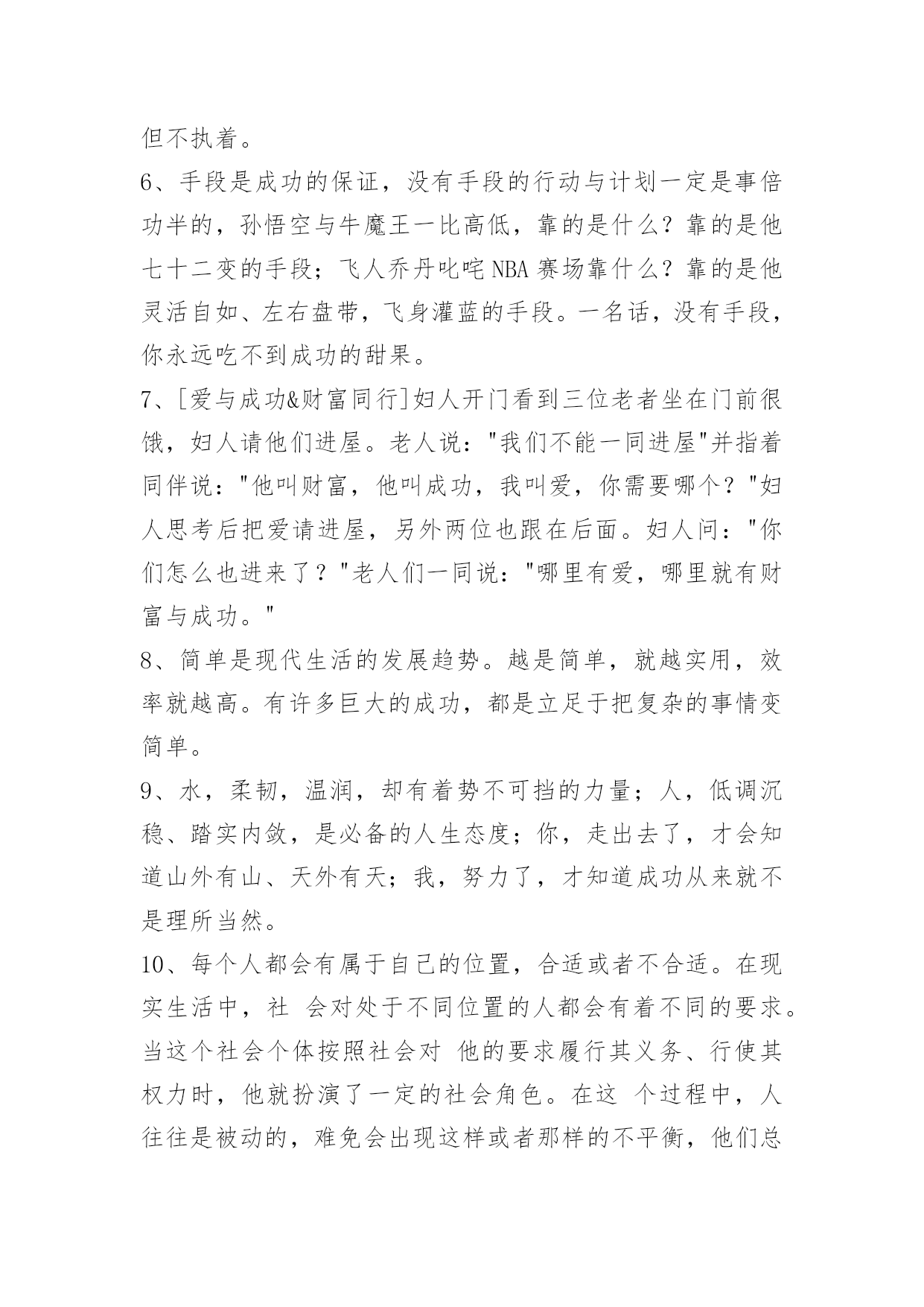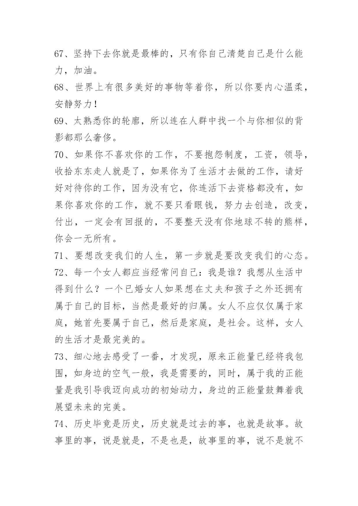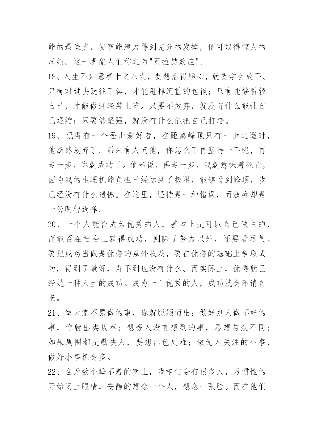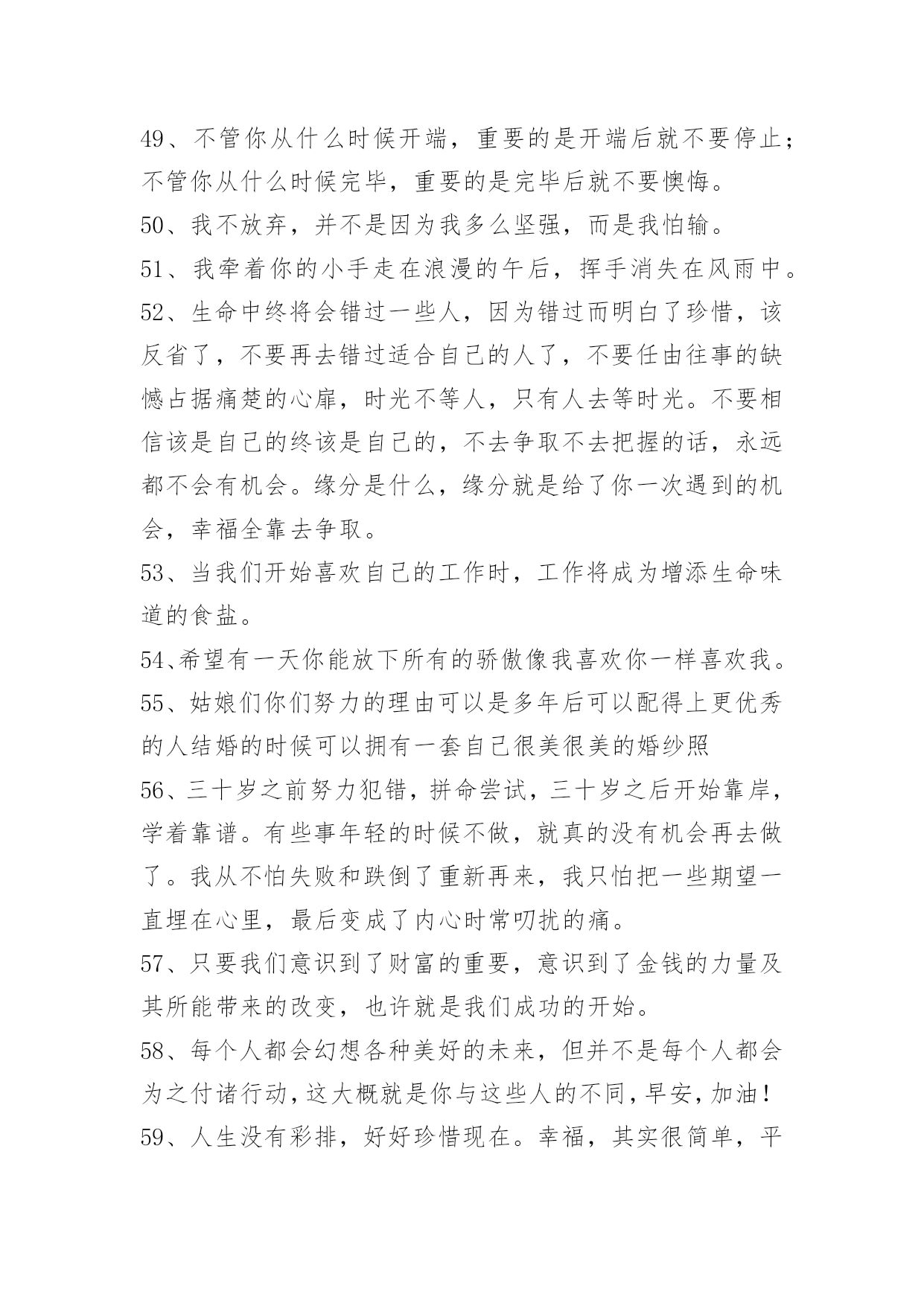 工作励志语录90条实用的工作励志语录集合90条不去期望。失去了不会伤心,得到便是惊喜。晚安!下面是小编为大家整理推荐的工作励志语录90条,欢迎大家分享。1、不拼一把怎么知道自己是人物还是废物。2、走过,经过,尝过,还是平淡最美;听过,看过,想过,还是简单最好。平平静静,安安稳稳,体会着生活的善良淳朴;简简单单,勤勤恳恳,感受着人生的真实美好。生活可以复杂,可以简单,看你拥有怎样的心态,简单就真实,平淡就淡然。没有虚伪,不戴面具;不去张扬,甘愿淡泊,真心、真情、真实。3、没有谁能保证,让时光倒流,自己所做的决定会不一样、江山易改本性难移。4、生命是个艰辛的历程,充满许多的挑战与困难,需要不断调适、探索成长,换个思维看事情,心境就会豁然开朗。我发现,凡是一个情绪比较浮躁的人,都不能做出正确的决定。成功人士,基本上都比较理智。所以,我认为一个人要获得成功,首先就要控制自己浮躁的情绪。5、最佳心态,就是心平气和,不急不躁,不盲动,不冲动,多冷静,多思考,专心做自己该做的事,而不要把注意力放到事情的结果上。享受过程中的精彩,成功在路上,努力,但不执着。6、手段是成功的保证,没有手段的行动与计划一定是事倍功半的,孙悟空与牛魔王一比高低,靠的是什么?靠的是他七十二变的手段;飞人乔丹叱咤NBA赛场靠什么?靠的是他灵活自如、左右盘带,飞身灌蓝的手段。一名话,没有手段,你永远吃不到成功的甜果。7、[爱与成功&财富同行]妇人开门看到三位老者坐在门前很饿,妇人请他们进屋。老人说:"我们不能一同进屋"并指着同伴说:"他叫财富,他叫成功,我叫爱,你需要哪个?"妇人思考后把爱请进屋,另外两位也跟在后面。妇人问:"你们怎么也进来了?"老人们一同说:"哪里有爱,哪里就有财富与成功。"8、简单是现代生活的发展趋势。越是简单,就越实用,效率就越高。有许多巨大的成功,都是立足于把复杂的事情变简单。9、水,柔韧,温润,却有着势不可挡的力量;人,低调沉稳、踏实内敛,是必备的人生态度;你,走出去了,才会知道山外有山、天外有天;我,努力了,才知道成功从来就不是理所当然。10、每个人都会有属于自己的位置,合适或者不合适。在现实生活中,社会对处于不同位置的人都会有着不同的要求。当这个社会个体按照社会对他的要求履行其义务、行使其权力时,他就扮演了一定的社会角色。在这个过程中,人往往是被动的,难免会出现这样或者那样的不平衡,他们总是会羡慕那些头戴成功光环的人,但是却很少去关注成功者背后浸透着那些奋斗的汗水。11、在这个社会,追求成功,财富,地位等比较重。由于、竞争激烈,生活压力大。由于、都很努力。由于、社会市场给了成功很多的渠道。由于、攀比心理,金钱意识。更需要一份单纯,一份洒脱,一份感恩,一份关爱他人之心。12、经营店面是一项事业,多用心做好,开启店面是一种选择,多用心努力,店面开张是一种拼搏,多尽心付出,店面一开始是一种机会,全心去料理,愿你开店吉祥走下去,成功伴你更如意。13、虽然"永远"只有简短的两个字,却无人能用文字说得完全,"永远"到底有多远、它不会随着生命的终结而消散,真正的永远是藏在心里。尽管天会变,人会老,但那颗心不变。14、女人是一架钢琴,遇到一位名家来弹,奏出来的是一支名曲;如果是普通人来弹,也许会奏出一支流行曲;要是碰上了不会弹琴的人,恐怕就不成歌了。15、打从心底想要成功的人,什么都会尝试去做,既然有那么一点可能性,就什么都试着去实践。也就是说,会说愚蠢可笑或没有意义而不去做的人,说穿了就是没那么想成功。16、任何事物,我们在那里面看得见依照我们的理解应当如此生活,那就是美的;任何东西,凡是显示出生活或使我们想起生活的,那就是美的。17、瓦拉赫的成功,说明这样一个道理:学生的智能发展都是不均衡的,都有智能的强点与弱点,他们一旦发现自己智能的最佳点,使智能潜力得到充分的发挥,便可取得惊人的成绩。这一现象人们称之为"瓦拉赫效应"。18、人生不如意事十之八九,要想活得顺心,就要学会放下。只有对过去既往不咎,才能甩掉沉重的包袱;只有能够看轻自己,才能做到轻装上阵。只要不放弃,就没有什么能让自己退缩;只要够坚强,就没有什么能把自己打垮。19、记得有一个登山爱好者,在距离峰顶只有一步之遥时,他断然放弃了。后来有人问他,你怎么不再坚持一下呢,再走一步,你就成功了。他却说,再走一步,我就意味着死亡,因为我的生理机能负担已经达到了极限,能够看到峰顶,我已经没有什么遗憾。在这里,坚持是一种错误,而放弃却是一份明智选择。20、一个人能否成为优秀的人,基本上是可以自己做主的,而能否在社会上获得成功,则除了努力以外,还要看运气。要把成功当做是优秀的意外收获,要在优秀的基础上争取成功,得到了最好,得不到也没有什么。而实际上,优秀就已经是一种人生的成功。成为一个优秀的人,成功就会不