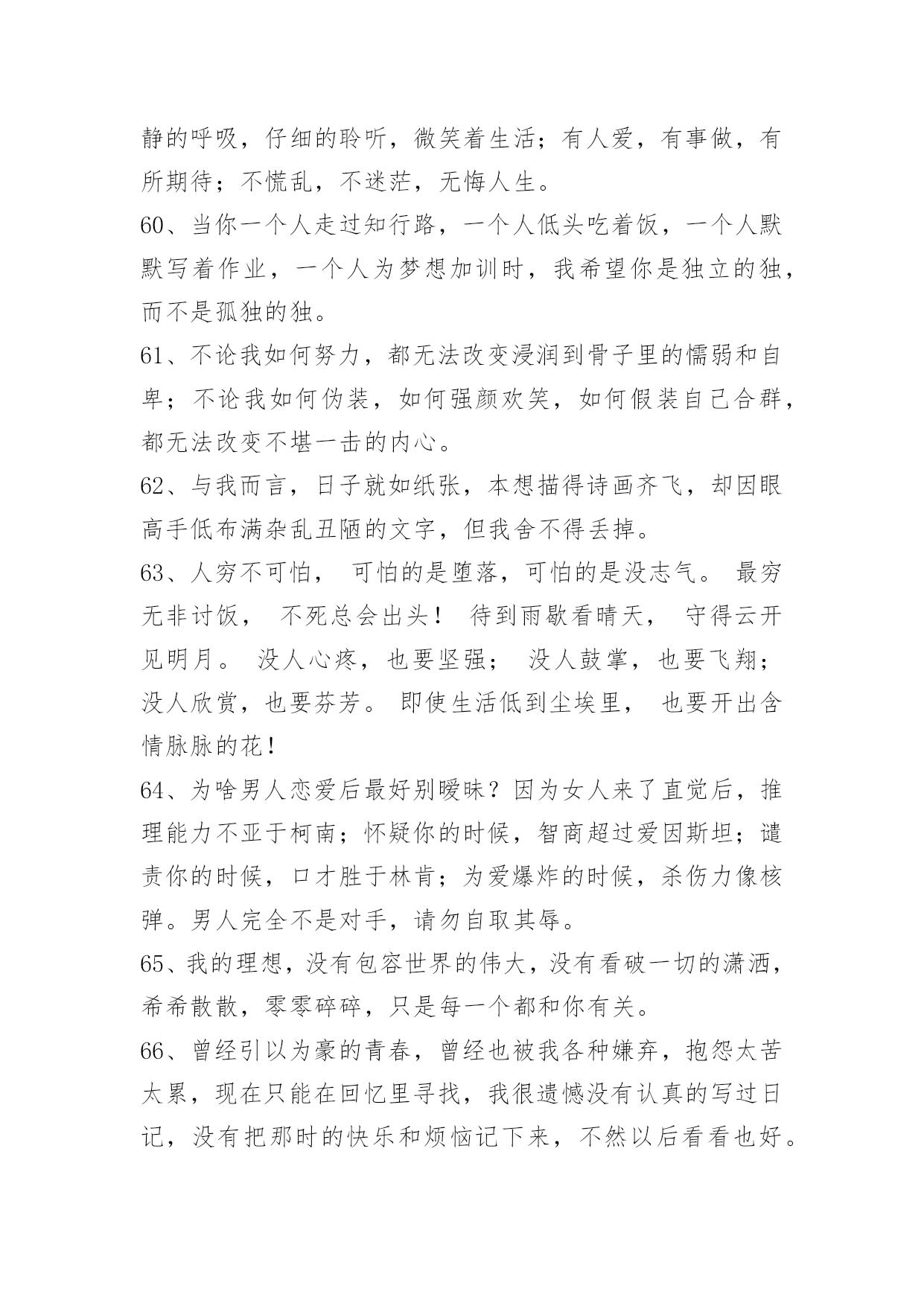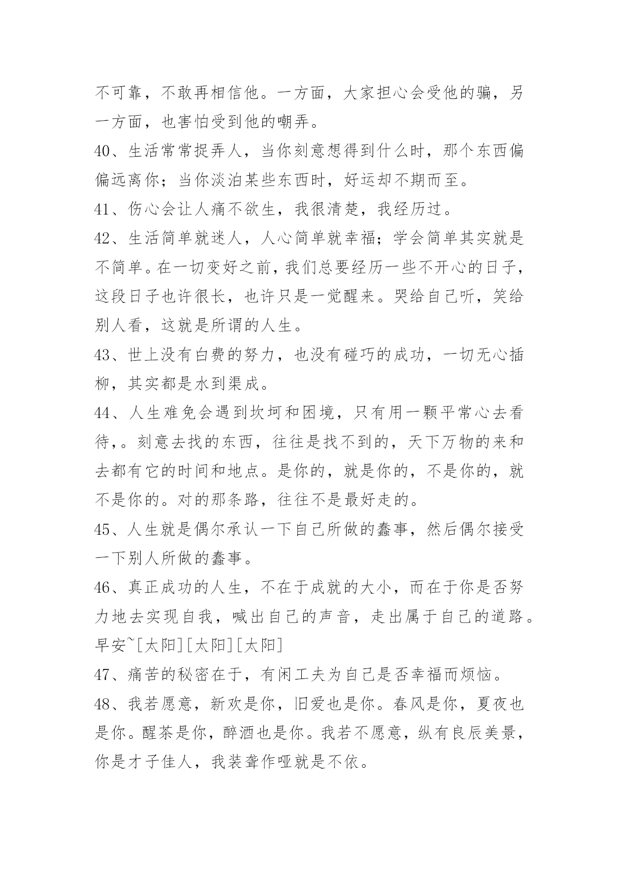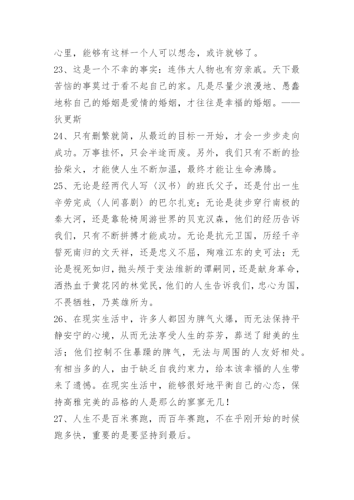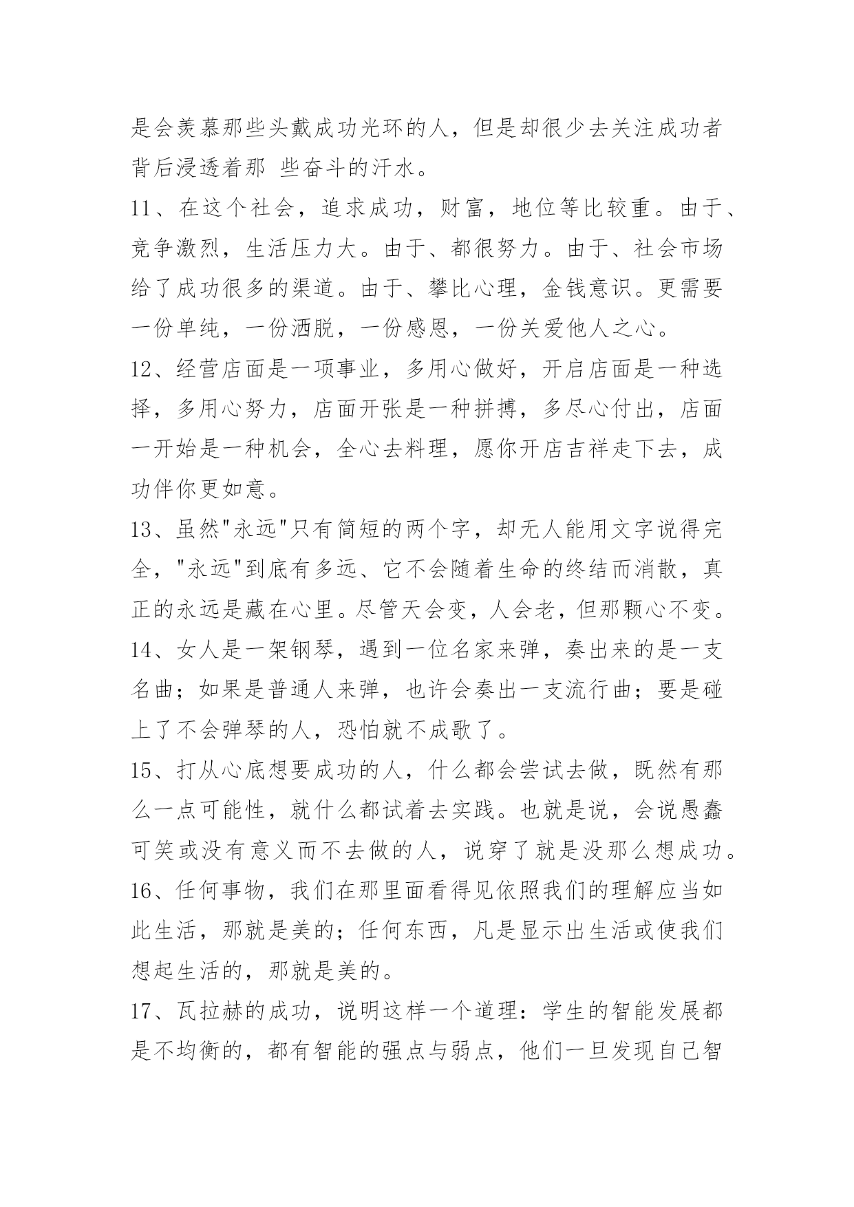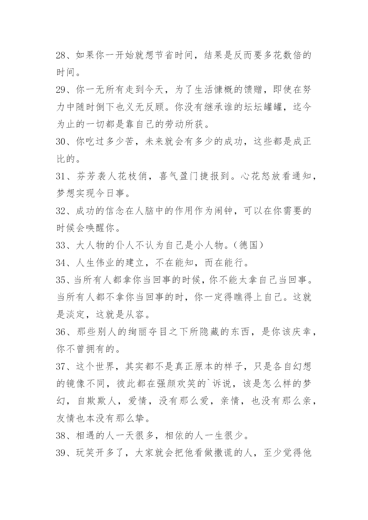 工作励志语录90条实用的工作励志语录集合90条不去期望。失去了不会伤心,得到便是惊喜。晚安!下面是小编为大家整理推荐的工作励志语录90条,欢迎大家分享。1、不拼一把怎么知道自己是人物还是废物。2、走过,经过,尝过,还是平淡最美;听过,看过,想过,还是简单最好。平平静静,安安稳稳,体会着生活的善良淳朴;简简单单,勤勤恳恳,感受着人生的真实美好。生活可以复杂,可以简单,看你拥有怎样的心态,简单就真实,平淡就淡然。没有虚伪,不戴面具;不去张扬,甘愿淡泊,真心、真情、真实。3、没有谁能保证,让时光倒流,自己所做的决定会不一样、江山易改本性难移。4、生命是个艰辛的历程,充满许多的挑战与困难,需要不断调适、探索成长,换个思维看事情,心境就会豁然开朗。我发现,凡是一个情绪比较浮躁的人,都不能做出正确的决定。成功人士,基本上都比较理智。所以,我认为一个人要获得成功,首先就要控制自己浮躁的情绪。5、最佳心态,就是心平气和,不急不躁,不盲动,不冲动,多冷静,多思考,专心做自己该做的事,而不要把注意力放到事情的结果上。享受过程中的精彩,成功在路上,努力,但不执着。6、手段是成功的保证,没有手段的行动与计划一定是事倍功半的,孙悟空与牛魔王一比高低,靠的是什么?靠的是他七十二变的手段;飞人乔丹叱咤NBA赛场靠什么?靠的是他灵活自如、左右盘带,飞身灌蓝的手段。一名话,没有手段,你永远吃不到成功的甜果。7、[爱与成功&财富同行]妇人开门看到三位老者坐在门前很饿,妇人请他们进屋。老人说:"我们不能一同进屋"并指着同伴说:"他叫财富,他叫成功,我叫爱,你需要哪个?"妇人思考后把爱请进屋,另外两位也跟在后面。妇人问:"你们怎么也进来了?"老人们一同说:"哪里有爱,哪里就有财富与成功。"8、简单是现代生活的发展趋势。越是简单,就越实用,效率就越高。有许多巨大的成功,都是立足于把复杂的事情变简单。9、水,柔韧,温润,却有着势不可挡的力量;人,低调沉稳、踏实内敛,是必备的人生态度;你,走出去了,才会知道山外有山、天外有天;我,努力了,才知道成功从来就不是理所当然。10、每个人都会有属于自己的位置,合适或者不合适。在现实生活中,社会对处于不同位置的人都会有着不同的要求。当这个社会个体按照社会对他的要求履行其义务、行使其权力时,他就扮演了一定的社会角色。在这个过程中,人往往是被动的,难免会出现这样或者那样的不平衡,他们总是会羡慕那些头戴成功光环的人,但是却很少去关注成功者背后浸透着那些奋斗的汗水。11、在这个社会,追求成功,财富,地位等比较重。由于、竞争激烈,生活压力大。由于、都很努力。由于、社会市场给了成功很多的渠道。由于、攀比心理,金钱意识。更需要一份单纯,一份洒脱,一份感恩,一份关爱他人之心。12、经营店面是一项事业,多用心做好,开启店面是一种选择,多用心努力,店面开张是一种拼搏,多尽心付出,店面一开始是一种机会,全心去料理,愿你开店吉祥走下去,成功伴你更如意。13、虽然"永远"只有简短的两个字,却无人能用文字说得完全,"永远"到底有多远、它不会随着生命的终结而消散,真正的永远是藏在心里。尽管天会变,人会老,但那颗心不变。14、女人是一架钢琴,遇到一位名家来弹,奏出来的是一支名曲;如果是普通人来弹,也许会奏出一支流行曲;要是碰上了不会弹琴的人,恐怕就不成歌了。15、打从心底想要成功的人,什么都会尝试去做,既然有那么一点可能性,就什么都试着去实践。也就是说,会说愚蠢可笑或没有意义而不去做的人,说穿了就是没那么想成功。16、任何事物,我们在那里面看得见依照我们的理解应当如此生活,那就是美的;任何东西,凡是显示出生活或使我们想起生活的,那就是美的。17、瓦拉赫的成功,说明这样一个道理:学生的智能发展都是不均衡的,都有智能的强点与弱点,他们一旦发现自己智能的最佳点,使智能潜力得到充分的发挥,便可取得惊人的成绩。这一现象人们称之为"瓦拉赫效应"。18、人生不如意事十之八九,要想活得顺心,就要学会放下。只有对过去既往不咎,才能甩掉沉重的包袱;只有能够看轻自己,才能做到轻装上阵。只要不放弃,就没有什么能让自己退缩;只要够坚强,就没有什么能把自己打垮。19、记得有一个登山爱好者,在距离峰顶只有一步之遥时,他断然放弃了。后来有人问他,你怎么不再坚持一下呢,再走一步,你就成功了。他却说,再走一步,我就意味着死亡,因为我的生理机能负担已经达到了极限,能够看到峰顶,我已经没有什么遗憾。在这里,坚持是一种错误,而放弃却是一份明智选择。20、一个人能否成为优秀的人,基本上是可以自己做主的,而能否在社会上获得成功,则除了努力以外,还要看运气。要把成功当做是优秀的意外收获,要在优秀的基础上争取成功,得到了最好,得不到也没有什么。而实际上,优秀就已经是一种人生的成功。成为一个优秀的人,成功就会不