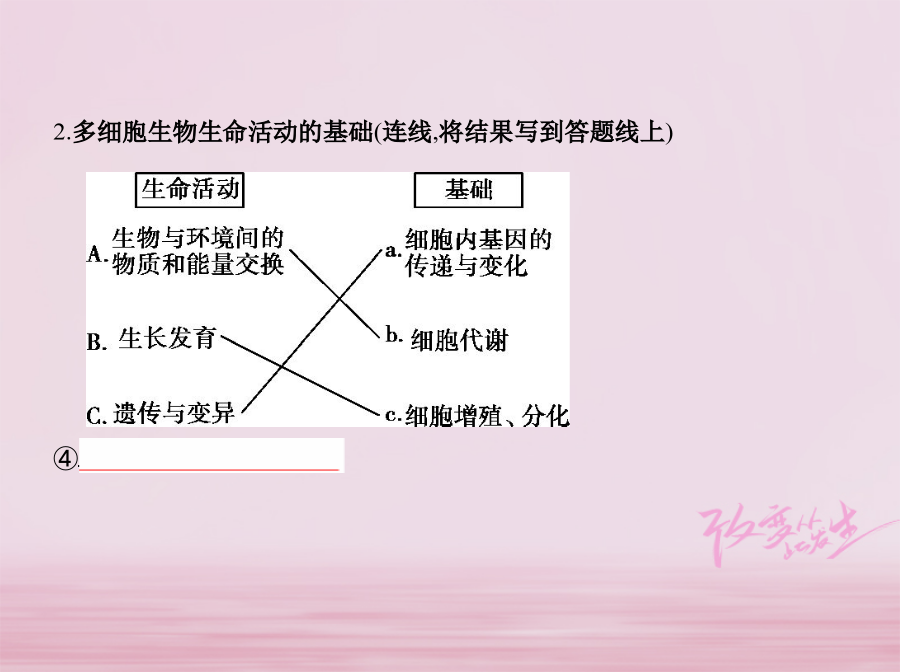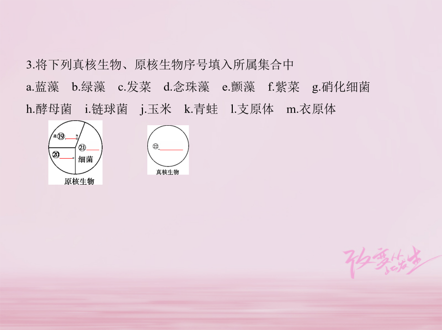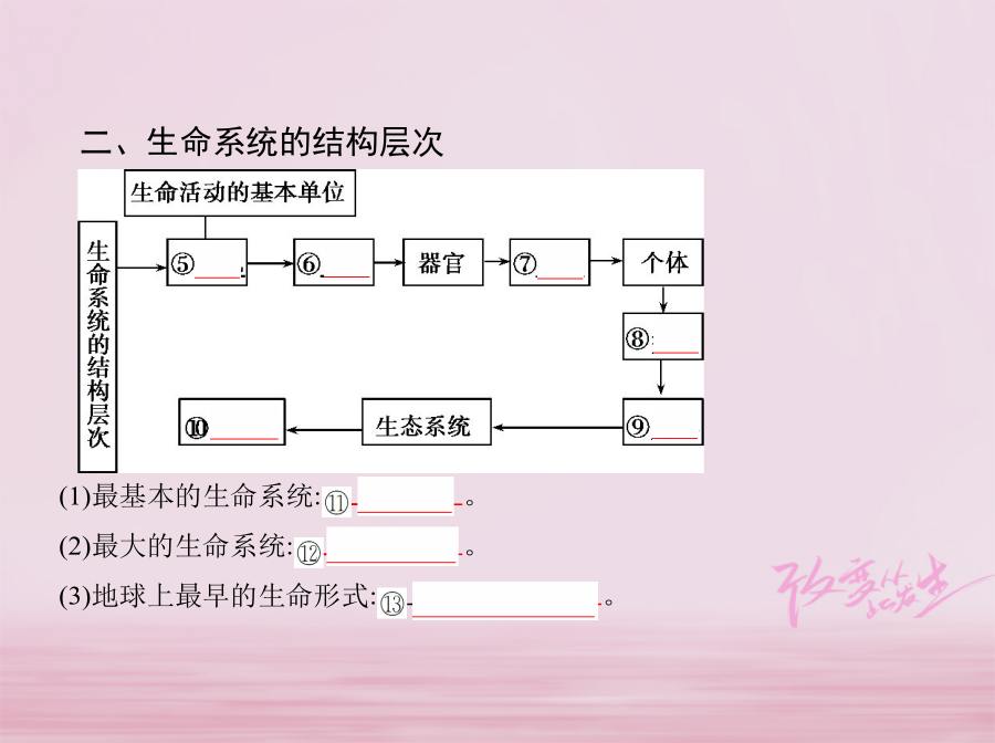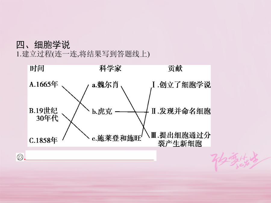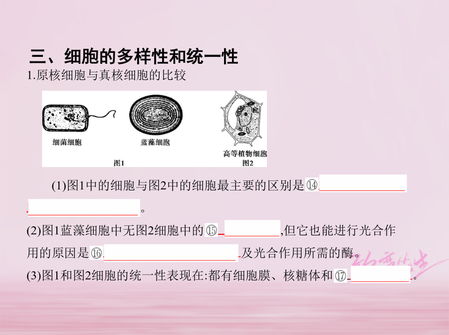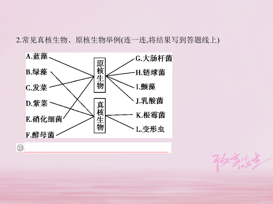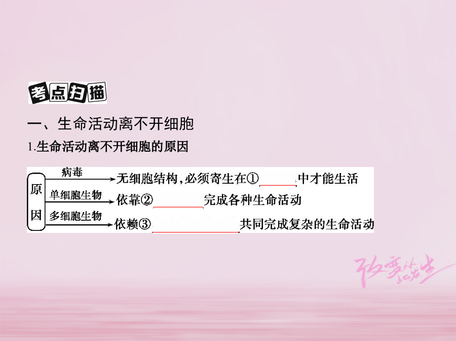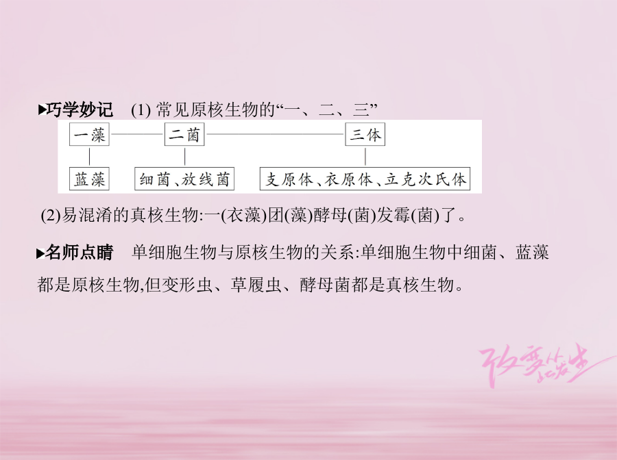 第1讲走近细胞总纲目录一、生命活动离不开细胞1.生命活动离不开细胞的原因2.多细胞生物生命活动的基础(连线,将结果写到答题线上) ④A—bB—cC—a (1)最基本的生命系统: 细胞。(2)最大的生命系统: 生物圈。(3)地球上最早的生命形式: 单细胞生物。1.原核细胞与真核细胞的比较(1)图1中的细胞与图2中的细胞最主要的区别是 前者没有以核膜为界限的细胞核。(2)图1蓝藻细胞中无图2细胞中的 叶绿体,但它也能进行光合作用的原因是 含有藻蓝素和叶绿素及光合作用所需的酶。(3)图1和图2细胞的统一性表现在:都有细胞膜、核糖体和 DNA分子。2.常见真核生物、原核生物举例(连一连,将结果写到答题线上) 原核生物:ACEGHIJ真核生物:BDFKL3.将下列真核生物、原核生物序号填入所属集合中a.蓝藻b.绿藻c.发菜d.念珠藻e.颤藻f.紫菜g.硝化细菌h.酵母菌i.链球菌j.玉米k.青蛙l.支原体m.衣原体 巧学妙记(1)常见原核生物的“一、二、三” (2)易混淆的真核生物:一(衣藻)团(藻)酵母(菌)发霉(菌)了。1.建立过程(连一连,将结果写到答题线上) A—b—ⅡB—c—ⅠC—a—Ⅲ2.内容(1)细胞是一个有机体,一切动植物都由 细胞发育而来,并由 细胞和细胞产物所构成。(2)细胞是一个 相对独立的单位,既有它自己的生命,又对与其他细胞共同组成的整体的生命起作用。(3)新细胞可以从 老细胞中产生。1.一种病毒同时含有DNA和RNA。 ()突破1多种多样的细胞与细胞学说 2.细胞形态结构多样性与功能多样性相统一的实例(1)蛔虫在肠道内寄生,只进行无氧呼吸,细胞内没有线粒体。(2)哺乳动物成熟的红细胞无细胞核,也没有众多的细胞器,如核糖体、线粒体等,所以自身不能合成蛋白质,呼吸作用方式是无氧呼吸,不能进行细胞分裂,而且寿命较短。(3)神经细胞具突起,有利于提高兴奋传导的效率;神经细胞已高度分化,不具有分裂能力。(4)卵细胞大,有利于储存丰富的营养物质;精子小,含细胞质很少,尾部含丰富的线粒体,有利于精子的运动。(5)具分泌功能的细胞往往形成很多突起,以增大表面积,提高分泌效率,且细胞中内质网和高尔基体含量较多。(6)代谢旺盛的细胞中,线粒体、核糖体等细胞器含量较多,核仁较大,核孔数量较多。1.易混原核生物和真核生物的判断方法2.检索法分析原核细胞和真核细胞(1) (2) (3) (4) (5) (6) 3.病毒的知识构建(1)病毒无细胞结构,在生物学分类上独立成界,既不属于真核生物,也不属于原核生物。(2)病毒的遗传物质为DNA或RNA,故每种病毒的碱基和核苷酸各有4种;在病毒增殖过程中,病毒一般只提供模板,氨基酸原料、核苷酸原料、核糖体、tRNA都由宿主提供。 考向1考查生物系统的层次答案B本题主要考查生命系统的结构层次。从生命活动的角度理解,人体最基本的结构层次是细胞,然后依次为组织、器官、系统。元素、化合物、分子、细胞器等不属于生命系统的结构层次,种群、群落、生态系统是个体水平以上的结构层次,故B项正确。2.(2018北京东城期末)大肠杆菌和烟草花叶病毒共有的特征是 ()A.有拟核B.有核糖体C.通过分裂进行增殖D.以核酸为遗传物质答案D大肠杆菌为原核生物,有拟核,病毒无细胞结构,无拟核,A错误;大肠杆菌唯一的细胞器为核糖体,病毒没有细胞器,B错误;大肠杆菌通过二分裂进行增殖,病毒只能在宿主细胞内增殖,但不进行分裂,C错误;大肠杆菌的遗传物质是DNA,烟草花叶病毒的遗传物质是RNA,DNA和RNA都是核酸,D正确。3.(2018北京五十五中期中阶段性调研)下列关于原核生物的叙述,不正确的是 ()A.大肠杆菌的细胞内有核糖体B.细胞对物质的吸收具有选择性C.拟核区中含有环状的DNA分子D.蓝藻细胞的叶绿体中含有叶绿素答案D大肠杆菌是原核生物,核糖体是原核细胞中唯一的细胞器,A正确;细胞膜的存在,使细胞选择性地从其所处环境中吸收物质,B正确;细菌的拟核区有一个环状DNA分子,C正确;蓝藻为原核生物,无叶绿体,D错误。4.下图所示四种不同生物,相关叙述正确的是 ()A.甲乙两种细胞的细胞壁可被纤维素酶分解产生葡萄糖B.乙是低等植物,其细胞中同时具有中心体和叶绿体C.丙的遗传物质是单链RNA,其结构不稳定易产生变异D.丁细胞中具有双层膜的结构是叶绿体、线粒体和细胞核答案C甲乙两种生物都属于原核生物,其细胞壁的主要成分是肽聚糖,肽聚糖不能被纤维素酶分解,A项错误;蓝藻是原核生物,含有藻蓝素和叶绿素,能进行光合作用,有细胞壁、细胞膜、细胞质、拟核,只有核糖体一种细胞器,B项错误;丙的遗传物质是单链RNA,其