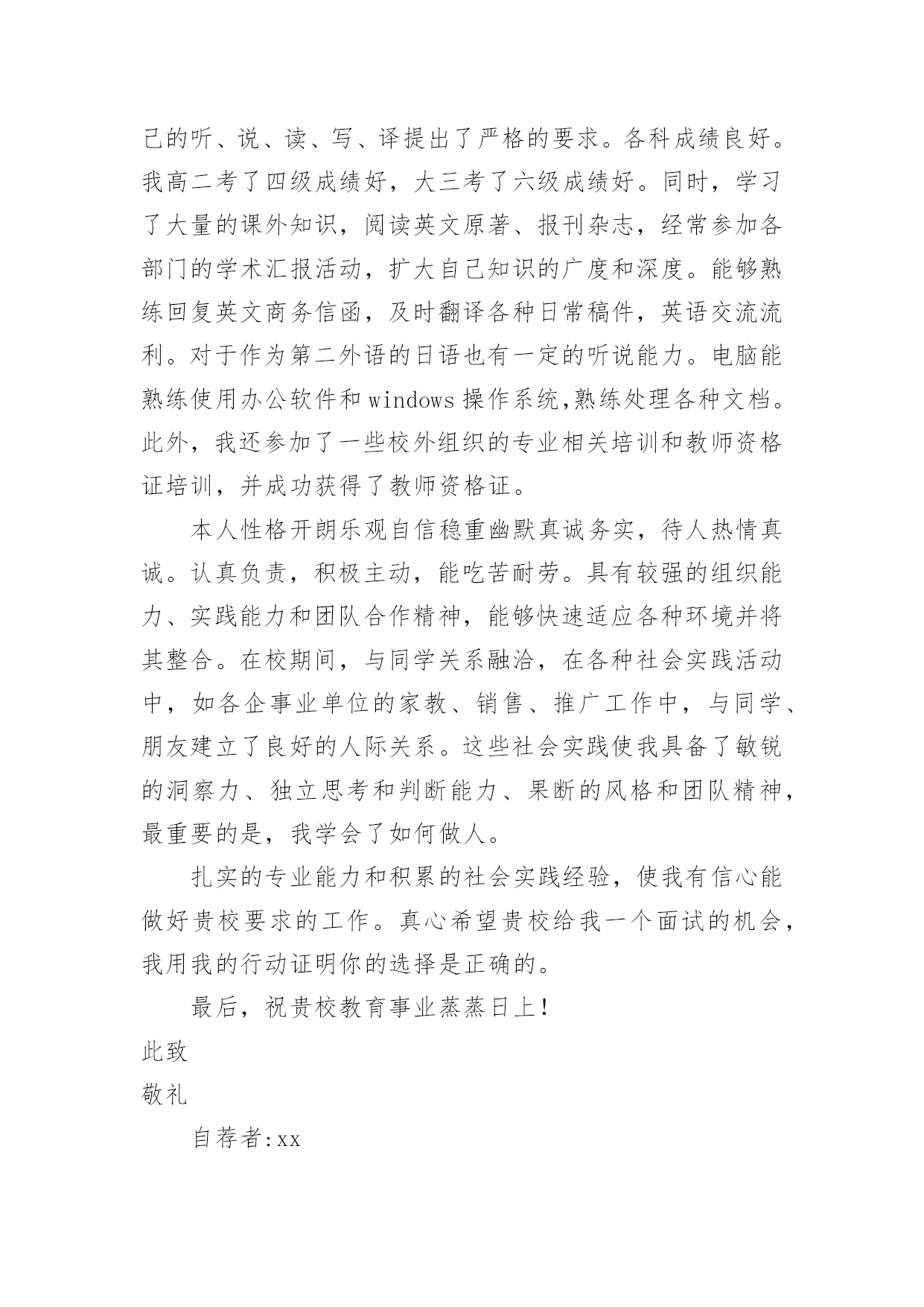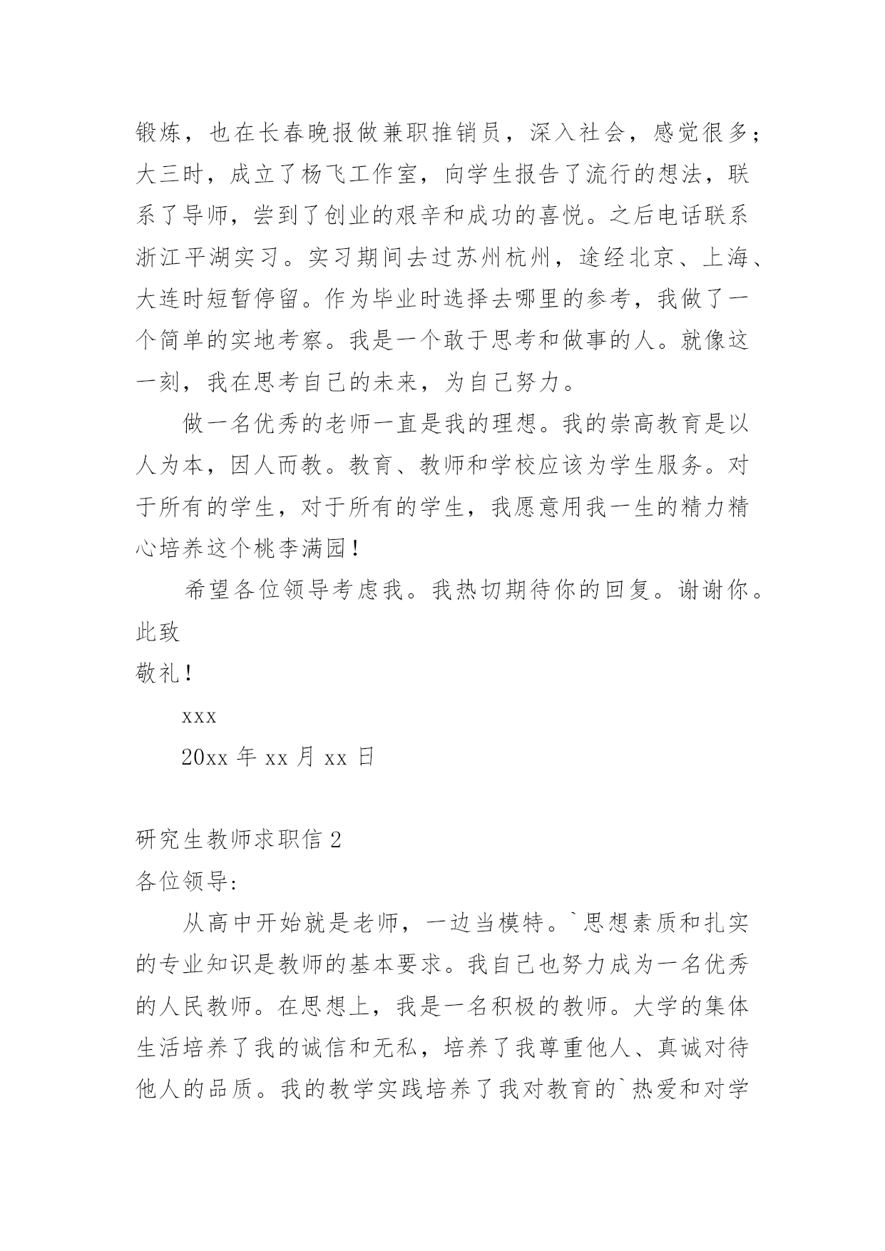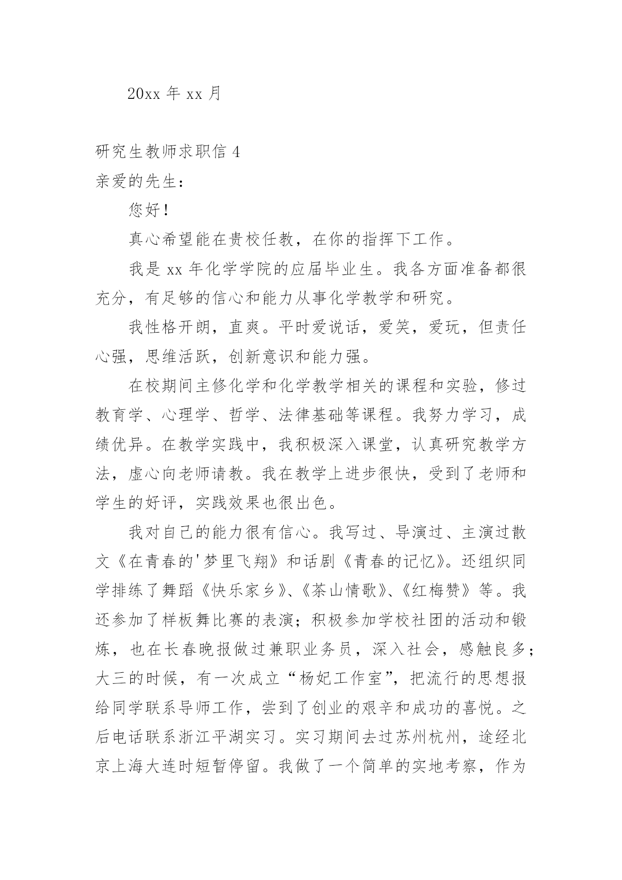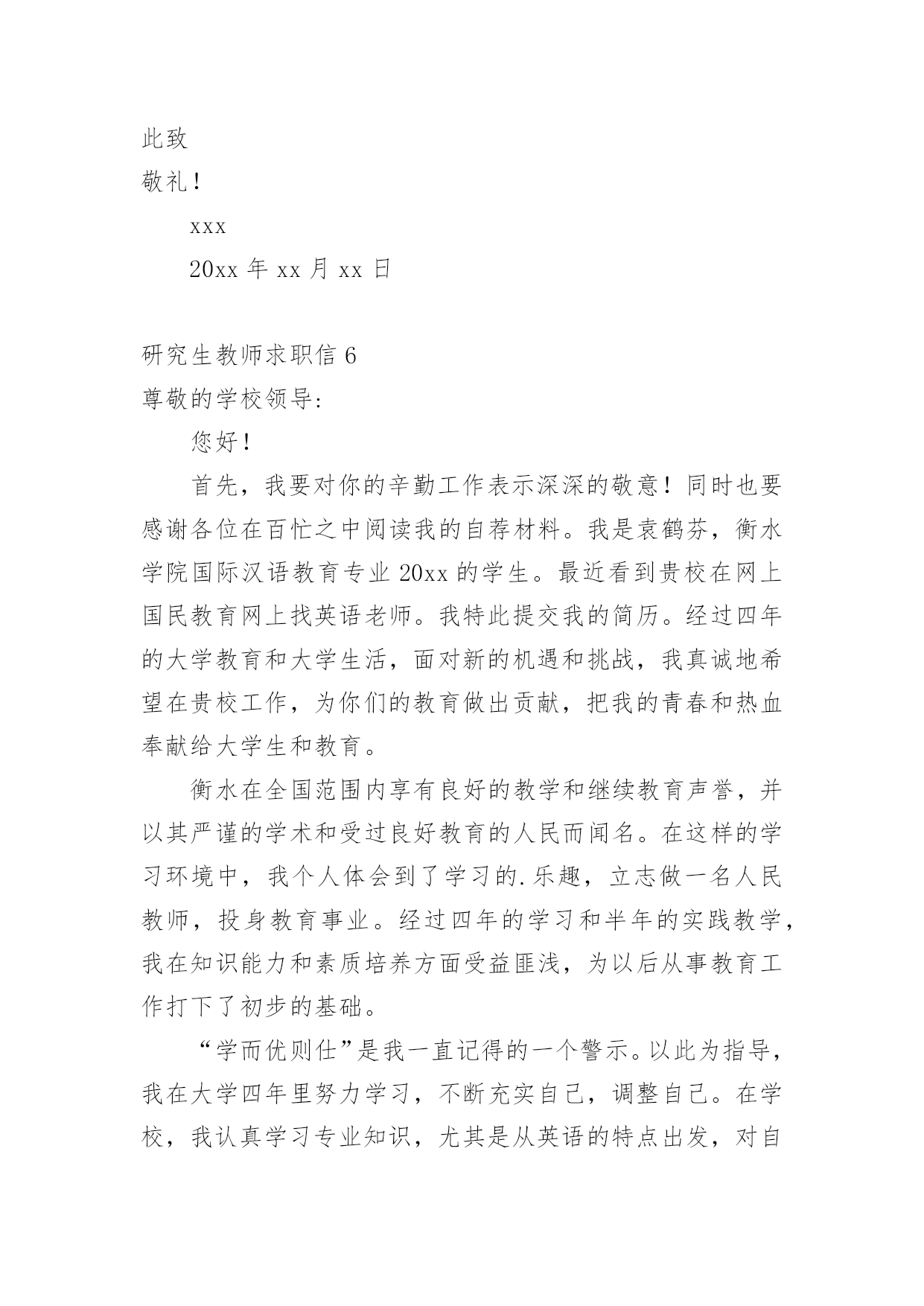 研究生教师求职信时间稍纵即逝,我们又将打开新的篇章,寻求新的工作机会,需要为此写一封求职信了哦。但是怎么写才更能吸引眼球呢?以下是小编收集整理的研究生教师求职信,欢迎阅读,希望大家能够喜欢。研究生教师求职信1亲爱的xx先生:您好!真心希望在贵校任教,在你的指挥下工作。我是xx年xx化学学院应届毕业生。我各方面都有充分的准备,有足够的信心和能力从事化学教学和研究。我性格开朗直爽。平时爱说话,爱笑,爱玩,但责任心强,思维活跃,创新意识强,能力强。在学校期间,我主修与化学和化学教学相关的课程和实验,以及教育学、心理学、哲学、法律基础等课程。我努力学习,取得了优异的成绩。在教学实践中,我积极深入课堂,认真研究教学方法,谦虚地咨询老师。我在教学方面进步很快,受到了老师和学生的.高度赞扬,实践效果也很好。我对自己的能力很有信心。我写过,导演过,主演过散文《在青春的梦里飞翔》和戏剧《青春的记忆》。还组织学生排练舞蹈《快乐家乡》、《茶山情歌》、《红梅赞》等。我还参加了模型舞蹈比赛的表演;积极参加学校俱乐部的活动和锻炼,也在长春晚报做兼职推销员,深入社会,感觉很多;大三时,成立了杨飞工作室,向学生报告了流行的想法,联系了导师,尝到了创业的艰辛和成功的喜悦。之后电话联系浙江平湖实习。实习期间去过苏州杭州,途经北京、上海、大连时短暂停留。作为毕业时选择去哪里的参考,我做了一个简单的实地考察。我是一个敢于思考和做事的人。就像这一刻,我在思考自己的未来,为自己努力。做一名优秀的老师一直是我的理想。我的崇高教育是以人为本,因人而教。教育、教师和学校应该为学生服务。对于所有的学生,对于所有的学生,我愿意用我一生的精力精心培养这个桃李满园!希望各位领导考虑我。我热切期待你的回复。谢谢你。此致敬礼!xxx20xx年xx月xx日研究生教师求职信2各位领导:从高中开始就是老师,一边当模特。`思想素质和扎实的专业知识是教师的基本要求。我自己也努力成为一名优秀的人民教师。在思想上,我是一名积极的教师。大学的集体生活培养了我的诚信和无私,培养了我尊重他人、真诚对待他人的品质。我的教学实践培养了我对教育的`热爱和对学生的无私关怀。在学习方面,每门专业课都学得很好,成绩也很好。进入基地班,提高教学素养。我还选修了与中学数学教学密切相关的课程,如试讲》、《初等数论》、《心理学与教育学》等与中学数学教学密切相关的课程。另外,英语四级以后,还修了专业英语、六级选修等课程,阅读翻译能力强。所有这些努力和进步都给了我满足挑战的信心。根据本学期的教学实践xx师范大学附属中学生的特点,精心备课,准确掌握和处理教材,良好的课堂教学效果受到导师和学生的高度赞扬。同时,自学辅导、考试组织、班级管理也取得了良好的效果。从小就对教师职业充满尊重和热爱。长大后终于变成了你。现在,我终于走上了讲台。我相信我会配得上人类灵魂工程师的光荣称号。好鸟栖身于树上,给我一个机会。我会努力奋进,为学校的蓬勃发展做出自己的贡献,用汗水证明你明智的选择。最后,祝贵校多才多艺,成就更加辉煌!此致敬礼!xxx20xx年xx月xx日研究生教师求职信3各位领导:从高中开始学就是老师,一边当模特。优秀的思想素质和扎实的专业知识是对教师的基本要求。为了成为一名优秀的人民教师,我自己也努力过。思想上,我积极进取,为人师表。大学的集体生活培养了我的正直无私,培养了我尊重他人、真诚待人的品质。我的教学实践培养了我对教育的热爱和对学生的无私关怀。学习方面,每门专业课都学的很好,成绩优异。进了基地班,提高了教学素养。我还选修了与中学数学教学密切相关的课程,如《中学数学高起点》、《教材分析与试讲》、《初等数论》、《心理学与教育学》。另外英语四级过了,还修了专业英语、六级选修等课程,阅读和翻译能力很强。所有这些努力和进步使我有足够的信心迎接挑战。在这一学期的教学实践中,根据xx师范学院附属中学学生的特点,精心备课,准确掌握和处理教材,良好的课堂教学效果得到了导师和学生的.高度赞扬。同时还进行自学辅导,组织考试,进行班级管理,取得了不错的效果。从小我就对教师这个职业充满了尊敬和热爱。“我长大后终于变成了你。”现在,我终于走上了讲台。我相信我会无愧于“人类灵魂工程师”的光荣称号。好鸟栖于树上,给我一个机会,我会努力,奋进,为学校的蓬勃发展做出自己的贡献,用汗水证明你的明智选择。最后,祝贵校多才多艺,成就更加辉煌!此致xxx20xx年xx月研究生教师求职信4亲爱的先生:您好!真心希望能在贵校任教,在你的指挥下工作。我是xx年化学学院的应届毕业生。我各方面准备都很充分,有足够的信心和能力从事化学教学和研究。我性格开朗,直爽。平时爱说话,爱笑,爱玩,但责任心强,思维活跃,创新意识和能力强。在校期间主修化学和化学教学相关的课程和实验,修过教育学、心理