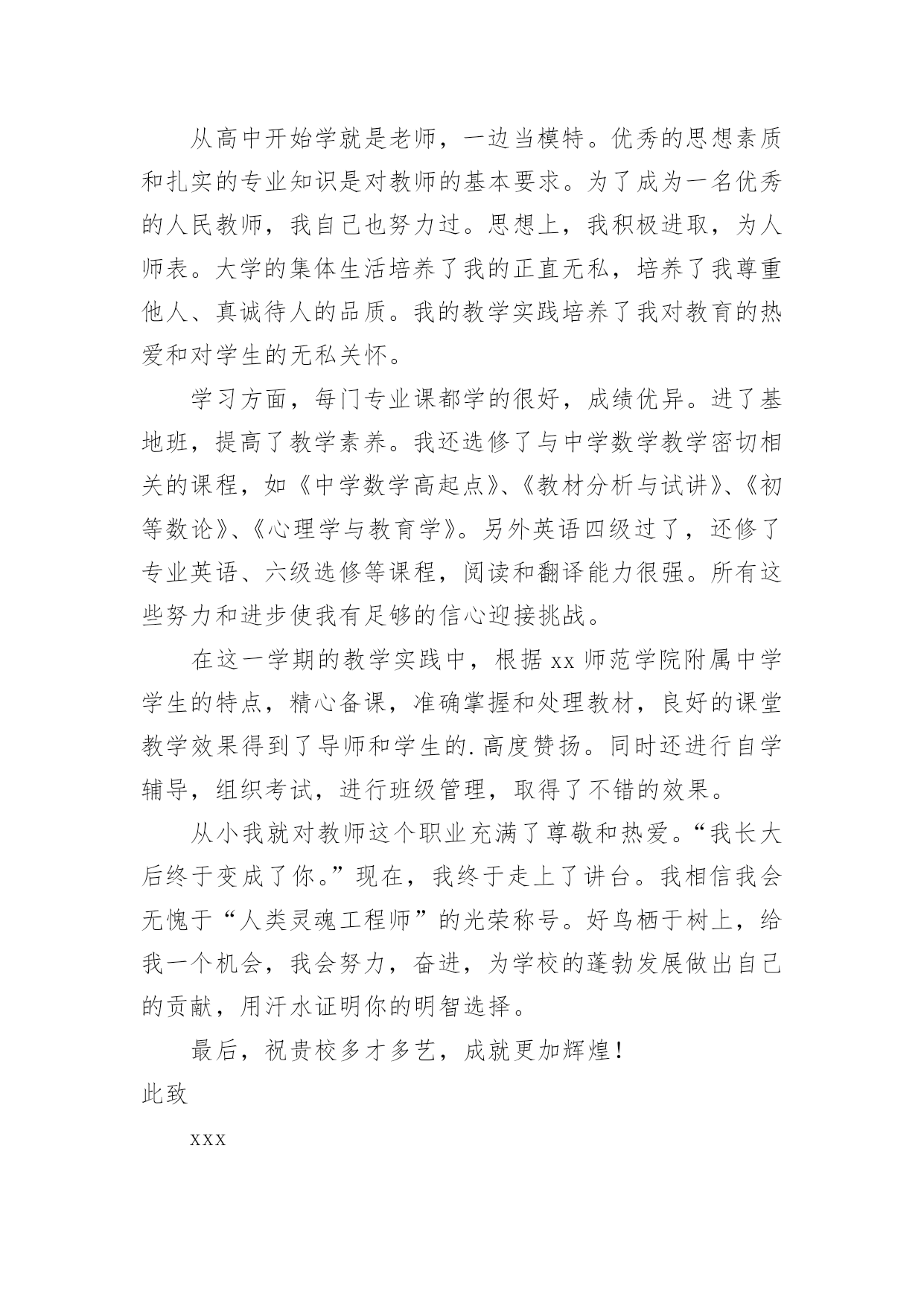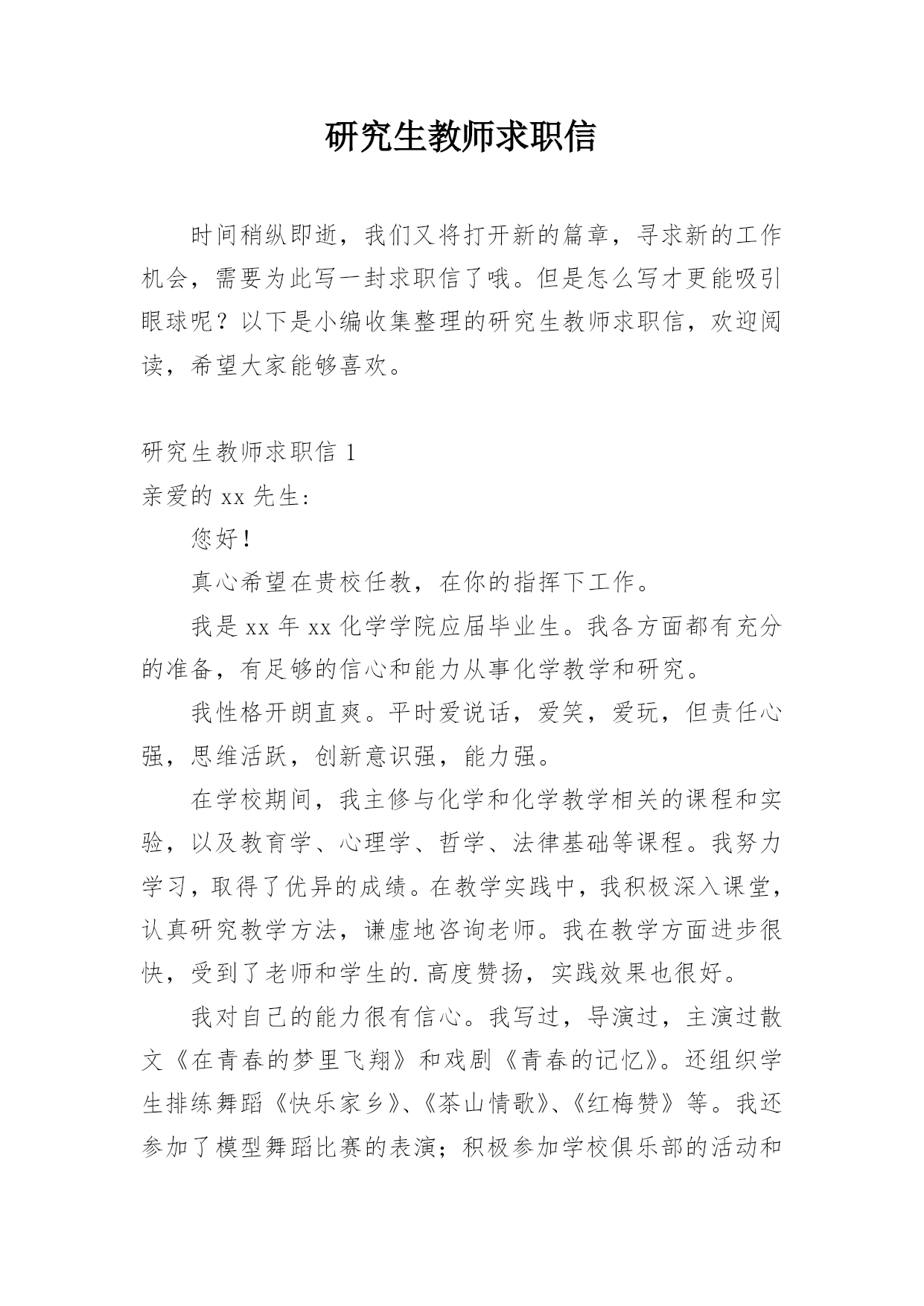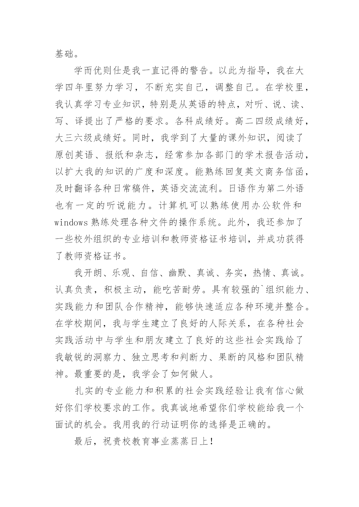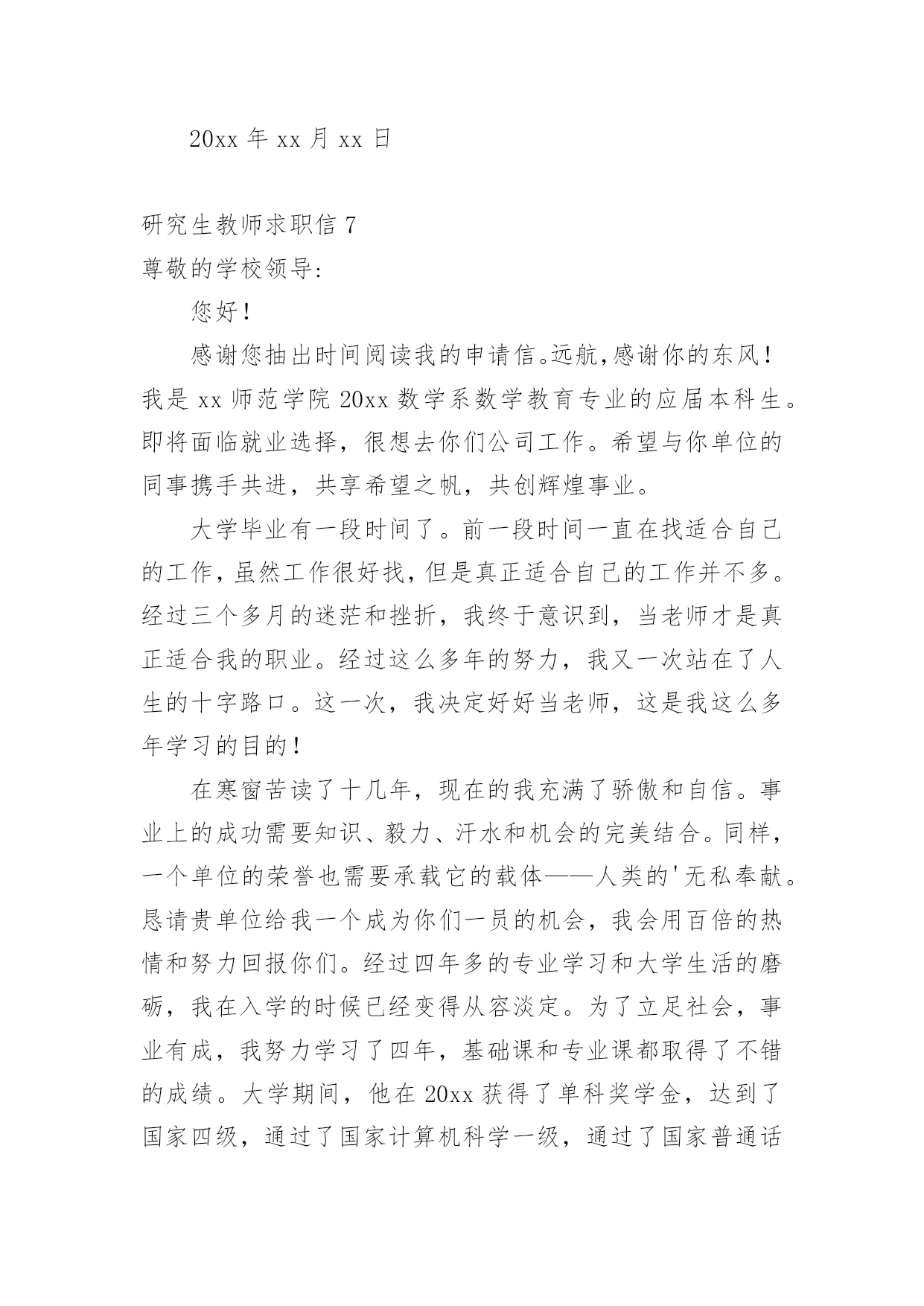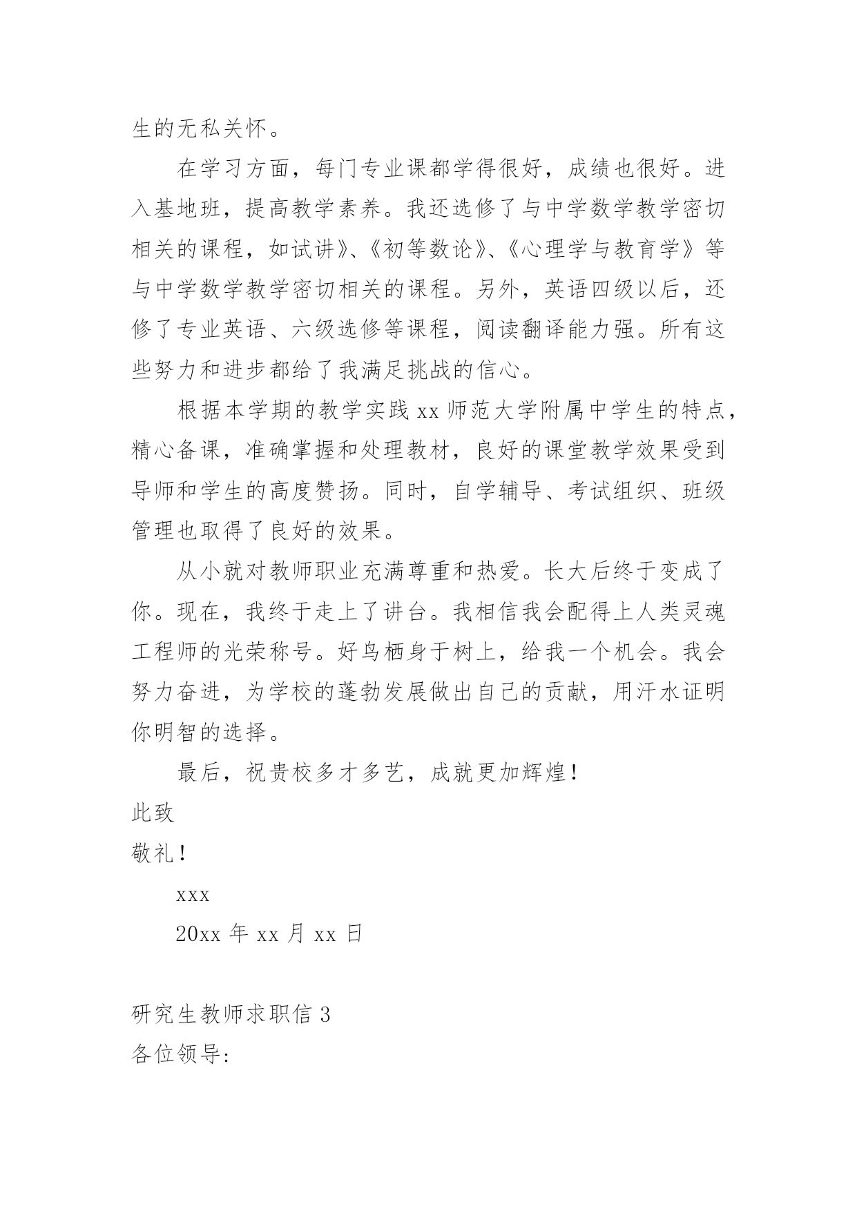 研究生教师求职信时间稍纵即逝,我们又将打开新的篇章,寻求新的工作机会,需要为此写一封求职信了哦。但是怎么写才更能吸引眼球呢?以下是小编收集整理的研究生教师求职信,欢迎阅读,希望大家能够喜欢。研究生教师求职信1亲爱的xx先生:您好!真心希望在贵校任教,在你的指挥下工作。我是xx年xx化学学院应届毕业生。我各方面都有充分的准备,有足够的信心和能力从事化学教学和研究。我性格开朗直爽。平时爱说话,爱笑,爱玩,但责任心强,思维活跃,创新意识强,能力强。在学校期间,我主修与化学和化学教学相关的课程和实验,以及教育学、心理学、哲学、法律基础等课程。我努力学习,取得了优异的成绩。在教学实践中,我积极深入课堂,认真研究教学方法,谦虚地咨询老师。我在教学方面进步很快,受到了老师和学生的.高度赞扬,实践效果也很好。我对自己的能力很有信心。我写过,导演过,主演过散文《在青春的梦里飞翔》和戏剧《青春的记忆》。还组织学生排练舞蹈《快乐家乡》、《茶山情歌》、《红梅赞》等。我还参加了模型舞蹈比赛的表演;积极参加学校俱乐部的活动和锻炼,也在长春晚报做兼职推销员,深入社会,感觉很多;大三时,成立了杨飞工作室,向学生报告了流行的想法,联系了导师,尝到了创业的艰辛和成功的喜悦。之后电话联系浙江平湖实习。实习期间去过苏州杭州,途经北京、上海、大连时短暂停留。作为毕业时选择去哪里的参考,我做了一个简单的实地考察。我是一个敢于思考和做事的人。就像这一刻,我在思考自己的未来,为自己努力。做一名优秀的老师一直是我的理想。我的崇高教育是以人为本,因人而教。教育、教师和学校应该为学生服务。对于所有的学生,对于所有的学生,我愿意用我一生的精力精心培养这个桃李满园!希望各位领导考虑我。我热切期待你的回复。谢谢你。此致敬礼!xxx20xx年xx月xx日研究生教师求职信2各位领导:从高中开始就是老师,一边当模特。`思想素质和扎实的专业知识是教师的基本要求。我自己也努力成为一名优秀的人民教师。在思想上,我是一名积极的教师。大学的集体生活培养了我的诚信和无私,培养了我尊重他人、真诚对待他人的品质。我的教学实践培养了我对教育的`热爱和对学生的无私关怀。在学习方面,每门专业课都学得很好,成绩也很好。进入基地班,提高教学素养。我还选修了与中学数学教学密切相关的课程,如试讲》、《初等数论》、《心理学与教育学》等与中学数学教学密切相关的课程。另外,英语四级以后,还修了专业英语、六级选修等课程,阅读翻译能力强。所有这些努力和进步都给了我满足挑战的信心。根据本学期的教学实践xx师范大学附属中学生的特点,精心备课,准确掌握和处理教材,良好的课堂教学效果受到导师和学生的高度赞扬。同时,自学辅导、考试组织、班级管理也取得了良好的效果。从小就对教师职业充满尊重和热爱。长大后终于变成了你。现在,我终于走上了讲台。我相信我会配得上人类灵魂工程师的光荣称号。好鸟栖身于树上,给我一个机会。我会努力奋进,为学校的蓬勃发展做出自己的贡献,用汗水证明你明智的选择。最后,祝贵校多才多艺,成就更加辉煌!此致敬礼!xxx20xx年xx月xx日研究生教师求职信3各位领导:从高中开始学就是老师,一边当模特。优秀的思想素质和扎实的专业知识是对教师的基本要求。为了成为一名优秀的人民教师,我自己也努力过。思想上,我积极进取,为人师表。大学的集体生活培养了我的正直无私,培养了我尊重他人、真诚待人的品质。我的教学实践培养了我对教育的热爱和对学生的无私关怀。学习方面,每门专业课都学的很好,成绩优异。进了基地班,提高了教学素养。我还选修了与中学数学教学密切相关的课程,如《中学数学高起点》、《教材分析与试讲》、《初等数论》、《心理学与教育学》。另外英语四级过了,还修了专业英语、六级选修等课程,阅读和翻译能力很强。所有这些努力和进步使我有足够的信心迎接挑战。在这一学期的教学实践中,根据xx师范学院附属中学学生的特点,精心备课,准确掌握和处理教材,良好的课堂教学效果得到了导师和学生的.高度赞扬。同时还进行自学辅导,组织考试,进行班级管理,取得了不错的效果。从小我就对教师这个职业充满了尊敬和热爱。“我长大后终于变成了你。”现在,我终于走上了讲台。我相信我会无愧于“人类灵魂工程师”的光荣称号。好鸟栖于树上,给我一个机会,我会努力,奋进,为学校的蓬勃发展做出自己的贡献,用汗水证明你的明智选择。最后,祝贵校多才多艺,成就更加辉煌!此致xxx20xx年xx月研究生教师求职信4亲爱的先生:您好!真心希望能在贵校任教,在你的指挥下工作。我是xx年化学学院的应届毕业生。我各方面准备都很充分,有足够的信心和能力从事化学教学和研究。我性格开朗,直爽。平时爱说话,爱笑,爱玩,但责任心强,思维活跃,创新意识和能力强。在校期间主修化学和化学教学相关的课程和实验,修过教育学、心理