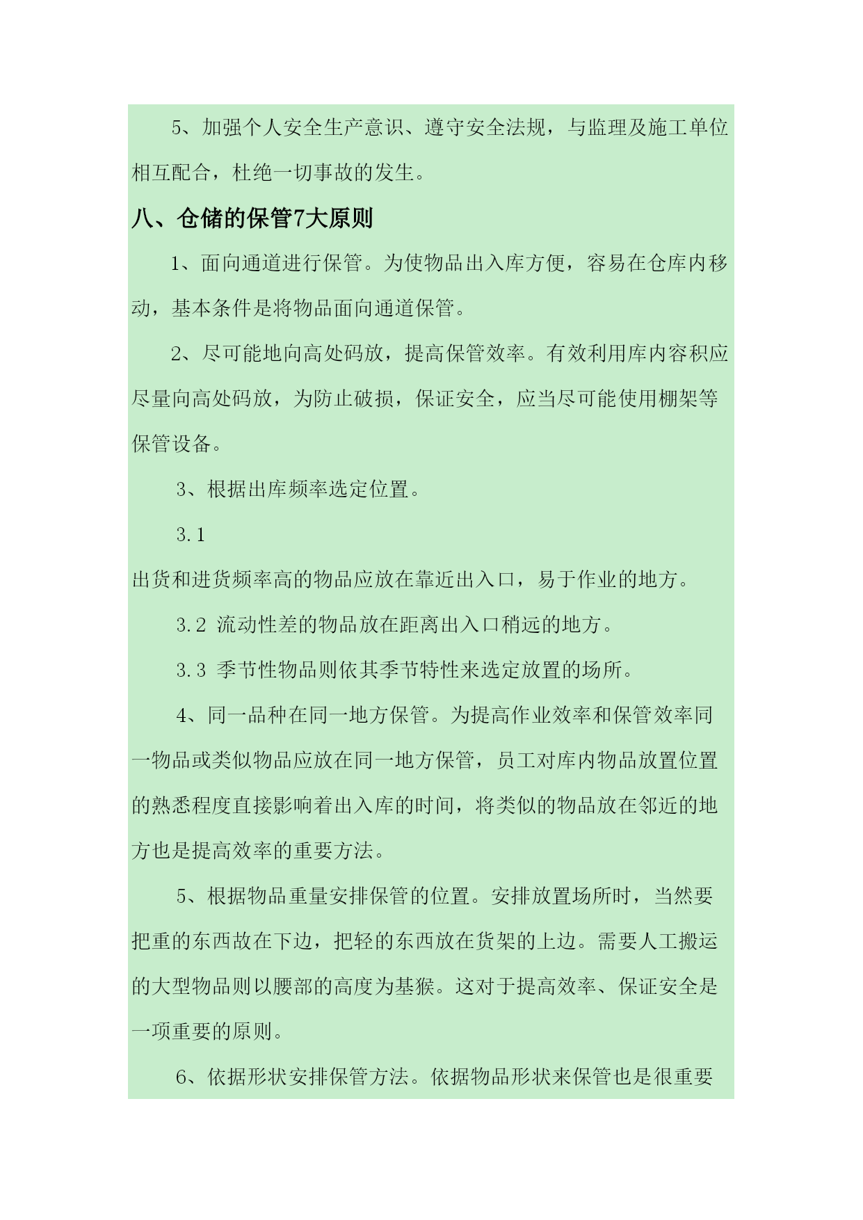 物流园区管理制度日常工作制度1、按规定的时间上下班,不缺席、不迟到、不早退。并根据工作需要加班加点确保工程质量和进度。2、准因病、有事不能上班或上班后外出办事必须请假。批准权限为:半天以内的由各组负责人批,一天以上的由筹建办主任批准。3、服从组长指挥调度和筹建办领导的工作安排,不得找任何理由和借口。4、忠于职守,勤奋工作,提高效率,保质保量按时完成职责范围内的工作和领导交办的各项任务。各组尤其是基建组要把每天的工作情况以日志形式记录下来。5、紧密团结、搞好配合,工作上认真负责,及时沟通。6、讲文明,懂礼貌,树立良好的个人形象。7、认真做好安全及清洁卫生工作,确保安全无事故,保持室内外整齐、清洁、卫生。8、认真学习、掌握知识,适应工地建设的需要。管理好公共财物,确保集体资产不受损失。10、不准在施工现场进行娱乐活动,一经发现,给予当事人相应的行政和经济处罚。二、职责分工与内部协调制度1、明确职责分工。宿迁粮食物流中心筹建办公室下设三个组,即综合及设备组、基建组和财务组。综合及设备组负责粮食物流中心总体规划,技术统揽把关、审查、指导,省市相关部门各种手续报批和关系协调,材料设备采购招投标、收支存管理及与土建水电工程的技术衔接;基建组负责工地现场全面管理,包括质量技术把关,与设计、监理、质量检测与监督、施工单位关系协调及管理,与宿城区相关部门沟通和协调等;财务组负责资金概算,资金筹集与管理,与财政、农发行等部门协调衔接。2、按职责分工各负其责。各组职责范围内工作由组长统一安排、处理并承担责任。对自身难以处理的问题,必须以书面形式报筹建办主任协调和处理。筹建办主任难以处理的,再报党组研究解决。如自身难以处理、又未及时报告所造成的任何责任和后果均由各组组长负责。3、加强协调配合。各组之间联系工作和要求对方配合的工作一律以联系单方式,由组长签字后送相关组,相关组组长必须签收并对联系单中要求办理或配合的工作给予积极、迅速办理。凡因推诿拖拉或处置不力影响整个工作的进展、质量以及造成严重后果的,将追究当事人和组长的责任直至纪律处分。三、财务管理制度为了加强粮食物流中心建设期间财务的管理,保障建设资金的筹集和使用合法有效,根据会计法和相关规定,结合基建工作实际,制定本制度。1、基建工程必须按基本建设程序办事。建设工程及大宗设备采购实行招投标制度。2、所有工程资金支出均应经党组研究决定,党组研究决定后由分管领导核批。3、筹建经费管理。3.1筹建办所需办公用品由各组根据需要,排出计划,经分管领导同意后购置。3.2差旅费按照现行财务制度规定执行,返回后三天内结清帐目。3.3业务招待费由筹建办主任统一扎口管理。各组因公确须公务招待的,必须先请示后办理手续。考虑到三个组情况不同,综合及设备组、财务组公务接待在请示同意后到筹建办主任处办理公务接待审批单。基建组公务接待先电话请示筹建办主任,由筹建办主任明确接待档次和标准后记录到工作日志中,并自行填制公务接待审批单,然后不定期报筹建办主任审核并补办批准手续。3.4其他费用开支必须经筹建办主任同意后方可实施。4、工程进度款和设备材料款均采用非现金结算。四、器料设备采购制度1、采购人员要时时处处以国家、集体利益为重,遵纪守法,廉洁奉公。2、器材设备采购要根据工程进度,提前拿出采购清单。3、备招投标工作小组,由筹建办主任任组长,筹建办相关人员为组员。4、器材设备采购要按规定的工作流程组织实施。5、器材设备到货后,要按合同及清单认真组织验收。检查产品的厂家、品牌、规格、型号、标准、合格证、质保证、准用证、使用说明书等是否符合要求。符合要求的方可入库。不符合要求的,坚决拒收。6、器材设备采购活动中如涉及供应商的任何“折扣”、“让利”等,均应在实际采购合同中以“让利”形式体现。7、深入施工现场,及时、准确、全方位做好预埋件预留孔洞的施工及检查工作;了解掌握材料设备的使用、运转质量情况,发现问题及时、果断处理。8、器材设备管理人员要做好工程器材设备信息的收集管理工作,做好各项采购活动的记录,做好文件资料的归档工作。五、工地例会制度1、工地例会每周五下午定时召开,不另行通知;专题会议根据工作需要或任何一方动议,由总监理工程师通知随时召开。2、工地例会及专题会议均由总监理工程师主持。参加人员为建设单位代表及现场管理人员,全体监理人员,施工方项目经理和以及根据会议内容需要参加的技术、质量、安全、材料负责人。3、每次例会均需形成会议纪要。会议纪要由监理单位负责记录与整理。由监理工程师签发,分送各与会单位。4、每周例会的主要内容:4.1施工单位负责人汇报本周工程在进度、质量、安全以及其他相关方面情况,施工过程中存在的问题及解决问题的措施和建议。4.2项