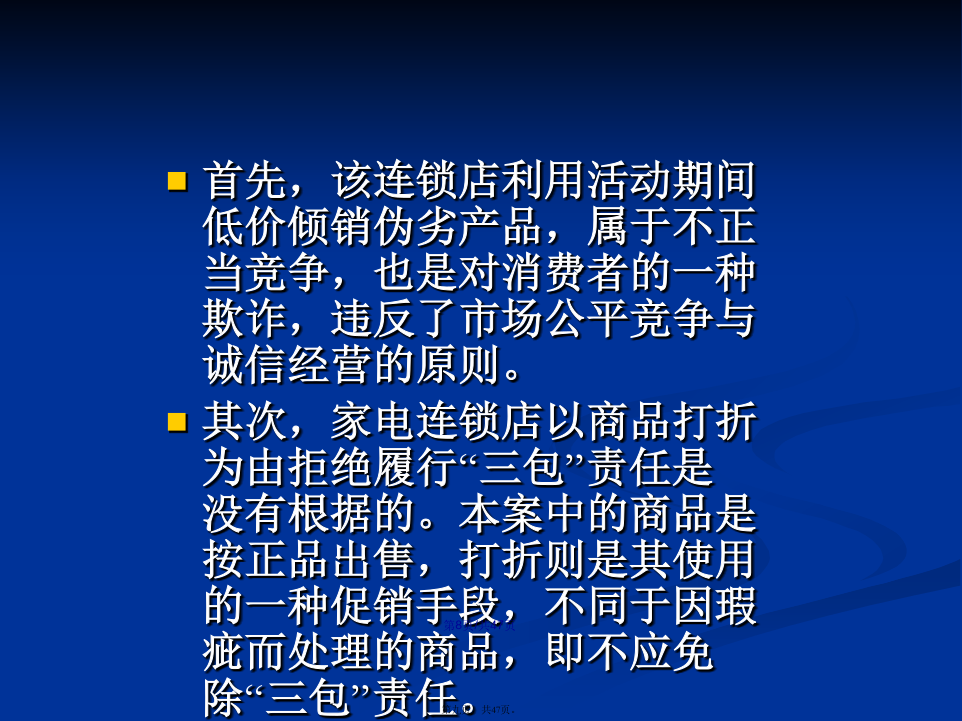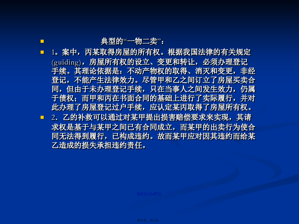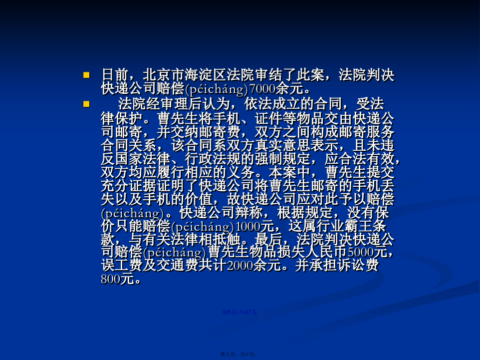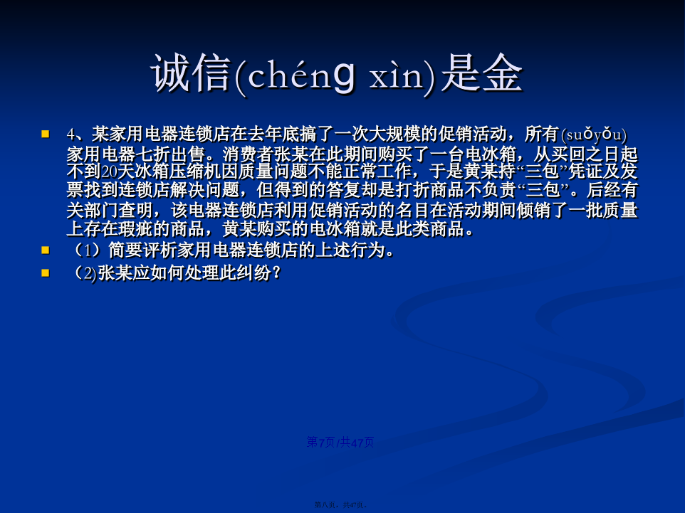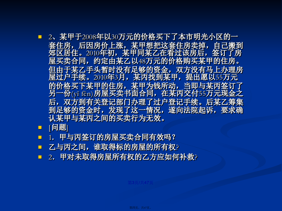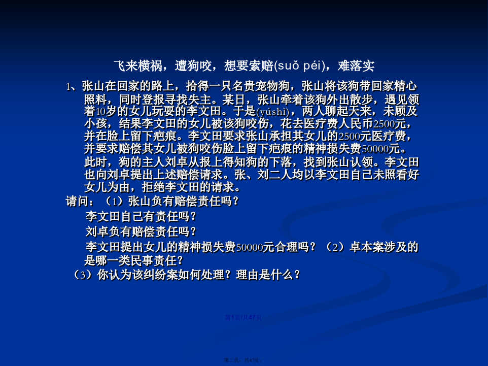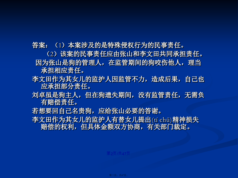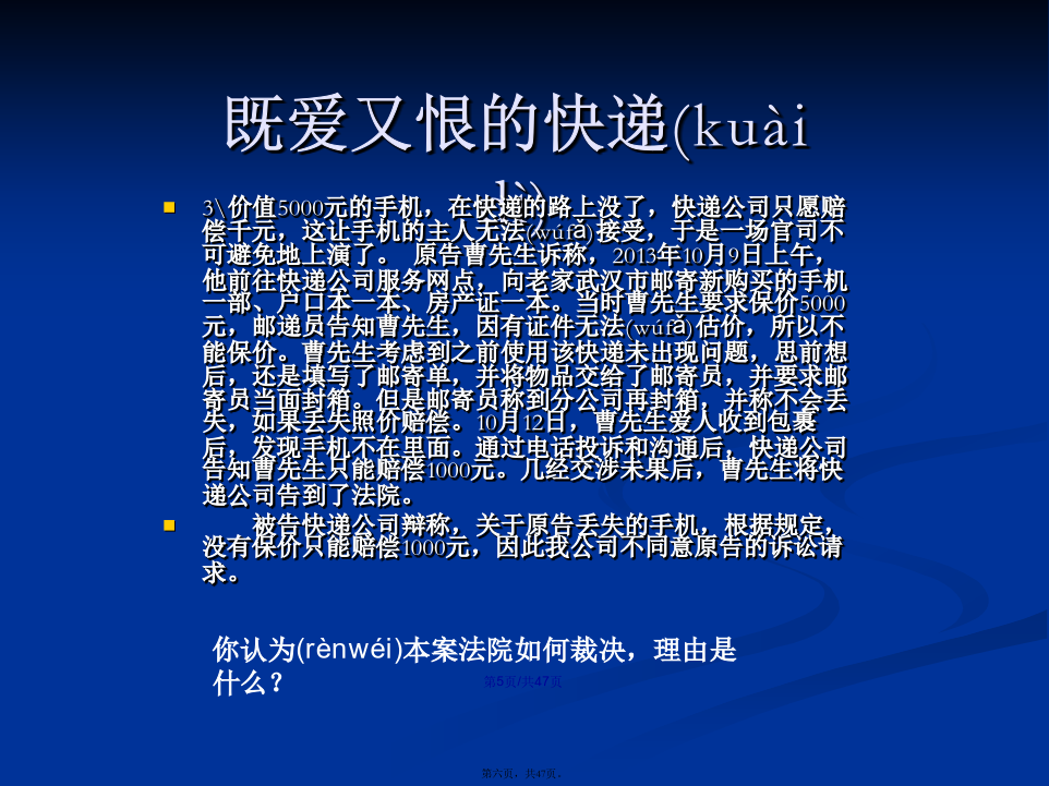 会计学1、张山在回家的路上,拾得一只名贵宠物狗,张山将该狗带回家精心照料,同时登报寻找失主。某日,张山牵着该狗外出散步,遇见领着10岁的女儿玩耍的李文田。于是(yúshì),两人聊起天来,未顾及小孩,结果李文田的女儿被该狗咬伤,花去医疗费人民币2500元,并在脸上留下疤痕。李文田要求张山承担其女儿的2500元医疗费,并要求赔偿其女儿被狗咬伤脸上留下疤痕的精神损失费50000元。此时,狗的主人刘卓从报上得知狗的下落,找到张山认领。李文田也向刘卓提出上述赔偿请求。张、刘二人均以李文田自己未照看好女儿为由,拒绝李文田的请求。请问:(1)张山负有赔偿责任吗?李文田自己有责任吗?刘卓负有赔偿责任吗?李文田提出女儿的精神损失费50000元合理吗?(2)卓本案涉及的是哪一类民事责任?(3)你认为该纠纷案如何处理?理由是什么?答案:(1)本案涉及的是特殊侵权行为的民事责任。(2)该案的民事责任应由张山和李文田共同承担责任。因为张山是狗的管理人,在监管期间的狗咬伤他人,理当承担相应责任。李文田作为其女儿的监护人因监管不力,造成后果,自己也应承担部分责任。刘卓虽是狗主人,但在狗遗失期间,没有监管责任,无需负有赔偿责任。若想要回自己名贵狗,应给张山必要的答谢。李文田作为其女儿的监护人有替女儿提出(tíchū)精神损失赔偿的权利,但具体金额双方协商,有关部门裁定。2、某甲于2008年以30万元的价格买下了本市明光小区的一套住房,后因房价上涨,某甲想把这套住房卖掉,自己搬到郊区居住。2010年初,某甲同某乙在看过该房后,签订了房屋买卖合同,约定由某乙以48万元的价格购买某甲的住房。但由于某乙手头暂时没有足够的资金,双方没有马上办理房屋过户手续。2010年3月,某丙找到某甲,提出愿以55万元的价格买下某甲的住房,某甲为钱所动,当即与某丙签订了另一份(yīfèn)房屋买卖书面合同,在某丙交付55万元现金之后,双方到有关登记部门办理了过户登记手续。后某乙筹集到足够的资金时,发现了这一情况,遂向法院起诉,要求确认某甲与某丙之间的买卖行为无效。[问题]1.甲与丙签订的房屋买卖合同有效吗?乙与丙之间,谁取得标的房屋的所有权?2.甲对未取得房屋所有权的乙方应如何补救?典型的“一物二卖”:1。案中,丙某取得房屋的所有权。根据我国法律的有关规定(guīdìng),房屋所有权的设立、变更和转让,必须办理登记手续。其理论依据是:不动产物权的取得、消灭和变更,非经登记,不能产生法律效力。尽管甲和乙之间订立了房屋买卖合同,但由于未办理登记手续,只在当事人之间发生效力,仍属于债权;而甲和丙在书面合同的基础上进行了实际履行,并对此办理了房屋登记过户手续,应认定某丙取得了房屋所有权。2.乙的补救可以通过对某甲提出损害赔偿要求来实现,其请求权是基于与某甲之间已有合同成立,而某甲的出卖行为使合同无法得到履行,已构成违约。故而某甲应对因其违约而给某乙造成的损失承担违约责任。既爱又恨的快递(kuàidì)日前,北京市海淀区法院审结了此案,法院判决快递公司赔偿(péicháng)7000余元。法院经审理后认为,依法成立的合同,受法律保护。曹先生将手机、证件等物品交由快递公司邮寄,并交纳邮寄费,双方之间构成邮寄服务合同关系,该合同系双方真实意思表示,且未违反国家法律、行政法规的强制规定,应合法有效,双方均应履行相应的义务。本案中,曹先生提交充分证据证明了快递公司将曹先生邮寄的手机丢失以及手机的价值,故快递公司应对此予以赔偿(péicháng)。快递公司辩称,根据规定,没有保价只能赔偿(péicháng)1000元,这属行业霸王条款,与有关法律相抵触。最后,法院判决快递公司赔偿(péicháng)曹先生物品损失人民币5000元,误工费及交通费共计2000余元。并承担诉讼费800元。诚信(chénɡxìn)是金首先,该连锁店利用活动期间低价倾销伪劣产品,属于不正当竞争,也是对消费者的一种欺诈,违反了市场公平竞争与诚信经营的原则。其次,家电连锁店以商品打折为由拒绝履行“三包”责任是没有根据的。本案中的商品是按正品出售,打折则是其使用的一种促销手段,不同于因瑕疵而处理的商品,即不应免除“三包”责任。再次(zàicì),家电连锁店的上述行为侵害了消费者的安全消费的权利、知情权和公平交易权,应当承担相应的侵权责任。一、课标要求引述从业劳动者的合法权利与义务,评议雇主和雇员发生(fāshēng)争议的案例,说明就业者依法维权的途径和方式。二、重点知识1.了解从业劳动者的合法权利和义务。2.评议劳动争议的案例,说明就业者依法维权的途径和方式。3.增强依法维权意识。案例1:十年前,徐女士在石化某厂工作,后来该厂与一家著名的化妆品公司联营,搞化妆品推销和美