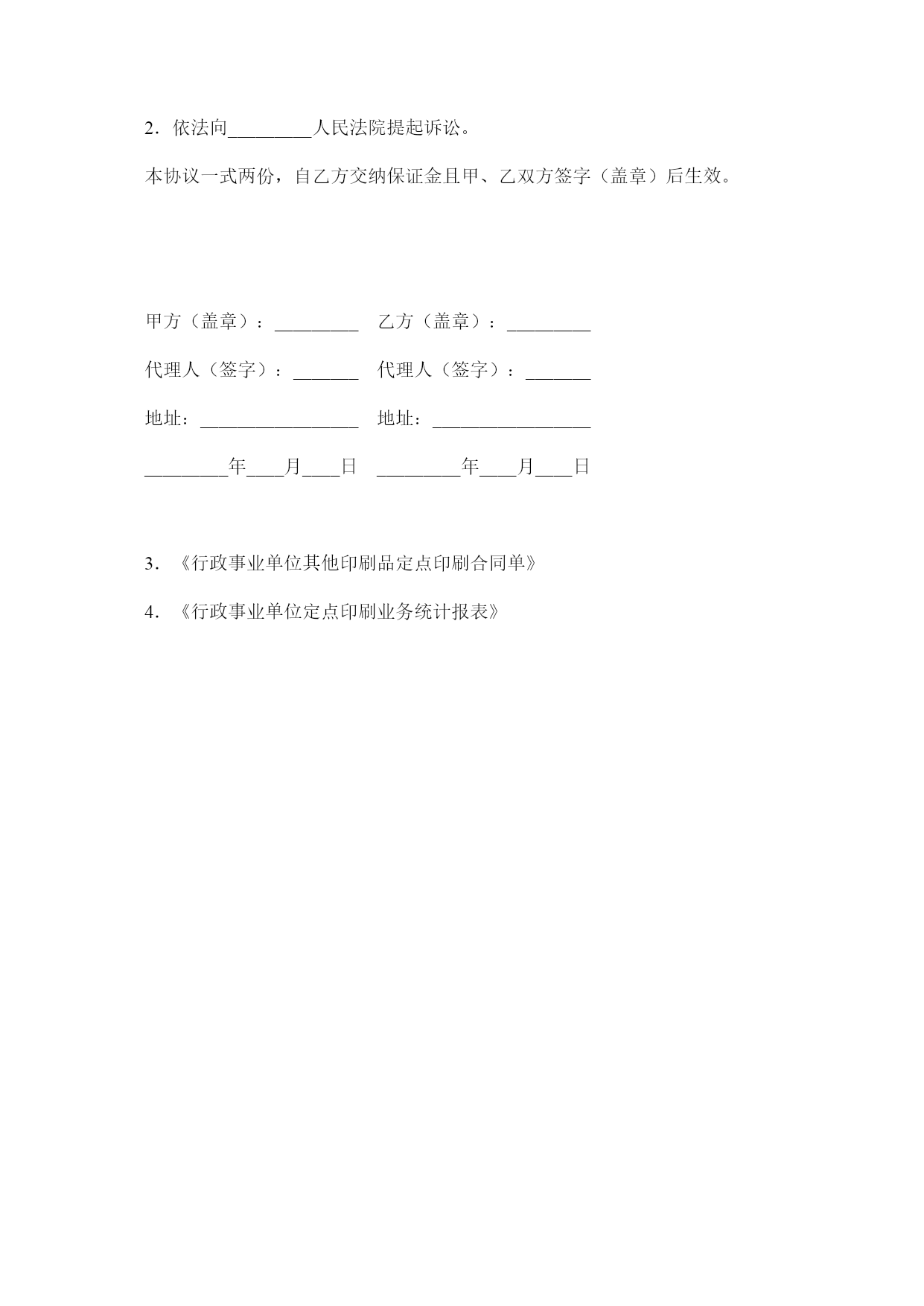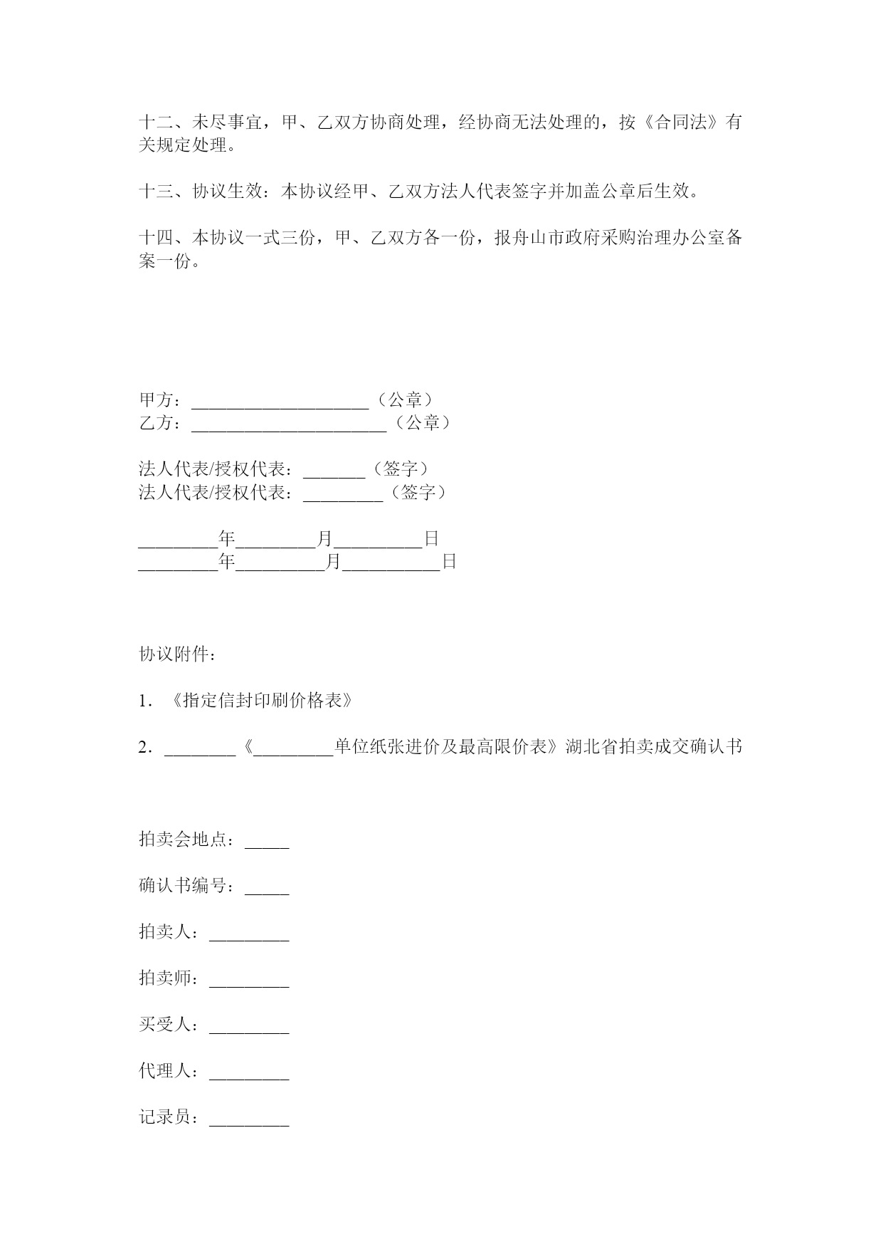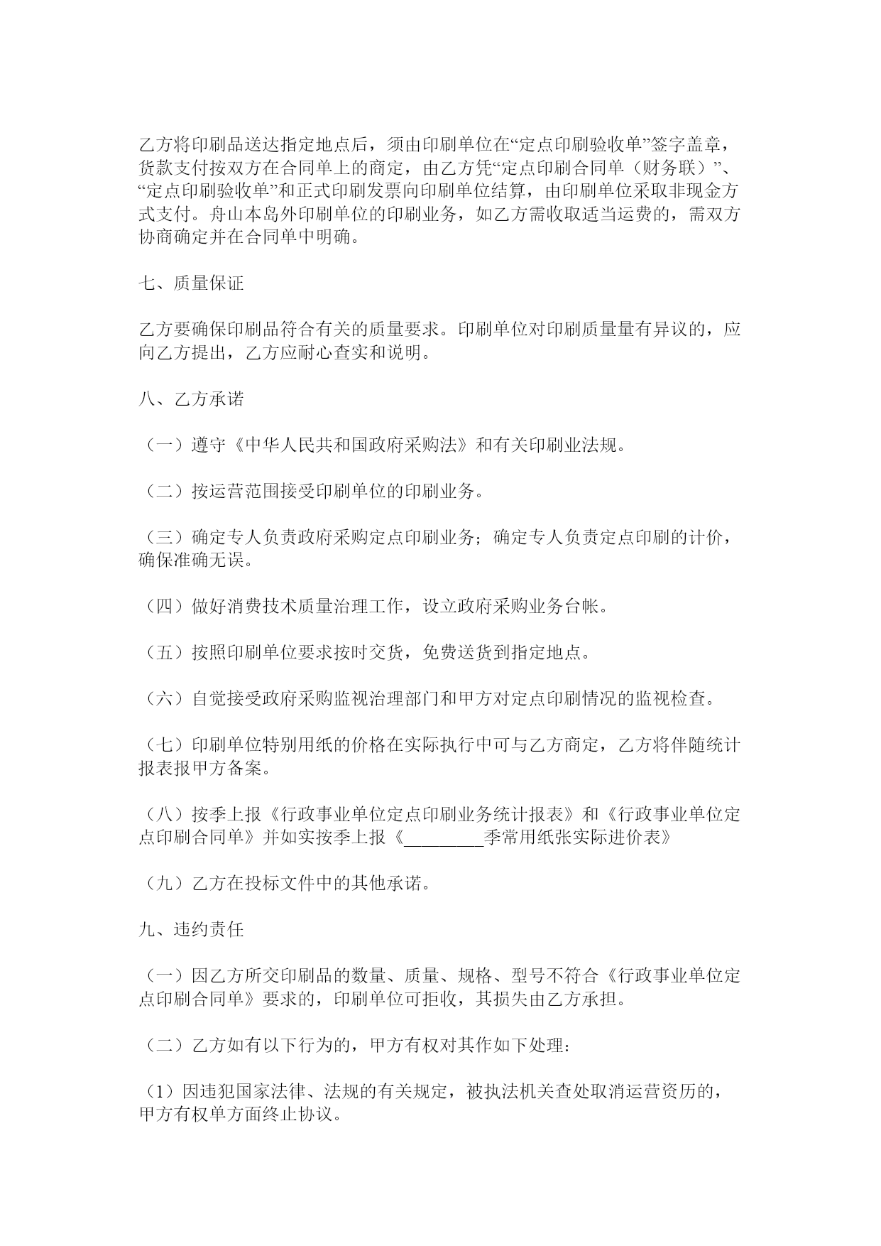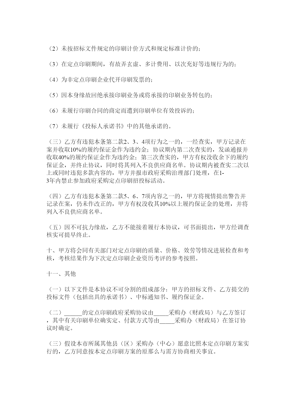 定点印刷政府采购协议甲方:_________乙方:_________甲方通过公开招标,评标小组综合评审,按招标文件规定程序,确定乙方为_________市本级行政事业单位定点印刷企业之一。为进一步明确双方的责任,确保印刷定点工作顺利开展,经双方协商签订本协议:一、定点印刷的效劳单位为需要印刷的_________市本级行政事业单位(以下称“印刷单位”)。二、定点印刷的业务范围包括指定信封印刷品。三、定点印刷产品的价格(一)指定信封印刷品价格表,见附件一;(二)常用纸张的实际进价及最高限价(注:实际进价可随市场价格变化而调整)见附件二。四、定点印刷时间为_________年_________月_________日至_________年_________月_________日。五、定点印刷方法由印刷单位在确定的定点印刷企业中自行选择。选择乙方时由双方签订“定点印刷合同单”(一式四份),明确印刷的详细要求和印刷费用等,乙方提供免费接印、送样、送货等一条龙上门效劳。六、付款方式乙方将印刷品送达指定地点后,须由印刷单位在“定点印刷验收单”签字盖章,货款支付按双方在合同单上的商定,由乙方凭“定点印刷合同单(财务联)”、“定点印刷验收单”和正式印刷发票向印刷单位结算,由印刷单位采取非现金方式支付。舟山本岛外印刷单位的印刷业务,如乙方需收取适当运费的,需双方协商确定并在合同单中明确。七、质量保证乙方要确保印刷品符合有关的质量要求。印刷单位对印刷质量量有异议的,应向乙方提出,乙方应耐心查实和说明。八、乙方承诺(一)遵守《中华人民共和国政府采购法》和有关印刷业法规。(二)按运营范围接受印刷单位的印刷业务。(三)确定专人负责政府采购定点印刷业务;确定专人负责定点印刷的计价,确保准确无误。(四)做好消费技术质量治理工作,设立政府采购业务台帐。(五)按照印刷单位要求按时交货,免费送货到指定地点。(六)自觉接受政府采购监视治理部门和甲方对定点印刷情况的监视检查。(七)印刷单位特别用纸的价格在实际执行中可与乙方商定,乙方将伴随统计报表报甲方备案。(八)按季上报《行政事业单位定点印刷业务统计报表》和《行政事业单位定点印刷合同单》并如实按季上报《_________季常用纸张实际进价表》(九)乙方在投标文件中的其他承诺。九、违约责任(一)因乙方所交印刷品的数量、质量、规格、型号不符合《行政事业单位定点印刷合同单》要求的,印刷单位可拒收,其损失由乙方承担。(二)乙方如有以下行为的,甲方有权对其作如下处理:(1)因违犯国家法律、法规的有关规定,被执法机关查处取消运营资历的,甲方有权单方面终止协议。(2)未按招标文件规定的印刷计价方式和规定标准计价的;(3)在定点印刷期间,有故弄玄虚、多计费用、以次充好等违规行为的;(4)为非定点印刷企业代开印刷发票的;(5)因本身缘故回绝承接印刷业务或将承接的印刷业务转包的;(6)未履行印刷合同的商定而遭到印刷单位有效投诉的;(7)未履行《投标人承诺书》中的其他承诺的。(三)乙方有违犯本条第二款2、3、4项行为之一的,一经查实,甲方记录在案并收取10%的履约保证金作为违约金;协议期内第二次查实的,发函通报并收取40%的履约保证金作为违约金;第三次查实的,甲方有权没收余下的履约保证金,并终止协议,同时将其列入不良供应商名单。协议期内被查实二次以上或同时违犯多款内容的,甲方并报市政府采购治理部门处理,在1-3年内禁止参加政府采购定点印刷招投标活动。(四)乙方有违犯本条第二款5、6、7项内容之一的,甲方将视情提出警告并记录在案,仍未作改正的,甲方有权没收其10%以上履约保证金的处理,并将列入不良供应商名单。(五)因不可抗力缘故,乙方不能接着履行本协议,可书面提出,甲方经调查核实可提早终止。十、甲方将会同有关部门对定点印刷的质量、价格、效劳等情况进展检查和考核,考核结果作为下次定点印刷企业资历考评的参考按照。十一、其他(一)以下文件是本协议不可分割的组成部分:甲方的招标文件、乙方提交的投标文件(包括出具的承诺书)、中标通知书、履约保证金。(二)______的定点印刷政府采购协议由_____采购办(财政局)与乙方签订,其中有关印刷单位确实定、付款方式等由_____采购办(财政局)在签订协议时确定。(三)假设本市所属其他县(区)采购办(中心)愿意比照本定点印刷方案实行的,乙方同意按本定点印刷方案的原那么与需方协商相关事宜。十二、未尽事宜,甲、乙双方协商处理,经协商无法处理的,按《合同法》有关规定处理。十三、协议生效:本协议经甲、乙双方法人代