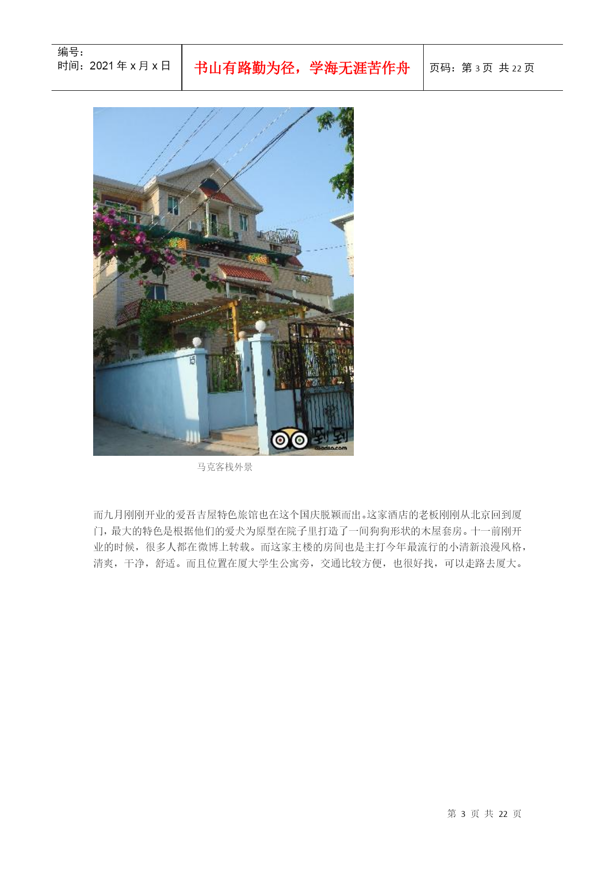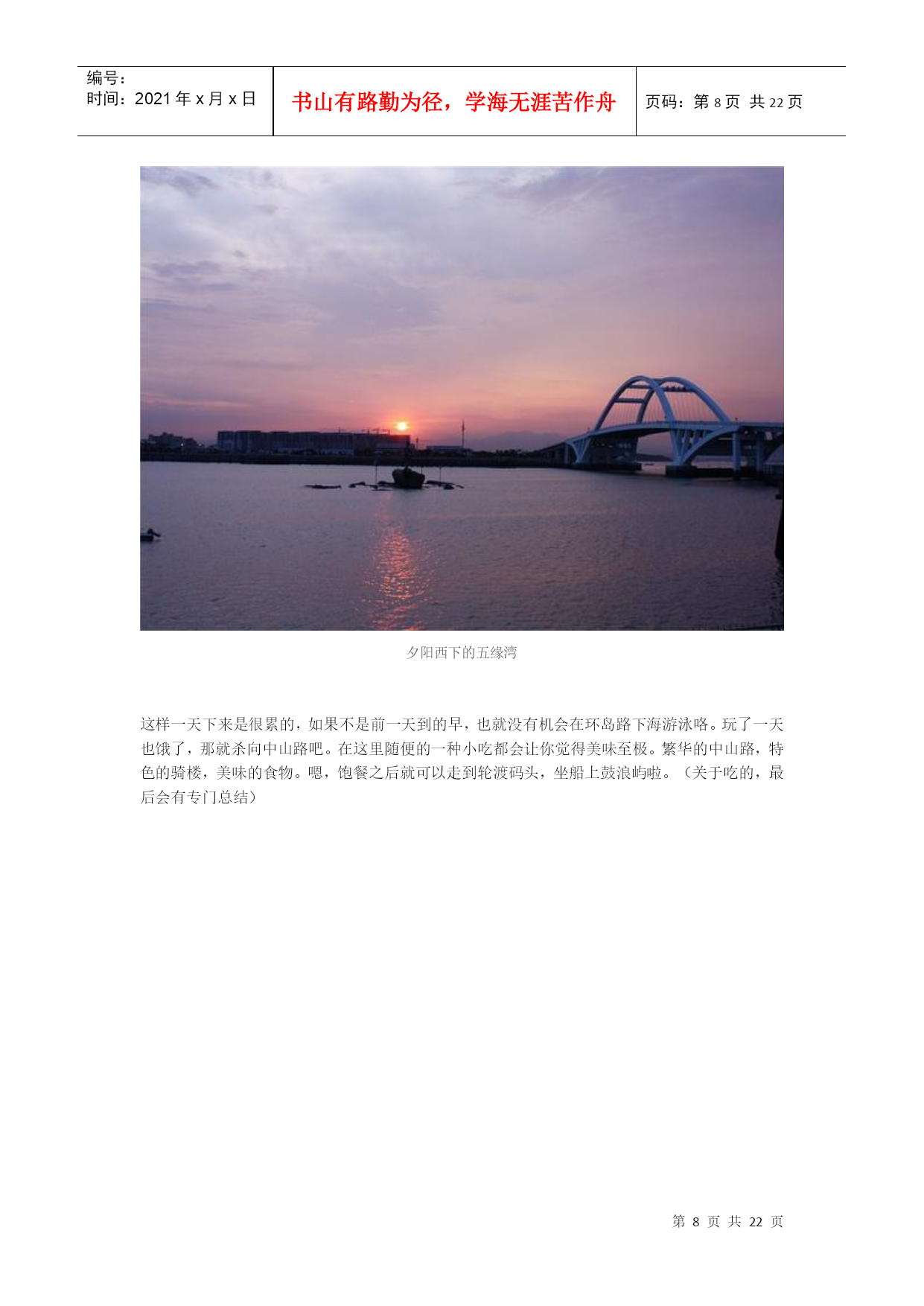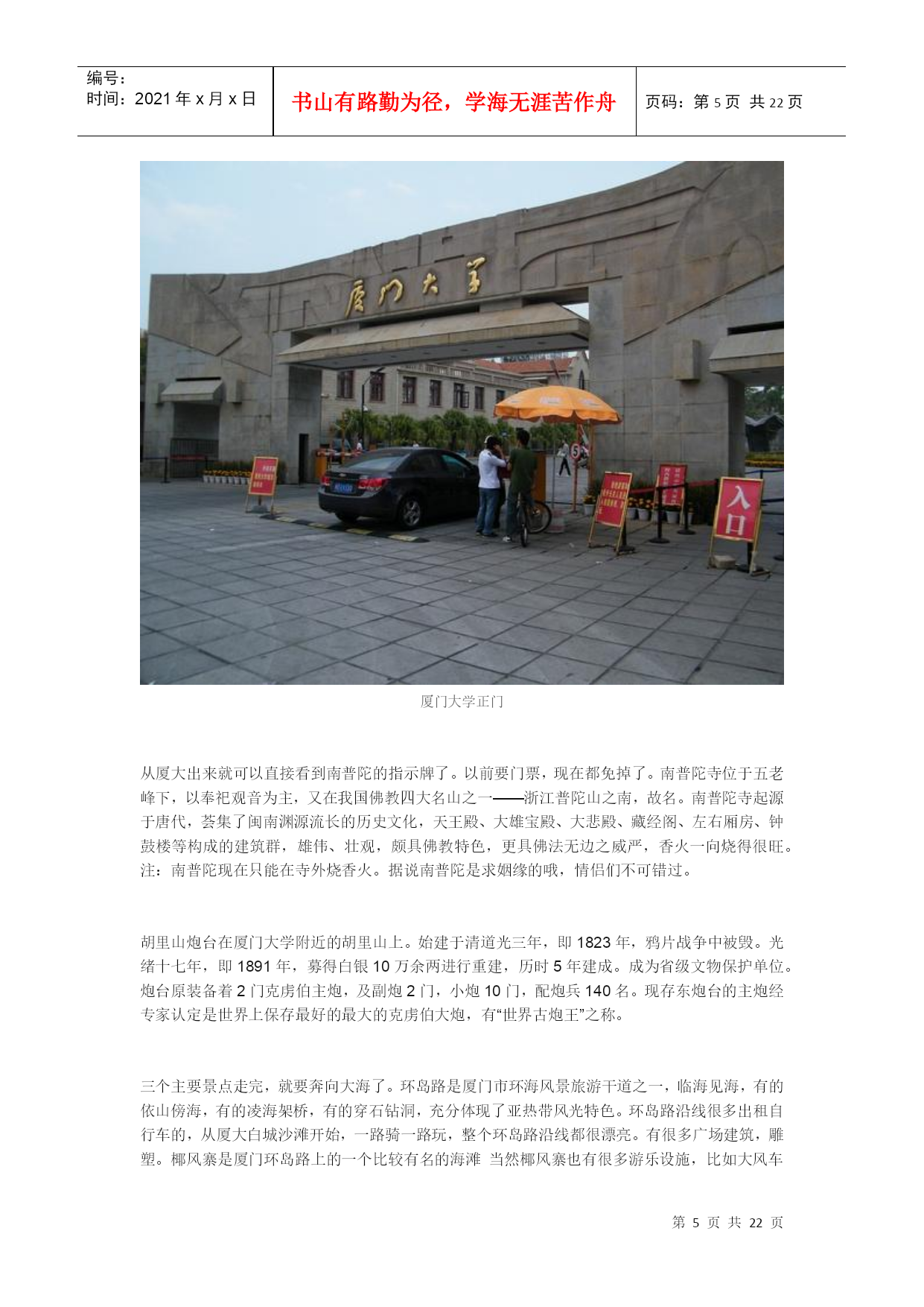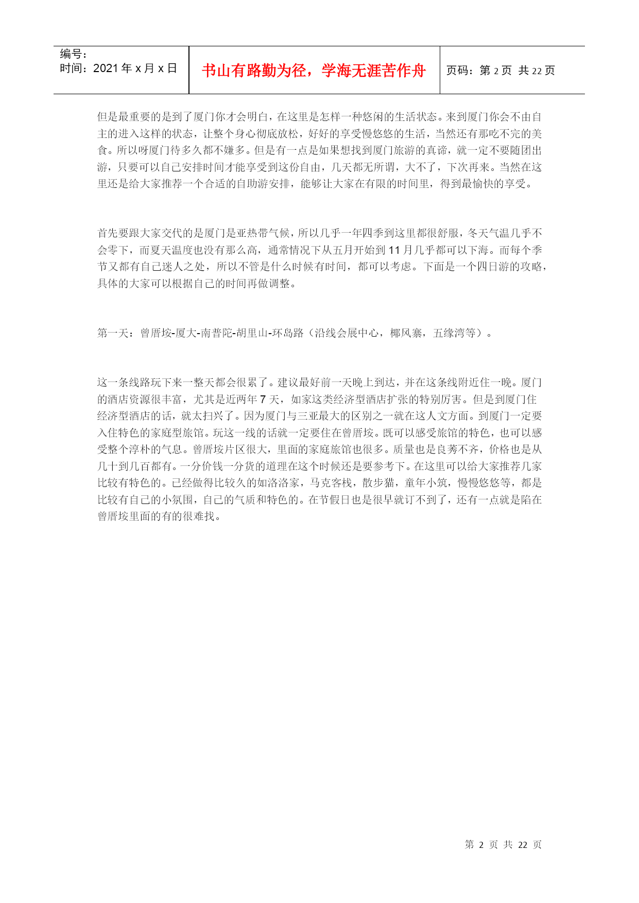 编号:时间:2021年x月x日书山有路勤为径,学海无涯苦作舟页码:第PAGE22页共NUMPAGES22页第PAGE\*MERGEFORMAT22页共NUMPAGES\*MERGEFORMAT22页如果你还没有去过厦门,那么这篇文章你一定要收藏,因为那是一个无论如何你都会去一次的城市。如果你已经去过厦门,那么这篇文章也一定会对你有所帮助,因为那是一个去了一次就一定会再想去的城市。当然如果你问厦门有什么好玩的,那恐怕却要让你失望了。厦门真的没什么好玩的。那么厦门又是为什么迷人呢?到厦门旅游的话又是几天合适呢?厦门厦门,一座风景优美的港口旅游城市。位于中国东南沿海,台湾海峡西岸,与金门诸岛一水之隔。厦门素有“海上花园”、“最温馨的城市”之美誉,是中国首批经济特区、中国东南沿海重要的中心城市、国际港口及海外游客首选的中国十大旅游城市之一。厦门气候宜人,年平均气温21摄氏度,现辖六个行政区,全市常住人口249万人。近年来荣获“中国优秀旅游城市”、“国际花园城市”、“国家卫生城市”、“全国十佳人居城市”、“联合国人居奖”、“全国文明城市”等称号。厦门的旅游资源丰富。目前,厦门拥有5A级景区1个,4A级景区8个。全国首批5A级景区鼓浪屿是厦门城市名片,素有“音乐之岛”、“万国建筑博览”的美誉,是来厦游客必去的地方。厦门的4A级景区分别为奇绝秀丽的园林植物园、“炮王”所在地胡里山炮台、自然与人文同馨的嘉庚公园、水上大观园之园林博览苑、大氧吧之天竺山、园林式的日月谷温泉、气势非凡的海沧大桥游览区、仿古式的同安影视城,无处不展现出厦门的美丽和温馨。但是最重要的是到了厦门你才会明白,在这里是怎样一种悠闲的生活状态。来到厦门你会不由自主的进入这样的状态,让整个身心彻底放松,好好的享受慢悠悠的生活,当然还有那吃不完的美食。所以呀厦门待多久都不嫌多。但是有一点是如果想找到厦门旅游的真谛,就一定不要随团出游,只要可以自己安排时间才能享受到这份自由,几天都无所谓,大不了,下次再来。当然在这里还是给大家推荐一个合适的自助游安排,能够让大家在有限的时间里,得到最愉快的享受。首先要跟大家交代的是厦门是亚热带气候,所以几乎一年四季到这里都很舒服,冬天气温几乎不会零下,而夏天温度也没有那么高,通常情况下从五月开始到11月几乎都可以下海。而每个季节又都有自己迷人之处,所以不管是什么时候有时间,都可以考虑。下面是一个四日游的攻略,具体的大家可以根据自己的时间再做调整。第一天:曾厝垵-厦大-南普陀-胡里山-环岛路(沿线会展中心,椰风寨,五缘湾等)。这一条线路玩下来一整天都会很累了。建议最好前一天晚上到达,并在这条线附近住一晚。厦门的酒店资源很丰富,尤其是近两年7天,如家这类经济型酒店扩张的特别厉害。但是到厦门住经济型酒店的话,就太扫兴了。因为厦门与三亚最大的区别之一就在这人文方面。到厦门一定要入住特色的家庭型旅馆。玩这一线的话就一定要住在曾厝垵。既可以感受旅馆的特色,也可以感受整个淳朴的气息。曾厝垵片区很大,里面的家庭旅馆也很多。质量也是良莠不齐,价格也是从几十到几百都有。一分价钱一分货的道理在这个时候还是要参考下。在这里可以给大家推荐几家比较有特色的。已经做得比较久的如洛洛家,马克客栈,散步猫,童年小筑,慢慢悠悠等,都是比较有自己的小氛围,自己的气质和特色的。在节假日也是很早就订不到了,还有一点就是陷在曾厝垵里面的有的很难找。马克客栈外景而九月刚刚开业的爱吾吉屋特色旅馆也在这个国庆脱颖而出。这家酒店的老板刚刚从北京回到厦门,最大的特色是根据他们的爱犬为原型在院子里打造了一间狗狗形状的木屋套房。十一前刚开业的时候,很多人都在微博上转载。而这家主楼的房间也是主打今年最流行的小清新浪漫风格,清爽,干净,舒适。而且位置在厦大学生公寓旁,交通比较方便,也很好找,可以走路去厦大。木狗套房外景及主楼有了一个好的睡眠之后,就要正式开始旅程了。在这里非常建议大家从公寓穿过芙蓉隧道走路去厦大。在这内壁混杂着涂鸦和广告的隧道里,你收获的不仅仅是被创意打动或搞笑。还可能找到曾经的梦想和感动。穿过芙蓉隧道就直接进入厦大校园了。学校规模很大,而且象座大花园,风景很不错。特别是女生宿舍楼,还能看得到海景,怪不得都说厦大是谈恋爱的胜地。校内有一片漂亮的湖泊,湖边的草坡上三三两两的坐着学生。湖边有个湖畔咖啡馆,如果走累了如果在这里喝杯咖啡,也是件很惬意的事。或者中午饿了,就到芙蓉餐厅去解决午饭也是不错的选择哦。厦门大学正门从厦大出来就可以直接看到南普陀的指示牌了。以前要门票,现在都免掉了。南普陀寺位于五老峰下,以奉祀观音为主,又在我国佛教四大名山之一——浙江普陀山之南,故名。南普陀寺起源于唐代,荟集了闽南渊源流长的历史文化,天王殿、大