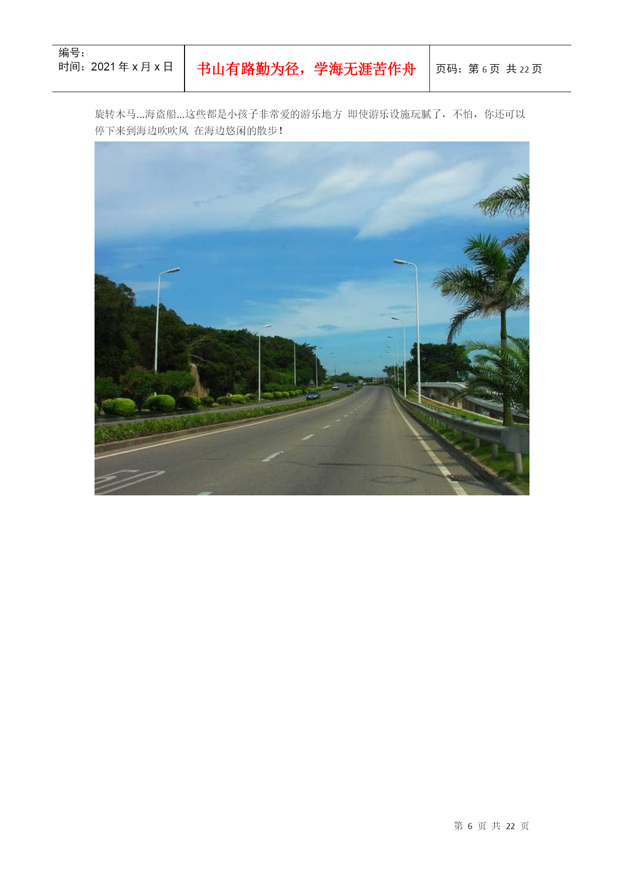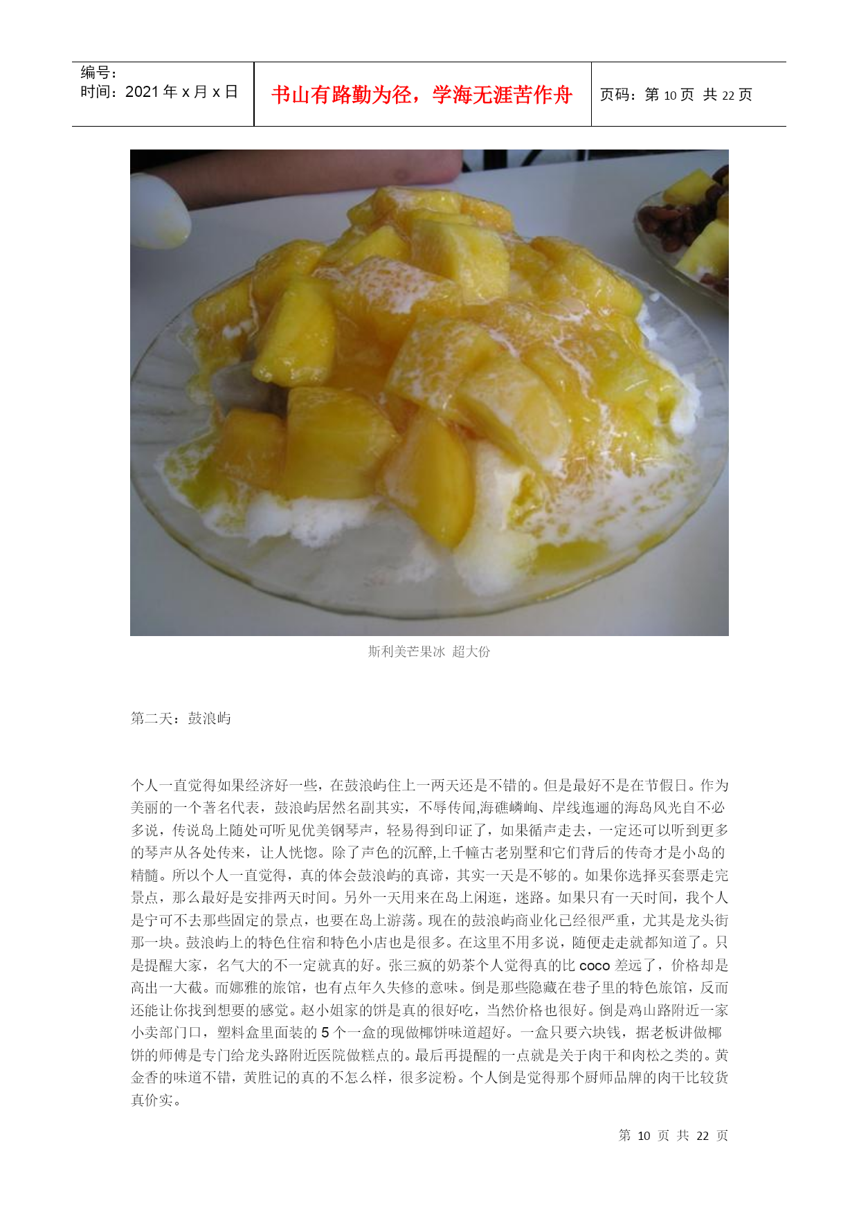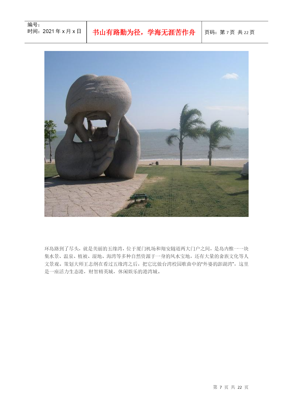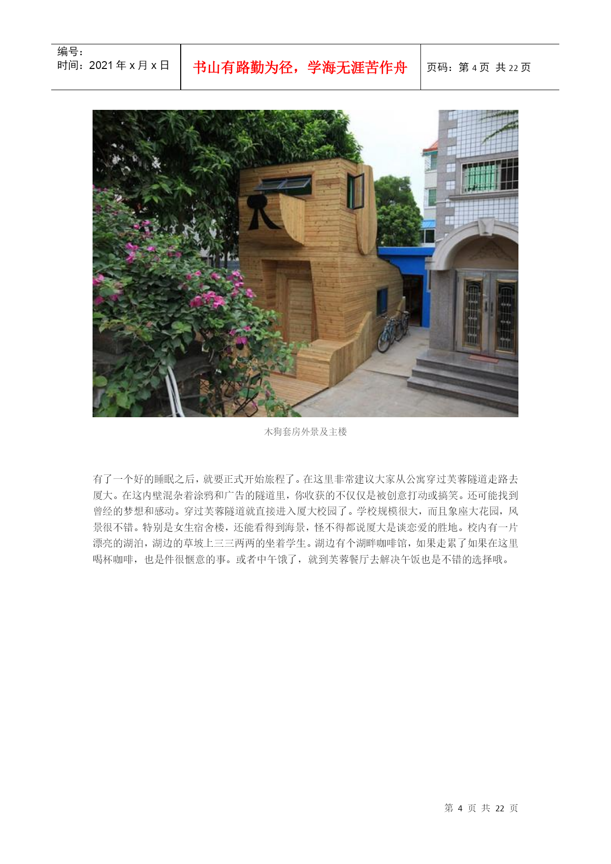 编号:时间:2021年x月x日书山有路勤为径,学海无涯苦作舟页码:第PAGE22页共NUMPAGES22页第PAGE\*MERGEFORMAT22页共NUMPAGES\*MERGEFORMAT22页如果你还没有去过厦门,那么这篇文章你一定要收藏,因为那是一个无论如何你都会去一次的城市。如果你已经去过厦门,那么这篇文章也一定会对你有所帮助,因为那是一个去了一次就一定会再想去的城市。当然如果你问厦门有什么好玩的,那恐怕却要让你失望了。厦门真的没什么好玩的。那么厦门又是为什么迷人呢?到厦门旅游的话又是几天合适呢?厦门厦门,一座风景优美的港口旅游城市。位于中国东南沿海,台湾海峡西岸,与金门诸岛一水之隔。厦门素有“海上花园”、“最温馨的城市”之美誉,是中国首批经济特区、中国东南沿海重要的中心城市、国际港口及海外游客首选的中国十大旅游城市之一。厦门气候宜人,年平均气温21摄氏度,现辖六个行政区,全市常住人口249万人。近年来荣获“中国优秀旅游城市”、“国际花园城市”、“国家卫生城市”、“全国十佳人居城市”、“联合国人居奖”、“全国文明城市”等称号。厦门的旅游资源丰富。目前,厦门拥有5A级景区1个,4A级景区8个。全国首批5A级景区鼓浪屿是厦门城市名片,素有“音乐之岛”、“万国建筑博览”的美誉,是来厦游客必去的地方。厦门的4A级景区分别为奇绝秀丽的园林植物园、“炮王”所在地胡里山炮台、自然与人文同馨的嘉庚公园、水上大观园之园林博览苑、大氧吧之天竺山、园林式的日月谷温泉、气势非凡的海沧大桥游览区、仿古式的同安影视城,无处不展现出厦门的美丽和温馨。但是最重要的是到了厦门你才会明白,在这里是怎样一种悠闲的生活状态。来到厦门你会不由自主的进入这样的状态,让整个身心彻底放松,好好的享受慢悠悠的生活,当然还有那吃不完的美食。所以呀厦门待多久都不嫌多。但是有一点是如果想找到厦门旅游的真谛,就一定不要随团出游,只要可以自己安排时间才能享受到这份自由,几天都无所谓,大不了,下次再来。当然在这里还是给大家推荐一个合适的自助游安排,能够让大家在有限的时间里,得到最愉快的享受。首先要跟大家交代的是厦门是亚热带气候,所以几乎一年四季到这里都很舒服,冬天气温几乎不会零下,而夏天温度也没有那么高,通常情况下从五月开始到11月几乎都可以下海。而每个季节又都有自己迷人之处,所以不管是什么时候有时间,都可以考虑。下面是一个四日游的攻略,具体的大家可以根据自己的时间再做调整。第一天:曾厝垵-厦大-南普陀-胡里山-环岛路(沿线会展中心,椰风寨,五缘湾等)。这一条线路玩下来一整天都会很累了。建议最好前一天晚上到达,并在这条线附近住一晚。厦门的酒店资源很丰富,尤其是近两年7天,如家这类经济型酒店扩张的特别厉害。但是到厦门住经济型酒店的话,就太扫兴了。因为厦门与三亚最大的区别之一就在这人文方面。到厦门一定要入住特色的家庭型旅馆。玩这一线的话就一定要住在曾厝垵。既可以感受旅馆的特色,也可以感受整个淳朴的气息。曾厝垵片区很大,里面的家庭旅馆也很多。质量也是良莠不齐,价格也是从几十到几百都有。一分价钱一分货的道理在这个时候还是要参考下。在这里可以给大家推荐几家比较有特色的。已经做得比较久的如洛洛家,马克客栈,散步猫,童年小筑,慢慢悠悠等,都是比较有自己的小氛围,自己的气质和特色的。在节假日也是很早就订不到了,还有一点就是陷在曾厝垵里面的有的很难找。马克客栈外景而九月刚刚开业的爱吾吉屋特色旅馆也在这个国庆脱颖而出。这家酒店的老板刚刚从北京回到厦门,最大的特色是根据他们的爱犬为原型在院子里打造了一间狗狗形状的木屋套房。十一前刚开业的时候,很多人都在微博上转载。而这家主楼的房间也是主打今年最流行的小清新浪漫风格,清爽,干净,舒适。而且位置在厦大学生公寓旁,交通比较方便,也很好找,可以走路去厦大。木狗套房外景及主楼有了一个好的睡眠之后,就要正式开始旅程了。在这里非常建议大家从公寓穿过芙蓉隧道走路去厦大。在这内壁混杂着涂鸦和广告的隧道里,你收获的不仅仅是被创意打动或搞笑。还可能找到曾经的梦想和感动。穿过芙蓉隧道就直接进入厦大校园了。学校规模很大,而且象座大花园,风景很不错。特别是女生宿舍楼,还能看得到海景,怪不得都说厦大是谈恋爱的胜地。校内有一片漂亮的湖泊,湖边的草坡上三三两两的坐着学生。湖边有个湖畔咖啡馆,如果走累了如果在这里喝杯咖啡,也是件很惬意的事。或者中午饿了,就到芙蓉餐厅去解决午饭也是不错的选择哦。厦门大学正门从厦大出来就可以直接看到南普陀的指示牌了。以前要门票,现在都免掉了。南普陀寺位于五老峰下,以奉祀观音为主,又在我国佛教四大名山之一——浙江普陀山之南,故名。南普陀寺起源于唐代,荟集了闽南渊源流长的历史文化,天王殿、大