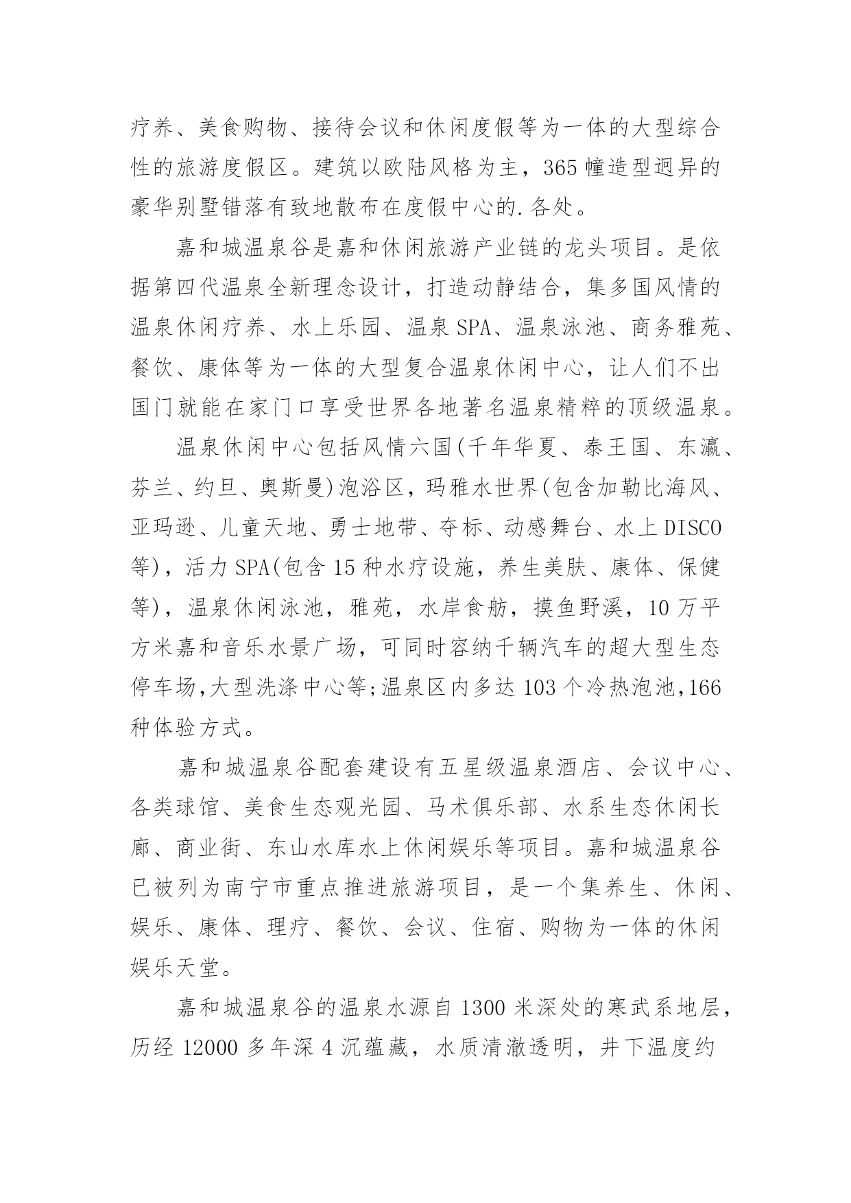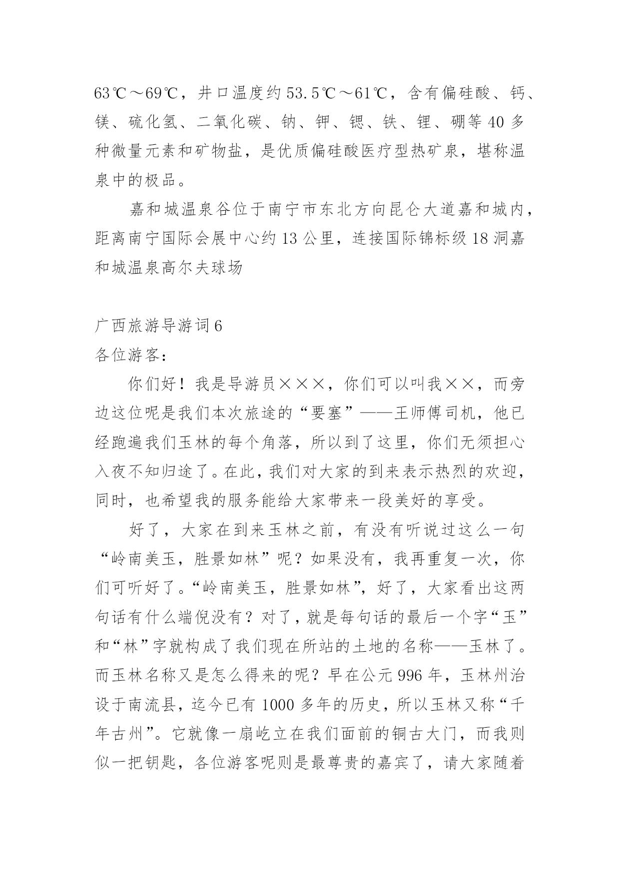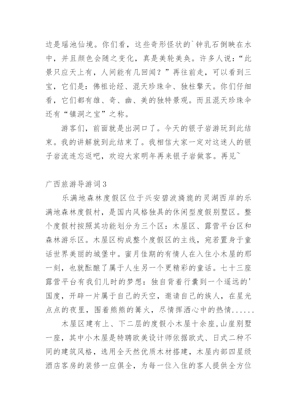广西旅游导游词作为一名具备丰富知识的导游,通常需要准备好一份导游词,导游词作为一种解说的文体,它的作用是帮助游客在旅游的同时更好地理解所旅游的景点包含的文化背景和历史意义。那么问题来了,导游词应该怎么写?以下是小编整理的广西旅游导游词,欢迎大家分享。广西旅游导游词1大家好,我是你们的导游,下面我给大家简单介绍一下青秀山。青秀山又名青山,是南宁的国家AAAAA级景区。泰青岭,因林木青翠,山势秀拔而得名。它海拔有289米,占地近78公顷,山上林木茂盛遮天蔽日,清风吹过时,发出海涛般的声浪,形成青山著名一景――青山松涛。青秀山顶上耸立的宝塔叫龙象塔,俗称青山塔,它是青秀山的象征,始建于明万历年间,共有九层,高60米,塔基直径12米,有207级旋梯,为广西最高的塔。登上塔顶,可眺望远近一二十里的风光,南宁城景色更是一览无遗。与满山青翠的树木相映的是山腰上天池和瑶池这两个巨大的人工湖。天池面积达15000平方米,水深2—3米,池水波光粼粼,青松翠柏、蓝天白云倒映水中瑶池位于供有壮族女神洛甲、聪明女神布劣陀和勇敢之神布伯三尊石神像的.佛堂“三宝堂”的东边,面积5000平方米,池中立有王母娘娘塑像59作,东沿岸的花岗岩青石上刻有八仙聚会瑶池的浮雕图,形态栩栩如生。与满山青翠的树木相映衬的是山腰上天池和瑶池这两个巨大的人工湖。天池面积达到一万五千平方米,水深2-3米,池水波光粼粼,青松翠柏、蓝天白云倒影水中。好了,下面大家自由活动,一会集合。广西旅游导游词2各位游客大家好!我是你们这次游览的导游,我叫梁子彦大家可以叫我梁导。今天,就由我来带领大家游览美丽的银子岩。大家注意了,进洞后整个游程需要一个半小时,因洞内光线较暗、地面湿滑,注意安全。请跟紧我,不要掉队。请大家随我进洞,这个洞从外面看和平常的山洞没有什么不同,可洞里藏着宝贝呢!银子岩是世界级岩溶艺术宝库。最为著名的景观有“三绝”和“三宝”。三绝包括:雪山飞瀑、音乐石屏、瑶池仙境。它们都是天然形成的。请看雪山飞瀑它是由一些石头长在一起,慢慢形成一个个大大的“雪球”,再由许多雪球叠加起来,看上去就像石崖上万道流水奔泻,形成一匹银瀑。这些石头银光闪闪,雪白晶莹,人们称它为“雪山飞瀑”。这组音乐石屏是由上百根石柱、石幔、石片组合而成的石屏,轻轻拍打它就会奏出空灵的仙乐。那边是瑶池仙境。你们看,这些奇形怪状的`钟乳石倒映在水中,并且颜色会随之变化,真是美轮美奂。许多人说:“此景只应天上有,人间能有几回闻?”再往前走,可以看到三宝,它们是:佛祖论经、混天珍珠伞、独柱擎天。你们仔细看,它们都有雄、奇、幽、美的独特景观。而且混天珍珠伞还有“镇洞之宝”之称。游客们,前面就是出洞口了。今天的银子岩游玩到此结束。我的讲解就到此结束了。我相信大家一定对这迷人的银子岩流连忘返吧,欢迎大家明年再来银子岩做客。再见~广西旅游导游词3乐满地森林度假区位于兴安碧波旖旎的灵湖西岸的乐满地森林度假村,是国内风格独具的休闲型度假别墅区。整个度假村按照其功能划分为三个区:木屋区、露营平台区和森林游乐区。木屋区构成整个度假区的主线,宛若置身于童话世界美丽的城堡中。蜜月佳期的有情人在入住小木屋的那一刻,也就酝酿了属于人生另一个更精彩的童话。七十三座露营平台有我们儿时的梦想:独自背着行囊到一个遥远的'国度,开辟一片属于自己的天空,邀请自己的族人,在星光点点的夜里,围着熊熊的篝火,尽情挥洒心中的热情......木屋区建有上、下二层的度假小木屋十余座,山崖别墅一座,其中小木屋是特聘欧美设计师依据欧式、日式二种不同的建筑风格,选用全天然优质木材搭建,木屋内部四星级酒店客房的装修一应俱全,为每一位入住的客人提供全方位服务。阳光里,凭窗眺望,黄墙红瓦,碧波环绕;月光下,漫步林间,蛙鼓虫鸣,星月如练。正是这绝佳意境与齐备设施的完美融合,为您勾勒了一幅幽雅、闲逸、美伦美奂的休闲图画。露营平台则是风格迥异的开放型度假住宿区,全区建有全木质开放式露营平台73座,游人们三五成群,结伴露营,或在营火区点燃篝火,彻夜狂欢,或在平台前秉烛围坐,把酒邀月,自然纯朴的气息扑面而来,伴您渡过充满青春活力的多彩良霄。紧邻露营平台区的是异彩纷呈的森林游乐区,其中匠心独具的亲水渠道,厚重古朴的壮乡风雨桥,曲径通幽的情人步道,灿烂璀璨的茶花谷,一线牵情的月老阁,更有惊心动魄的霹雳滑车、人工滑草场……每一处布局的点点滴滴都折射出整个项目精雕细琢折夺人光彩,再加上周围混然天成的自然景观,将整个森林度假村的独特魅力展现无余。休闲旅馆以五星极标准建成,占地100余亩,拥有368间高级客房,另设中西餐厅,商场,9个可容纳30-500人的会议厅及舞厅,KTV,SPA,娱乐室和室内外游泳池,网球场,烧烤区等综合设施。主题乐园特聘美国迪士尼乐园专家MagicMountain设计,占地约