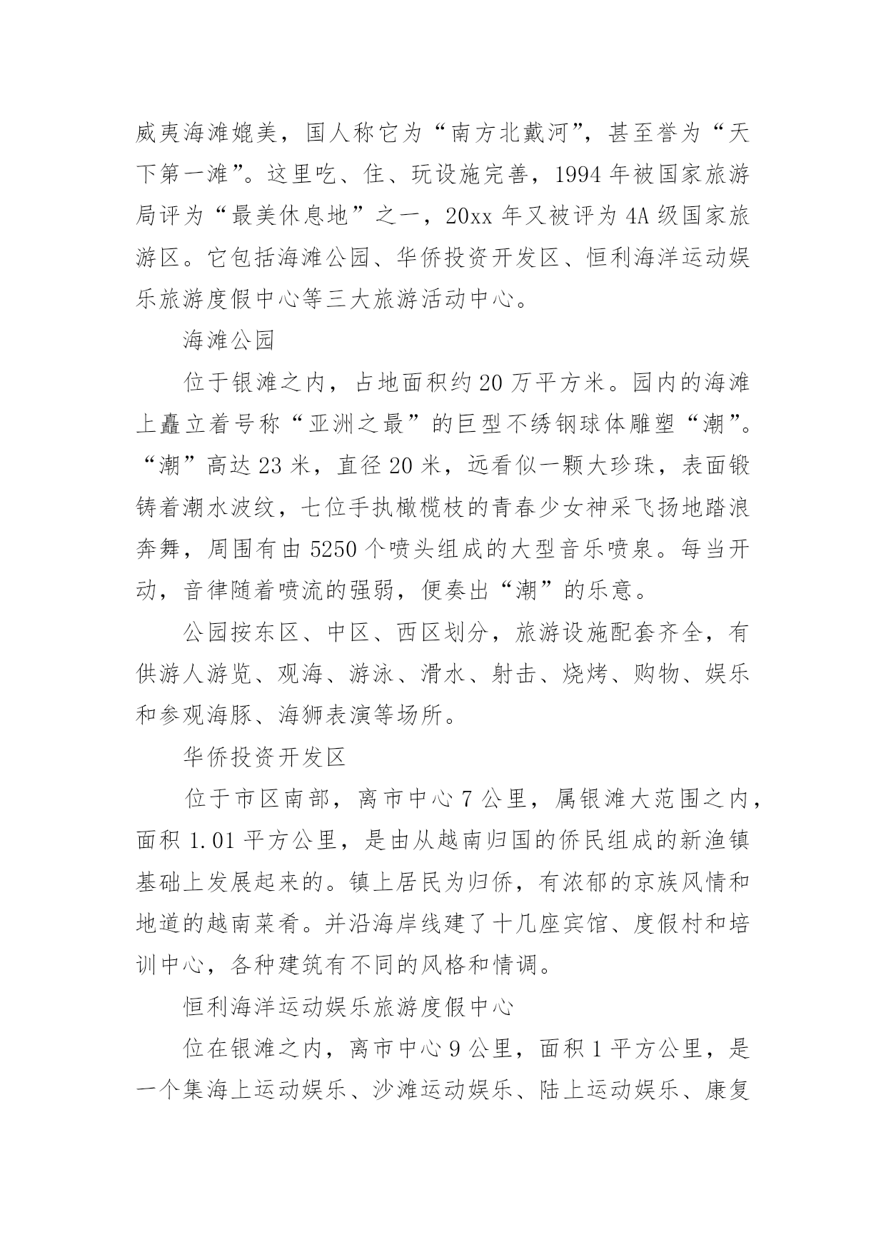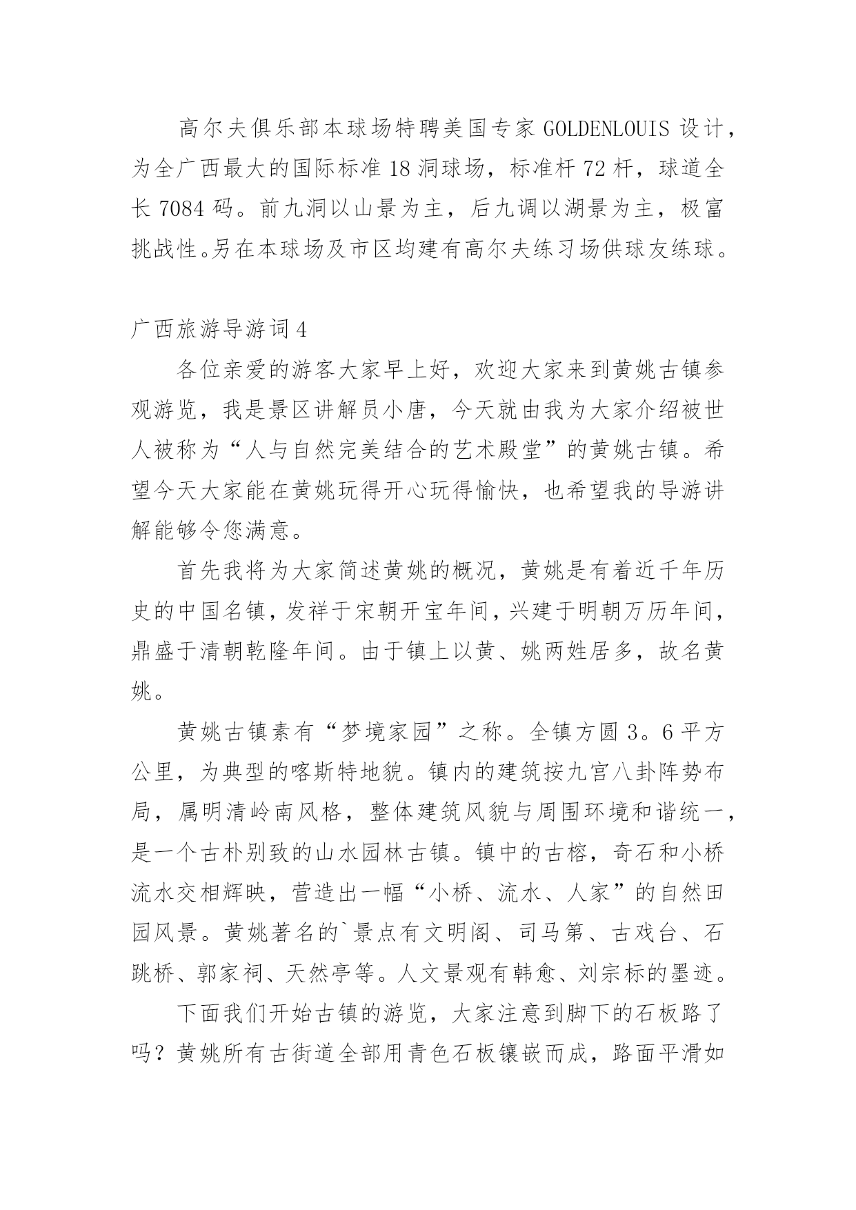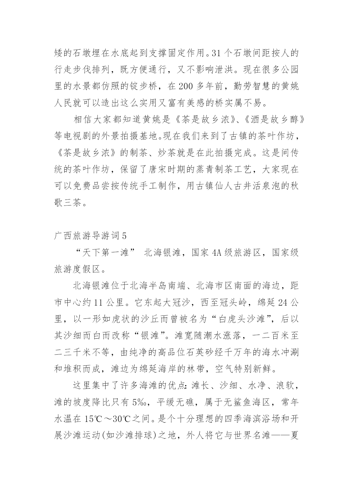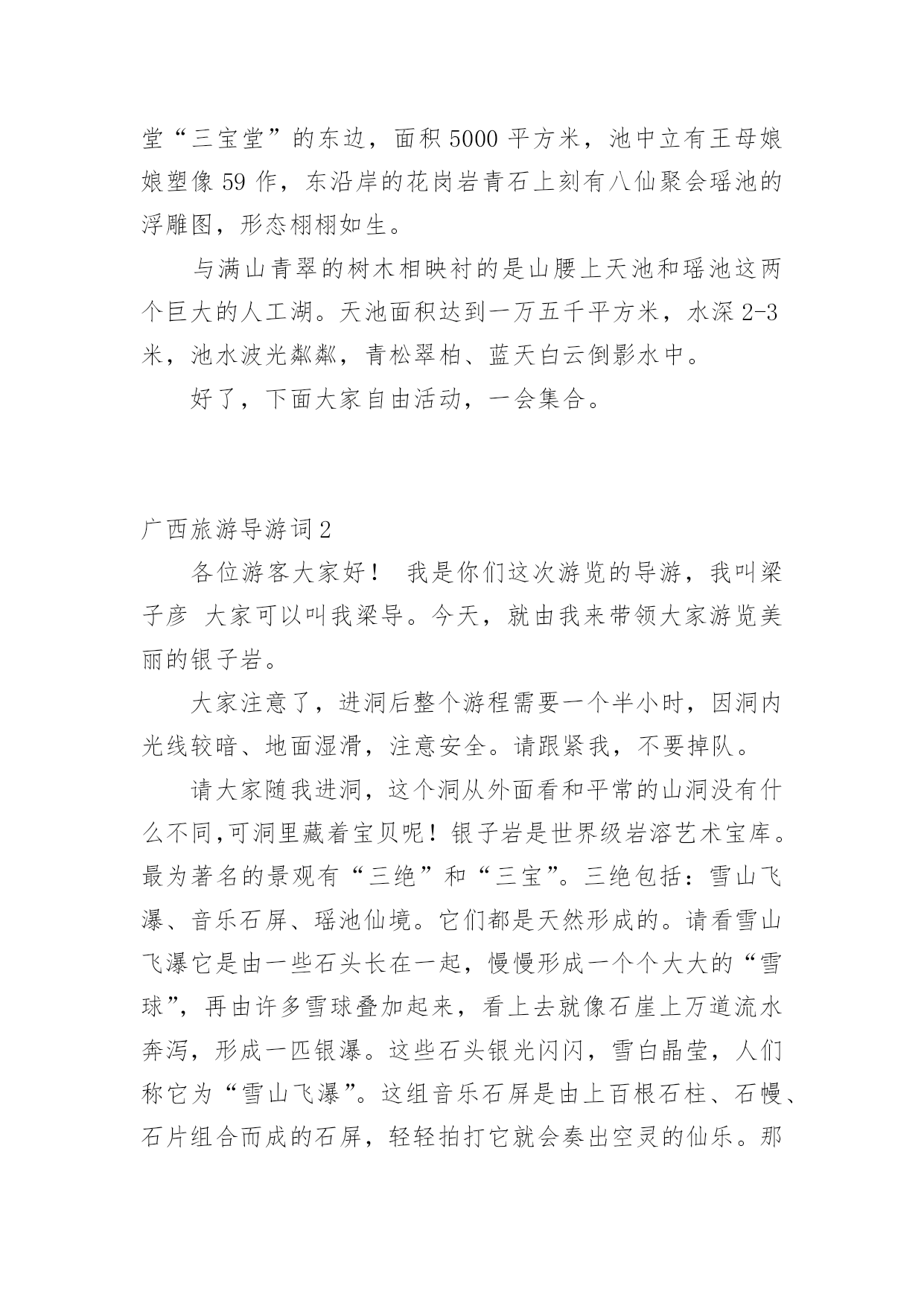 广西旅游导游词作为一名具备丰富知识的导游,通常需要准备好一份导游词,导游词作为一种解说的文体,它的作用是帮助游客在旅游的同时更好地理解所旅游的景点包含的文化背景和历史意义。那么问题来了,导游词应该怎么写?以下是小编整理的广西旅游导游词,欢迎大家分享。广西旅游导游词1大家好,我是你们的导游,下面我给大家简单介绍一下青秀山。青秀山又名青山,是南宁的国家AAAAA级景区。泰青岭,因林木青翠,山势秀拔而得名。它海拔有289米,占地近78公顷,山上林木茂盛遮天蔽日,清风吹过时,发出海涛般的声浪,形成青山著名一景――青山松涛。青秀山顶上耸立的宝塔叫龙象塔,俗称青山塔,它是青秀山的象征,始建于明万历年间,共有九层,高60米,塔基直径12米,有207级旋梯,为广西最高的塔。登上塔顶,可眺望远近一二十里的风光,南宁城景色更是一览无遗。与满山青翠的树木相映的是山腰上天池和瑶池这两个巨大的人工湖。天池面积达15000平方米,水深2—3米,池水波光粼粼,青松翠柏、蓝天白云倒映水中瑶池位于供有壮族女神洛甲、聪明女神布劣陀和勇敢之神布伯三尊石神像的.佛堂“三宝堂”的东边,面积5000平方米,池中立有王母娘娘塑像59作,东沿岸的花岗岩青石上刻有八仙聚会瑶池的浮雕图,形态栩栩如生。与满山青翠的树木相映衬的是山腰上天池和瑶池这两个巨大的人工湖。天池面积达到一万五千平方米,水深2-3米,池水波光粼粼,青松翠柏、蓝天白云倒影水中。好了,下面大家自由活动,一会集合。广西旅游导游词2各位游客大家好!我是你们这次游览的导游,我叫梁子彦大家可以叫我梁导。今天,就由我来带领大家游览美丽的银子岩。大家注意了,进洞后整个游程需要一个半小时,因洞内光线较暗、地面湿滑,注意安全。请跟紧我,不要掉队。请大家随我进洞,这个洞从外面看和平常的山洞没有什么不同,可洞里藏着宝贝呢!银子岩是世界级岩溶艺术宝库。最为著名的景观有“三绝”和“三宝”。三绝包括:雪山飞瀑、音乐石屏、瑶池仙境。它们都是天然形成的。请看雪山飞瀑它是由一些石头长在一起,慢慢形成一个个大大的“雪球”,再由许多雪球叠加起来,看上去就像石崖上万道流水奔泻,形成一匹银瀑。这些石头银光闪闪,雪白晶莹,人们称它为“雪山飞瀑”。这组音乐石屏是由上百根石柱、石幔、石片组合而成的石屏,轻轻拍打它就会奏出空灵的仙乐。那边是瑶池仙境。你们看,这些奇形怪状的`钟乳石倒映在水中,并且颜色会随之变化,真是美轮美奂。许多人说:“此景只应天上有,人间能有几回闻?”再往前走,可以看到三宝,它们是:佛祖论经、混天珍珠伞、独柱擎天。你们仔细看,它们都有雄、奇、幽、美的独特景观。而且混天珍珠伞还有“镇洞之宝”之称。游客们,前面就是出洞口了。今天的银子岩游玩到此结束。我的讲解就到此结束了。我相信大家一定对这迷人的银子岩流连忘返吧,欢迎大家明年再来银子岩做客。再见~广西旅游导游词3乐满地森林度假区位于兴安碧波旖旎的灵湖西岸的乐满地森林度假村,是国内风格独具的休闲型度假别墅区。整个度假村按照其功能划分为三个区:木屋区、露营平台区和森林游乐区。木屋区构成整个度假区的主线,宛若置身于童话世界美丽的城堡中。蜜月佳期的有情人在入住小木屋的那一刻,也就酝酿了属于人生另一个更精彩的童话。七十三座露营平台有我们儿时的梦想:独自背着行囊到一个遥远的'国度,开辟一片属于自己的天空,邀请自己的族人,在星光点点的夜里,围着熊熊的篝火,尽情挥洒心中的热情......木屋区建有上、下二层的度假小木屋十余座,山崖别墅一座,其中小木屋是特聘欧美设计师依据欧式、日式二种不同的建筑风格,选用全天然优质木材搭建,木屋内部四星级酒店客房的装修一应俱全,为每一位入住的客人提供全方位服务。阳光里,凭窗眺望,黄墙红瓦,碧波环绕;月光下,漫步林间,蛙鼓虫鸣,星月如练。正是这绝佳意境与齐备设施的完美融合,为您勾勒了一幅幽雅、闲逸、美伦美奂的休闲图画。露营平台则是风格迥异的开放型度假住宿区,全区建有全木质开放式露营平台73座,游人们三五成群,结伴露营,或在营火区点燃篝火,彻夜狂欢,或在平台前秉烛围坐,把酒邀月,自然纯朴的气息扑面而来,伴您渡过充满青春活力的多彩良霄。紧邻露营平台区的是异彩纷呈的森林游乐区,其中匠心独具的亲水渠道,厚重古朴的壮乡风雨桥,曲径通幽的情人步道,灿烂璀璨的茶花谷,一线牵情的月老阁,更有惊心动魄的霹雳滑车、人工滑草场……每一处布局的点点滴滴都折射出整个项目精雕细琢折夺人光彩,再加上周围混然天成的自然景观,将整个森林度假村的独特魅力展现无余。休闲旅馆以五星极标准建成,占地100余亩,拥有368间高级客房,另设中西餐厅,商场,9个可容纳30-500人的会议厅及舞厅,KTV,SPA,娱乐室和室内外游泳池,网球场,烧烤区等综合设施。主题乐园特聘美国迪士尼乐园专家MagicMountain设计,占地约