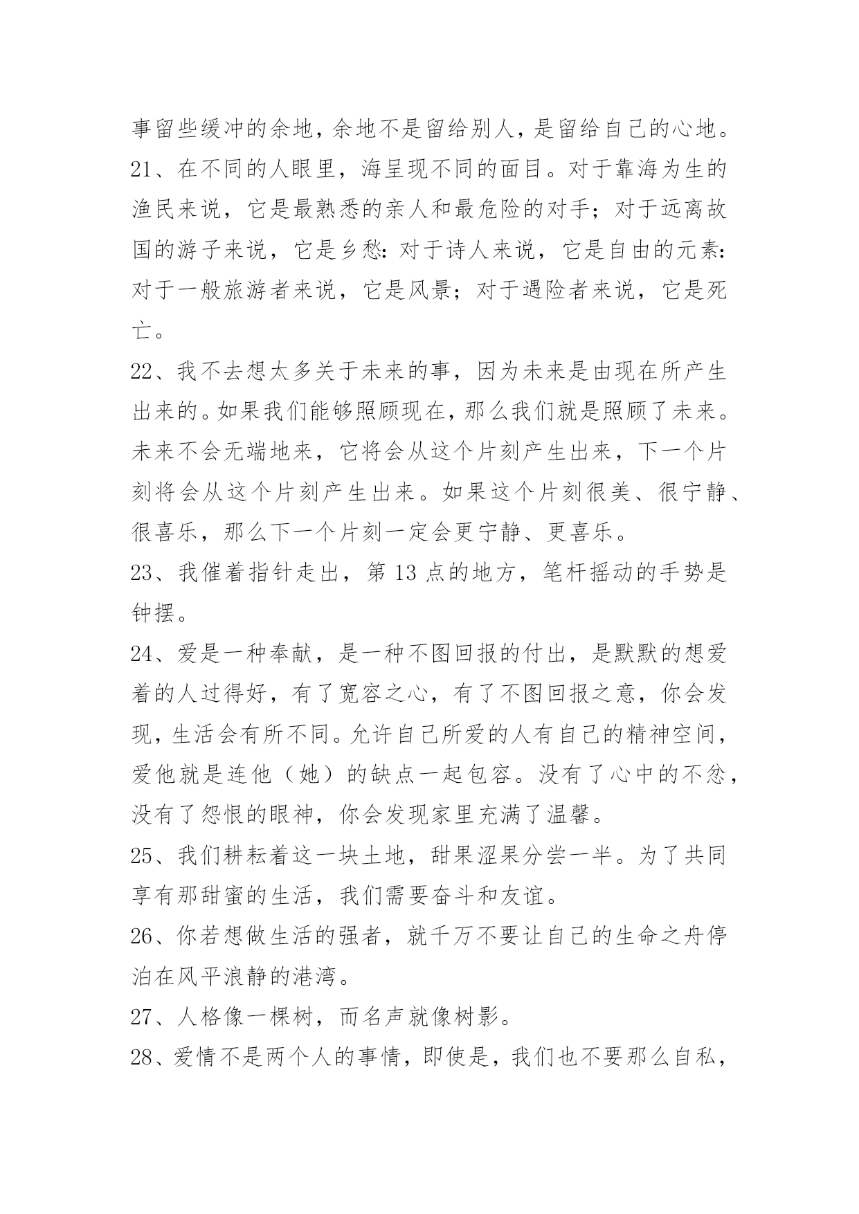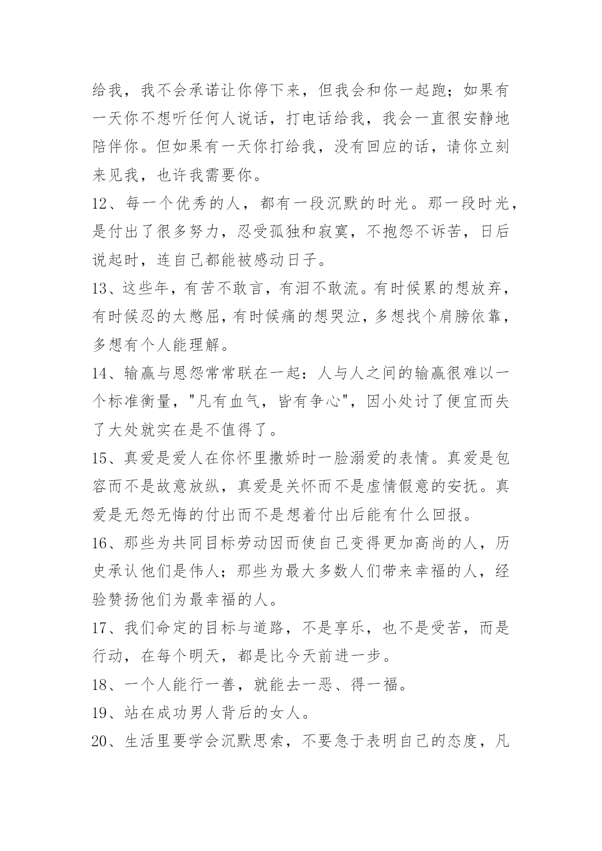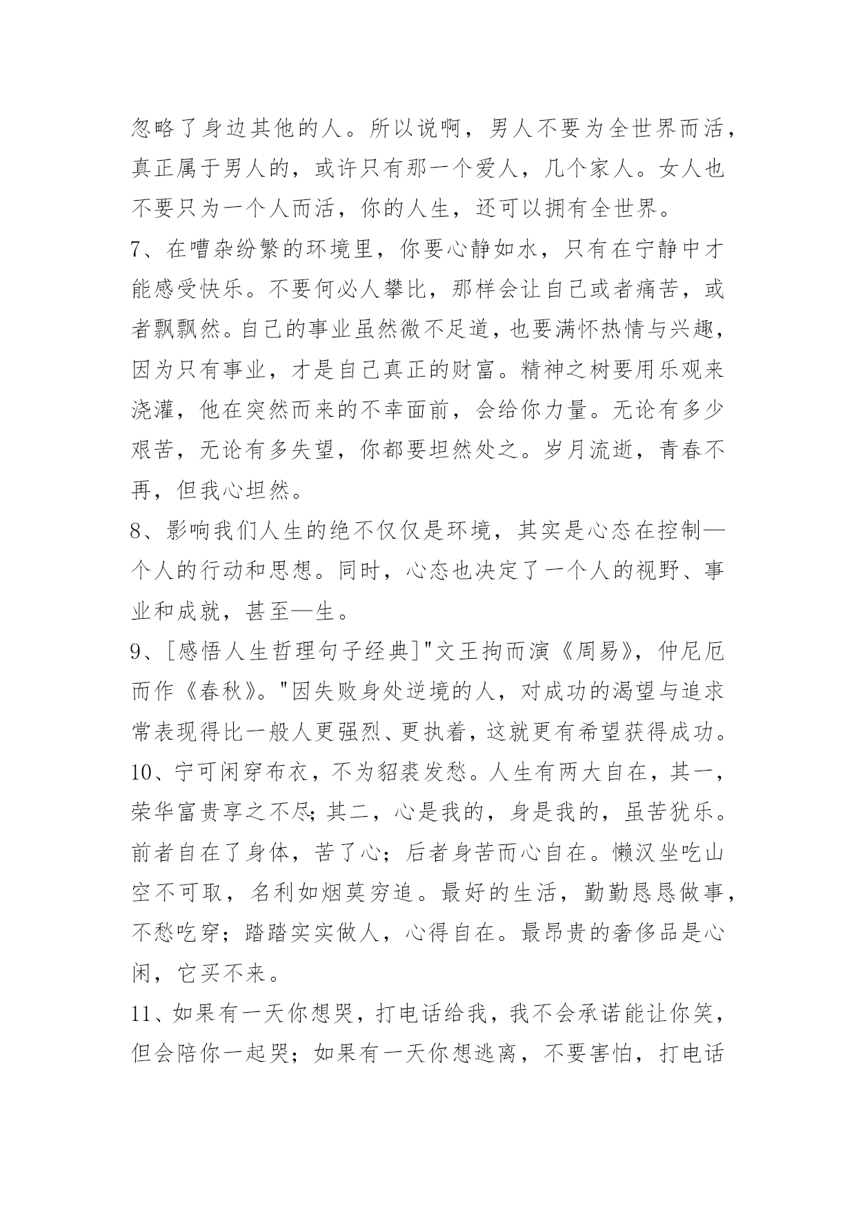 富含哲理句子60条精选富含哲理句子60条既然你以伤害了我,那你何必回来找我?下面是小编为大家整理推荐的富含哲理句子60条,欢迎阅读与收藏。1、窗外滴滴答答的雨声,净化了所有思绪。2、我们很多人的理想都会包含着让家人过得开心幸福这一项。坚持自己想法确实是风险太大,因为一旦失败,理想和爱都受到重创,而退让一步,起码留存住了完整的爱,没准那还能收获一份意想不到成功。3、我的公主,请抬起你的头,不然皇冠会掉下来的。4、不与别人盲目攀比,自己就会悠然自得,不把人生目标定得太高,自己就会欢乐常在,不刻意追求完美,自己就会远离痛苦,不是时时苛求自己,自己就会活的自在,不每每吹毛求疵,自己就会轻轻松松。活得太累就会痛苦不堪,知足常乐!5、我从小就是个很会担心的小孩。消防车往家的方向奔去,我就担心失火的是我家。老师说考试有人不及格,我就担心她说的一定是我。听了鬼故事,就担心恶鬼上身。朋友约会迟到,我就担心他是不是出车祸了……你也是这样爱担心的小孩吗?其实值得担心的事并不多。6、男人总会忽略身边最爱他的人,而宁愿花时间去应酬那些陌生人。女人总是把太多时间放在最爱的人身上,而完全忽略了身边其他的人。所以说啊,男人不要为全世界而活,真正属于男人的,或许只有那一个爱人,几个家人。女人也不要只为一个人而活,你的人生,还可以拥有全世界。7、在嘈杂纷繁的环境里,你要心静如水,只有在宁静中才能感受快乐。不要何必人攀比,那样会让自己或者痛苦,或者飘飘然。自己的事业虽然微不足道,也要满怀热情与兴趣,因为只有事业,才是自己真正的财富。精神之树要用乐观来浇灌,他在突然而来的不幸面前,会给你力量。无论有多少艰苦,无论有多失望,你都要坦然处之。岁月流逝,青春不再,但我心坦然。8、影响我们人生的绝不仅仅是环境,其实是心态在控制—个人的行动和思想。同时,心态也决定了一个人的视野、事业和成就,甚至—生。9、[感悟人生哲理句子经典]"文王拘而演《周易》,仲尼厄而作《春秋》。"因失败身处逆境的人,对成功的渴望与追求常表现得比一般人更强烈、更执着,这就更有希望获得成功。10、宁可闲穿布衣,不为貂裘发愁。人生有两大自在,其一,荣华富贵享之不尽;其二,心是我的,身是我的,虽苦犹乐。前者自在了身体,苦了心;后者身苦而心自在。懒汉坐吃山空不可取,名利如烟莫穷追。最好的生活,勤勤恳恳做事,不愁吃穿;踏踏实实做人,心得自在。最昂贵的奢侈品是心闲,它买不来。11、如果有一天你想哭,打电话给我,我不会承诺能让你笑,但会陪你一起哭;如果有一天你想逃离,不要害怕,打电话给我,我不会承诺让你停下来,但我会和你一起跑;如果有一天你不想听任何人说话,打电话给我,我会一直很安静地陪伴你。但如果有一天你打给我,没有回应的话,请你立刻来见我,也许我需要你。12、每一个优秀的人,都有一段沉默的时光。那一段时光,是付出了很多努力,忍受孤独和寂寞,不抱怨不诉苦,日后说起时,连自己都能被感动日子。13、这些年,有苦不敢言,有泪不敢流。有时候累的想放弃,有时候忍的太憋屈,有时候痛的想哭泣,多想找个肩膀依靠,多想有个人能理解。14、输赢与恩怨常常联在一起:人与人之间的输赢很难以一个标准衡量,"凡有血气,皆有争心",因小处讨了便宜而失了大处就实在是不值得了。15、真爱是爱人在你怀里撒娇时一脸溺爱的表情。真爱是包容而不是故意放纵,真爱是关怀而不是虚情假意的安抚。真爱是无怨无悔的付出而不是想着付出后能有什么回报。16、那些为共同目标劳动因而使自己变得更加高尚的人,历史承认他们是伟人;那些为最大多数人们带来幸福的人,经验赞扬他们为最幸福的人。17、我们命定的目标与道路,不是享乐,也不是受苦,而是行动,在每个明天,都是比今天前进一步。18、一个人能行一善,就能去一恶、得一福。19、站在成功男人背后的女人。20、生活里要学会沉默思索,不要急于表明自己的态度,凡事留些缓冲的余地,余地不是留给别人,是留给自己的心地。21、在不同的人眼里,海呈现不同的面目。对于靠海为生的渔民来说,它是最熟悉的亲人和最危险的对手;对于远离故国的游子来说,它是乡愁:对于诗人来说,它是自由的元素:对于一般旅游者来说,它是风景;对于遇险者来说,它是死亡。22、我不去想太多关于未来的事,因为未来是由现在所产生出来的。如果我们能够照顾现在,那么我们就是照顾了未来。未来不会无端地来,它将会从这个片刻产生出来,下一个片刻将会从这个片刻产生出来。如果这个片刻很美、很宁静、很喜乐,那么下一个片刻一定会更宁静、更喜乐。23、我催着指针走出,第13点的地方,笔杆摇动的手势是钟摆。24、爱是一种奉献,是一种不图回报的付出,是默默的想爱着的人过得好,有了宽容之心,有了不图回报之意,你会发现,生活会有所不同。允许自己所爱的人有自己的精神空间,爱他就是连他(她)的缺点一起包容。没有了心中