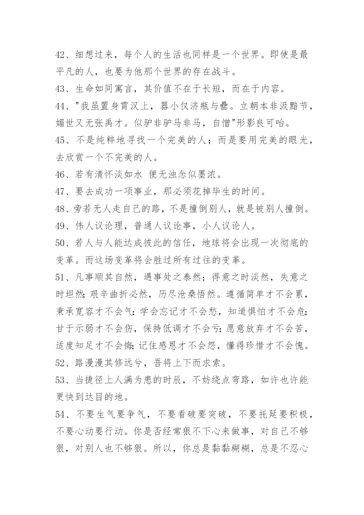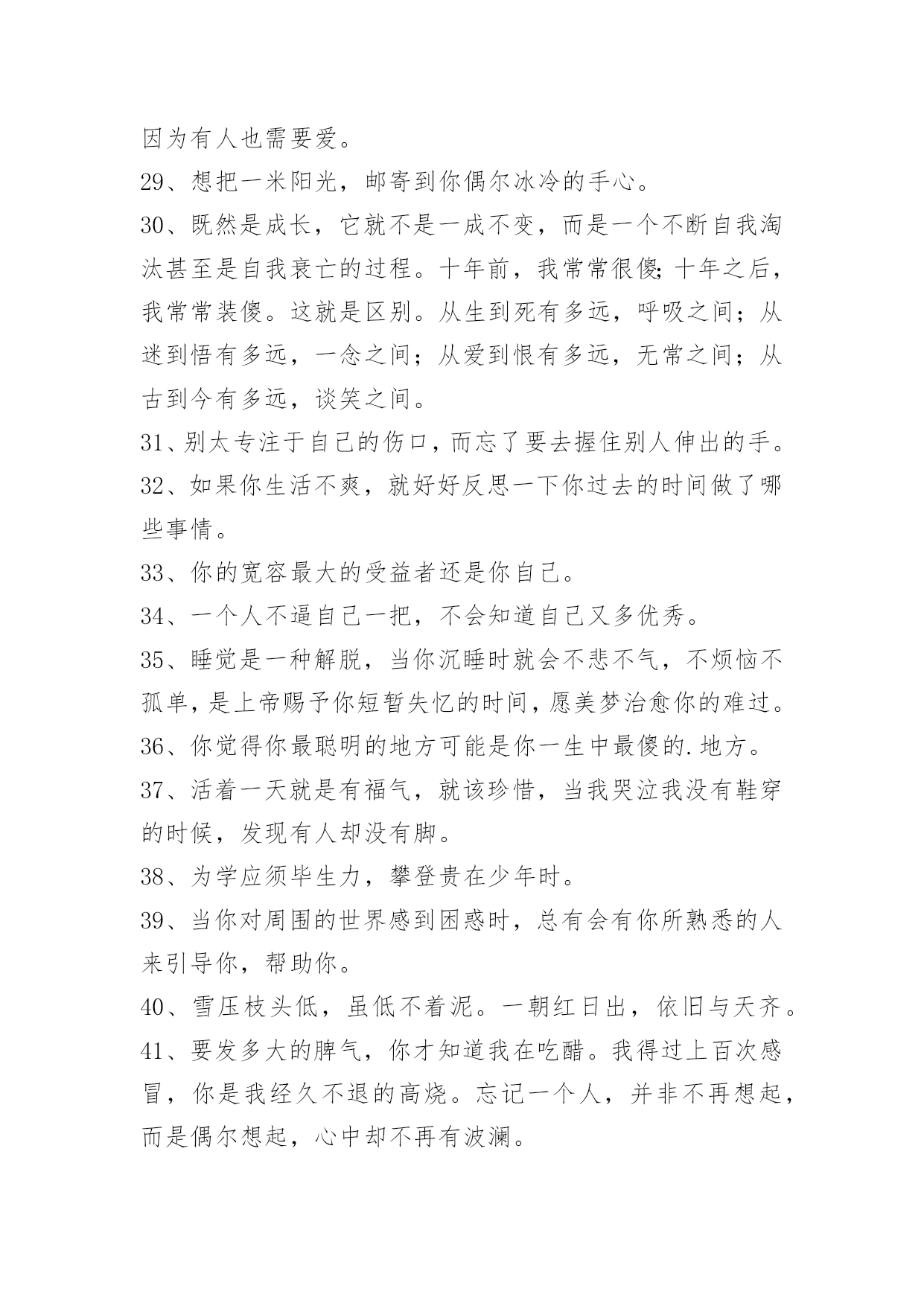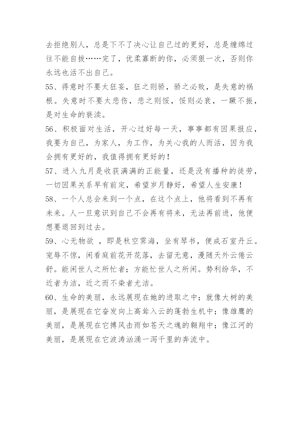 富含哲理句子60条精选富含哲理句子60条既然你以伤害了我,那你何必回来找我?下面是小编为大家整理推荐的富含哲理句子60条,欢迎阅读与收藏。1、窗外滴滴答答的雨声,净化了所有思绪。2、我们很多人的理想都会包含着让家人过得开心幸福这一项。坚持自己想法确实是风险太大,因为一旦失败,理想和爱都受到重创,而退让一步,起码留存住了完整的爱,没准那还能收获一份意想不到成功。3、我的公主,请抬起你的头,不然皇冠会掉下来的。4、不与别人盲目攀比,自己就会悠然自得,不把人生目标定得太高,自己就会欢乐常在,不刻意追求完美,自己就会远离痛苦,不是时时苛求自己,自己就会活的自在,不每每吹毛求疵,自己就会轻轻松松。活得太累就会痛苦不堪,知足常乐!5、我从小就是个很会担心的小孩。消防车往家的方向奔去,我就担心失火的是我家。老师说考试有人不及格,我就担心她说的一定是我。听了鬼故事,就担心恶鬼上身。朋友约会迟到,我就担心他是不是出车祸了……你也是这样爱担心的小孩吗?其实值得担心的事并不多。6、男人总会忽略身边最爱他的人,而宁愿花时间去应酬那些陌生人。女人总是把太多时间放在最爱的人身上,而完全忽略了身边其他的人。所以说啊,男人不要为全世界而活,真正属于男人的,或许只有那一个爱人,几个家人。女人也不要只为一个人而活,你的人生,还可以拥有全世界。7、在嘈杂纷繁的环境里,你要心静如水,只有在宁静中才能感受快乐。不要何必人攀比,那样会让自己或者痛苦,或者飘飘然。自己的事业虽然微不足道,也要满怀热情与兴趣,因为只有事业,才是自己真正的财富。精神之树要用乐观来浇灌,他在突然而来的不幸面前,会给你力量。无论有多少艰苦,无论有多失望,你都要坦然处之。岁月流逝,青春不再,但我心坦然。8、影响我们人生的绝不仅仅是环境,其实是心态在控制—个人的行动和思想。同时,心态也决定了一个人的视野、事业和成就,甚至—生。9、[感悟人生哲理句子经典]"文王拘而演《周易》,仲尼厄而作《春秋》。"因失败身处逆境的人,对成功的渴望与追求常表现得比一般人更强烈、更执着,这就更有希望获得成功。10、宁可闲穿布衣,不为貂裘发愁。人生有两大自在,其一,荣华富贵享之不尽;其二,心是我的,身是我的,虽苦犹乐。前者自在了身体,苦了心;后者身苦而心自在。懒汉坐吃山空不可取,名利如烟莫穷追。最好的生活,勤勤恳恳做事,不愁吃穿;踏踏实实做人,心得自在。最昂贵的奢侈品是心闲,它买不来。11、如果有一天你想哭,打电话给我,我不会承诺能让你笑,但会陪你一起哭;如果有一天你想逃离,不要害怕,打电话给我,我不会承诺让你停下来,但我会和你一起跑;如果有一天你不想听任何人说话,打电话给我,我会一直很安静地陪伴你。但如果有一天你打给我,没有回应的话,请你立刻来见我,也许我需要你。12、每一个优秀的人,都有一段沉默的时光。那一段时光,是付出了很多努力,忍受孤独和寂寞,不抱怨不诉苦,日后说起时,连自己都能被感动日子。13、这些年,有苦不敢言,有泪不敢流。有时候累的想放弃,有时候忍的太憋屈,有时候痛的想哭泣,多想找个肩膀依靠,多想有个人能理解。14、输赢与恩怨常常联在一起:人与人之间的输赢很难以一个标准衡量,"凡有血气,皆有争心",因小处讨了便宜而失了大处就实在是不值得了。15、真爱是爱人在你怀里撒娇时一脸溺爱的表情。真爱是包容而不是故意放纵,真爱是关怀而不是虚情假意的安抚。真爱是无怨无悔的付出而不是想着付出后能有什么回报。16、那些为共同目标劳动因而使自己变得更加高尚的人,历史承认他们是伟人;那些为最大多数人们带来幸福的人,经验赞扬他们为最幸福的人。17、我们命定的目标与道路,不是享乐,也不是受苦,而是行动,在每个明天,都是比今天前进一步。18、一个人能行一善,就能去一恶、得一福。19、站在成功男人背后的女人。20、生活里要学会沉默思索,不要急于表明自己的态度,凡事留些缓冲的余地,余地不是留给别人,是留给自己的心地。21、在不同的人眼里,海呈现不同的面目。对于靠海为生的渔民来说,它是最熟悉的亲人和最危险的对手;对于远离故国的游子来说,它是乡愁:对于诗人来说,它是自由的元素:对于一般旅游者来说,它是风景;对于遇险者来说,它是死亡。22、我不去想太多关于未来的事,因为未来是由现在所产生出来的。如果我们能够照顾现在,那么我们就是照顾了未来。未来不会无端地来,它将会从这个片刻产生出来,下一个片刻将会从这个片刻产生出来。如果这个片刻很美、很宁静、很喜乐,那么下一个片刻一定会更宁静、更喜乐。23、我催着指针走出,第13点的地方,笔杆摇动的手势是钟摆。24、爱是一种奉献,是一种不图回报的付出,是默默的想爱着的人过得好,有了宽容之心,有了不图回报之意,你会发现,生活会有所不同。允许自己所爱的人有自己的精神空间,爱他就是连他(她)的缺点一起包容。没有了心中