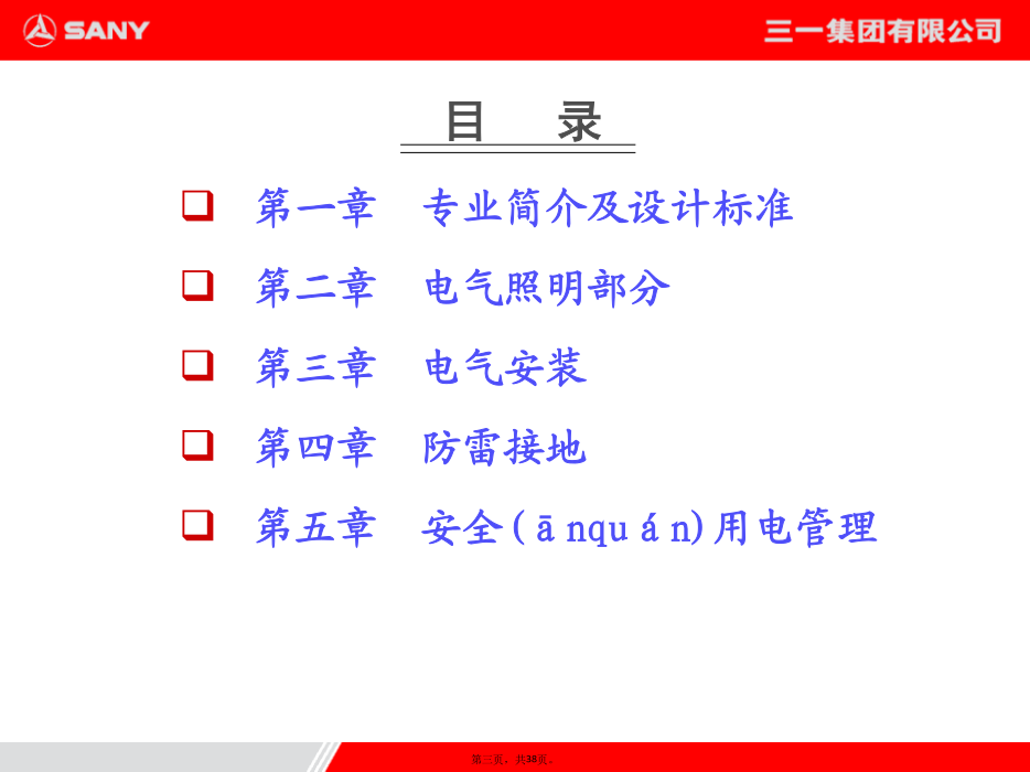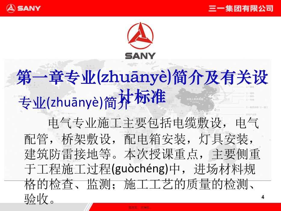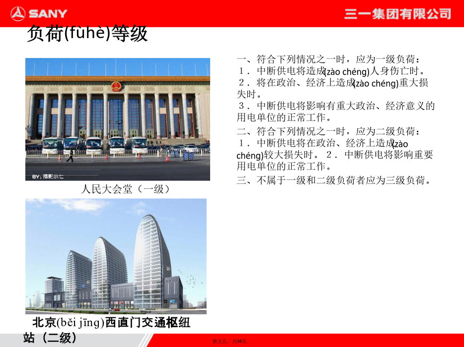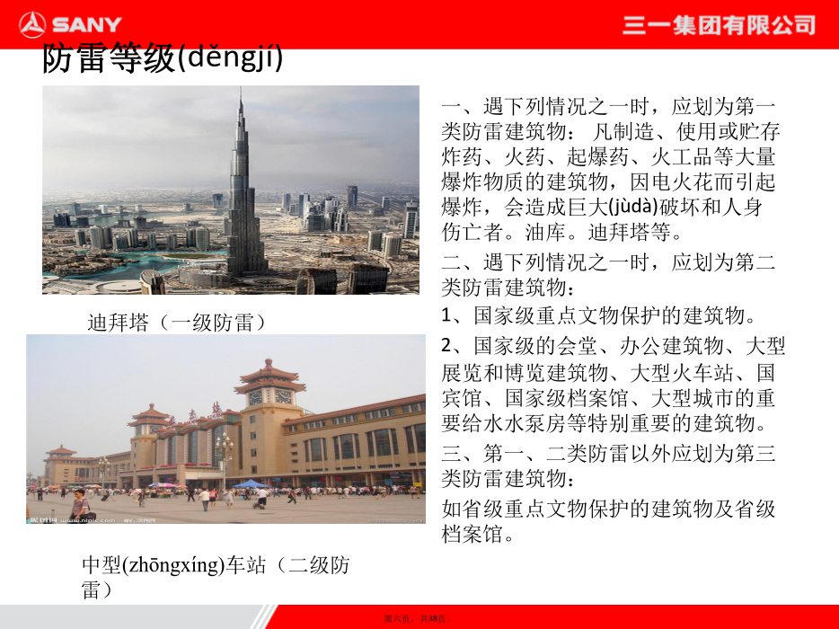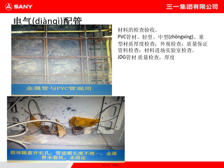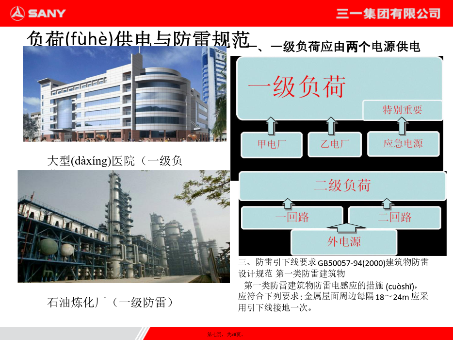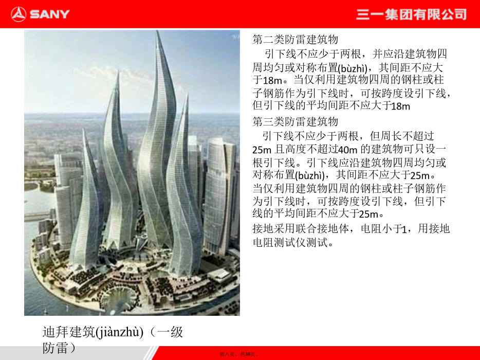 ——张国良序章一个人简介第一章专业简介及设计标准第二章电气照明部分第三章电气安装第四章防雷接地第五章安全(ānquán)用电管理4负荷(fùhè)等级防雷等级(děngjí)负荷(fùhè)供电与防雷规范第二类防雷建筑物引下线不应少于两根,并应沿建筑物四周均匀或对称布置(bùzhì),其间距不应大于18m。当仅利用建筑物四周的钢柱或柱子钢筋作为引下线时,可按跨度设引下线,但引下线的平均间距不应大于18m第三类防雷建筑物引下线不应少于两根,但周长不超过25m且高度不超过40m的建筑物可只设一根引下线。引下线应沿建筑物四周均匀或对称布置(bùzhì),其间距不应大于25m。当仅利用建筑物四周的钢柱或柱子钢筋作为引下线时,可按跨度设引下线,但引下线的平均间距不应大于25m。接地采用联合接地体,电阻小于1,用接地电阻测试仪测试。9电气(diànqì)配管电线(diànxiàn)穿管开关、插座(chāzuò)、灯具安装4、照明开关安装应符合下列规定:(1)同一建筑物、构筑物的开关采用同一系列的产品,开关的通断位置一致,操作灵活、接触可靠;(2)开关控制相线,一般的控制线为白色。5、花灯吊钩圆钢直径不应小于灯具挂销直径,且不应小于6mm。大型花灯的固定及悬吊装置,应按灯具重量的2倍做过载试验。6、当灯具距地面高度小于时,灯具的可接近(jiējìn)裸露导体必须接地(PE)或接零(PEN)可靠,并应有专用接地螺栓,且有标识。14配电柜安装(ānzhuāng)3、高压成套配电柜必须按本规范第条的规定(高压的电气设备和布线(bùxiàn)系统及继电保护系统的交接试验,必须符合现行国家标准《电气装置安装工程电气设备交接试验标准》GB50150的规定)交接试验合格。(2)凡经法定程序批准,进入市场投入使用的新高压电气设备和继电保护装置,按产品技术(jìshù)文件要求交接试验。5、低压成套配电柜交接试验,必须符合本规范第条的规定(杆上低压配电箱的电气装置和馈电线路交接试验应符合下列规定:1.每路配电开关及保护装置的规格、型号,应符合设计要求;2.相间和相对地间的绝缘电阻值应大于;3.电气装置的交流工频耐压试验电压为1kV,当绝缘电阻值大于10MΩ时,可采用2500V兆欧表摇测替代,试验持续时间1min,无击穿闪络现象。)。电气(diànqì)配管电线(diànxiàn)穿管桥架、母线(mǔxiàn)安装母线(mǔxiàn)安装3.母线与外壳同心,允许偏差为±5mm;4、高压母线交流工频耐压试验必须按本规范第条的规定(高压的电气设备和布线系统及继电保护系统的交接试验,必须符合现行国家标准《电气装置安装工程电气设备交接试验标准》GB50150的规定。)交接试验合格。5、低压母线交接试验应符合本规范第条(电气装置的交流工频耐压试验电压为1kV,当绝缘电阻值大于10MΩ时,可采用2500V兆欧表摇测替代,试验持续时间1min,无击穿闪络现象)的规定。6、母线与母线、母线与电器接线端子搭接,搭接面的处理(chǔlǐ)应符合下列规定:.铜与铜:室外、高温且潮湿的室内,搭接面搪锡;干燥的室内,不搪锡;母线槽:当批次的铜(铝)材质单,绝缘材料材质单,3C认证,出厂资料、合格证;插接箱内元器件是否与合同规定符合;23接闪器安装(ānzhuāng)建筑物顶部的避雷针、避雷带等必须与顶部外露的其他金属物体连成一个整体的电气通路,且与避雷引下线连接可靠。避雷针及其接地装置不能装设在人、畜经常通行的地方,距道路应3m以上(yǐshàng),否则要采取保护措施。与其他接地装置和配电配电装置之间要保持规定距离:地面上应不小于5m,地下应不小于3m。引下线安装(ānzhuāng)等电位(diànwèi)与接地装置安装接地装置安装1、人工接地装置或利用建筑物基础钢筋的接地装置必须在地面以上按设计要求位置设测试点。2、测试接地装置的接地电阻值必须符合设计要求。3、防雷接地的人工接地装置的接地干线埋设,经人行通道处理地深度不应小于1m,且应采取均压措施或在其上方铺设(pūshè)卵石或沥青地面。4、接地模板顶面埋深不应小于,接地模块间距不应小于模块长度的3~5倍。接地模块埋设基坑,一般为模块外形尺寸的~倍,且在开挖深度内详细记录地层情况。5、接地模块应垂直或水平就位,不应倾斜(qīngxié)设置,保持与原土层接触良好。30安全(ānquán)用电方案审核JGJ46-2005内容讲解及案例(ànlì)分析总配电箱应设在靠近电源的区域,分配电箱应设在用电设备或负荷相对集中的区域,分配电箱与开关箱的距离不得超过30m,开关箱与其控制的固定式用电设备的水平距离不宜超过3m。3、每台用电设备必须有各自专用的开关箱,严禁用同一个开关箱直接控制2台及2