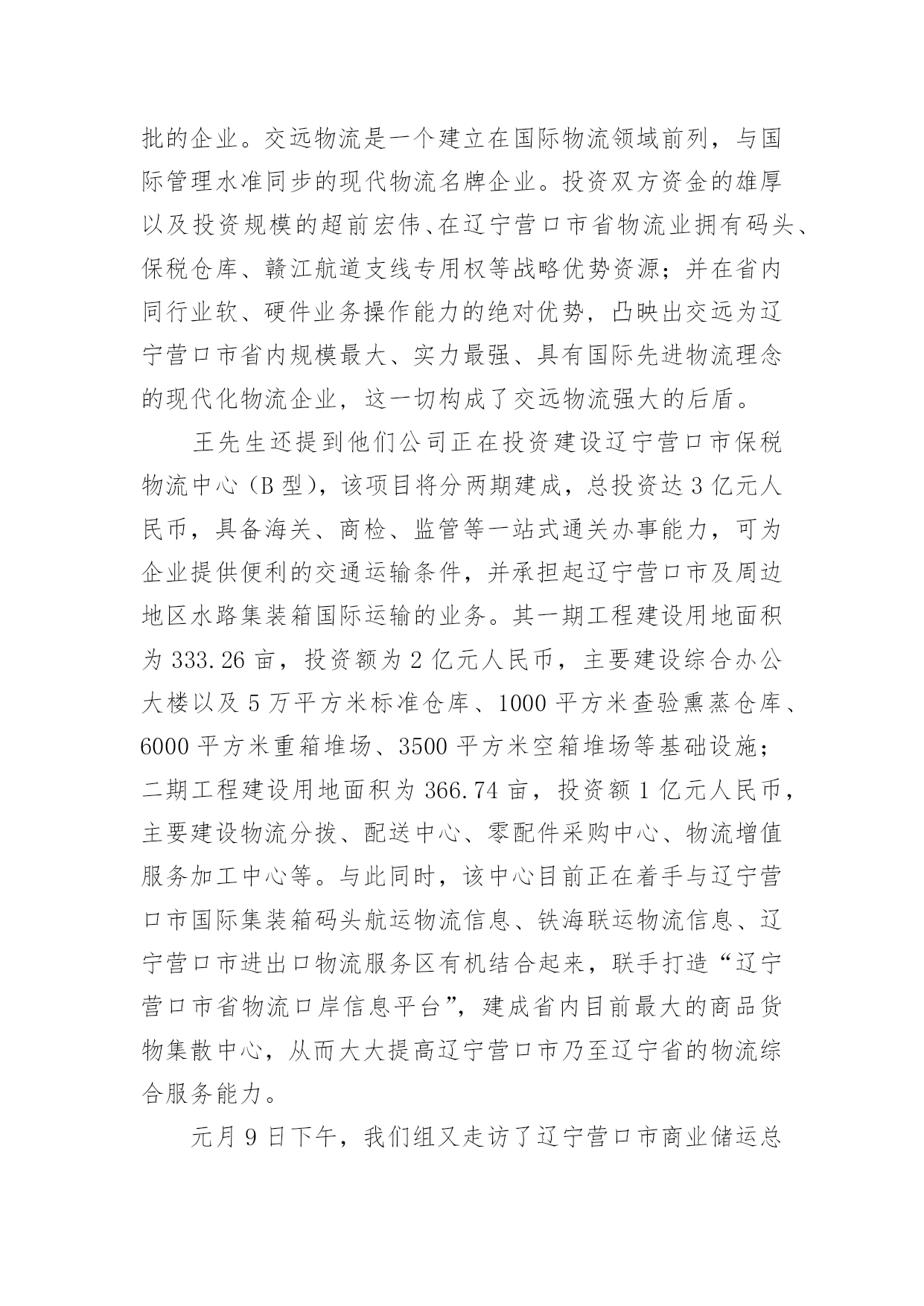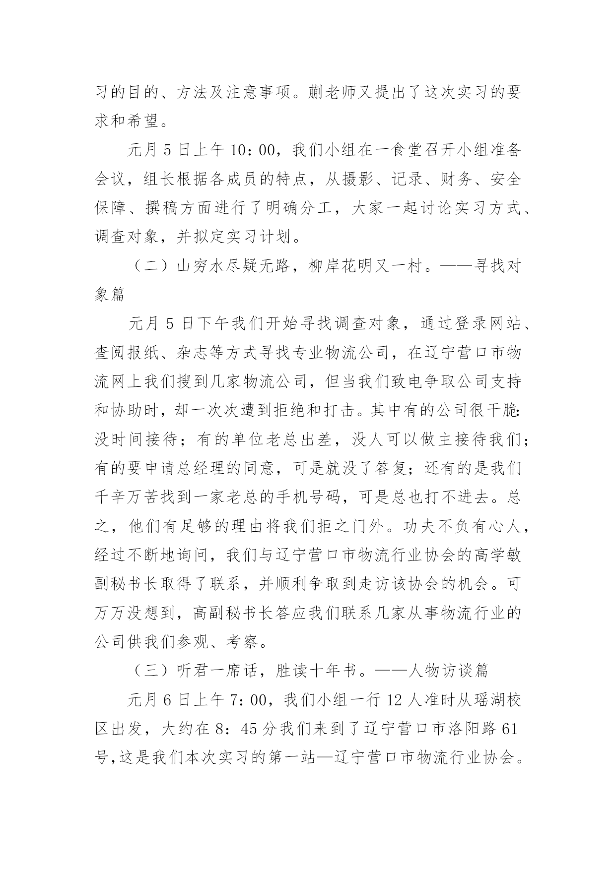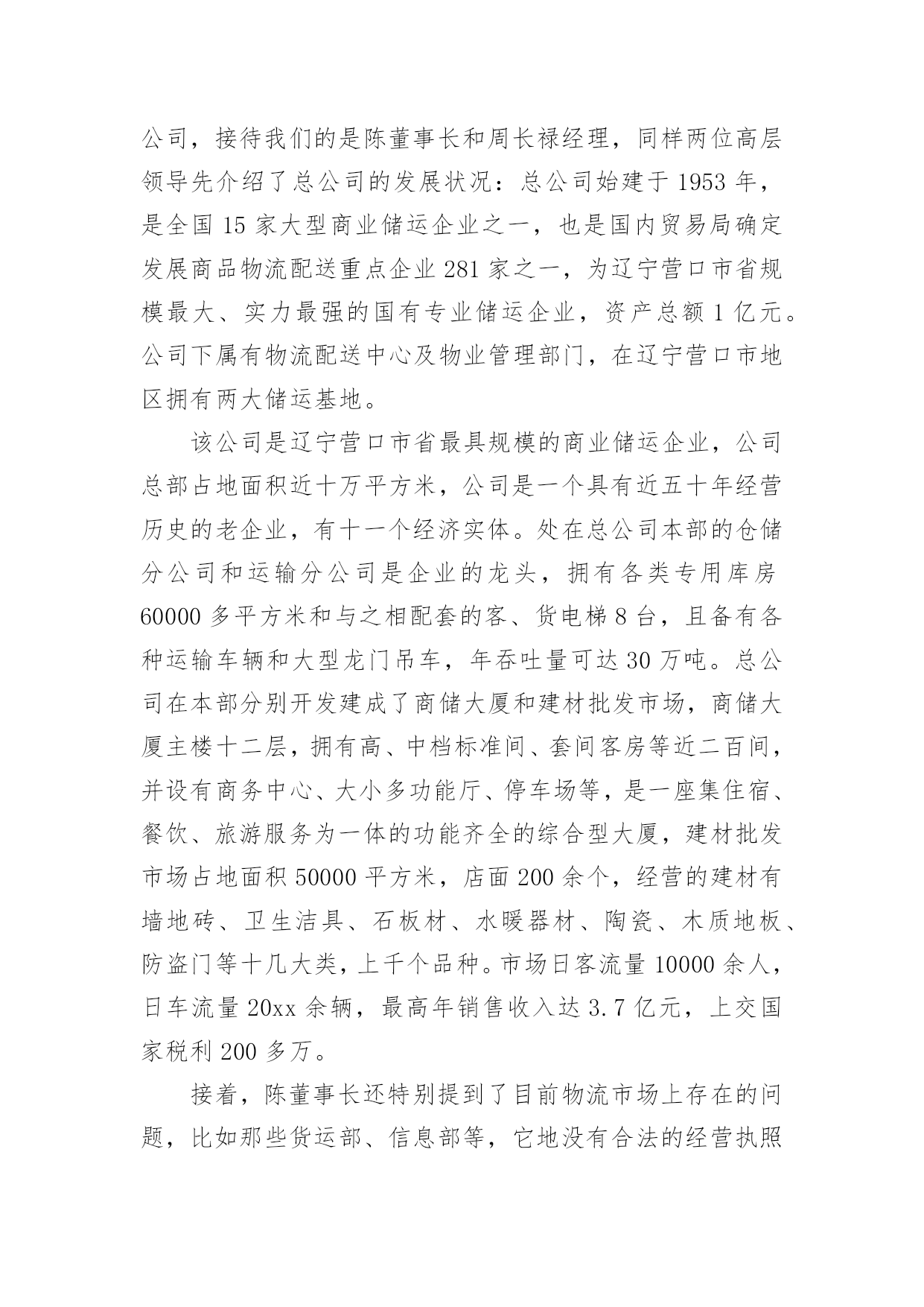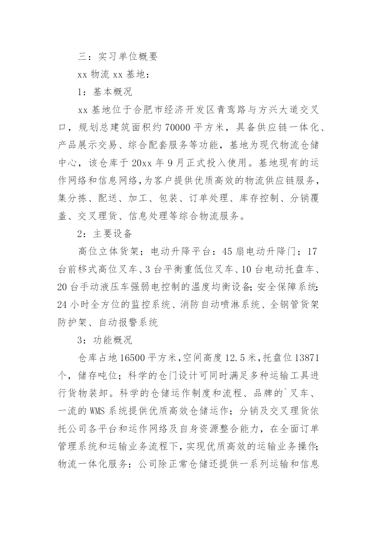 物流管理专业实习报告【精品】物流管理专业实习报告三篇在经济飞速发展的今天,报告使用的次数愈发增长,报告中涉及到专业性术语要解释清楚。那么报告应该怎么写才合适呢?以下是小编收集整理的物流管理专业实习报告3篇,欢迎阅读,希望大家能够喜欢。物流管理专业实习报告篇1一:实习目的为了更好的了解和认知物流,在为期一年的时间里我选择了当前物流行业中的佼佼者xx物流去实习,从宏观和微观上去感受主要的物流流程,为以后的工作和学习打下坚实基础,也同时对物流行业有了全新的认识。二:实习要求为了了解物流在现代经济行业中的作用,了解物流在现在工商企业中的运作模式,增强对专业的认知感。实习分为四个阶段:第一阶段:入库管理第二阶段:在库管理第三阶段:出库管理第三阶段:信息管理通过这四个阶段的实习掌握了仓库的整个运作流程,了解了物流的基本特点、主要设备的使用方法及将书本上知识与现实相结合。探求物流行业的本质和规律。三:实习单位概要xx物流xx基地:1:基本概况xx基地位于合肥市经济开发区青鸾路与方兴大道交叉口,规划总建筑面积约70000平方米,具备供应链一体化、产品展示交易、综合配套服务等功能,基地为现代物流仓储中心,该仓库于20xx年9月正式投入使用。基地现有的运作网络和信息网络,为客户提供优质高效的物流供应链服务,集分拣、配送、加工、包装、订单处理、库存控制、分销覆盖、交叉理货、信息处理等综合物流服务。2:主要设备高位立体货架;电动升降平台:45扇电动升降门;17台前移式高位叉车、3台平衡重低位叉车、10台电动托盘车、20台手动液压车强弱电控制的温度均衡设备;安全保障系统:24小时全方位的监控系统、消防自动喷淋系统、全钢管货架防护架、自动报警系统3:功能概况仓库占地16500平方米,空间高度12.5米,托盘位13871个,储存吨位;科学的仓门设计可同时满足多种运输工具进行货物装卸。科学的仓储运作制度和流程、品牌的`叉车、一流的WMS系统提供优质高效仓储运作;分销及交叉理货依托公司各平台和运作网络及自身资源整合能力,在全面订单管理系统和运输业务流程下,实现优质高效的运输业务操作;物流一体化服务:公司除正常仓储还提供一系列运输和信息服务外包装、再包装、刷唛、二次打码、分拣、回收等物注一体化服务;物流信息服务:基地利用先进的仓库管理系统、运输业务系统、全程订单管理系统对客户各个物流环节进行即时采集、分析和传递,为客户业务发展有力的保障。四:实习感想刚到xx时脑海中的物流仅仅停留在书本上的概念,对于现实中的物流不够感性。对于物流我只知道他是集:运输、仓储、配送、搬运、包装、流通加工、信息处理这样的模式,但是当真来操作时发现没那么简单。通过这一年的学习掌握了该仓库的所有流程,同时发现这与国外的物流业相比差多了,当然这和中国的廉价劳动力息息相关,这是无尽切肤之痛。作为物流人深感当前的物流行业生存方式举步维艰。物流管理专业实习报告篇2实习目的:选择身边的企业单位为对象,联系课上所学理论,采用实地考察跟踪其物流全过程的方法,对辽宁营口市物流业发展现状进行初步了解。培养实际调研能力,尝试检验所学知识,并从实际中进一步学习了解物流的内涵与外延。实习方式:采用实地调研的方式,具体采用了面对面的访谈了解、过程跟踪调查和侧面行为观察的方式。出动全组成员合理分工,每人负责不同侧面的内容,协同合作,调查后集体讨论分析,并总结出实习报告。实习时间:20xx年元月5日—元月12日实习地点:辽宁营口市实习步骤:一、前期准备工作1、元月4日下午2:00在北—B104教室参加本专业认识实习周动员大会。2、元月5日上午10:00在一食堂召开小组会议,商讨实习方式、调查对象,对小组成员进行明确分工,并拟定实习计划。3、元月5日下午通过登录网站、查阅报纸、杂志等方式寻找调查对象,并争取专业物流公司或单位的支持和协助。到系办公室开介绍信。4、准备校徽、数码相机、笔记本等实习所需物品。二、开展实习活动1、元月6日,走访辽宁营口市物流行业协会。2、元月8日,参观、调查辽宁营口市交远物流有限公司。3、元月9日,走访辽宁营口市省商业储运总公司。4、元月11日—12日收集并整理资料,收集各成员的初稿,统一商讨分析并定稿。实习内容:(一)备战认识实习,英雄所见略同。——准备工作篇元月4日下午2:00我们参加了本专业认识实习周动员大会,大会由物流管理专业班主任蒯海章老师主持,易老师在会上对本次实习周工作做了详细的指导,并提出了这次实习的目的、方法及注意事项。蒯老师又提出了这次实习的要求和希望。元月5日上午10:00,我们小组在一食堂召开小组准备会议,组长根据各成员的特点,从摄影、记录、财务、安全保障、撰稿方面进行了明确分工,大家一起讨论实习方式、调查对象,并拟定实习计划。(二)山穷水尽疑无路,柳岸花明又一村。—