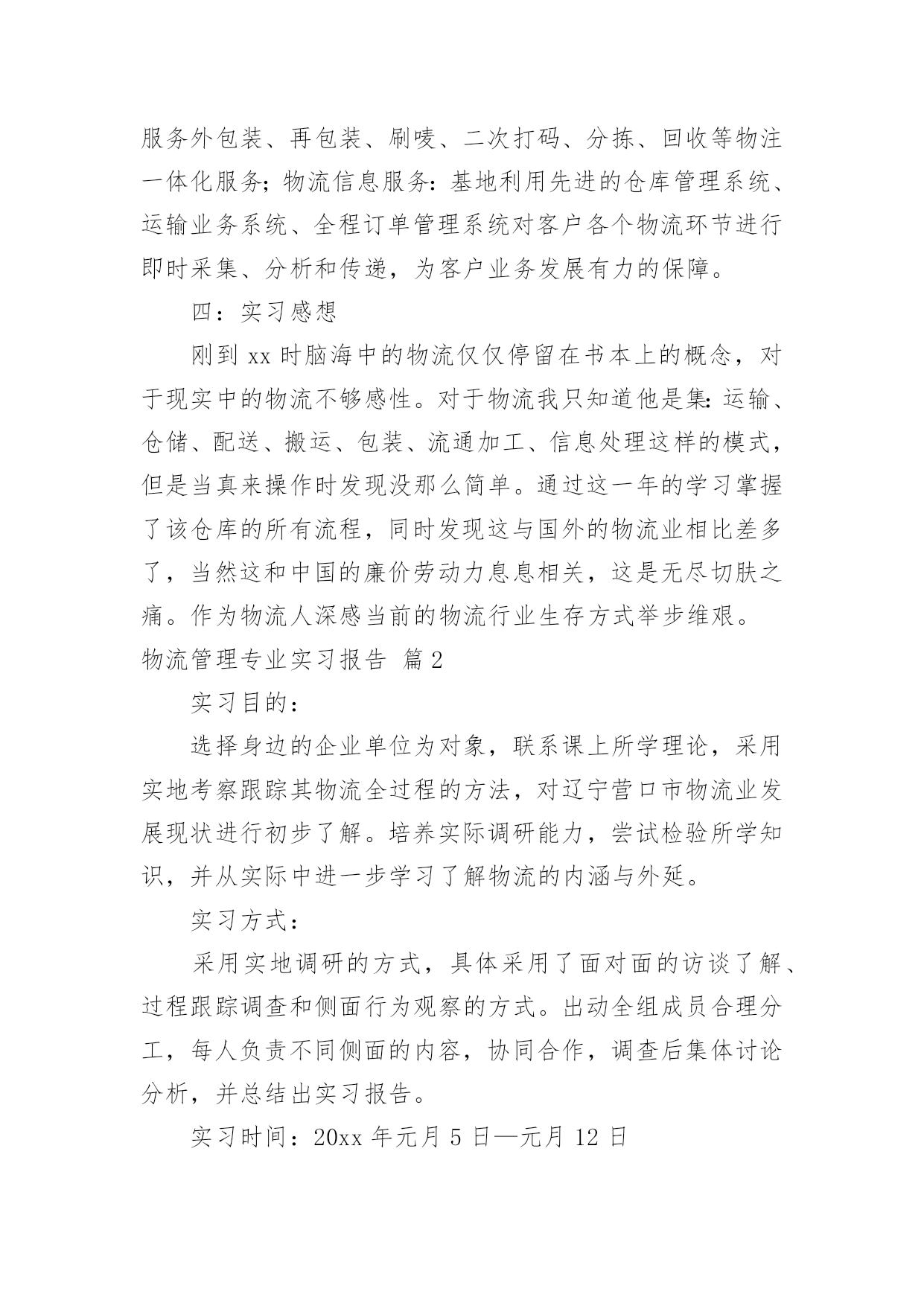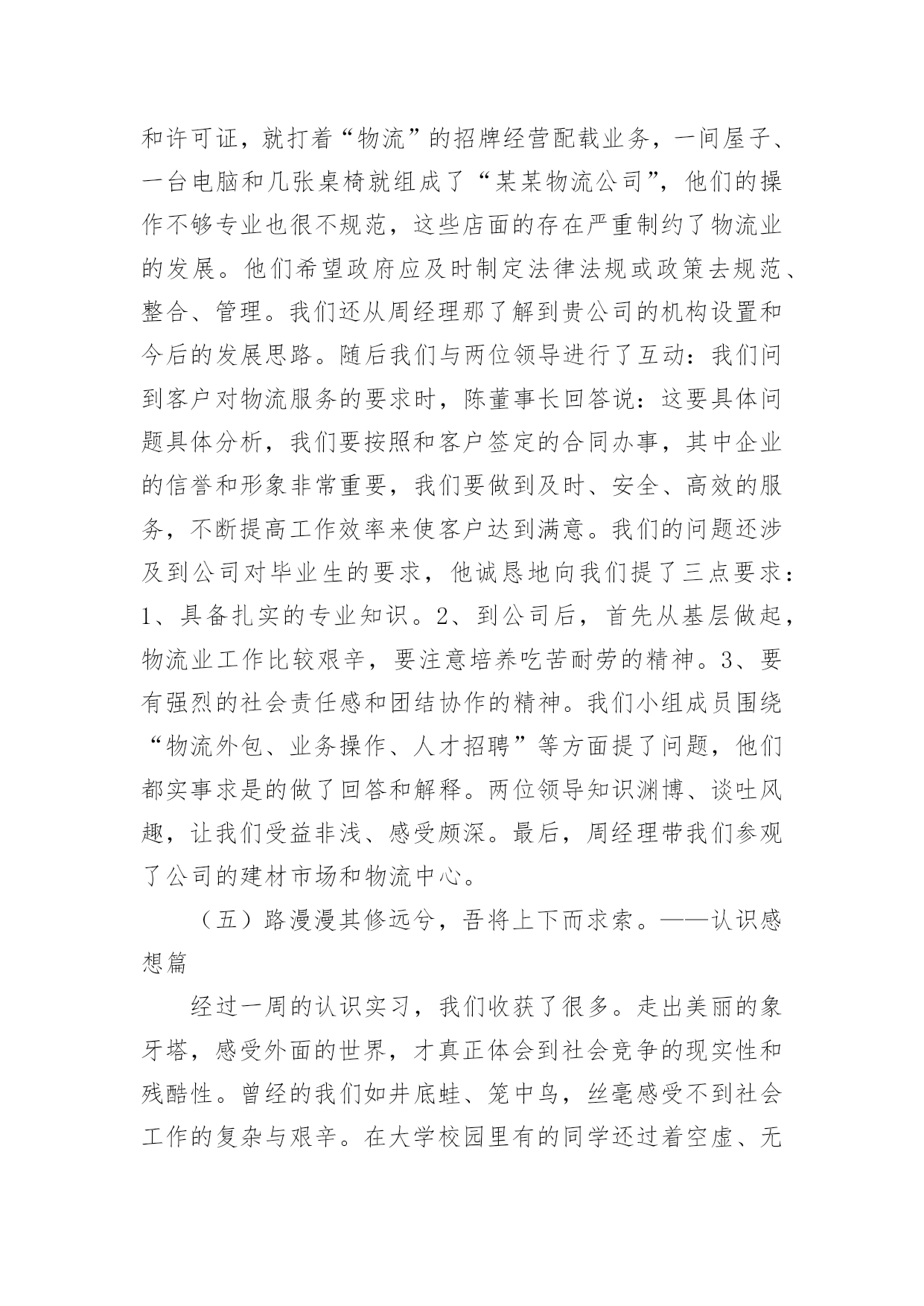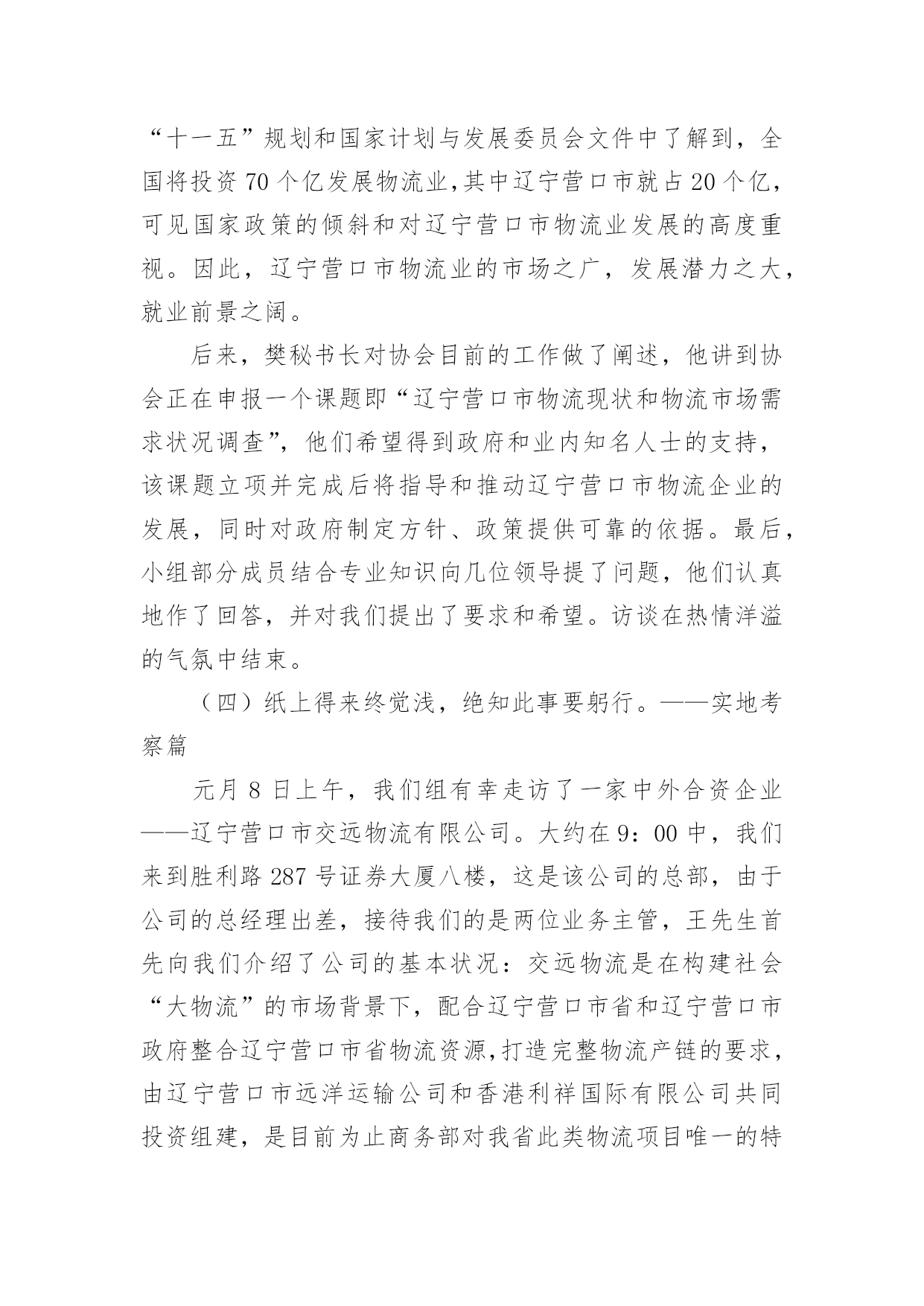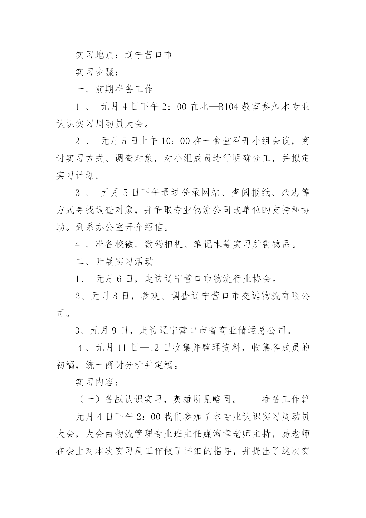 物流管理专业实习报告【精品】物流管理专业实习报告三篇在经济飞速发展的今天,报告使用的次数愈发增长,报告中涉及到专业性术语要解释清楚。那么报告应该怎么写才合适呢?以下是小编收集整理的物流管理专业实习报告3篇,欢迎阅读,希望大家能够喜欢。物流管理专业实习报告篇1一:实习目的为了更好的了解和认知物流,在为期一年的时间里我选择了当前物流行业中的佼佼者xx物流去实习,从宏观和微观上去感受主要的物流流程,为以后的工作和学习打下坚实基础,也同时对物流行业有了全新的认识。二:实习要求为了了解物流在现代经济行业中的作用,了解物流在现在工商企业中的运作模式,增强对专业的认知感。实习分为四个阶段:第一阶段:入库管理第二阶段:在库管理第三阶段:出库管理第三阶段:信息管理通过这四个阶段的实习掌握了仓库的整个运作流程,了解了物流的基本特点、主要设备的使用方法及将书本上知识与现实相结合。探求物流行业的本质和规律。三:实习单位概要xx物流xx基地:1:基本概况xx基地位于合肥市经济开发区青鸾路与方兴大道交叉口,规划总建筑面积约70000平方米,具备供应链一体化、产品展示交易、综合配套服务等功能,基地为现代物流仓储中心,该仓库于20xx年9月正式投入使用。基地现有的运作网络和信息网络,为客户提供优质高效的物流供应链服务,集分拣、配送、加工、包装、订单处理、库存控制、分销覆盖、交叉理货、信息处理等综合物流服务。2:主要设备高位立体货架;电动升降平台:45扇电动升降门;17台前移式高位叉车、3台平衡重低位叉车、10台电动托盘车、20台手动液压车强弱电控制的温度均衡设备;安全保障系统:24小时全方位的监控系统、消防自动喷淋系统、全钢管货架防护架、自动报警系统3:功能概况仓库占地16500平方米,空间高度12.5米,托盘位13871个,储存吨位;科学的仓门设计可同时满足多种运输工具进行货物装卸。科学的仓储运作制度和流程、品牌的`叉车、一流的WMS系统提供优质高效仓储运作;分销及交叉理货依托公司各平台和运作网络及自身资源整合能力,在全面订单管理系统和运输业务流程下,实现优质高效的运输业务操作;物流一体化服务:公司除正常仓储还提供一系列运输和信息服务外包装、再包装、刷唛、二次打码、分拣、回收等物注一体化服务;物流信息服务:基地利用先进的仓库管理系统、运输业务系统、全程订单管理系统对客户各个物流环节进行即时采集、分析和传递,为客户业务发展有力的保障。四:实习感想刚到xx时脑海中的物流仅仅停留在书本上的概念,对于现实中的物流不够感性。对于物流我只知道他是集:运输、仓储、配送、搬运、包装、流通加工、信息处理这样的模式,但是当真来操作时发现没那么简单。通过这一年的学习掌握了该仓库的所有流程,同时发现这与国外的物流业相比差多了,当然这和中国的廉价劳动力息息相关,这是无尽切肤之痛。作为物流人深感当前的物流行业生存方式举步维艰。物流管理专业实习报告篇2实习目的:选择身边的企业单位为对象,联系课上所学理论,采用实地考察跟踪其物流全过程的方法,对辽宁营口市物流业发展现状进行初步了解。培养实际调研能力,尝试检验所学知识,并从实际中进一步学习了解物流的内涵与外延。实习方式:采用实地调研的方式,具体采用了面对面的访谈了解、过程跟踪调查和侧面行为观察的方式。出动全组成员合理分工,每人负责不同侧面的内容,协同合作,调查后集体讨论分析,并总结出实习报告。实习时间:20xx年元月5日—元月12日实习地点:辽宁营口市实习步骤:一、前期准备工作1、元月4日下午2:00在北—B104教室参加本专业认识实习周动员大会。2、元月5日上午10:00在一食堂召开小组会议,商讨实习方式、调查对象,对小组成员进行明确分工,并拟定实习计划。3、元月5日下午通过登录网站、查阅报纸、杂志等方式寻找调查对象,并争取专业物流公司或单位的支持和协助。到系办公室开介绍信。4、准备校徽、数码相机、笔记本等实习所需物品。二、开展实习活动1、元月6日,走访辽宁营口市物流行业协会。2、元月8日,参观、调查辽宁营口市交远物流有限公司。3、元月9日,走访辽宁营口市省商业储运总公司。4、元月11日—12日收集并整理资料,收集各成员的初稿,统一商讨分析并定稿。实习内容:(一)备战认识实习,英雄所见略同。——准备工作篇元月4日下午2:00我们参加了本专业认识实习周动员大会,大会由物流管理专业班主任蒯海章老师主持,易老师在会上对本次实习周工作做了详细的指导,并提出了这次实习的目的、方法及注意事项。蒯老师又提出了这次实习的要求和希望。元月5日上午10:00,我们小组在一食堂召开小组准备会议,组长根据各成员的特点,从摄影、记录、财务、安全保障、撰稿方面进行了明确分工,大家一起讨论实习方式、调查对象,并拟定实习计划。(二)山穷水尽疑无路,柳岸花明又一村。—