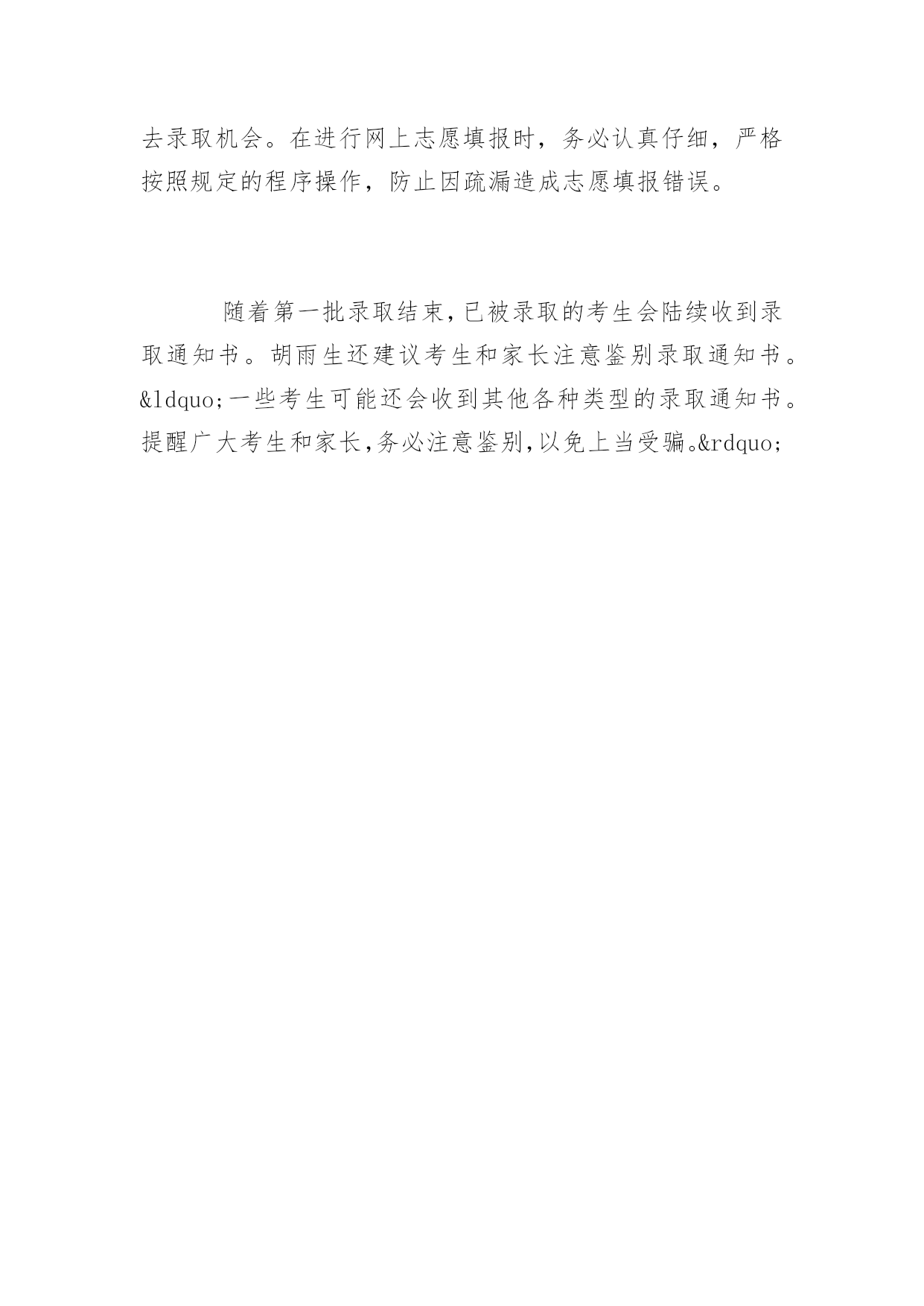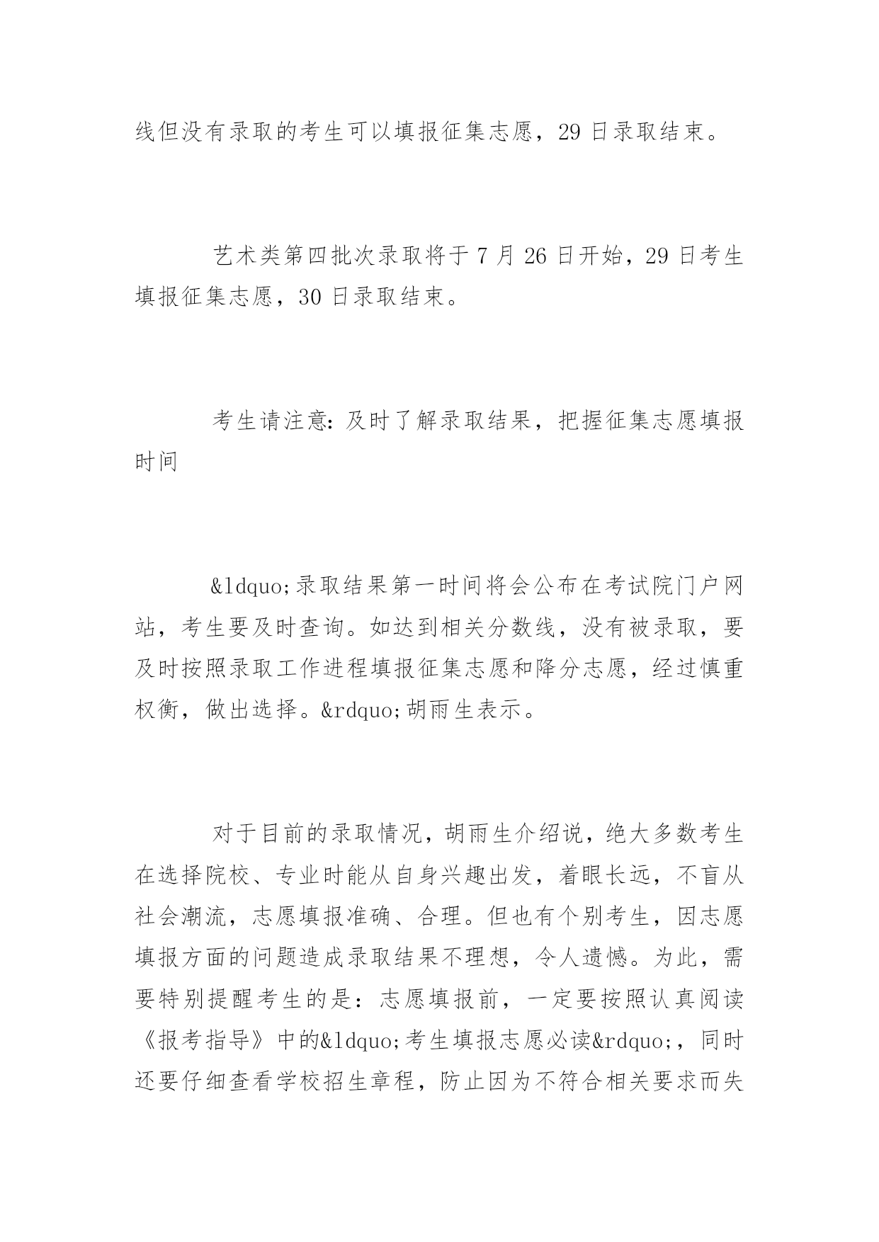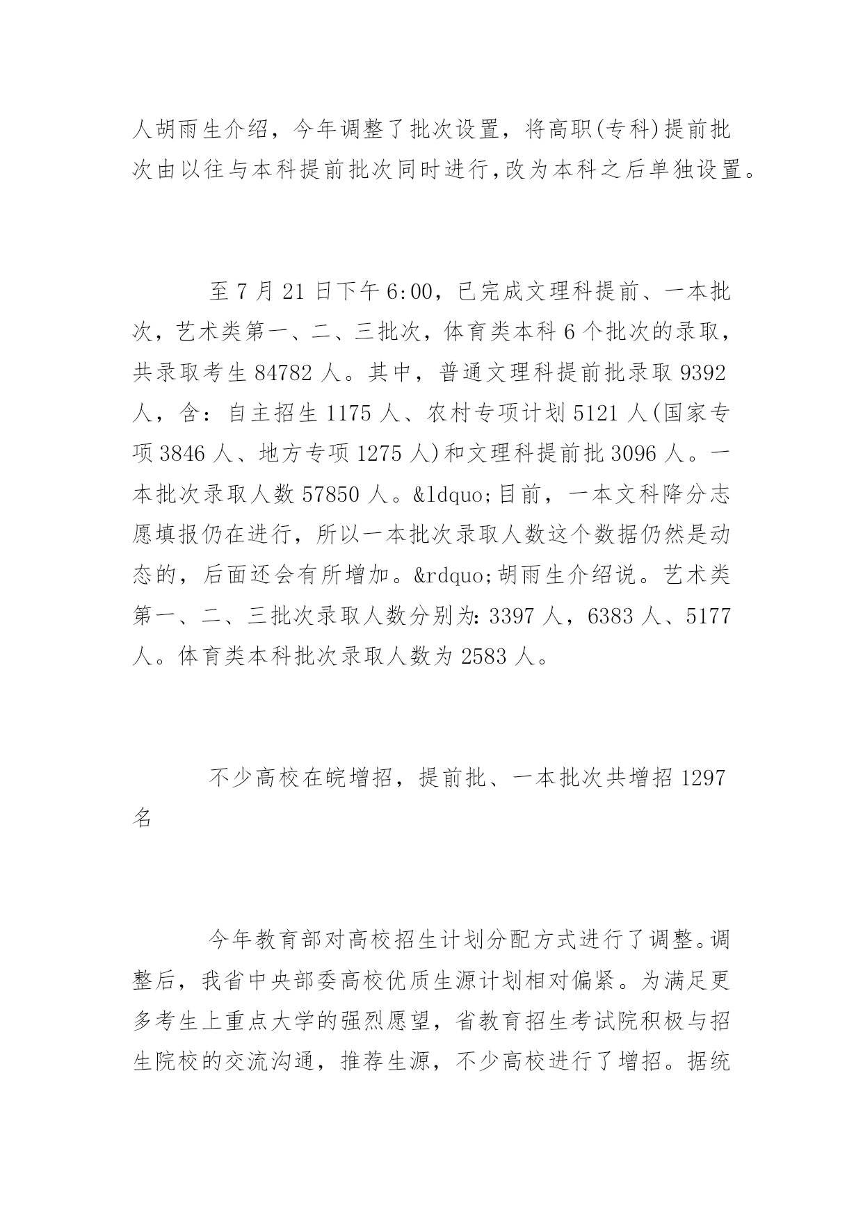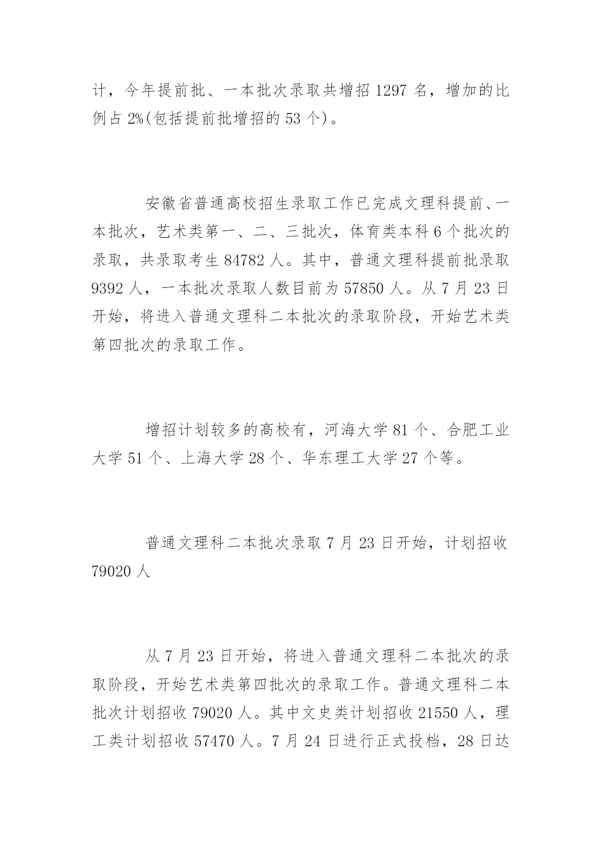安徽高考本科文科录取安徽高考本科文科录取高考是每一年的大事,那么安徽高考文科录取是什么时候呢,下面是阳光网小编为你整理的安徽高考本科文科录取内容,希望能够帮助到你。安徽高考本科文科录取现已完成6个批次录取,普通文理科一本已录取57850人据悉,我省普通高校招生录取工作共分为三大类,十四个批次。三大类为普通文理科、艺术、体育。十四个批次包括:普通文理科:提前本科批次、一本、二本、三本、高职(专科)提前批、高职(专科)6个批次;艺术类6个批次;体育类2个批次。据省教育招生考试院招生考试研究处处长、新闻发言人胡雨生介绍,今年调整了批次设置,将高职(专科)提前批次由以往与本科提前批次同时进行,改为本科之后单独设置。至7月21日下午6:00,已完成文理科提前、一本批次,艺术类第一、二、三批次,体育类本科6个批次的录取,共录取考生84782人。其中,普通文理科提前批录取9392人,含:自主招生1175人、农村专项计划5121人(国家专项3846人、地方专项1275人)和文理科提前批3096人。一本批次录取人数57850人。“目前,一本文科降分志愿填报仍在进行,所以一本批次录取人数这个数据仍然是动态的,后面还会有所增加。”胡雨生介绍说。艺术类第一、二、三批次录取人数分别为:3397人,6383人、5177人。体育类本科批次录取人数为2583人。不少高校在皖增招,提前批、一本批次共增招1297名今年教育部对高校招生计划分配方式进行了调整。调整后,我省中央部委高校优质生源计划相对偏紧。为满足更多考生上重点大学的强烈愿望,省教育招生考试院积极与招生院校的交流沟通,推荐生源,不少高校进行了增招。据统计,今年提前批、一本批次录取共增招1297名,增加的比例占2%(包括提前批增招的53个)。安徽省普通高校招生录取工作已完成文理科提前、一本批次,艺术类第一、二、三批次,体育类本科6个批次的录取,共录取考生84782人。其中,普通文理科提前批录取9392人,一本批次录取人数目前为57850人。从7月23日开始,将进入普通文理科二本批次的录取阶段,开始艺术类第四批次的录取工作。增招计划较多的高校有,河海大学81个、合肥工业大学51个、上海大学28个、华东理工大学27个等。普通文理科二本批次录取7月23日开始,计划招收79020人从7月23日开始,将进入普通文理科二本批次的录取阶段,开始艺术类第四批次的录取工作。普通文理科二本批次计划招收79020人。其中文史类计划招收21550人,理工类计划招收57470人。7月24日进行正式投档,28日达线但没有录取的考生可以填报征集志愿,29日录取结束。艺术类第四批次录取将于7月26日开始,29日考生填报征集志愿,30日录取结束。考生请注意:及时了解录取结果,把握征集志愿填报时间“录取结果第一时间将会公布在考试院门户网站,考生要及时查询。如达到相关分数线,没有被录取,要及时按照录取工作进程填报征集志愿和降分志愿,经过慎重权衡,做出选择。”胡雨生表示。对于目前的录取情况,胡雨生介绍说,绝大多数考生在选择院校、专业时能从自身兴趣出发,着眼长远,不盲从社会潮流,志愿填报准确、合理。但也有个别考生,因志愿填报方面的问题造成录取结果不理想,令人遗憾。为此,需要特别提醒考生的是:志愿填报前,一定要按照认真阅读《报考指导》中的“考生填报志愿必读”,同时还要仔细查看学校招生章程,防止因为不符合相关要求而失去录取机会。在进行网上志愿填报时,务必认真仔细,严格按照规定的程序操作,防止因疏漏造成志愿填报错误。随着第一批录取结束,已被录取的考生会陆续收到录取通知书。胡雨生还建议考生和家长注意鉴别录取通知书。“一些考生可能还会收到其他各种类型的录取通知书。提醒广大考生和家长,务必注意鉴别,以免上当受骗。”