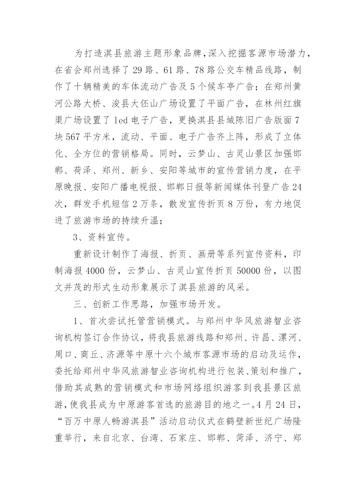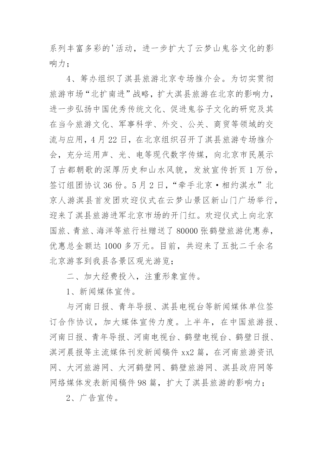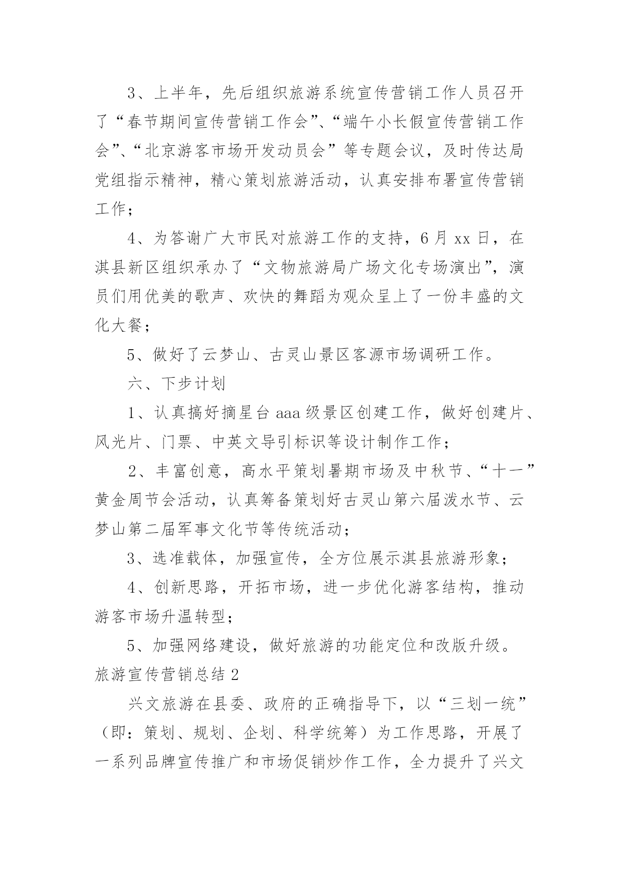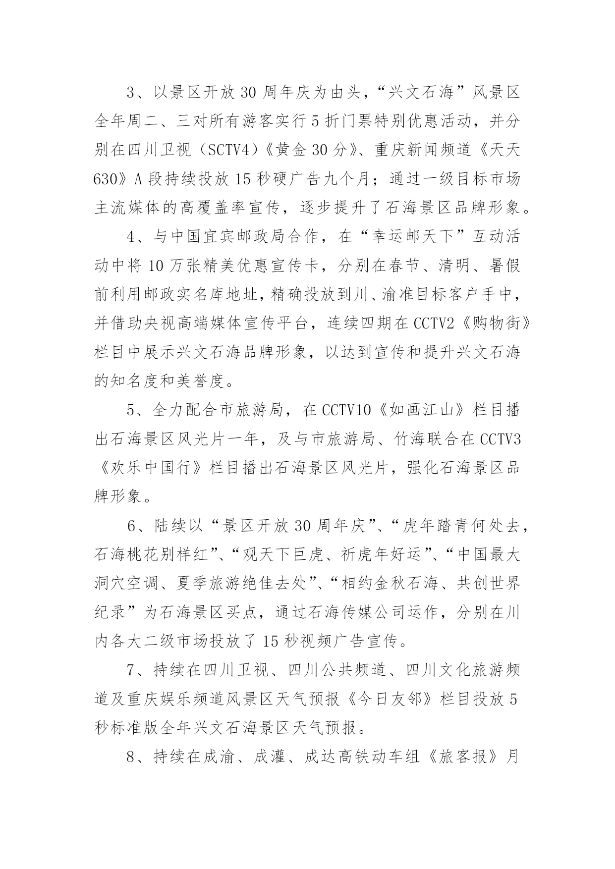 旅游宣传营销总结旅游宣传营销总结总结是指社会团体、企业单位和个人对某一阶段的学习、工作或其完成情况加以回顾和分析,得出教训和一些规律性认识的一种书面材料,它可以提升我们发现问题的能力,是时候写一份总结了。那么你知道总结如何写吗?下面是小编整理的旅游宣传营销总结,欢迎阅读,希望大家能够喜欢。旅游宣传营销总结1上半年,宣传股在局党组的正确领导下,紧紧围绕“务实营销”的总体思路,积极推进“北扩南进”战略,按照“唱好四季歌、打好节日仗、关注政策、盯紧市场”的具体要求,丰富节会活动,注重形象宣传,创新工作思路,加强网络建设,使旅游促销百花齐放,游客市场持续升温,特别是“五一小长假”三天,各景区旅游活动丰富,游客火爆,经济收入屡创历史新高。现将上半年宣传推介和市场营销主要工作总结如下:一、丰富节会活动,打造旅游品牌。1、成功举办了“春暖朝歌·绿染太行”大型春季旅游活动。期间推出了云梦山草原踏青节、古灵山梨花节、朝阳寺登山节、比干文化节等子活动,开展了淇县旅游征文比赛、淇县旅游广告语征集大赛、淇县旅游摄影比赛、淇县旅游书法绘画比赛等,切实叫响了“文化朝歌神奇山水”旅游品牌。3月27日,“春暖朝歌·绿染太行”淇县大型春季旅游活动启动仪式在云梦山景区隆重举行,来自全国各地的上千名游客参加了启动仪式并成为活动的首日参与者,河南日报、青年导报、鹤壁日报、鹤壁电视台等新闻媒体对启动仪式的盛况进行了报道。2、假日旅游持续火爆。借助第二届全国民俗文化节的有利时机,春节旅游黄金月期间,云梦山景区推出了登山喊福、骑马、射箭、秧歌表演等民俗节目,古灵山景区推出了财神送财、女娲赐福、喜开第一殿门、烧头柱香等活动,内容丰富,形式新颖,受到了广大游客的好评。清明、五一、端午小长假期间,各景区相继推出了十里断崖健步比赛、穿越飞瀑、登山喊福等游客参与项目,举办了女娲赐福、财神送财、喝啤酒比赛、赛龙舟比赛、寻根问祖等一系列具有传统文化特色的娱乐项目。通过一系列丰富多彩、趣味性强的活动,增强了游客的参与性和体验性,聚集了人气,营造了氛围,使淇县旅游宣传全线飘红,假日节会旅游持续火爆。3、服务好、配合好了“首届中国鬼谷子文化节”。5月9日,以“智圣鬼谷·魅力朝歌”为主题的首届中国鬼谷子文化节在云梦山景区隆重开幕,中国民协分党组书记罗杨,中国民协副秘书长赵铁信等国家、省、市、县各级领导参加了开幕式。文化节期间,举行了“中国鬼谷子文化圣地”授牌仪式、《智圣—鬼谷子》个性化邮票揭幕仪式、鬼谷子文化大讲堂、特色工艺品展示交流会、文艺娱乐项目演出等一系列丰富多彩的'活动,进一步扩大了云梦山鬼谷文化的影响力;4、筹办组织了淇县旅游北京专场推介会。为切实贯彻旅游市场“北扩南进”战略,扩大淇县旅游在北京的影响力,进一步弘扬中国优秀传统文化、促进鬼谷子文化的研究及其在当今旅游文化、军事科学、外交、公关、商贸等领域的交流与应用,4月22日,在北京组织召开了淇县旅游专场推介会,充分运用声、光、电等现代数字传媒,向北京市民展示了古都朝歌的深厚历史和山水风貌,发放宣传折页1万份,签订组团协议36份。5月2日,“牵手北京·相约淇水”北京人游淇县首发团欢迎仪式在云梦山景区新山门广场举行,迎来了淇县旅游进军北京市场的开门红。欢迎仪式上向北京国旅、青旅、海洋等旅行社赠送了80000张鹤壁旅游优惠券,优惠总金额达1000多万元。目前,共迎来了五批二千余名北京游客到我县各景区观光游览;二、加大经费投入,注重形象宣传。1、新闻媒体宣传。与河南日报、青年导报、淇县电视台等新闻媒体单位签订合作协议,加大媒体宣传力度。上半年,在中国旅游报、河南日报、青年导报、河南电视台、鹤壁电视台、鹤壁日报、淇河晨报等主流媒体刊发新闻稿件xx2篇,在河南旅游资讯网、大河旅游网、大河鹤壁网、鹤壁旅游网、淇县政府网等网络媒体发表新闻稿件98篇,扩大了淇县旅游的影响力;2、广告宣传。为打造淇县旅游主题形象品牌,深入挖掘客源市场潜力,在省会郑州选择了29路、61路、78路公交车精品线路,制作了十辆精美的车体流动广告及5个候车亭广告;在郑州黄河公路大桥、浚县大伾山广场设置了平面广告,在林州红旗渠广场设置了led电子广告,更换淇县县城陈旧广告版面7块567平方米,流动、平面、电子广告齐上阵,形成了立体化、全方位的营销格局。同时,云梦山、古灵山景区加强邯郸、荷泽、郑州、新乡、安阳等城市的宣传营销力度,在平原晚报、安阳广播电视报、邯郸日报等新闻媒体刊登广告24次,群发手机短信2万条,散发宣传折页8万份,有力地促进了旅游市场的持续升温;3、资料宣传。重新设计制作了海报、折页、画册等系列宣传资料,印制海报4000份,云梦山、古灵山宣传折页50000份,以图文并茂的形式生动形象展示了淇县旅游的风采。三、创新工作思路,加强市场开发。1、首次尝试托管营销模式