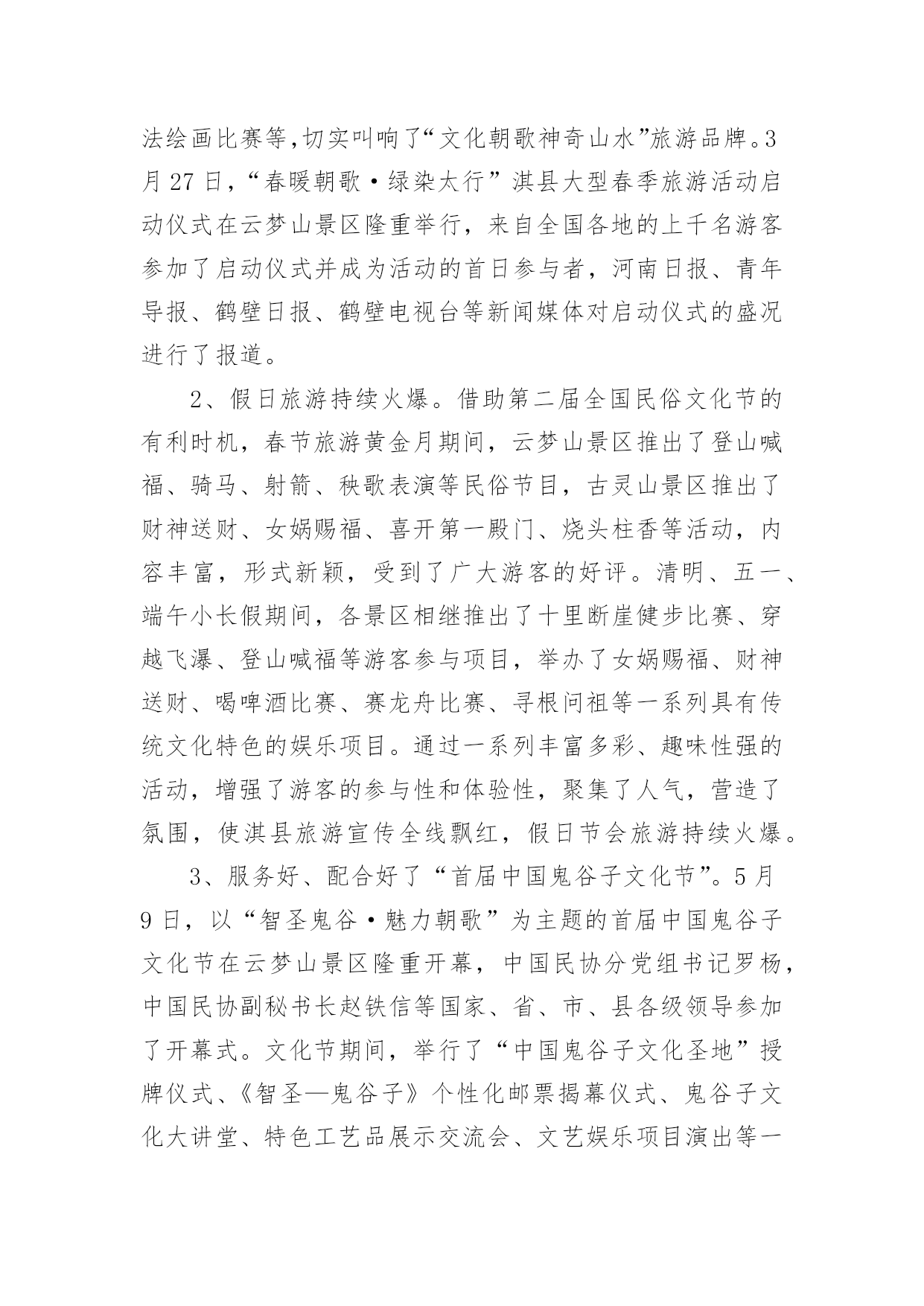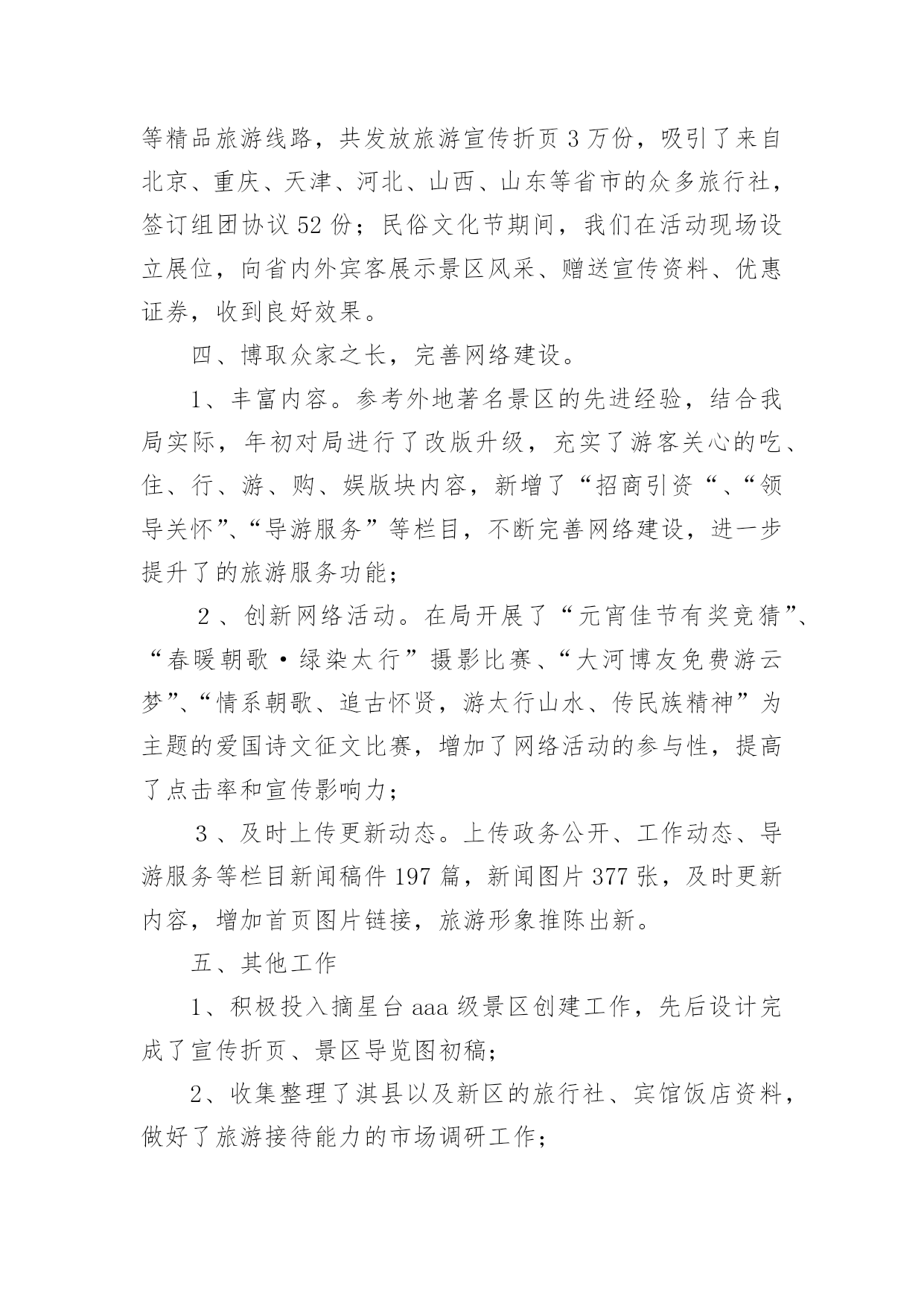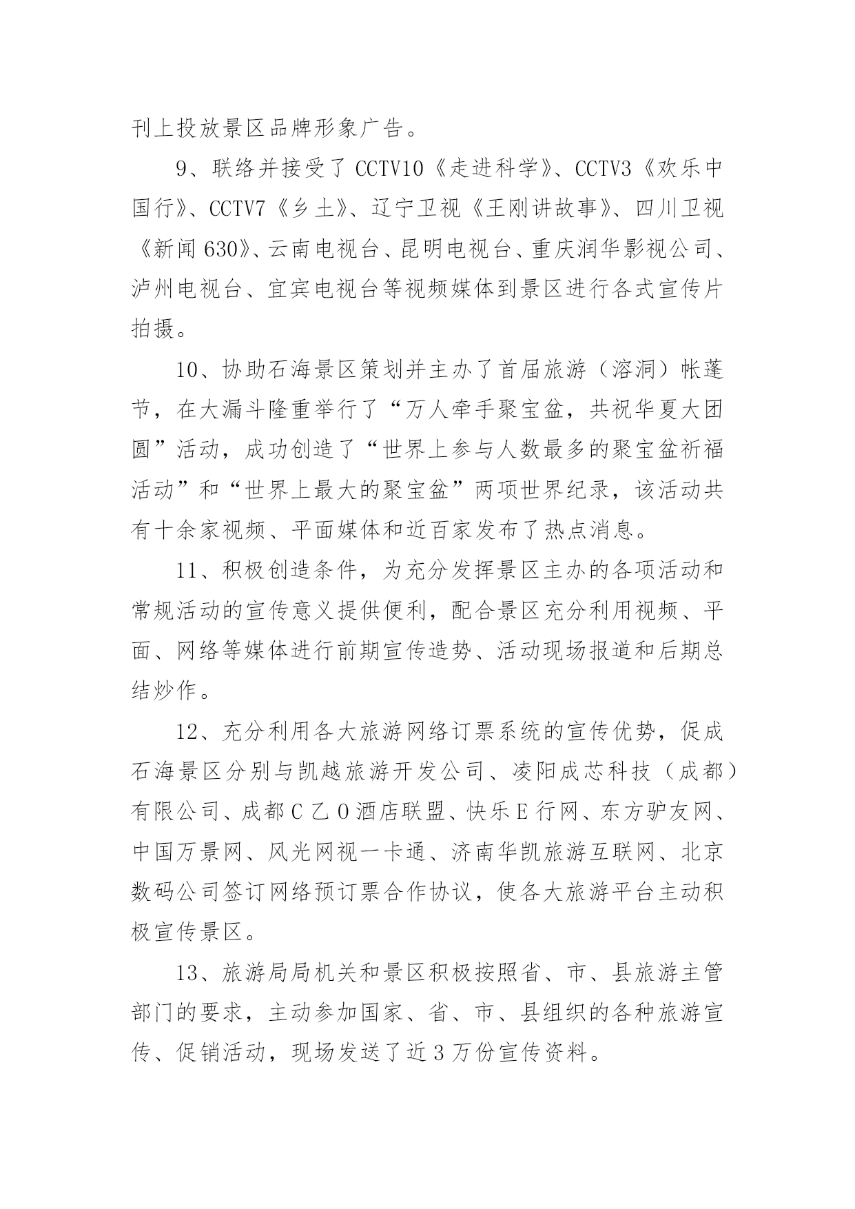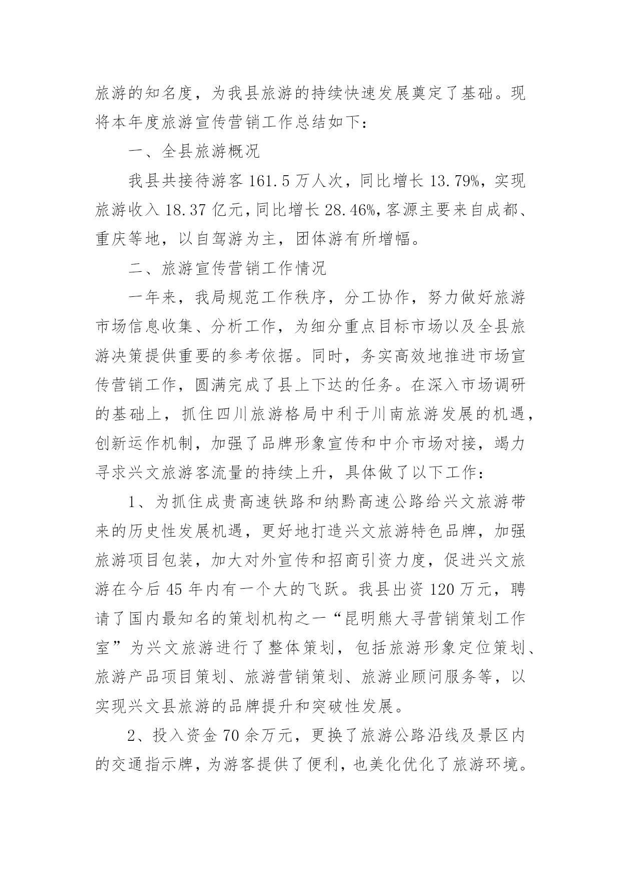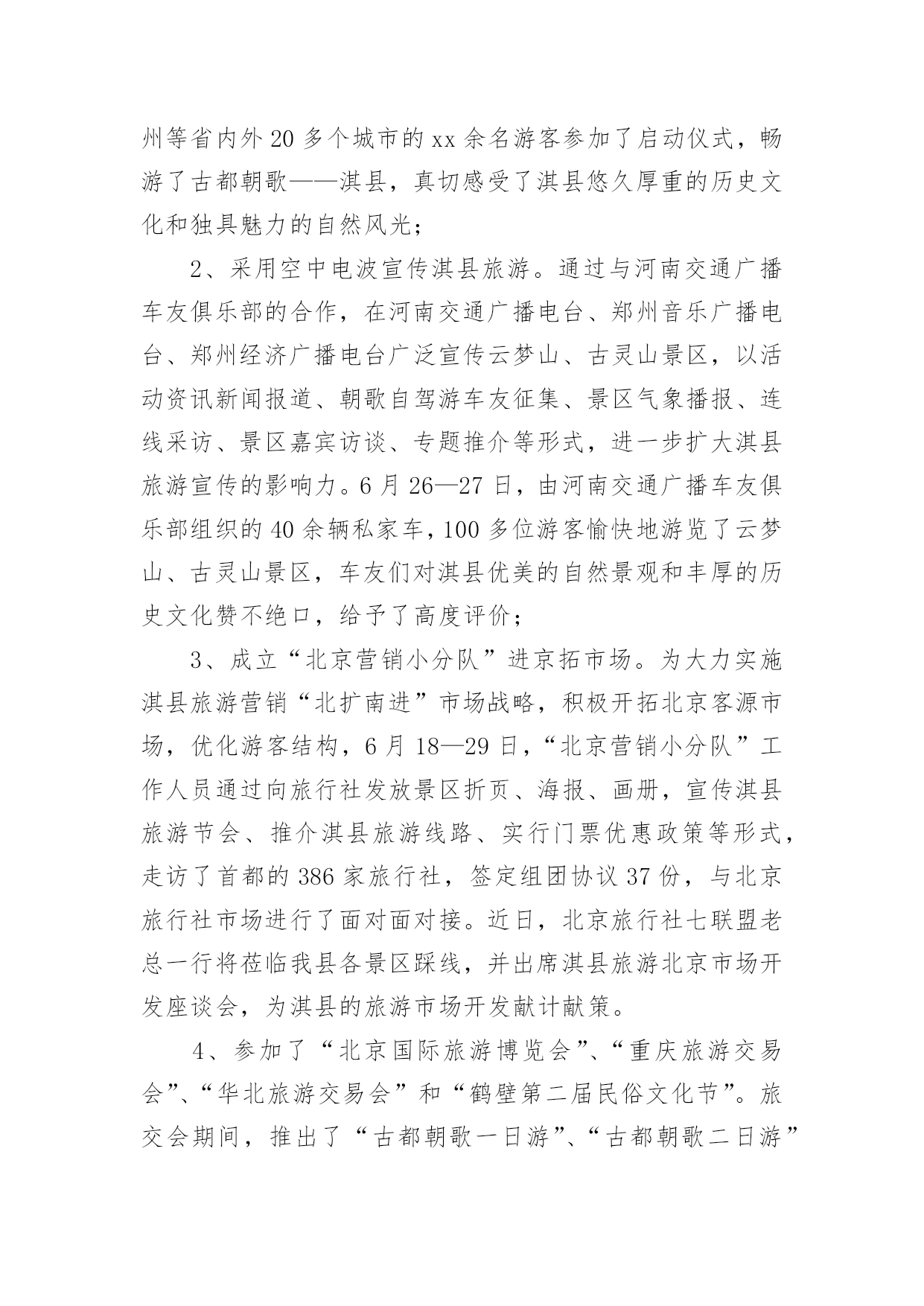 旅游宣传营销总结旅游宣传营销总结总结是指社会团体、企业单位和个人对某一阶段的学习、工作或其完成情况加以回顾和分析,得出教训和一些规律性认识的一种书面材料,它可以提升我们发现问题的能力,是时候写一份总结了。那么你知道总结如何写吗?下面是小编整理的旅游宣传营销总结,欢迎阅读,希望大家能够喜欢。旅游宣传营销总结1上半年,宣传股在局党组的正确领导下,紧紧围绕“务实营销”的总体思路,积极推进“北扩南进”战略,按照“唱好四季歌、打好节日仗、关注政策、盯紧市场”的具体要求,丰富节会活动,注重形象宣传,创新工作思路,加强网络建设,使旅游促销百花齐放,游客市场持续升温,特别是“五一小长假”三天,各景区旅游活动丰富,游客火爆,经济收入屡创历史新高。现将上半年宣传推介和市场营销主要工作总结如下:一、丰富节会活动,打造旅游品牌。1、成功举办了“春暖朝歌·绿染太行”大型春季旅游活动。期间推出了云梦山草原踏青节、古灵山梨花节、朝阳寺登山节、比干文化节等子活动,开展了淇县旅游征文比赛、淇县旅游广告语征集大赛、淇县旅游摄影比赛、淇县旅游书法绘画比赛等,切实叫响了“文化朝歌神奇山水”旅游品牌。3月27日,“春暖朝歌·绿染太行”淇县大型春季旅游活动启动仪式在云梦山景区隆重举行,来自全国各地的上千名游客参加了启动仪式并成为活动的首日参与者,河南日报、青年导报、鹤壁日报、鹤壁电视台等新闻媒体对启动仪式的盛况进行了报道。2、假日旅游持续火爆。借助第二届全国民俗文化节的有利时机,春节旅游黄金月期间,云梦山景区推出了登山喊福、骑马、射箭、秧歌表演等民俗节目,古灵山景区推出了财神送财、女娲赐福、喜开第一殿门、烧头柱香等活动,内容丰富,形式新颖,受到了广大游客的好评。清明、五一、端午小长假期间,各景区相继推出了十里断崖健步比赛、穿越飞瀑、登山喊福等游客参与项目,举办了女娲赐福、财神送财、喝啤酒比赛、赛龙舟比赛、寻根问祖等一系列具有传统文化特色的娱乐项目。通过一系列丰富多彩、趣味性强的活动,增强了游客的参与性和体验性,聚集了人气,营造了氛围,使淇县旅游宣传全线飘红,假日节会旅游持续火爆。3、服务好、配合好了“首届中国鬼谷子文化节”。5月9日,以“智圣鬼谷·魅力朝歌”为主题的首届中国鬼谷子文化节在云梦山景区隆重开幕,中国民协分党组书记罗杨,中国民协副秘书长赵铁信等国家、省、市、县各级领导参加了开幕式。文化节期间,举行了“中国鬼谷子文化圣地”授牌仪式、《智圣—鬼谷子》个性化邮票揭幕仪式、鬼谷子文化大讲堂、特色工艺品展示交流会、文艺娱乐项目演出等一系列丰富多彩的'活动,进一步扩大了云梦山鬼谷文化的影响力;4、筹办组织了淇县旅游北京专场推介会。为切实贯彻旅游市场“北扩南进”战略,扩大淇县旅游在北京的影响力,进一步弘扬中国优秀传统文化、促进鬼谷子文化的研究及其在当今旅游文化、军事科学、外交、公关、商贸等领域的交流与应用,4月22日,在北京组织召开了淇县旅游专场推介会,充分运用声、光、电等现代数字传媒,向北京市民展示了古都朝歌的深厚历史和山水风貌,发放宣传折页1万份,签订组团协议36份。5月2日,“牵手北京·相约淇水”北京人游淇县首发团欢迎仪式在云梦山景区新山门广场举行,迎来了淇县旅游进军北京市场的开门红。欢迎仪式上向北京国旅、青旅、海洋等旅行社赠送了80000张鹤壁旅游优惠券,优惠总金额达1000多万元。目前,共迎来了五批二千余名北京游客到我县各景区观光游览;二、加大经费投入,注重形象宣传。1、新闻媒体宣传。与河南日报、青年导报、淇县电视台等新闻媒体单位签订合作协议,加大媒体宣传力度。上半年,在中国旅游报、河南日报、青年导报、河南电视台、鹤壁电视台、鹤壁日报、淇河晨报等主流媒体刊发新闻稿件xx2篇,在河南旅游资讯网、大河旅游网、大河鹤壁网、鹤壁旅游网、淇县政府网等网络媒体发表新闻稿件98篇,扩大了淇县旅游的影响力;2、广告宣传。为打造淇县旅游主题形象品牌,深入挖掘客源市场潜力,在省会郑州选择了29路、61路、78路公交车精品线路,制作了十辆精美的车体流动广告及5个候车亭广告;在郑州黄河公路大桥、浚县大伾山广场设置了平面广告,在林州红旗渠广场设置了led电子广告,更换淇县县城陈旧广告版面7块567平方米,流动、平面、电子广告齐上阵,形成了立体化、全方位的营销格局。同时,云梦山、古灵山景区加强邯郸、荷泽、郑州、新乡、安阳等城市的宣传营销力度,在平原晚报、安阳广播电视报、邯郸日报等新闻媒体刊登广告24次,群发手机短信2万条,散发宣传折页8万份,有力地促进了旅游市场的持续升温;3、资料宣传。重新设计制作了海报、折页、画册等系列宣传资料,印制海报4000份,云梦山、古灵山宣传折页50000份,以图文并茂的形式生动形象展示了淇县旅游的风采。三、创新工作思路,加强市场开发。1、首次尝试托管营销模式