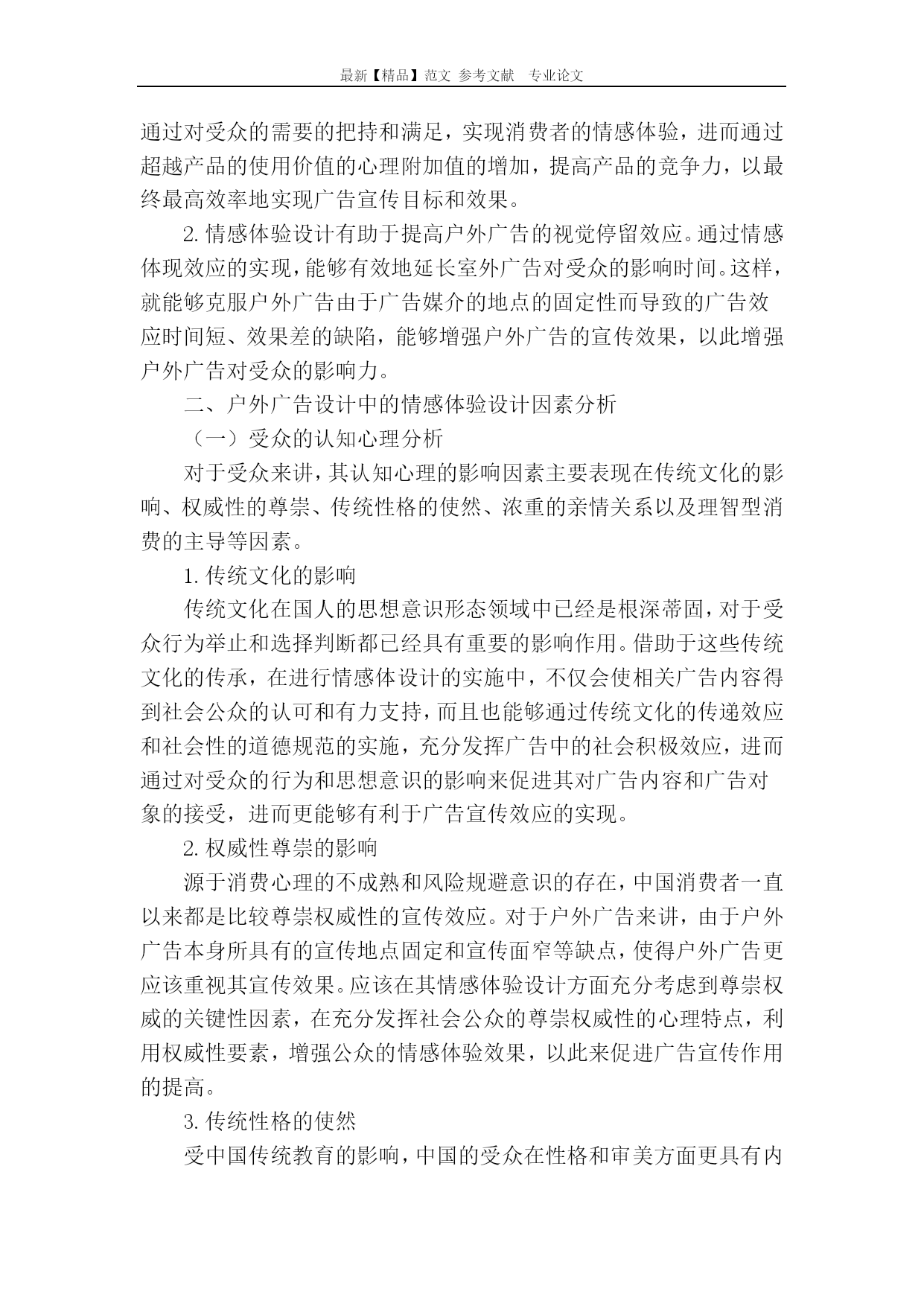 最新【精品】范文参考文献专业论文户外广告设计中受众情感体验设计分析户外广告设计中受众情感体验设计分析摘要:着手于户外广告情感体验效应的影响因素进行分析,从受众的认知心理和接受能力两个角度进行了户外广告设计中的情感体验设计分析,以此为户外广告设计中的情感体验设计提供理论基础和对策建议。关键词:户外广告受众情感体验设计一、受众情感体验计在户外广告中的作用分析户外广告作为重要的广告形式,在商品信息的传递和商品销售方面发挥了重要的作用。在户外广告的设计中,情感体验设计是不可缺少的重要内容。(一)传统的户外广告形式及其弊端传统的户外广告主要包括平面广告和立体广告两种形式。平面广告的主要形式主要有路牌、招贴、墙壁、海报和条幅等;而立体广告则形式多以霓虹灯、广告柱、广告塔和灯箱等形式为主。作为传统的户外广告,由于广告形式比较规范,广告宣传地点比较固定,由此必然导致广告效果的宣传面比较窄,而由此所产生的广告宣传的效应评价难以进行。(二)情感体验设计对传统户外广告形式的有效补充和完善情感体验是指通过外界的环境和条件因素的刺激和影响,形成受众的心理活动,并进而通过心理活动产生对相关事物的评价和主观感受的过程。作为户外广告的情感体验设计,所指的就是通过一系列的刺激性因素的设计和实施,最终实现受众对于户外广告内容和形式的接,进而提高户外广告的宣传效应。在传统的户外广告形式的基础上,通过情景体验的设计,能够有效实现户外广告宣传效果的提高。具体的作用效应体现在以下几个方面。1.情感体验设计可以通过加强受众的感性认识来提高其认知程度,并加深其对广告内容的接受程度。利用情感体验设计方式,可以通过对受众的需要的把持和满足,实现消费者的情感体验,进而通过超越产品的使用价值的心理附加值的增加,提高产品的竞争力,以最终最高效率地实现广告宣传目标和效果。2.情感体验设计有助于提高户外广告的视觉停留效应。通过情感体现效应的实现,能够有效地延长室外广告对受众的影响时间。这样,就能够克服户外广告由于广告媒介的地点的固定性而导致的广告效应时间短、效果差的缺陷,能够增强户外广告的宣传效果,以此增强户外广告对受众的影响力。二、户外广告设计中的情感体验设计因素分析(一)受众的认知心理分析对于受众来讲,其认知心理的影响因素主要表现在传统文化的影响、权威性的尊崇、传统性格的使然、浓重的亲情关系以及理智型消费的主导等因素。1.传统文化的影响传统文化在国人的思想意识形态领域中已经是根深蒂固,对于受众行为举止和选择判断都已经具有重要的影响作用。借助于这些传统文化的传承,在进行情感体设计的实施中,不仅会使相关广告内容得到社会公众的认可和有力支持,而且也能够通过传统文化的传递效应和社会性的道德规范的实施,充分发挥广告中的社会积极效应,进而通过对受众的行为和思想意识的影响来促进其对广告内容和广告对象的接受,进而更能够有利于广告宣传效应的实现。2.权威性尊崇的影响源于消费心理的不成熟和风险规避意识的存在,中国消费者一直以来都是比较尊崇权威性的宣传效应。对于户外广告来讲,由于户外广告本身所具有的宣传地点固定和宣传面窄等缺点,使得户外广告更应该重视其宣传效果。应该在其情感体验设计方面充分考虑到尊崇权威的关键性因素,在充分发挥社会公众的尊崇权威性的心理特点,利用权威性要素,增强公众的情感体验效果,以此来促进广告宣传作用的提高。3.传统性格的使然受中国传统教育的影响,中国的受众在性格和审美方面更具有内敛和谦逊的特点。而这也成为受众比较容易接受的宣传形式。在进行户外广告的情感体验设计时,应该从受众的审美观和价值观角度出发,采用受众比较容易接受的情感提样方式,对使用富有内涵的、精巧、细腻的情感体验设计手法,从受众的接受角度着手,减少广告宣传的阻力和障碍,以更好地实现广告效应。4.浓重的亲情关系中国具有着传统的家庭和亲情观念。作为社会组成的重要单元和重要形式,中国的亲情关系决定了在中国的经济领域中很多方面都具有鲜明的中国特色性。包括对于商品的选择和购置上。而作为以实现商品销售额为条件和目标的户外广告来讲,当然要重视这种社会关系所能够发挥的重要作用。在户外广告的情感体验设计中,应该充分考虑到亲情关系因素,以亲情关系为其创意点,唤起受众的亲情共鸣性,并予以设计和实施,以此促进广告效应的加强。5.理智型消费的主导中国的传统的理财观决定了,大部分消费者仍然是属于比较节俭型。这种消费观念决定了消费者更加重视的是商品的性价比。由此,在户外广告的情感体验设计中应该充分考虑到这一因素。在广告宣传中传递商品的性价比的优势,以此消除受众可能会存在的犹豫和怀疑情绪,以此增强受众对广告内容的接受,并有可能会带来一定的信任感。这样,必将为广告效应的实现提供非常有利的促进效应。(二)
